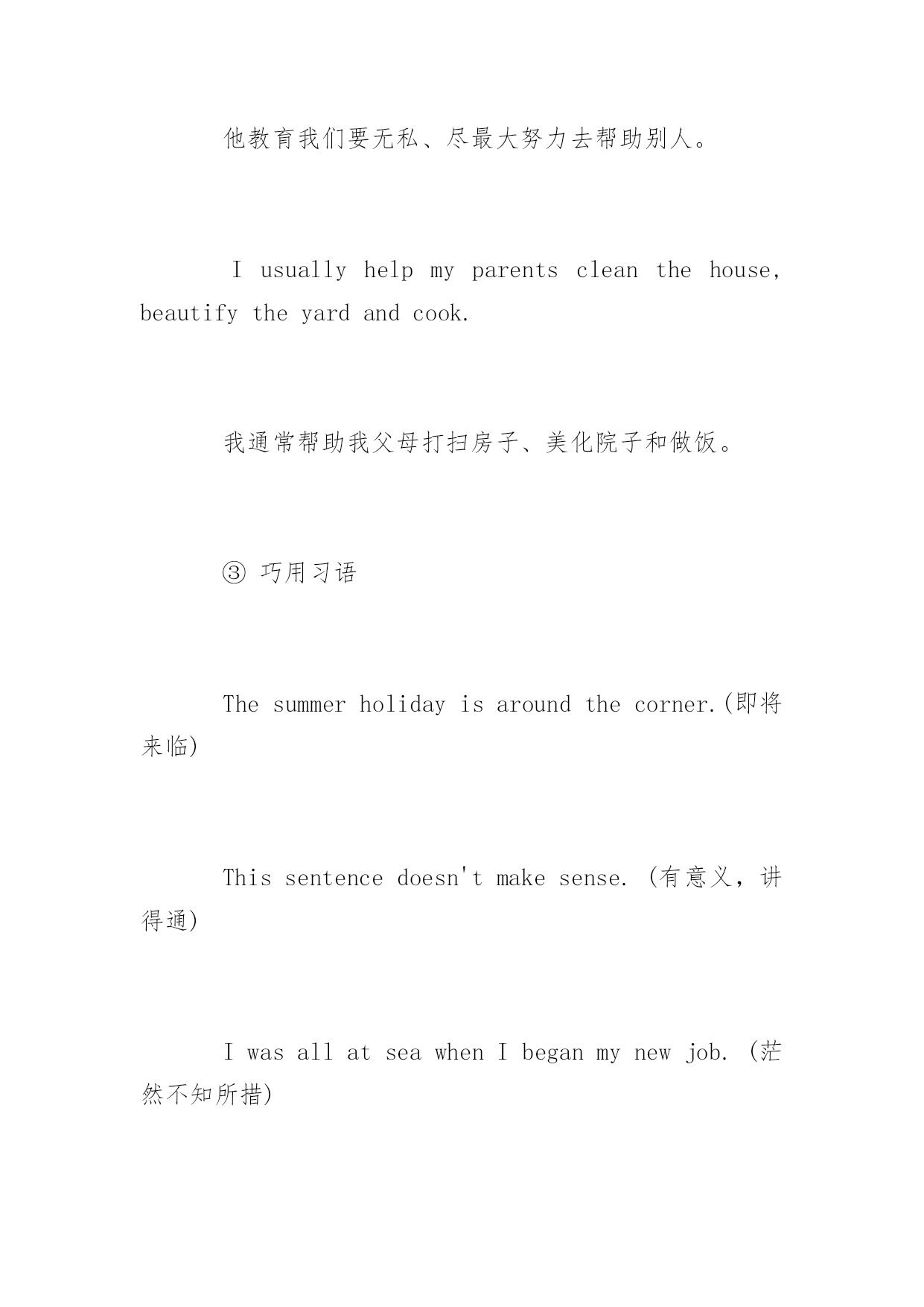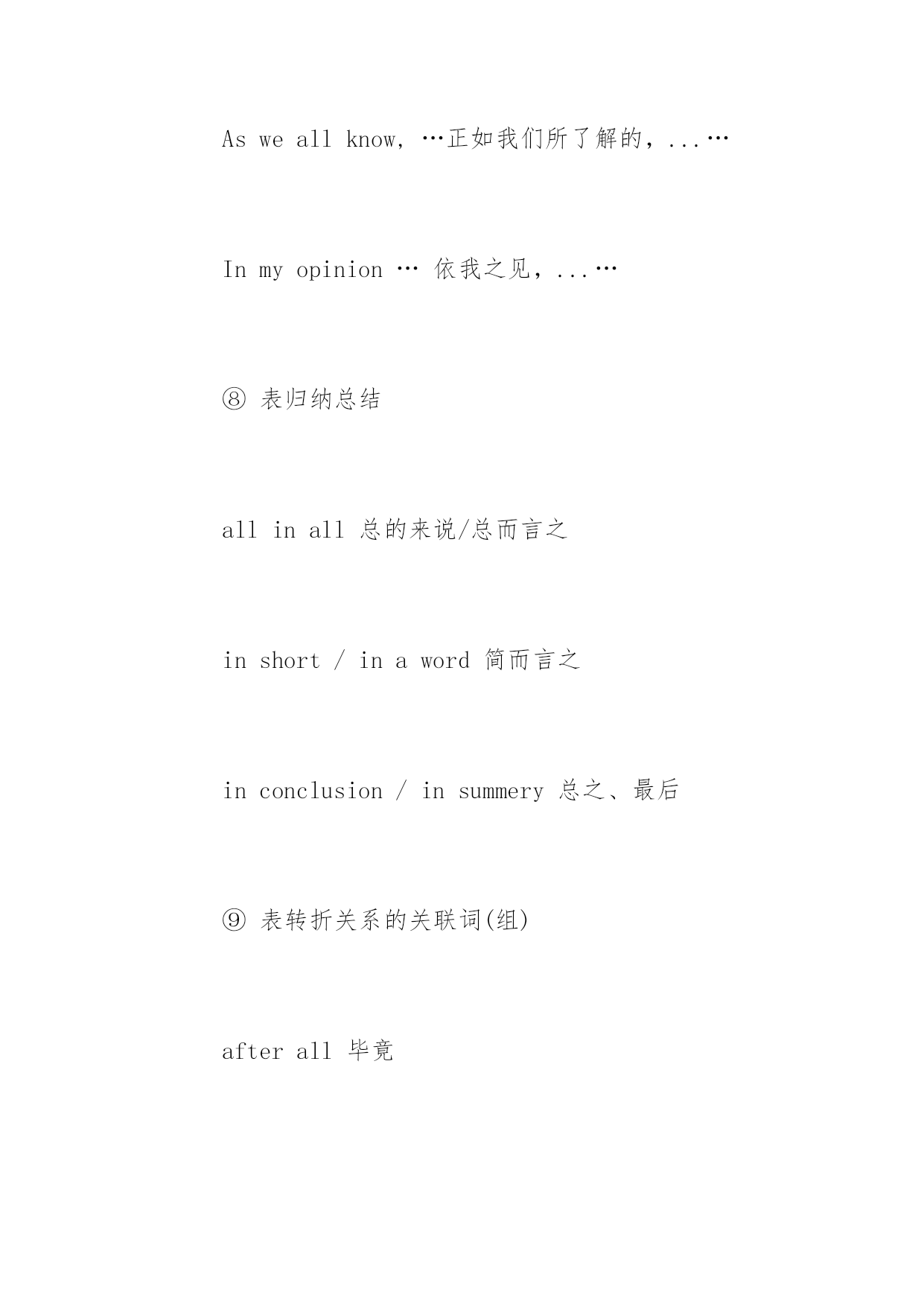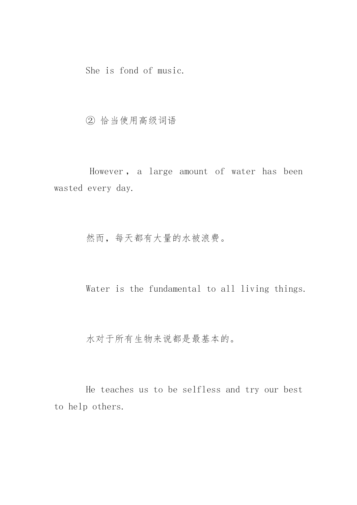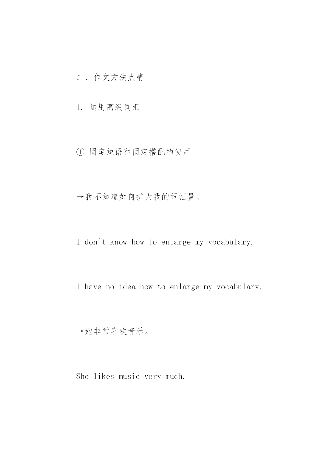 中考英语满分写作攻略2017中考英语满分写作攻略导语:书面表达是对学生在初中阶段英语学习的综合考查,涉及篇章结构、句子构成、短语使用和单词拼写等多方面内容,下面是小编为大家整理的2017中考英语满分写作攻略,希望对大家有所帮助。更多相关的知识,请关注CNFLA学习网!一、作文解题思路1审:认真审题,找关键词2列:用简单的句子或短语全面列出文章要点3连:恰当运用关联词连接句子,使文章层次清晰4美:美化文章,适当运用高级词汇和句型二、作文方法点睛1.运用高级词汇①固定短语和固定搭配的使用→我不知道如何扩大我的词汇量。Idon'tknowhowtoenlargemyvocabulary.Ihavenoideahowtoenlargemyvocabulary.→她非常喜欢音乐。Shelikesmusicverymuch.Sheisfondofmusic.②恰当使用高级词语However,alargeamountofwaterhasbeenwastedeveryday.然而,每天都有大量的水被浪费。Wateristhefundamentaltoalllivingthings.水对于所有生物来说都是最基本的。Heteachesustobeselflessandtryourbesttohelpothers.他教育我们要无私、尽最大努力去帮助别人。Iusuallyhelpmyparentscleanthehouse,beautifytheyardandcook.我通常帮助我父母打扫房子、美化院子和做饭。③巧用习语Thesummerholidayisaroundthecorner.(即将来临)Thissentencedoesn'tmakesense.(有意义,讲得通)IwasallatseawhenIbeganmynewjob.(茫然不知所措)④高级过渡词汇however然而therefore因此⑤表先后顺序的关联词(组)firstofall/atfirst/firstly首先intheend/finally/eventually/atlast终于、最终、最后lastbutnotleast最后但也是很重要的⑥表因果关系的关联词(组)therefore因此asaresult结果asaresultof因为Heworkedhardathisstudy.Asaresult,hepassedtheexameasily.他努力学习。结果轻易的就通过了考试。⑦表述观点AsfarasI’mconcerned…就...…而言Asweallknow,…正如我们所了解的,...…Inmyopinion…依我之见,...…⑧表归纳总结allinall总的来说/总而言之inshort/inaword简而言之inconclusion/insummery总之、最后⑨表转折关系的关联词(组)afterall毕竟though/eventhough虽然,尽管,纵然,即使despite/inspiteof不管、不顾、虽然、尽管however/but然而、但是⑩表并列关系的关联词(组)aswellas和,除了Hehasknowledgeaswellasexperience.他有知识和经验。aswell也Weshouldsticktotheprinciplesandbeflexibleaswell.我们应该坚持原则,也要灵活。both…and…两者都...…⑪表递进关系的关联词(组)What’smore另外、而且inaddition/additionally另外、此外foronething…foranother(thing)…一方面...…另一方面…...⑫表举例的关联词(组)forinstance/forexample例如suchas…/like…例如…、像......asweallknow众所周之infact/asamatteroffact事实上、实际⑬使用常用谚语好的开端是成功的一半。Wellbegunishalfdone.善始善终。Agoodbeginningmakesagoodending.孰能生巧。Practicemakesperfect.条条大路通罗马。AllroadsleadtoRome.2.运用高级句型①恰当运用英语中某些常见的.惯用句型,可以使文章显得富有“洋味”:It作形式主语和宾语的句型:too…to…太......以至于不能......so…that…如此......以至于......such…that…如此......以至于......notonly…butalso…不仅......