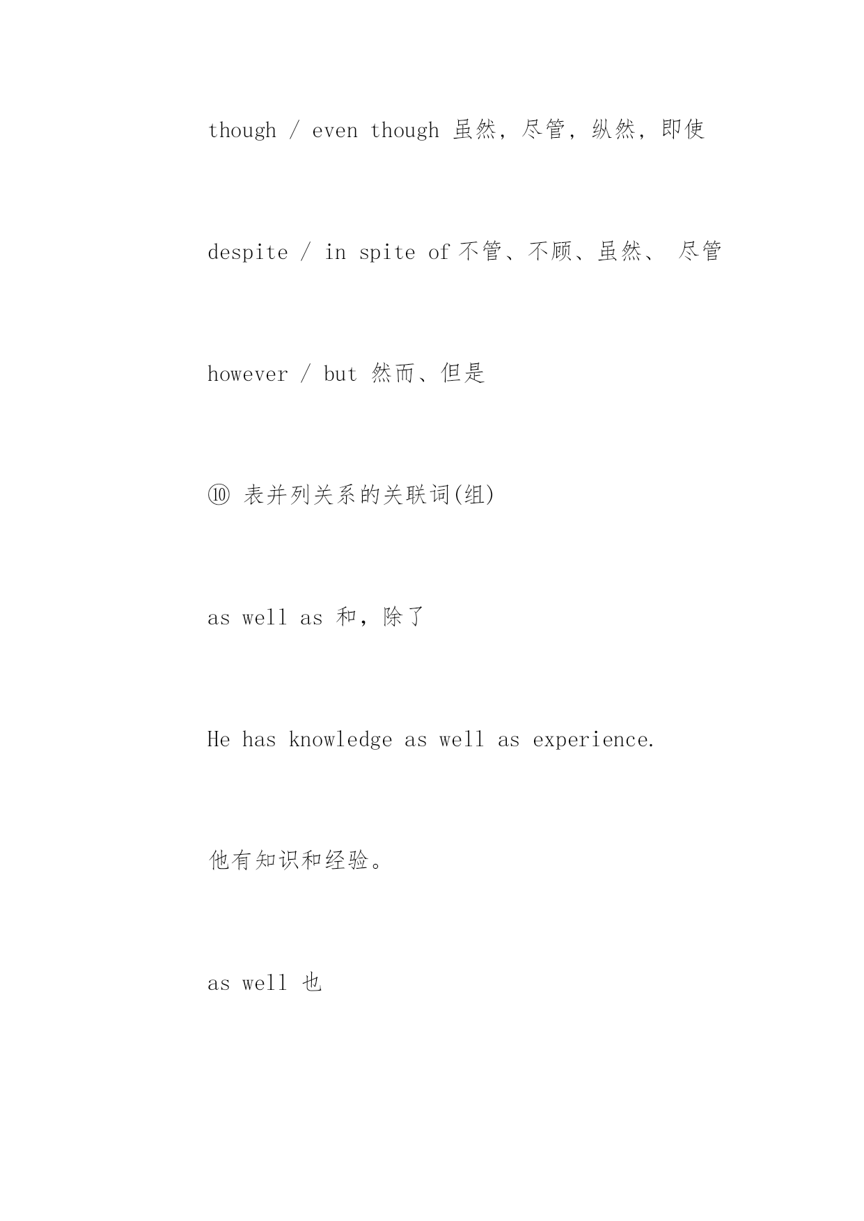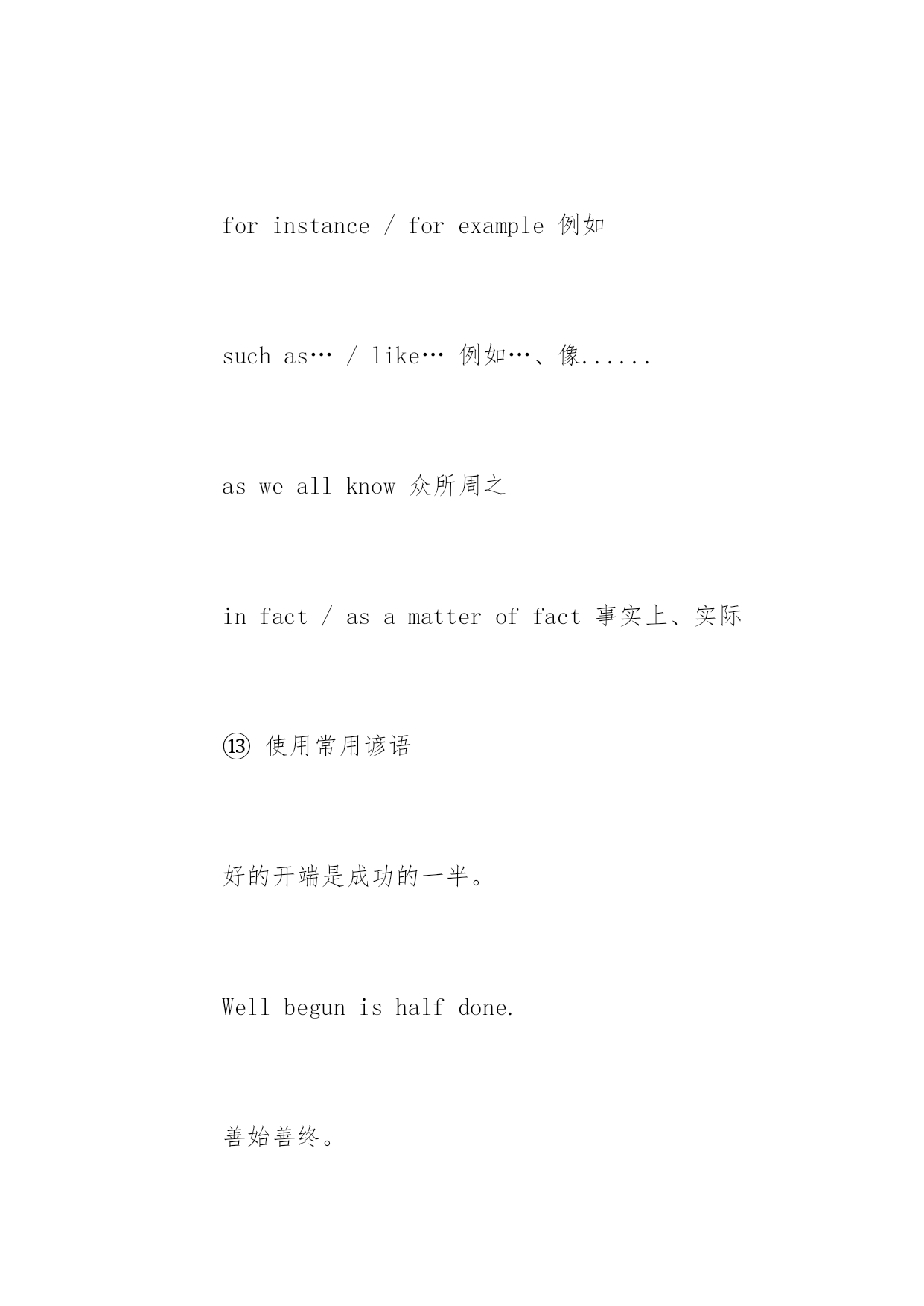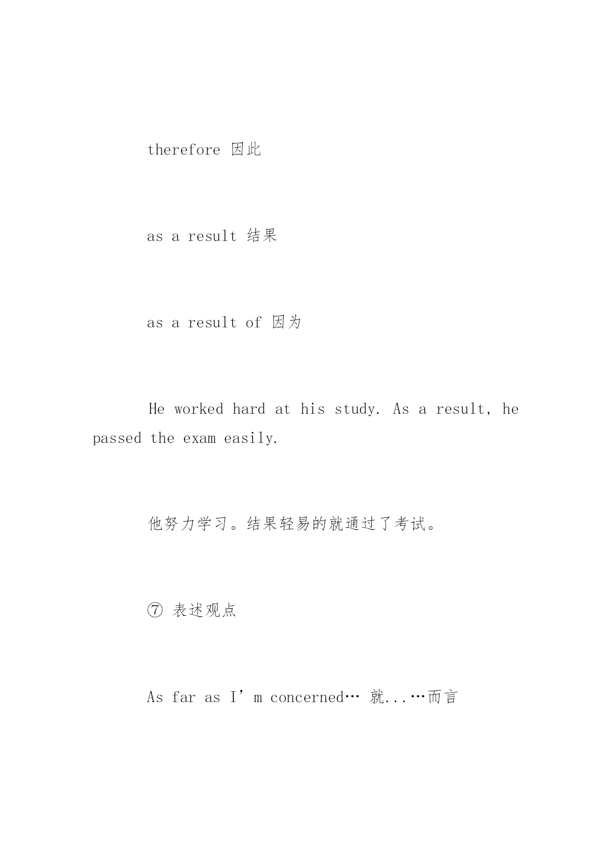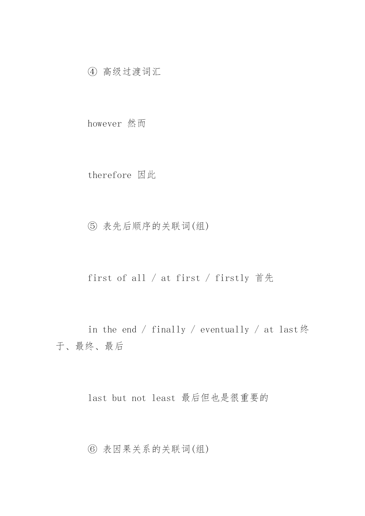 中考英语满分写作攻略2017中考英语满分写作攻略导语:书面表达是对学生在初中阶段英语学习的综合考查,涉及篇章结构、句子构成、短语使用和单词拼写等多方面内容,下面是小编为大家整理的2017中考英语满分写作攻略,希望对大家有所帮助。更多相关的知识,请关注CNFLA学习网!一、作文解题思路1审:认真审题,找关键词2列:用简单的句子或短语全面列出文章要点3连:恰当运用关联词连接句子,使文章层次清晰4美:美化文章,适当运用高级词汇和句型二、作文方法点睛1.运用高级词汇①固定短语和固定搭配的使用→我不知道如何扩大我的词汇量。Idon'tknowhowtoenlargemyvocabulary.Ihavenoideahowtoenlargemyvocabulary.→她非常喜欢音乐。Shelikesmusicverymuch.Sheisfondofmusic.②恰当使用高级词语However,alargeamountofwaterhasbeenwastedeveryday.然而,每天都有大量的水被浪费。Wateristhefundamentaltoalllivingthings.水对于所有生物来说都是最基本的。Heteachesustobeselflessandtryourbesttohelpothers.他教育我们要无私、尽最大努力去帮助别人。Iusuallyhelpmyparentscleanthehouse,beautifytheyardandcook.我通常帮助我父母打扫房子、美化院子和做饭。③巧用习语Thesummerholidayisaroundthecorner.(即将来临)Thissentencedoesn'tmakesense.(有意义,讲得通)IwasallatseawhenIbeganmynewjob.(茫然不知所措)④高级过渡词汇however然而therefore因此⑤表先后顺序的关联词(组)firstofall/atfirst/firstly首先intheend/finally/eventually/atlast终于、最终、最后lastbutnotleast最后但也是很重要的⑥表因果关系的关联词(组)therefore因此asaresult结果asaresultof因为Heworkedhardathisstudy.Asaresult,hepassedtheexameasily.他努力学习。结果轻易的就通过了考试。⑦表述观点AsfarasI’mconcerned…就...…而言Asweallknow,…正如我们所了解的,...…Inmyopinion…依我之见,...…⑧表归纳总结allinall总的来说/总而言之inshort/inaword简而言之inconclusion/insummery总之、最后⑨表转折关系的关联词(组)afterall毕竟though/eventhough虽然,尽管,纵然,即使despite/inspiteof不管、不顾、虽然、尽管however/but然而、但是⑩表并列关系的关联词(组)aswellas和,除了Hehasknowledgeaswellasexperience.他有知识和经验。aswell也Weshouldsticktotheprinciplesandbeflexibleaswell.我们应该坚持原则,也要灵活。both…and…两者都...…⑪表递进关系的关联词(组)What’smore另外、而且inaddition/additionally另外、此外foronething…foranother(thing)…一方面...…另一方面…...⑫表举例的关联词(组)forinstance/forexample例如suchas…/like…例如…、像......asweallknow众所周之infact/asamatteroffact事实上、实际⑬使用常用谚语好的开端是成功的一半。Wellbegunishalfdone.善始善终。Agoodbeginningmakesagoodending.孰能生巧。Practicemakesperfect.条条大路通罗马。AllroadsleadtoRome.2.运用高级句型①恰当运用英语中某些常见的.惯用句型,可以使文章显得富有“洋味”:It作形式主语和宾语的句型:too…to…太......以至于不能......so…that…如此......以至于......such…that…如此......以至于......notonly…butalso…不仅......