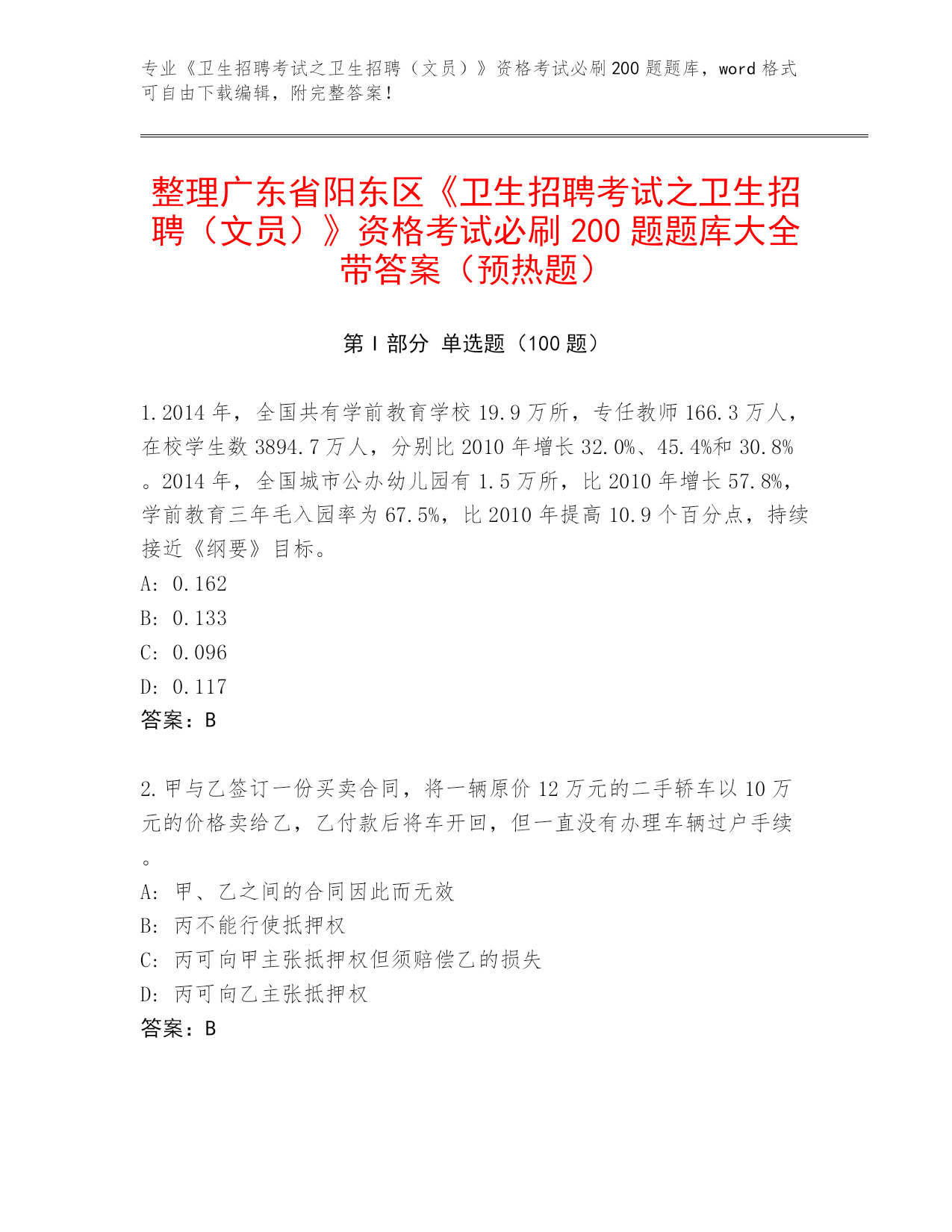 整理广东省阳东区《卫生招聘考试之卫生招聘(文员)》资格考试必刷200题题库大全带答案(预热题)