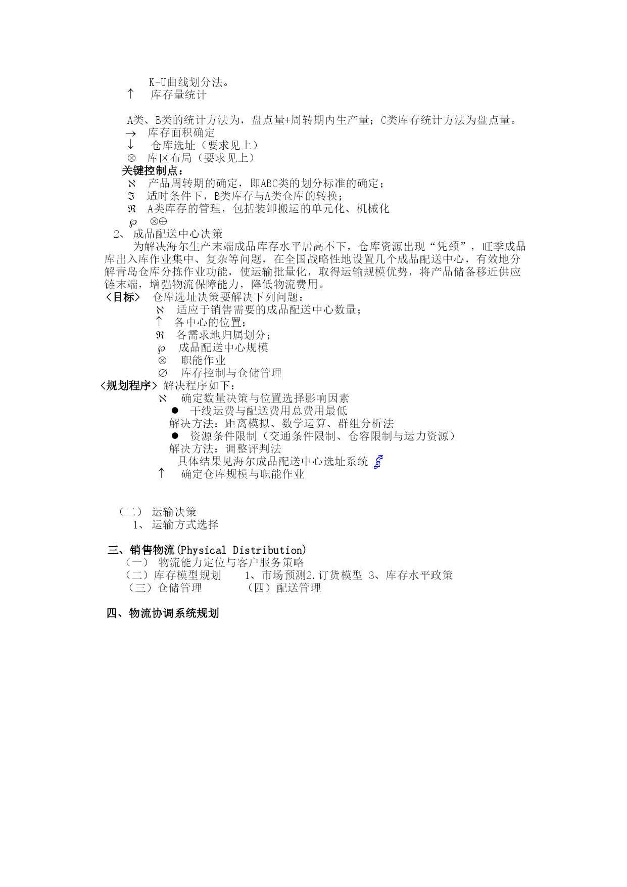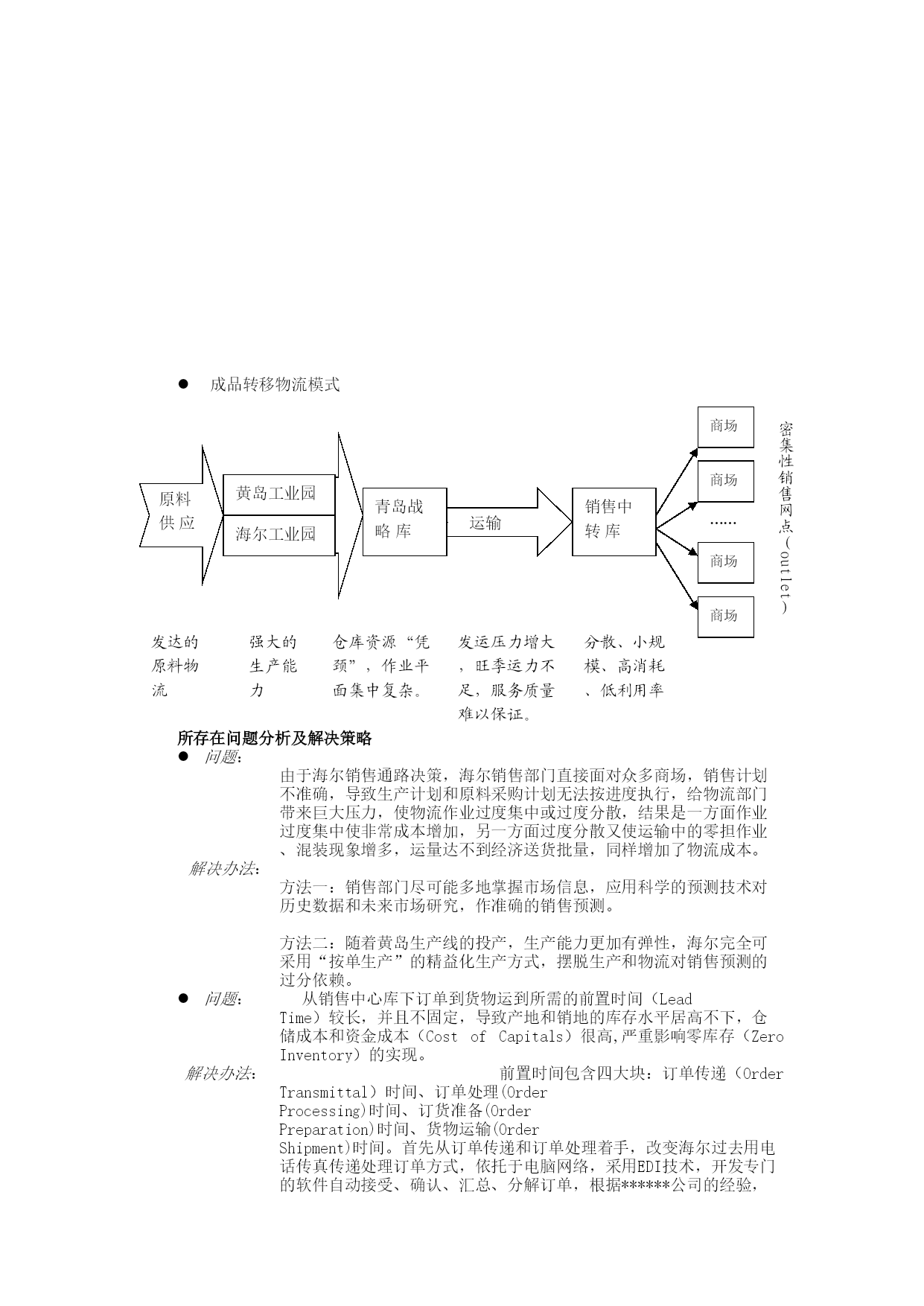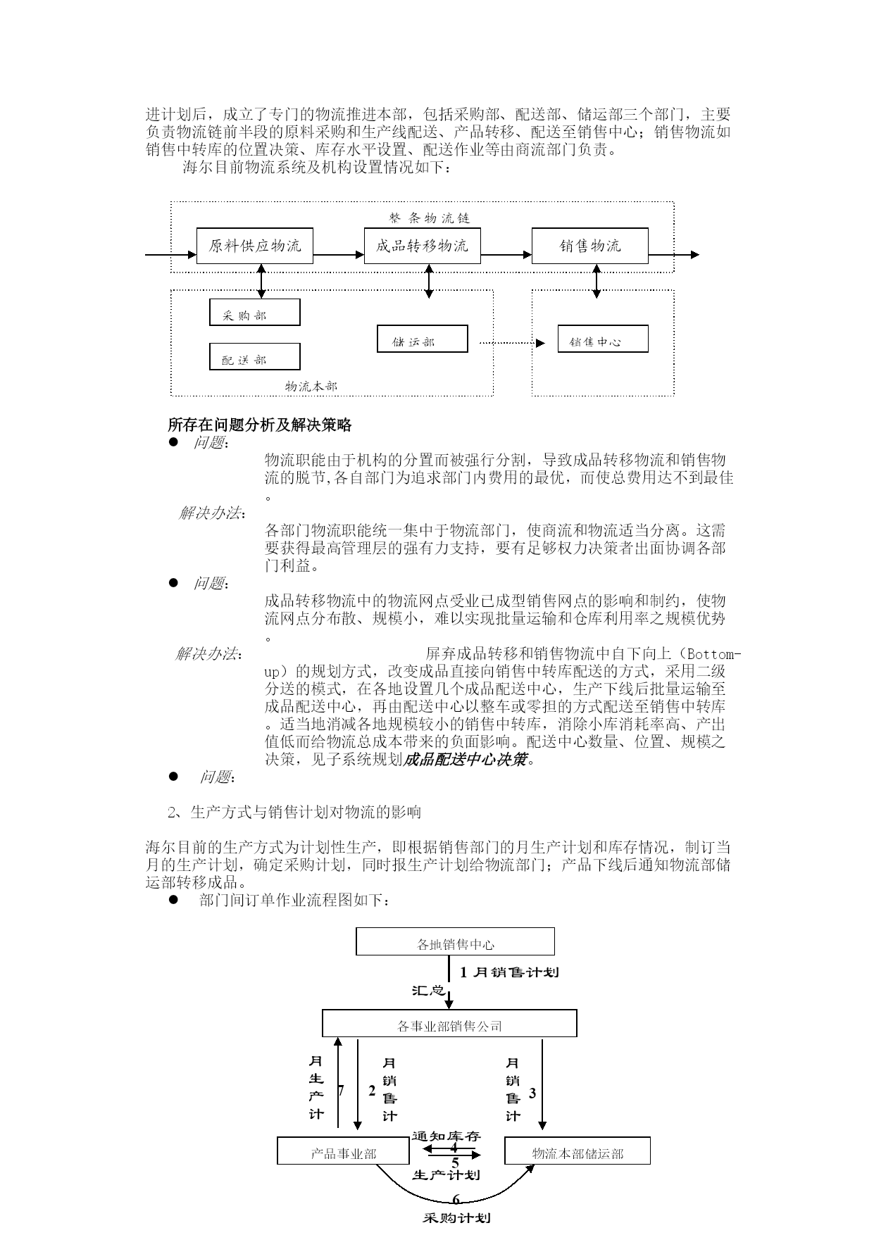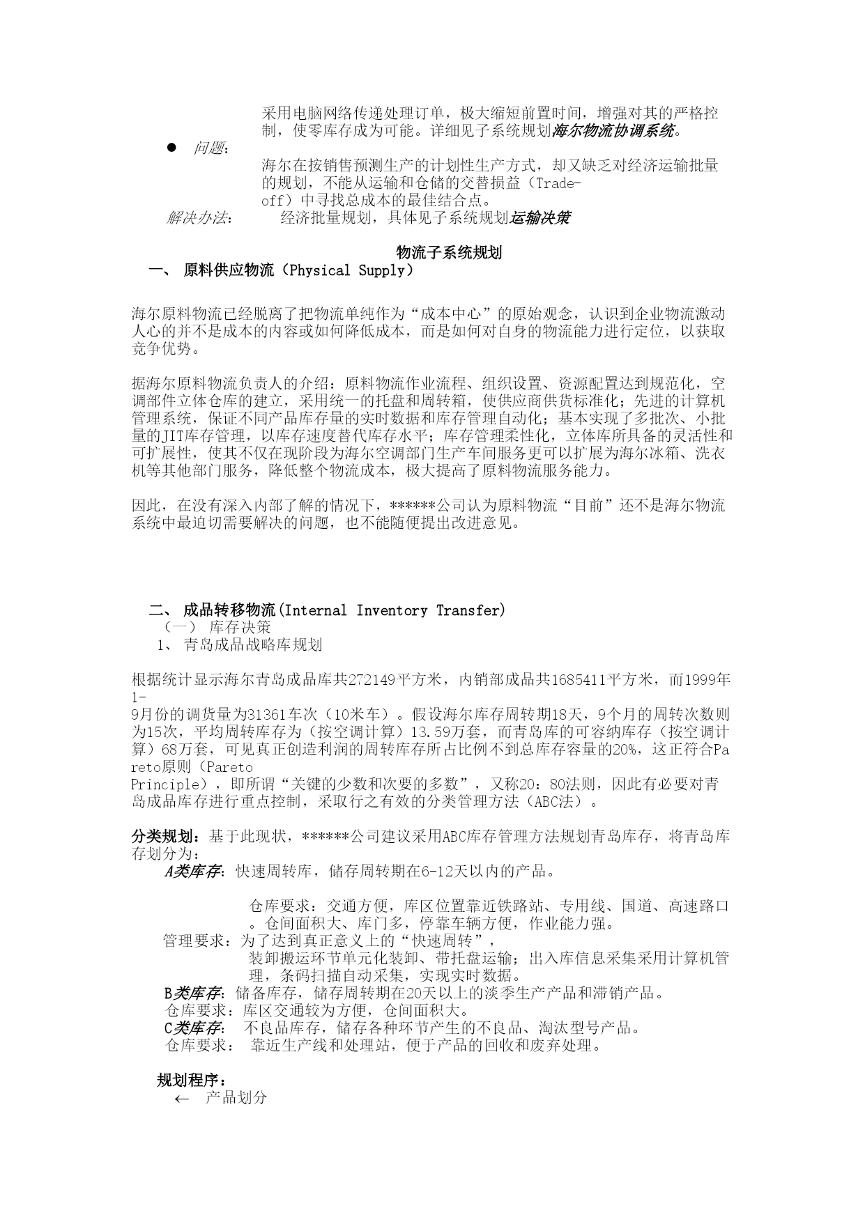 海尔整体物流方案(草案)整体物流方案是在海尔各事业部物流横向整合之后,对海尔物流系统进行的整体设计,重新规划海尔的物流系统,包括集团内部物流组织格局的调整,物流运作模式的优化,现代化物流技术的应用,重点对海尔整条物流链(TotalLogisticsChain)纵向集成,发挥整体物流之规模优势,并把“供应链”的合作思想和“市场链”的优化机制融会于海尔物流体系中,真正地发掘集团的“第三利润源泉”,让海尔集团经济体系中的“黑暗大陆”浮出水面。海尔整体物流系统企业整体物流系统是应用整体系统的方法对实体供给和实体分配,包括市场预测、物料需求、采购、原料供应、货物运输、存货控制、仓储、搬运、包装、顾客服务及物流信息在内的活动予以综合管理,以适当的成本(RightCost)、在适当的时间(RightTime)、适当的地点(RightPlace)向适当的顾客(RightCustomer)提供适当数量(RightQuantity)与适当品质(RightQuality)的适当产品(RightProduct),达到提高顾客服务,降低成本,增进企业利润之目的。一、海尔整体物流系统规划根据生产企业整体物流之结构,海尔物流系统规划为:(一)物流运作系统1、原料供应物流(PhysicalSupply)2、成品转移物流(InternalInventoryTransfer)3、销售物流(PhysicalDistribution)(二)物流协调系统产品市场预测(Product-MarketForecasting)物料需求计划(MaterialsRequirementPlanning)订单处理(OrderProcessing)营运规划(OperationalPlanning)结构功能图如下:销售物流成品转移物流原料供应物流物流运作系统订单处理预测营运规划组装制造加工配件采购物料需求计划物料采购生产程序物流协调系统产品市场原料供应统一由物流部管理二、海尔目前物流运作系统和协调系统分析物流系统及机构设置海尔物流整合以前集团内没有统一的物流部门,各事业部有自己的物流机构,如运输队、仓储科、计划科等,独立经营,各自为阵,仓库、车辆等资源利用率低。集团执行推进计划后,成立了专门的物流推进本部,包括采购部、配送部、储运部三个部门,主要负责物流链前半段的原料采购和生产线配送、产品转移、配送至销售中心;销售物流如销售中转库的位置决策、库存水平设置、配送作业等由商流部门负责。海尔目前物流系统及机构设置情况如下:销售物流成品转移物流原料供应物流整条物流链采购部储运部配送部商流本部销售中心物流本部所存在问题分析及解决策略问题:物流职能由于机构的分置而被强行分割,导致成品转移物流和销售物流的脱节,各自部门为追求部门内费用的最优,而使总费用达不到最佳。解决办法:各部门物流职能统一集中于物流部门,使商流和物流适当分离。这需要获得最高管理层的强有力支持,要有足够权力决策者出面协调各部门利益。问题:成品转移物流中的物流网点受业已成型销售网点的影响和制约,使物流网点分布散、规模小,难以实现批量运输和仓库利用率之规模优势。解决办法:屏弃成品转移和销售物流中自下向上(Bottom-up)的规划方式,改变成品直接向销售中转库配送的方式,采用二级分送的模式,在各地设置几个成品配送中心,生产下线后批量运输至成品配送中心,再由配送中心以整车或零担的方式配送至销售中转库。适当地消减各地规模较小的销售中转库,消除小库消耗率高、产出值低而给物流总成本带来的负面影响。配送中心数量、位置、规模之决策,见子系统规划成品配送中心决策。问题:2、生产方式与销售计划对物流的影响海尔目前的生产方式为计划性生产,即根据销售部门的月生产计划和库存情况,制订当月的生产计划,确定采购计划,同时报生产计划给物流部门;产品下线后通知物流部储运部转移成品。部门间订单作业流程图如下:各地销售中心各事业部销售公司产品事业部物流本部储运部汇总通知库存2345生产计划月销售计划月销售计划采购计划6月生产计划7月销售计划1成品转移物流模式密集性销售网点(outlet)黄岛工业园海尔工业园商场商场商场商场销售中转库……分散、小规模、高消耗、低利用率运输强大的生产能力青岛战略库原料供应发达的原料物流仓库资源“凭颈”,作业平面集中复杂。发运压力增大,旺季运力不足,服务质量难以保证。所存在问题分析及解决策略问题:由于海尔销售通路决策