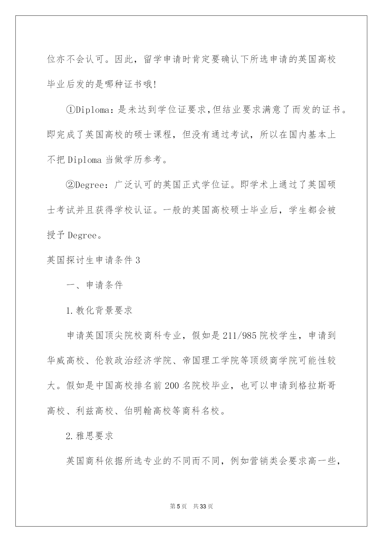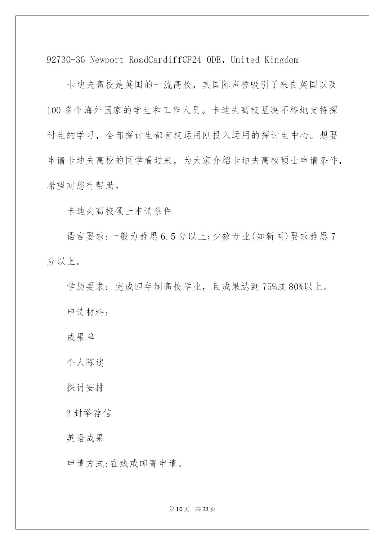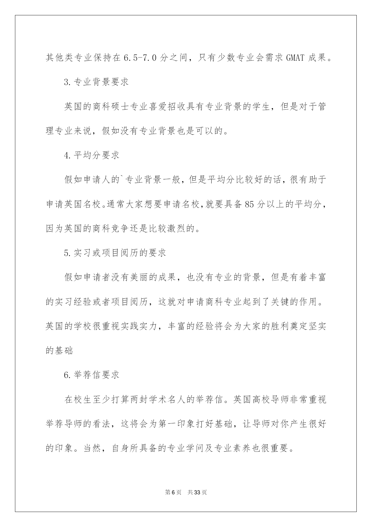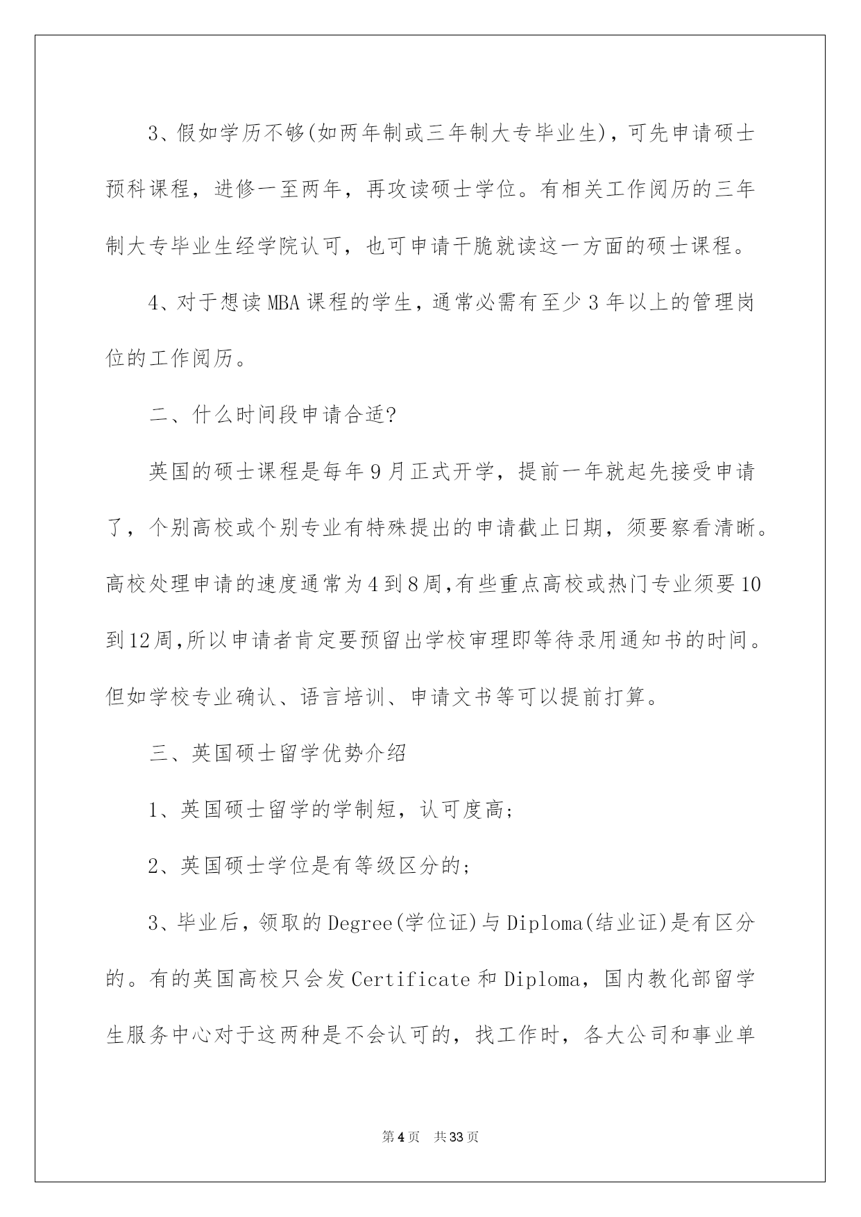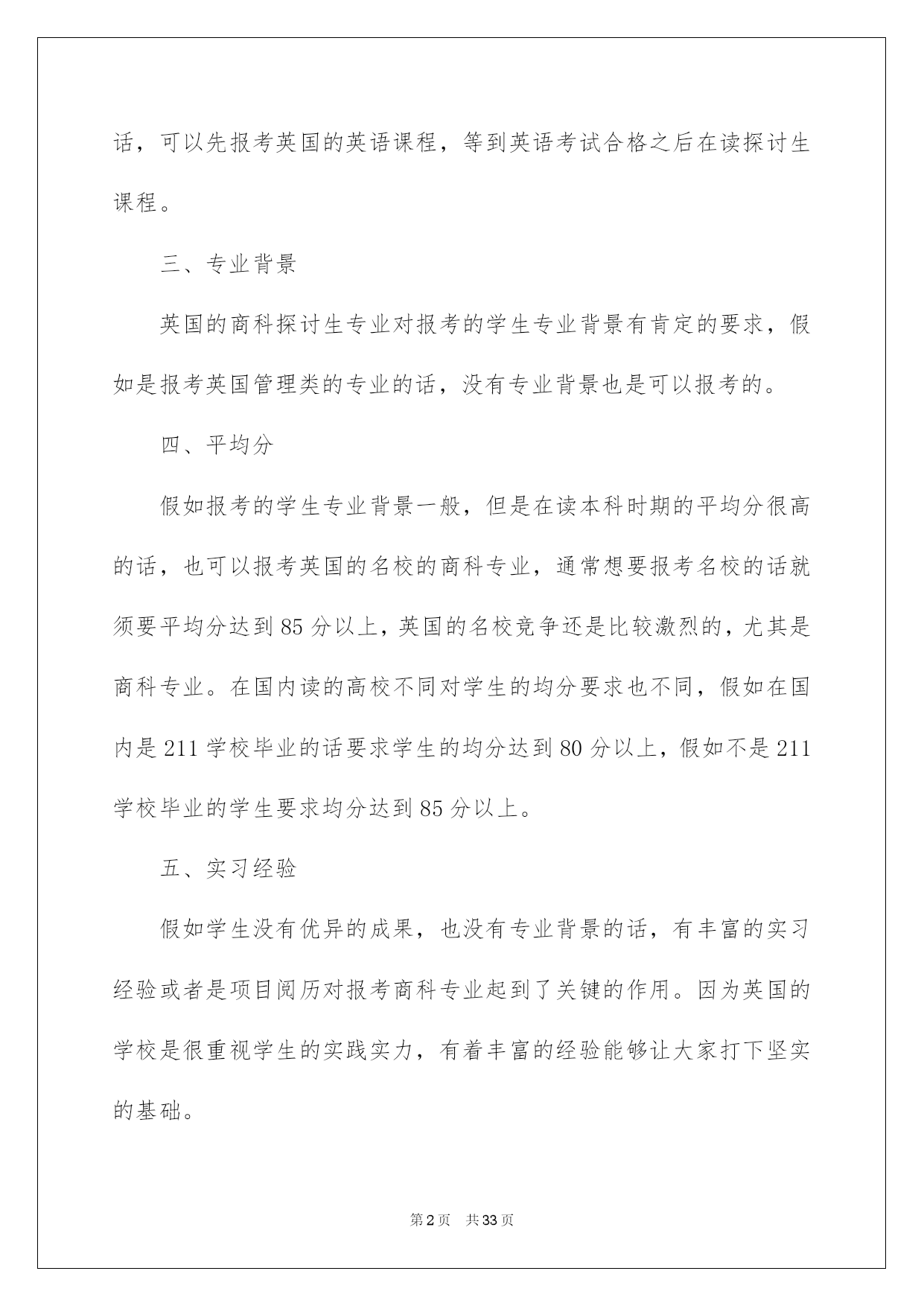 第PAGE\*Arabic\*MERGEFORMAT33页共NUMPAGES\*Arabic\*MERGEFORMAT33页第PAGE\*MERGEFORMAT33页共NUMPAGES\*MERGEFORMAT33页第PAGE\*MERGEFORMAT33页共NUMPAGES\*MERGEFORMAT33页第PAGE\*MERGEFORMAT33页共NUMPAGES\*MERGEFORMAT33页第PAGE\*MERGEFORMAT33页共NUMPAGES\*MERGEFORMAT33页第PAGE\*MERGEFORMAT33页共NUMPAGES\*MERGEFORMAT33页第PAGE\*MERGEFORMAT33页共NUMPAGES\*MERGEFORMAT33页第PAGE\*MERGEFORMAT33页共NUMPAGES\*MERGEFORMAT33页第PAGE\*MERGEFORMAT33页共NUMPAGES\*MERGEFORMAT33页第PAGE\*MERGEFORMAT33页共NUMPAGES\*MERGEFORMAT33页第PAGE\*MERGEFORMAT33页共NUMPAGES\*MERGEFORMAT33页2022英国研究生申请条件英国探讨生申请条件汇编12篇英国探讨生申请条件1商科专业始终以来都是留学生选择的热门专业,在英国商科专业的范围广泛,可以供应给来自不同国家的学生学习。报考英国商科探讨生都有哪些条件呢?随着来看看吧!一、教化背景报考英国顶尖高校的商科,假如学生在国内读的高校是211/985高校的话,报考英国G5高校的顶尖商学院有很大的优势,假如是在中国高校排名前200名的学校毕业,也可以报考利兹高校、伯明翰高校等商科专业。二、语言英国的商科专业对学生的IELTS要求依据所选的专业不同而有所不同,比如报考营销类的专业对学生的IELTS的要求会高一些,其他的专业会要求学生的IELTS的分数考到6.5—7.0分之间,少数商科专业要求学生递交GMAT成果。对于学生的语言水平没有达到学校要求的话,可以先报考英国的英语课程,等到英语考试合格之后在读探讨生课程。三、专业背景英国的商科探讨生专业对报考的学生专业背景有肯定的要求,假如是报考英国管理类的专业的话,没有专业背景也是可以报考的。四、平均分假如报考的学生专业背景一般,但是在读本科时期的平均分很高的话,也可以报考英国的名校的商科专业,通常想要报考名校的话就须要平均分达到85分以上,英国的名校竞争还是比较激烈的,尤其是商科专业。在国内读的高校不同对学生的均分要求也不同,假如在国内是211学校毕业的话要求学生的均分达到80分以上,假如不是211学校毕业的学生要求均分达到85分以上。五、实习经验假如学生没有优异的成果,也没有专业背景的话,有丰富的实习经验或者是项目阅历对报考商科专业起到了关键的作用。因为英国的学校是很重视学生的实践实力,有着丰富的经验能够让大家打下坚实的基础。六、举荐信对于本科在校生至少须要递交两封学术举荐信,英国的高校的导师是特别重视学生导师的看法,这会为学生的第一印象打下基础,让英国的导师对你产生良好的印象,不过学生自己所具备的专业学问以及专业的素养也是很重要的。英国探讨生申请条件2一、英国探讨生留学申请条件英国并没有统一的硕士课程入学考试,每所高校自行确定每一个探讨生课程的录用条件差不多,个别专业要求不一样,同学们可针对性了解。常规的硕士入学条件是:1、有相关学科的本科学位。2、英语水平考试成果达到肯定要求,如雅思成果在6.5分以上。假如学生语言水平未达到入学标准,也可以先申请英国的学前语言课程,然后在英国参与语言考试,合格后再由学校发探讨生录用通知。另外,一些英国高校也在开学前或开学初期,向海外学生供应一些免费的语言课程,帮助他们尽快克服语言障碍。3、假如学历不够(如两年制或三年制大专毕业生),可先申请硕士预科课程,进修一至两年,再攻读硕士学位。有相关工作阅历的三年制大专毕业生经学院认可,也可申请干脆就读这一方面的硕士课程。4、对于想读MBA课程的学生,通常必需有至少3年以上的管理岗位的工作阅历。二、什么时间段申请合适?英国的硕士课程是每年9月正式开学,提前一年就起先接受申请了,个别高校或个别专业有特殊提出的申请截止日期,须要察看清晰。高校处理申请的速度通常为4到8周,有些重点高校或热门专业须要10到12周,所以申请者肯定要预留出学校审理即等待录用通知书的时间。但如学校专业确认、语言培训、申请文书等可以提前打算。三、英国硕士留学优势介绍1、英国硕士留学的学制短,认可度高;2、英国硕士