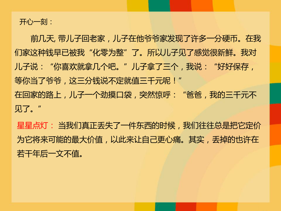 每日速递夏季吃虾别“瞎”吃如何鉴别死虾看颜色识别生熟莫吃虾头毒素多前几天,带儿子回老家,儿子在他爷爷家发现了许多一分硬币。在我们家这种钱早已被我“化零为整”了。所以儿子见了感觉很新鲜。我对儿子说:“你喜欢就拿几个吧。”儿子拿了三个,我说:“好好保存,等你当了爷爷,这三分钱说不定就值三千元呢!”在回家的路上,儿子一个劲摸口袋,突然惊呼:“爸爸,我的三千元不见了。”
