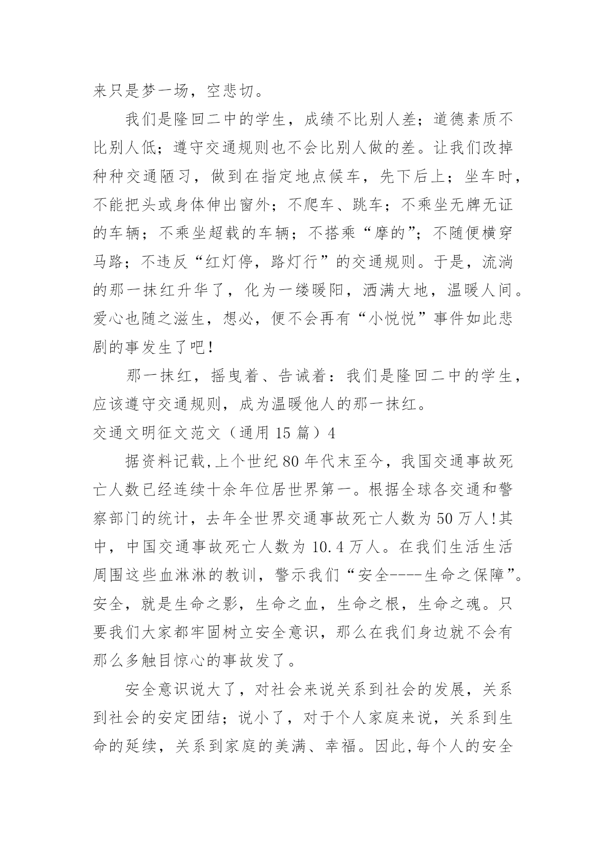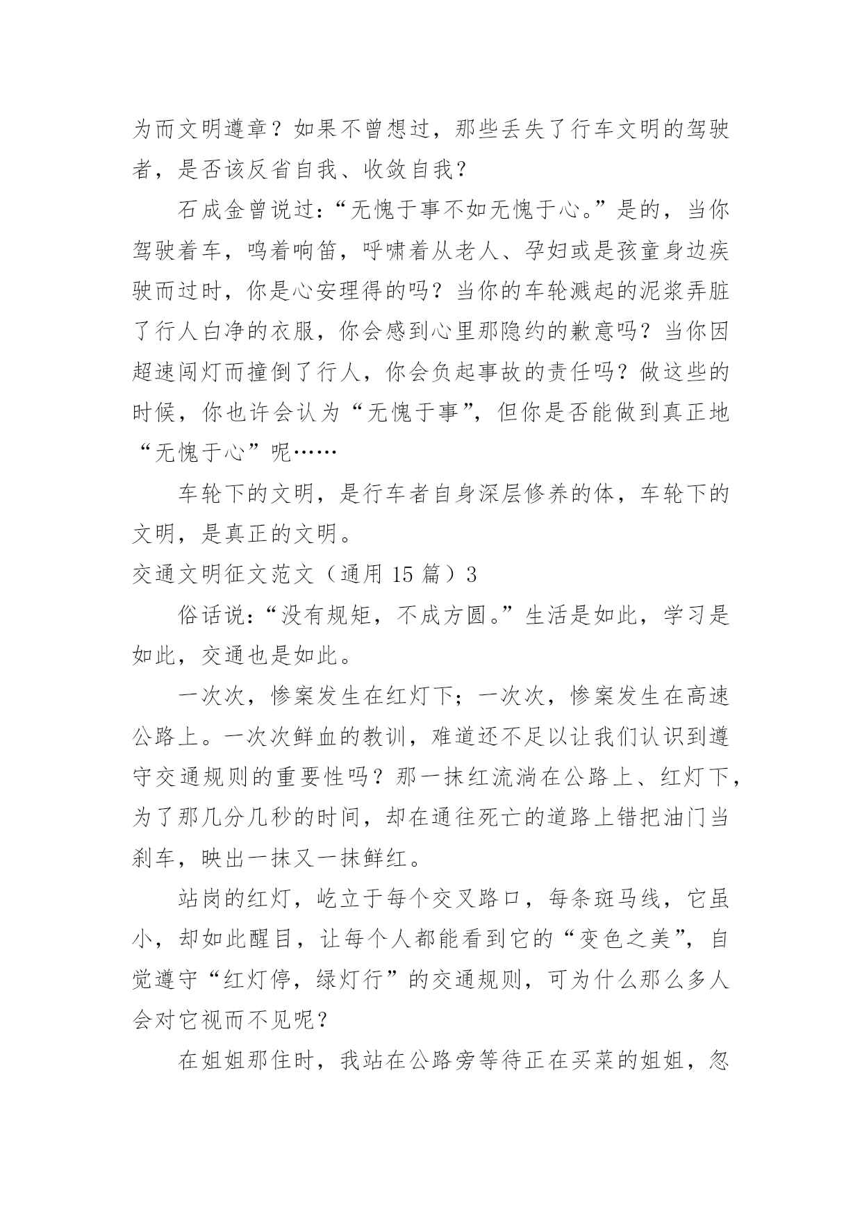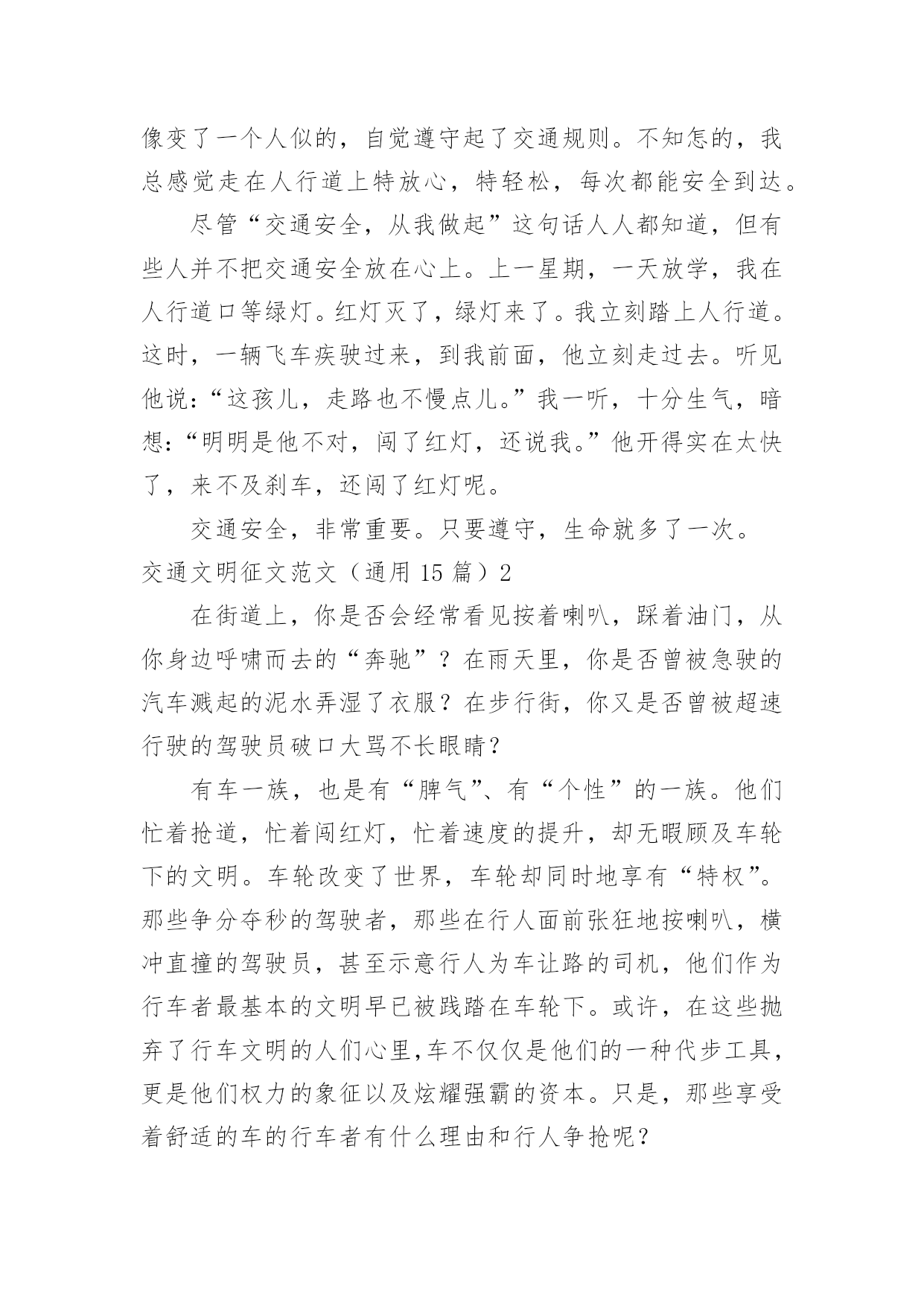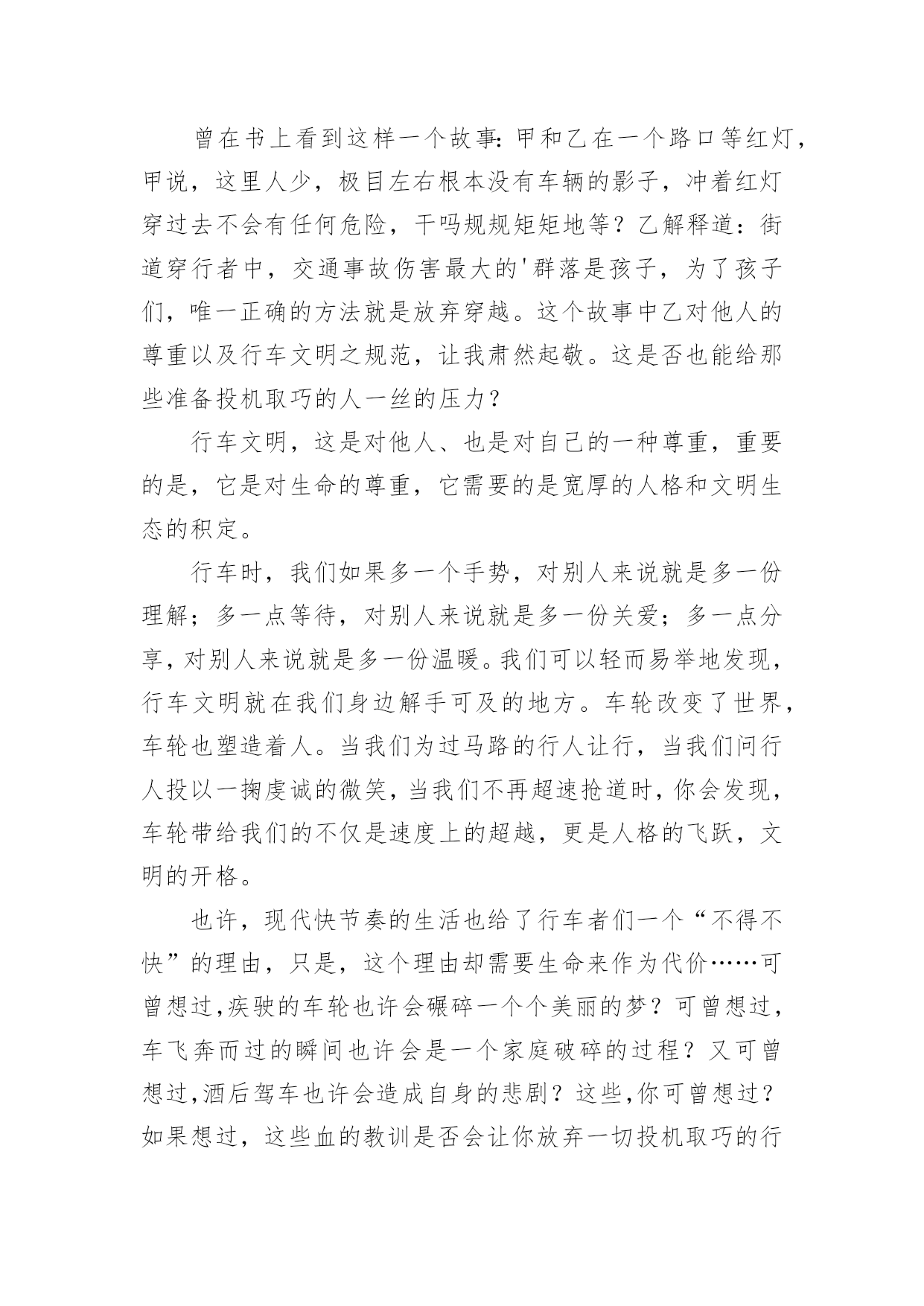 交通文明征文交通文明征文范文(通用15篇)【优选15篇】在日常学习、工作和生活中,说到征文,大家肯定都不陌生吧,征文要求文面整洁干净,书写端正美观,字体清晰规范,标点准确无误。你所见过的征文是什么样的呢?以下是小编收集整理的交通文明征文范文(通用15篇),希望对大家有所帮助。交通文明征文范文(通用15篇)1交通安全,十分重要。危险每一刻都在我们身边,特别是交通安全。但如果我们时时刻刻都观察着它,躲着它,它就不会匆匆地来到我们身边。这让我想起了寒假那件事:那天,天气比以往有些暖和,正可以让我出去找朋友玩。走到一个十字路口,由于我以往不经常走人行道,这次又站到了路口,然后我跑了过去。这时,一辆电动车驶了过来,我被撞倒了。电动车司机急忙说:“没事吧?”“没事、没事。”我十分恐惧。站起来一看红绿灯,这我才意识到:“闯了红灯。”就这样,我低着头走了。“这是我的错,我不该闯红灯!不该不走人行道!”我在心里反省自己。所以,我暗暗下了决心:“从今往后,我一定要遵守交通规则,不遵守就要惩罚自己。”这句话就牢牢的`记在了我的心里。从此以后,我不知是否被惩罚吓倒了?还是怎么样?竟像变了一个人似的,自觉遵守起了交通规则。不知怎的,我总感觉走在人行道上特放心,特轻松,每次都能安全到达。尽管“交通安全,从我做起”这句话人人都知道,但有些人并不把交通安全放在心上。上一星期,一天放学,我在人行道口等绿灯。红灯灭了,绿灯来了。我立刻踏上人行道。这时,一辆飞车疾驶过来,到我前面,他立刻走过去。听见他说:“这孩儿,走路也不慢点儿。”我一听,十分生气,暗想:“明明是他不对,闯了红灯,还说我。”他开得实在太快了,来不及刹车,还闯了红灯呢。交通安全,非常重要。只要遵守,生命就多了一次。交通文明征文范文(通用15篇)2在街道上,你是否会经常看见按着喇叭,踩着油门,从你身边呼啸而去的“奔驰”?在雨天里,你是否曾被急驶的汽车溅起的泥水弄湿了衣服?在步行街,你又是否曾被超速行驶的驾驶员破口大骂不长眼睛?有车一族,也是有“脾气”、有“个性”的一族。他们忙着抢道,忙着闯红灯,忙着速度的提升,却无暇顾及车轮下的文明。车轮改变了世界,车轮却同时地享有“特权”。那些争分夺秒的驾驶者,那些在行人面前张狂地按喇叭,横冲直撞的驾驶员,甚至示意行人为车让路的司机,他们作为行车者最基本的文明早已被践踏在车轮下。或许,在这些抛弃了行车文明的人们心里,车不仅仅是他们的一种代步工具,更是他们权力的象征以及炫耀强霸的资本。只是,那些享受着舒适的车的行车者有什么理由和行人争抢呢?曾在书上看到这样一个故事:甲和乙在一个路口等红灯,甲说,这里人少,极目左右根本没有车辆的影子,冲着红灯穿过去不会有任何危险,干吗规规矩矩地等?乙解释道:街道穿行者中,交通事故伤害最大的'群落是孩子,为了孩子们,唯一正确的方法就是放弃穿越。这个故事中乙对他人的尊重以及行车文明之规范,让我肃然起敬。这是否也能给那些准备投机取巧的人一丝的压力?行车文明,这是对他人、也是对自己的一种尊重,重要的是,它是对生命的尊重,它需要的是宽厚的人格和文明生态的积定。行车时,我们如果多一个手势,对别人来说就是多一份理解;多一点等待,对别人来说就是多一份关爱;多一点分享,对别人来说就是多一份温暖。我们可以轻而易举地发现,行车文明就在我们身边解手可及的地方。车轮改变了世界,车轮也塑造着人。当我们为过马路的行人让行,当我们问行人投以一掬虔诚的微笑,当我们不再超速抢道时,你会发现,车轮带给我们的不仅是速度上的超越,更是人格的飞跃,文明的开格。也许,现代快节奏的生活也给了行车者们一个“不得不快”的理由,只是,这个理由却需要生命来作为代价……可曾想过,疾驶的车轮也许会碾碎一个个美丽的梦?可曾想过,车飞奔而过的瞬间也许会是一个家庭破碎的过程?又可曾想过,酒后驾车也许会造成自身的悲剧?这些,你可曾想过?如果想过,这些血的教训是否会让你放弃一切投机取巧的行为而文明遵章?如果不曾想过,那些丢失了行车文明的驾驶者,是否该反省自我、收敛自我?石成金曾说过:“无愧于事不如无愧于心。”是的,当你驾驶着车,鸣着响笛,呼啸着从老人、孕妇或是孩童身边疾驶而过时,你是心安理得的吗?当你的车轮溅起的泥浆弄脏了行人白净的衣服,你会感到心里那隐约的歉意吗?当你因超速闯灯而撞倒了行人,你会负起事故的责任吗?做这些的时候,你也许会认为“无愧于事”,但你是否能做到真正地“无愧于心”呢……车轮下的文明,是行车者自身深层修养的体,车轮下的文明,是真正的文明。交通文明征文范文(通用15篇)3俗话说:“没有规矩,不成方圆。”生活是如此,学习是如此,交通也是如此。一次次,惨案发生在红灯下;一次次,惨案发生在高速公路上。一次次鲜血的教训,难道还不足以让我们认识到遵守交通规则的重要性吗?那一抹红流淌在公路上、红