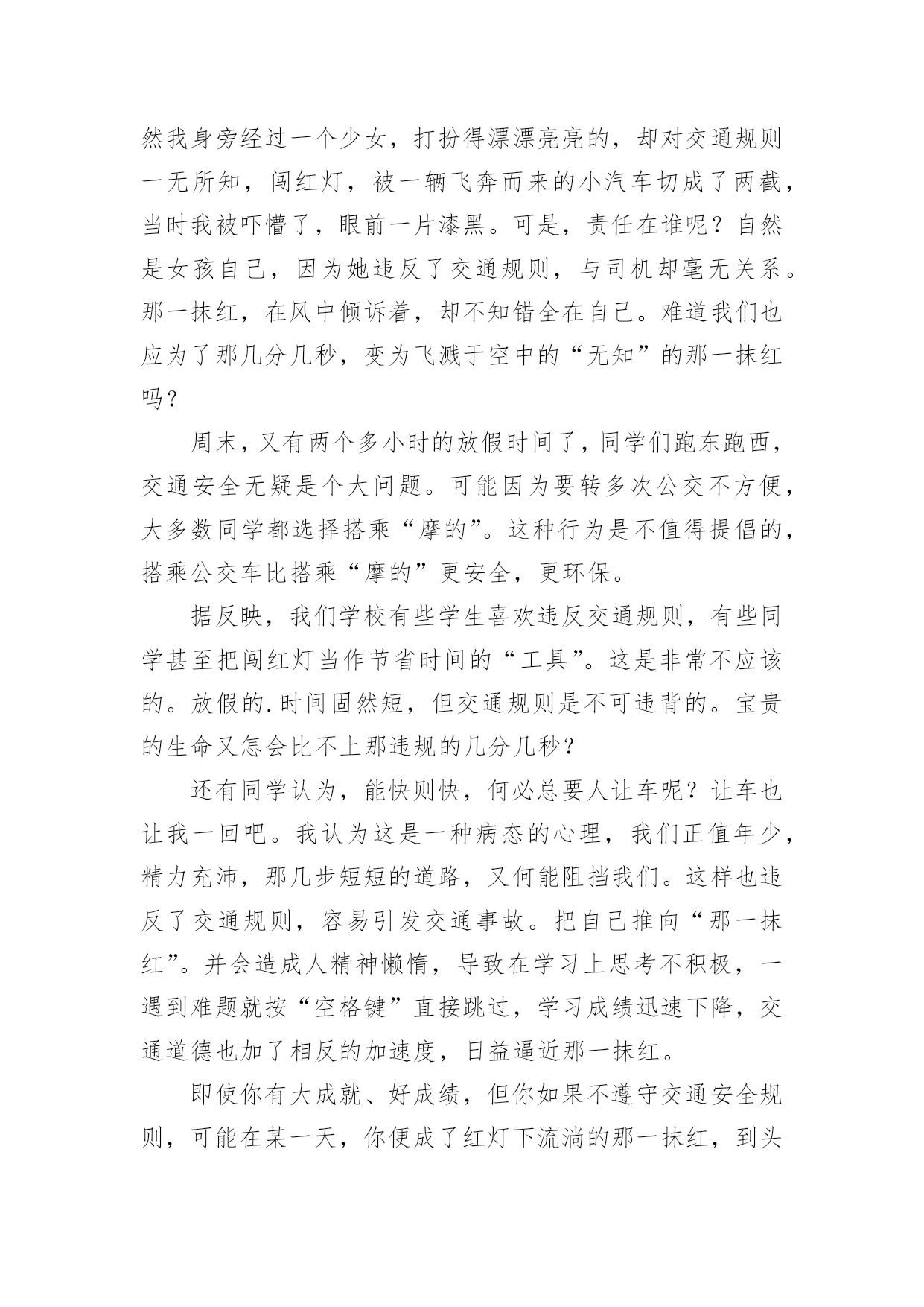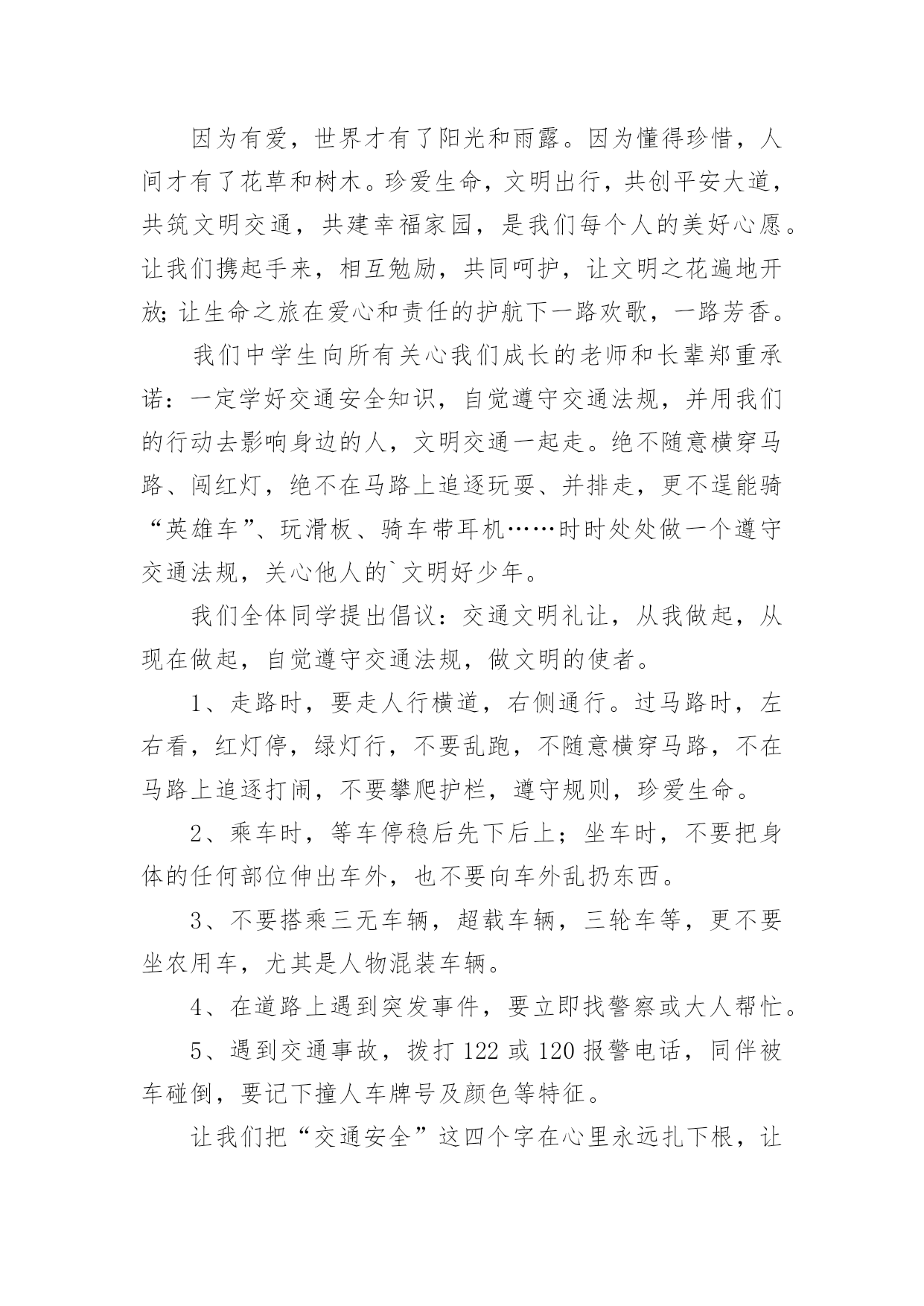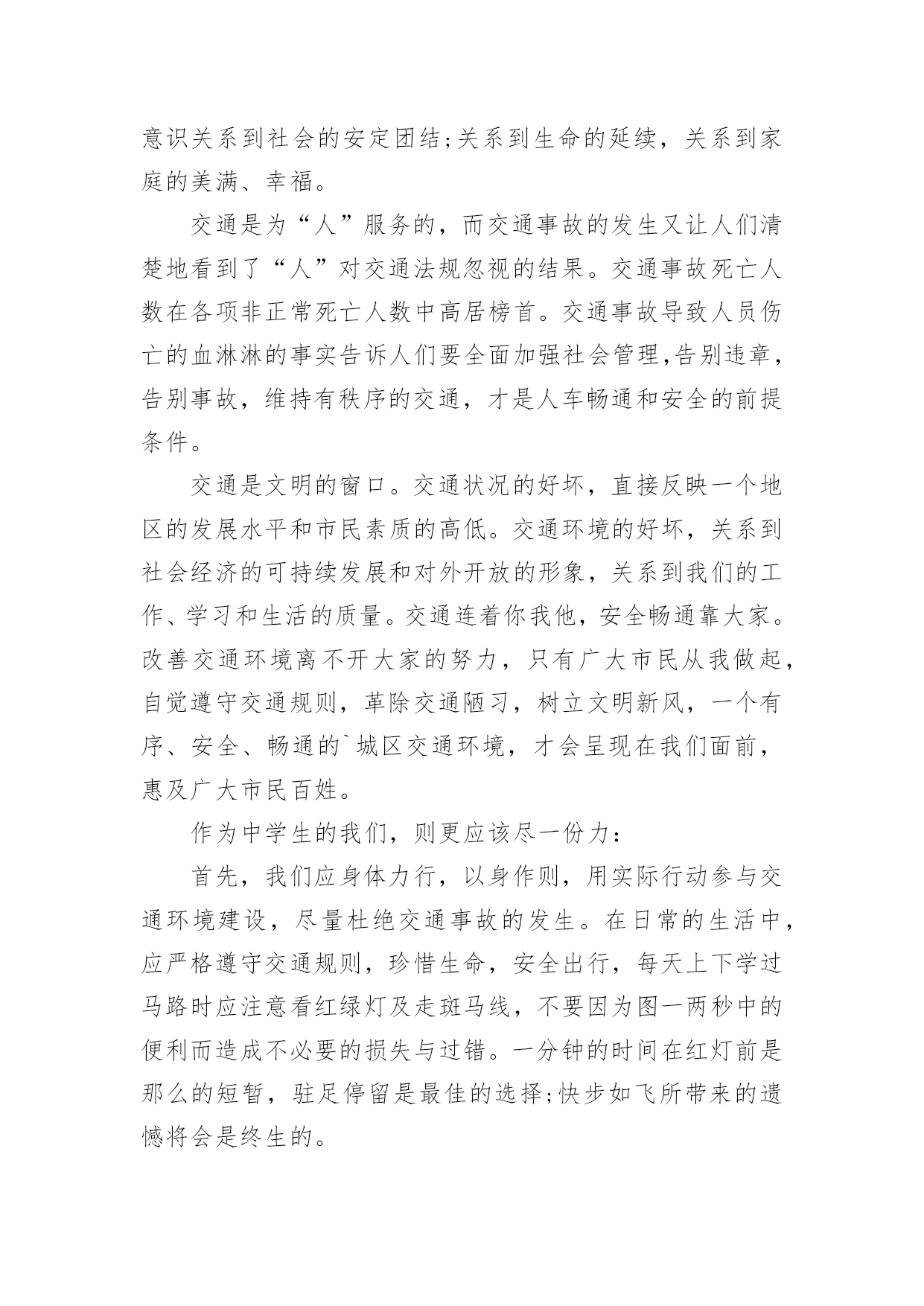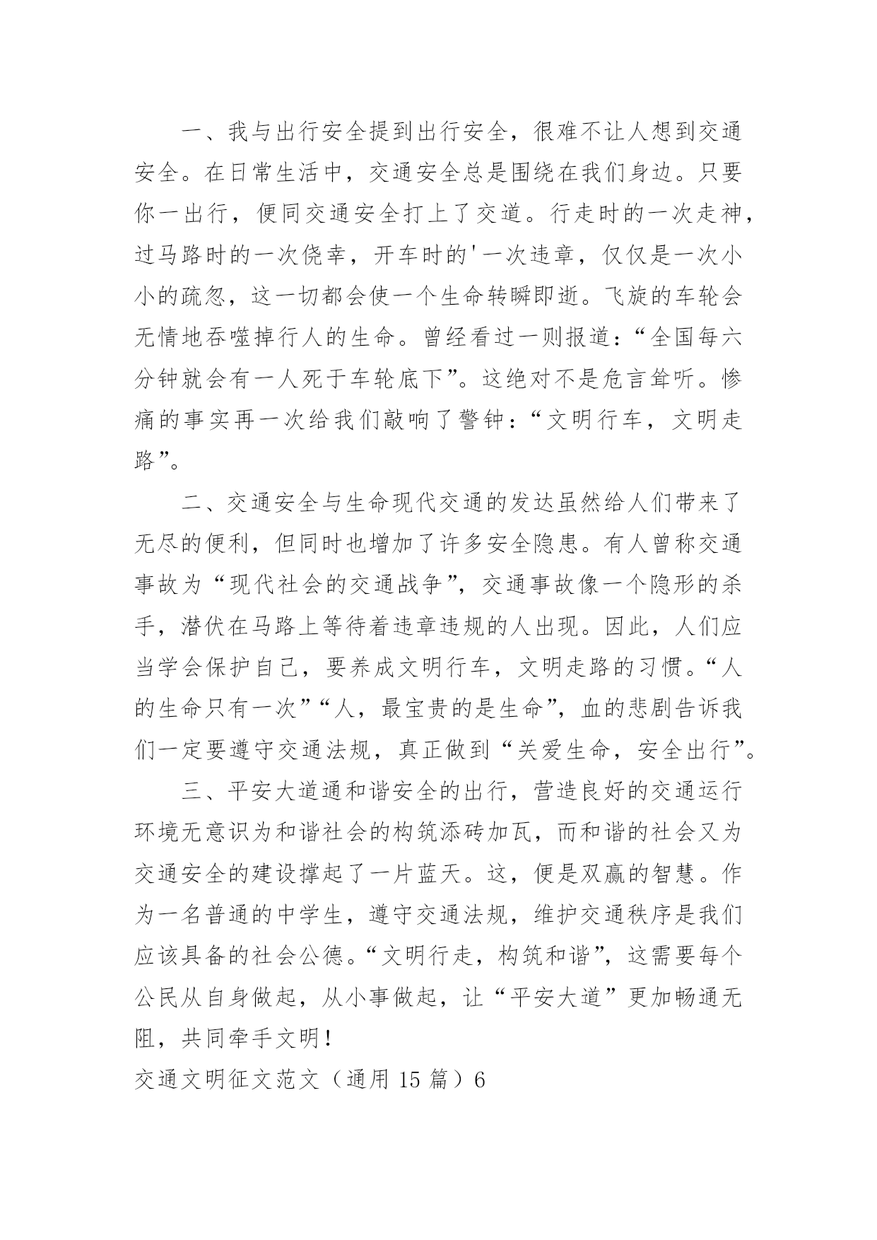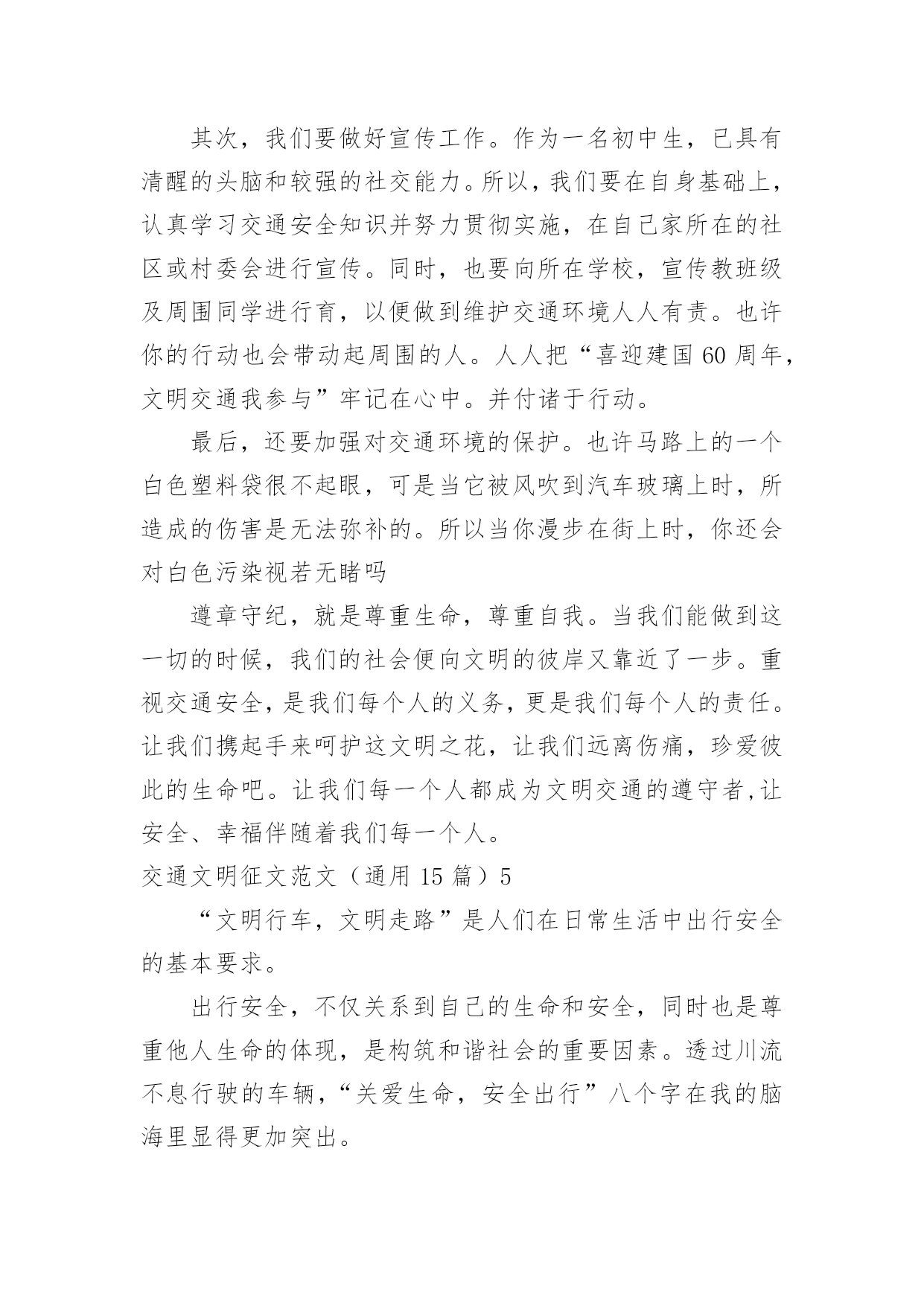 交通文明征文交通文明征文范文(通用15篇)【优选15篇】在日常学习、工作和生活中,说到征文,大家肯定都不陌生吧,征文要求文面整洁干净,书写端正美观,字体清晰规范,标点准确无误。你所见过的征文是什么样的呢?以下是小编收集整理的交通文明征文范文(通用15篇),希望对大家有所帮助。交通文明征文范文(通用15篇)1交通安全,十分重要。危险每一刻都在我们身边,特别是交通安全。但如果我们时时刻刻都观察着它,躲着它,它就不会匆匆地来到我们身边。这让我想起了寒假那件事:那天,天气比以往有些暖和,正可以让我出去找朋友玩。走到一个十字路口,由于我以往不经常走人行道,这次又站到了路口,然后我跑了过去。这时,一辆电动车驶了过来,我被撞倒了。电动车司机急忙说:“没事吧?”“没事、没事。”我十分恐惧。站起来一看红绿灯,这我才意识到:“闯了红灯。”就这样,我低着头走了。“这是我的错,我不该闯红灯!不该不走人行道!”我在心里反省自己。所以,我暗暗下了决心:“从今往后,我一定要遵守交通规则,不遵守就要惩罚自己。”这句话就牢牢的`记在了我的心里。从此以后,我不知是否被惩罚吓倒了?还是怎么样?竟像变了一个人似的,自觉遵守起了交通规则。不知怎的,我总感觉走在人行道上特放心,特轻松,每次都能安全到达。尽管“交通安全,从我做起”这句话人人都知道,但有些人并不把交通安全放在心上。上一星期,一天放学,我在人行道口等绿灯。红灯灭了,绿灯来了。我立刻踏上人行道。这时,一辆飞车疾驶过来,到我前面,他立刻走过去。听见他说:“这孩儿,走路也不慢点儿。”我一听,十分生气,暗想:“明明是他不对,闯了红灯,还说我。”他开得实在太快了,来不及刹车,还闯了红灯呢。交通安全,非常重要。只要遵守,生命就多了一次。交通文明征文范文(通用15篇)2在街道上,你是否会经常看见按着喇叭,踩着油门,从你身边呼啸而去的“奔驰”?在雨天里,你是否曾被急驶的汽车溅起的泥水弄湿了衣服?在步行街,你又是否曾被超速行驶的驾驶员破口大骂不长眼睛?有车一族,也是有“脾气”、有“个性”的一族。他们忙着抢道,忙着闯红灯,忙着速度的提升,却无暇顾及车轮下的文明。车轮改变了世界,车轮却同时地享有“特权”。那些争分夺秒的驾驶者,那些在行人面前张狂地按喇叭,横冲直撞的驾驶员,甚至示意行人为车让路的司机,他们作为行车者最基本的文明早已被践踏在车轮下。或许,在这些抛弃了行车文明的人们心里,车不仅仅是他们的一种代步工具,更是他们权力的象征以及炫耀强霸的资本。只是,那些享受着舒适的车的行车者有什么理由和行人争抢呢?曾在书上看到这样一个故事:甲和乙在一个路口等红灯,甲说,这里人少,极目左右根本没有车辆的影子,冲着红灯穿过去不会有任何危险,干吗规规矩矩地等?乙解释道:街道穿行者中,交通事故伤害最大的'群落是孩子,为了孩子们,唯一正确的方法就是放弃穿越。这个故事中乙对他人的尊重以及行车文明之规范,让我肃然起敬。这是否也能给那些准备投机取巧的人一丝的压力?行车文明,这是对他人、也是对自己的一种尊重,重要的是,它是对生命的尊重,它需要的是宽厚的人格和文明生态的积定。行车时,我们如果多一个手势,对别人来说就是多一份理解;多一点等待,对别人来说就是多一份关爱;多一点分享,对别人来说就是多一份温暖。我们可以轻而易举地发现,行车文明就在我们身边解手可及的地方。车轮改变了世界,车轮也塑造着人。当我们为过马路的行人让行,当我们问行人投以一掬虔诚的微笑,当我们不再超速抢道时,你会发现,车轮带给我们的不仅是速度上的超越,更是人格的飞跃,文明的开格。也许,现代快节奏的生活也给了行车者们一个“不得不快”的理由,只是,这个理由却需要生命来作为代价……可曾想过,疾驶的车轮也许会碾碎一个个美丽的梦?可曾想过,车飞奔而过的瞬间也许会是一个家庭破碎的过程?又可曾想过,酒后驾车也许会造成自身的悲剧?这些,你可曾想过?如果想过,这些血的教训是否会让你放弃一切投机取巧的行为而文明遵章?如果不曾想过,那些丢失了行车文明的驾驶者,是否该反省自我、收敛自我?石成金曾说过:“无愧于事不如无愧于心。”是的,当你驾驶着车,鸣着响笛,呼啸着从老人、孕妇或是孩童身边疾驶而过时,你是心安理得的吗?当你的车轮溅起的泥浆弄脏了行人白净的衣服,你会感到心里那隐约的歉意吗?当你因超速闯灯而撞倒了行人,你会负起事故的责任吗?做这些的时候,你也许会认为“无愧于事”,但你是否能做到真正地“无愧于心”呢……车轮下的文明,是行车者自身深层修养的体,车轮下的文明,是真正的文明。交通文明征文范文(通用15篇)3俗话说:“没有规矩,不成方圆。”生活是如此,学习是如此,交通也是如此。一次次,惨案发生在红灯下;一次次,惨案发生在高速公路上。一次次鲜血的教训,难道还不足以让我们认识到遵守交通规则的重要性吗?那一抹红流淌在公路上、红