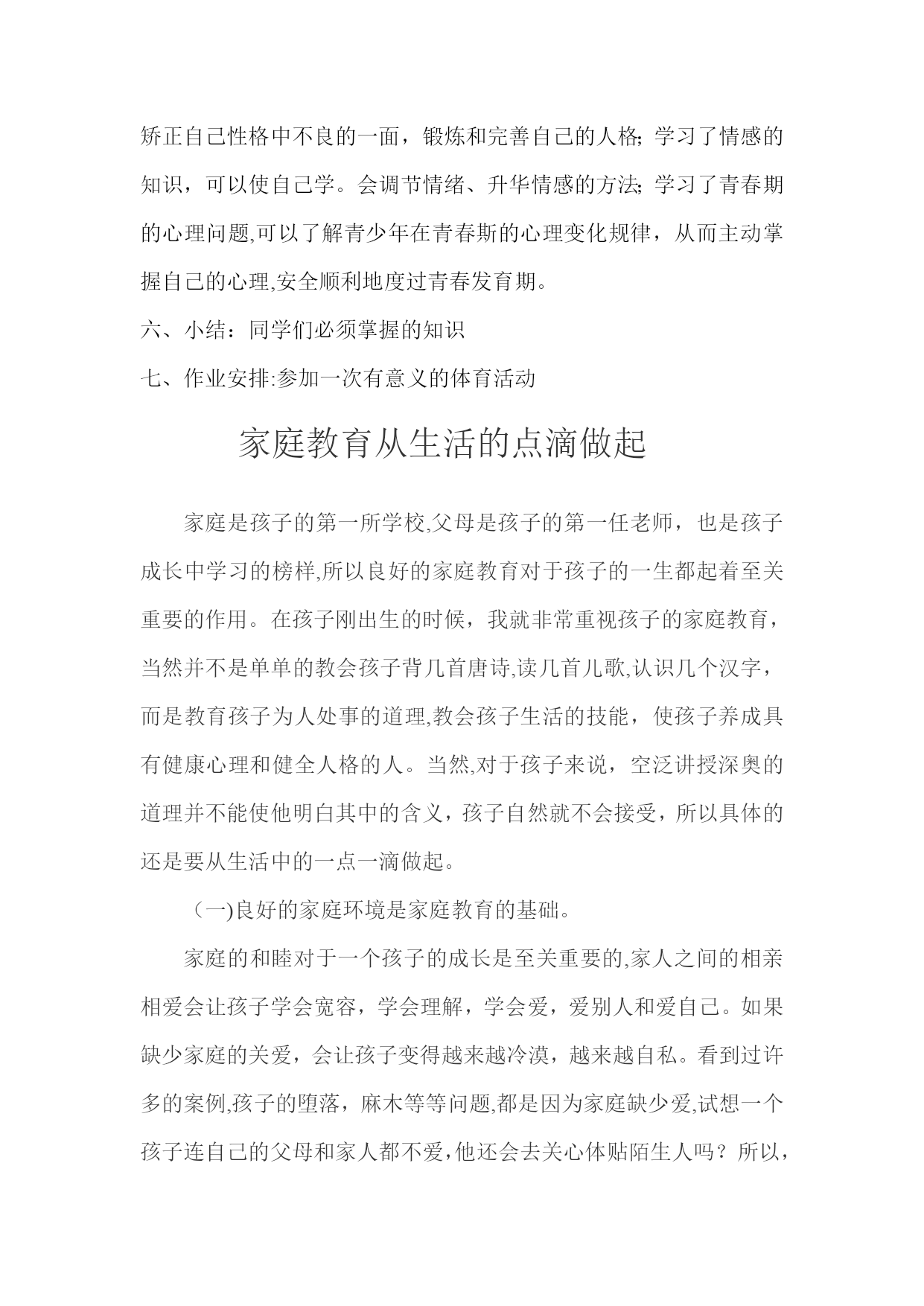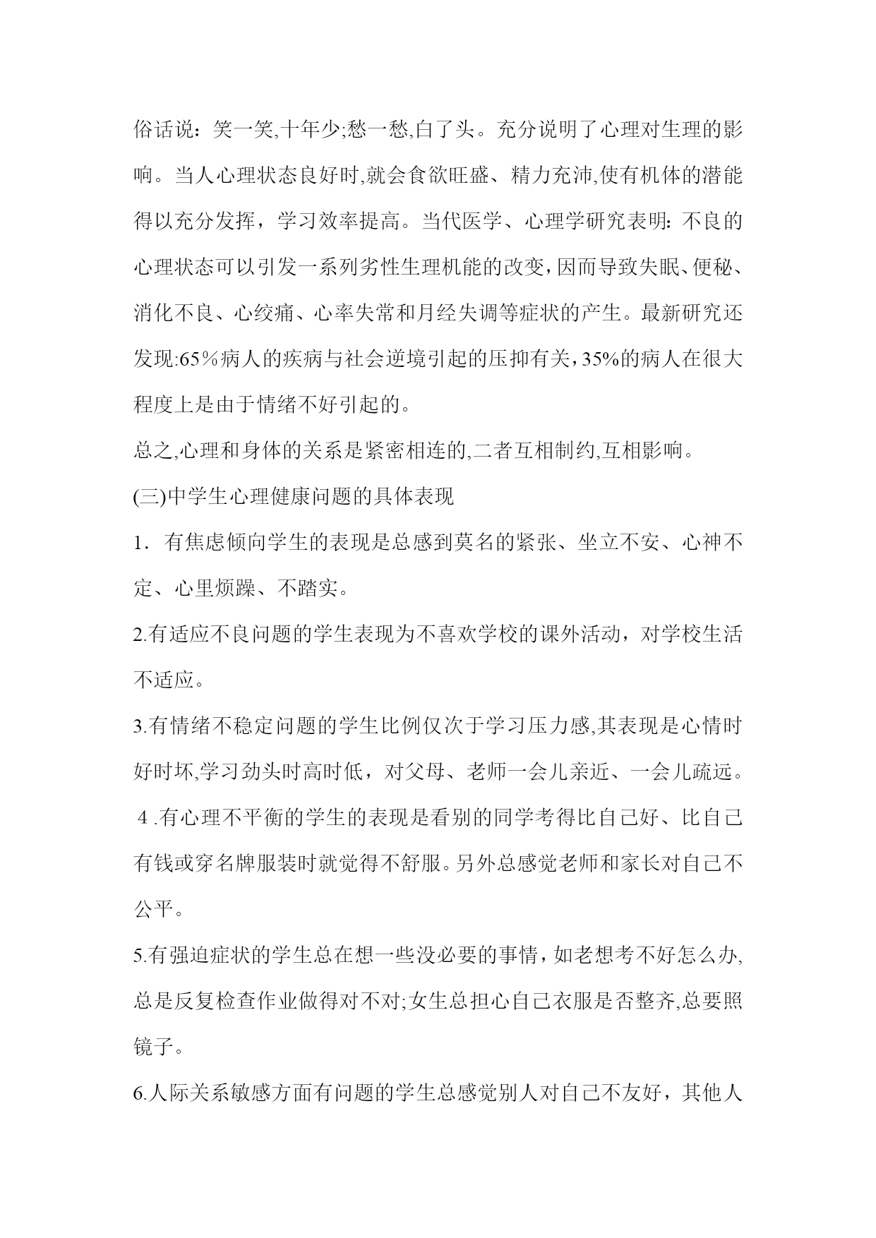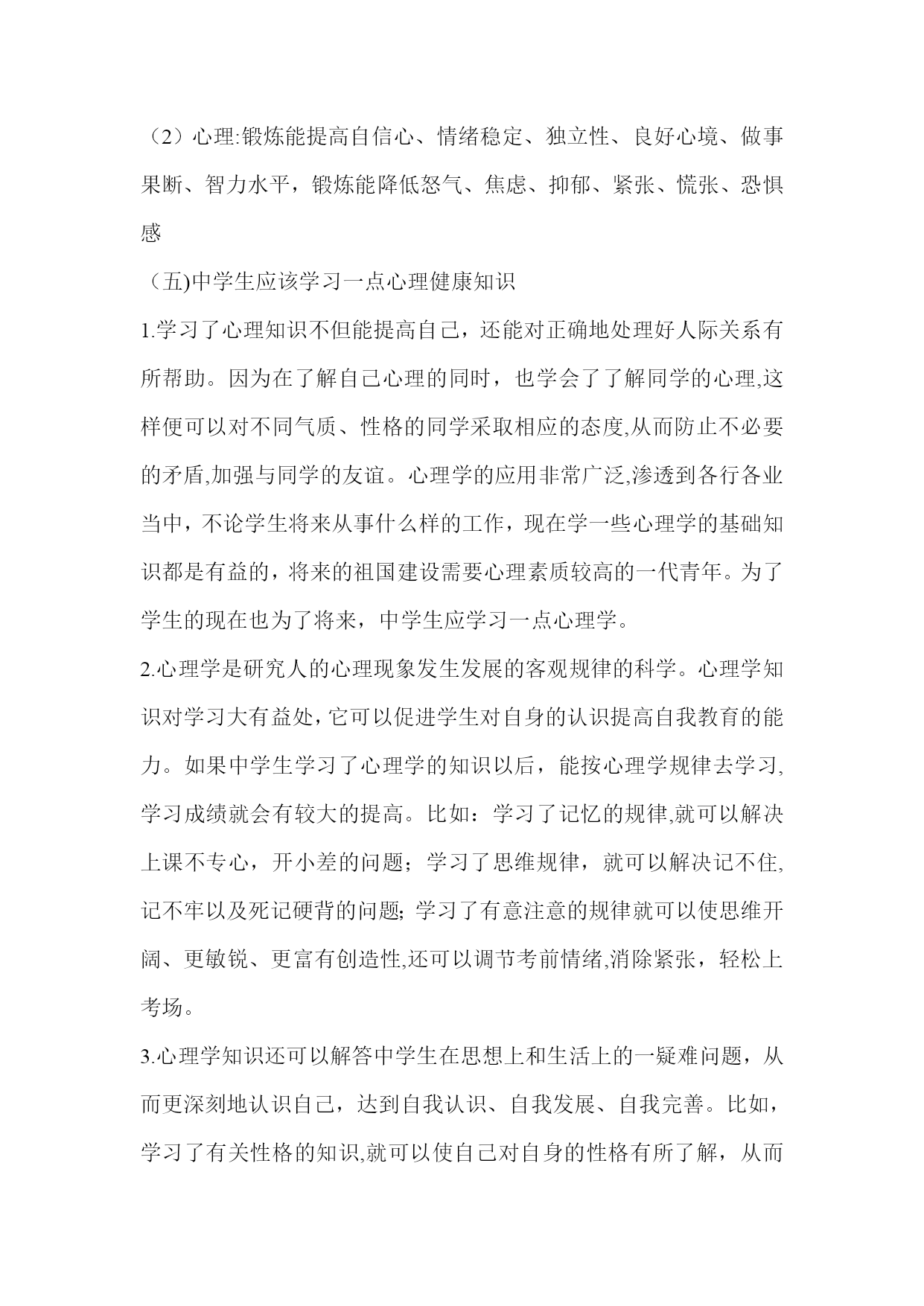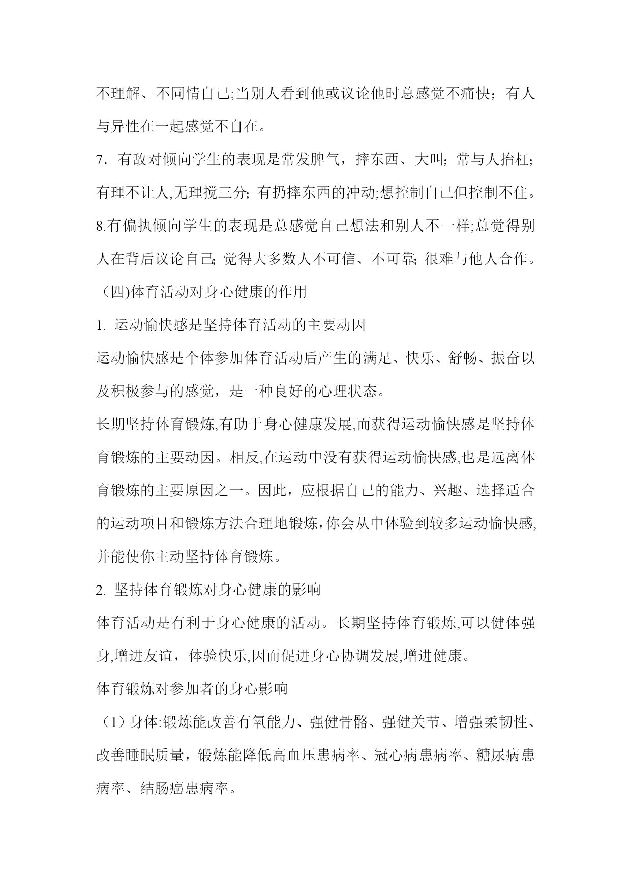 心理健康和身体健康的关系教学目标:1.了解体育运动对心理健康的作用,认识身心发展的关系,树立正确的健康观。2.了解身心健康的关系。3.了解体育运动对身心健康的影响。教学难点:心理健康和身体健康的区别教学方法与手段:提问与讨论式相结合充分发挥学生的主体作用。教学过程:(一)什么是真正的健康?一提到“健康”,很多同学便会脱口而出:“身体没病就是健康呗。”其实这种理解是不全面的,真正的健康是指在身体、心理和社会适应各方面的都处于良好的状态。健康至少包括三个方面的内容:身体(生理)健康、心理健康和社会适应能力良好。(二)身心之间的关系1.身体不健康对心理有影响当我们身体健康时,就能够愉快的生活;反之,会引起心理或行为的变化。例如心脏病人常常惶惶不安;癌症病人会感到生活无乐趣,甚至产生死亡将临的恐惧。2.心理状态会影响身体健康吗?俗话说:笑一笑,十年少;愁一愁,白了头。充分说明了心理对生理的影响。当人心理状态良好时,就会食欲旺盛、精力充沛,使有机体的潜能得以充分发挥,学习效率提高。当代医学、心理学研究表明:不良的心理状态可以引发一系列劣性生理机能的改变,因而导致失眠、便秘、消化不良、心绞痛、心率失常和月经失调等症状的产生。最新研究还发现:65%病人的疾病与社会逆境引起的压抑有关,35%的病人在很大程度上是由于情绪不好引起的。总之,心理和身体的关系是紧密相连的,二者互相制约,互相影响。(三)中学生心理健康问题的具体表现1.有焦虑倾向学生的表现是总感到莫名的紧张、坐立不安、心神不定、心里烦躁、不踏实。2.有适应不良问题的学生表现为不喜欢学校的课外活动,对学校生活不适应。3.有情绪不稳定问题的学生比例仅次于学习压力感,其表现是心情时好时坏,学习劲头时高时低,对父母、老师一会儿亲近、一会儿疏远。4.有心理不平衡的学生的表现是看别的同学考得比自己好、比自己有钱或穿名牌服装时就觉得不舒服。另外总感觉老师和家长对自己不公平。5.有强迫症状的学生总在想一些没必要的事情,如老想考不好怎么办,总是反复检查作业做得对不对;女生总担心自己衣服是否整齐,总要照镜子。6.人际关系敏感方面有问题的学生总感觉别人对自己不友好,其他人不理解、不同情自己;当别人看到他或议论他时总感觉不痛快;有人与异性在一起感觉不自在。7.有敌对倾向学生的表现是常发脾气,摔东西、大叫;常与人抬杠;有理不让人,无理搅三分;有扔摔东西的冲动;想控制自己但控制不住。8.有偏执倾向学生的表现是总感觉自己想法和别人不一样;总觉得别人在背后议论自己;觉得大多数人不可信、不可靠;很难与他人合作。(四)体育活动对身心健康的作用1.运动愉快感是坚持体育活动的主要动因运动愉快感是个体参加体育活动后产生的满足、快乐、舒畅、振奋以及积极参与的感觉,是一种良好的心理状态。长期坚持体育锻炼,有助于身心健康发展,而获得运动愉快感是坚持体育锻炼的主要动因。相反,在运动中没有获得运动愉快感,也是远离体育锻炼的主要原因之一。因此,应根据自己的能力、兴趣、选择适合的运动项目和锻炼方法合理地锻炼,你会从中体验到较多运动愉快感,并能使你主动坚持体育锻炼。2.坚持体育锻炼对身心健康的影响体育活动是有利于身心健康的活动。长期坚持体育锻炼,可以健体强身,增进友谊,体验快乐,因而促进身心协调发展,增进健康。体育锻炼对参加者的身心影响(1)身体:锻炼能改善有氧能力、强健骨骼、强健关节、增强柔韧性、改善睡眠质量,锻炼能降低高血压患病率、冠心病患病率、糖尿病患病率、结肠癌患病率。(2)心理:锻炼能提高自信心、情绪稳定、独立性、良好心境、做事果断、智力水平,锻炼能降低怒气、焦虑、抑郁、紧张、慌张、恐惧感(五)中学生应该学习一点心理健康知识1.学习了心理知识不但能提高自己,还能对正确地处理好人际关系有所帮助。因为在了解自己心理的同时,也学会了了解同学的心理,这样便可以对不同气质、性格的同学采取相应的态度,从而防止不必要的矛盾,加强与同学的友谊。心理学的应用非常广泛,渗透到各行各业当中,不论学生将来从事什么样的工作,现在学一些心理学的基础知识都是有益的,将来的祖国建设需要心理素质较高的一代青年。为了学生的现在也为了将来,中学生应学习一点心理学。2.心理学是研究人的心理现象发生发展的客观规律的科学。心理学知识对学习大有益处,它可以促进学生对自身的认识提高自我教育的能力。如果中学生学习了心理学的知识以后,能按心理学规律去学习,学习成绩就会有较大的提高。比如:学习了记忆的规律,就可以解决上课不专心,开小差的问题;学习了思维规律,就可以解决记不住,记不牢以及死记硬背的问题;学习了有意注意的规律就可以使思维开阔、更敏锐、更富有创造性,还可以调节考前情绪,消除紧张,轻松上考场。3.心理
