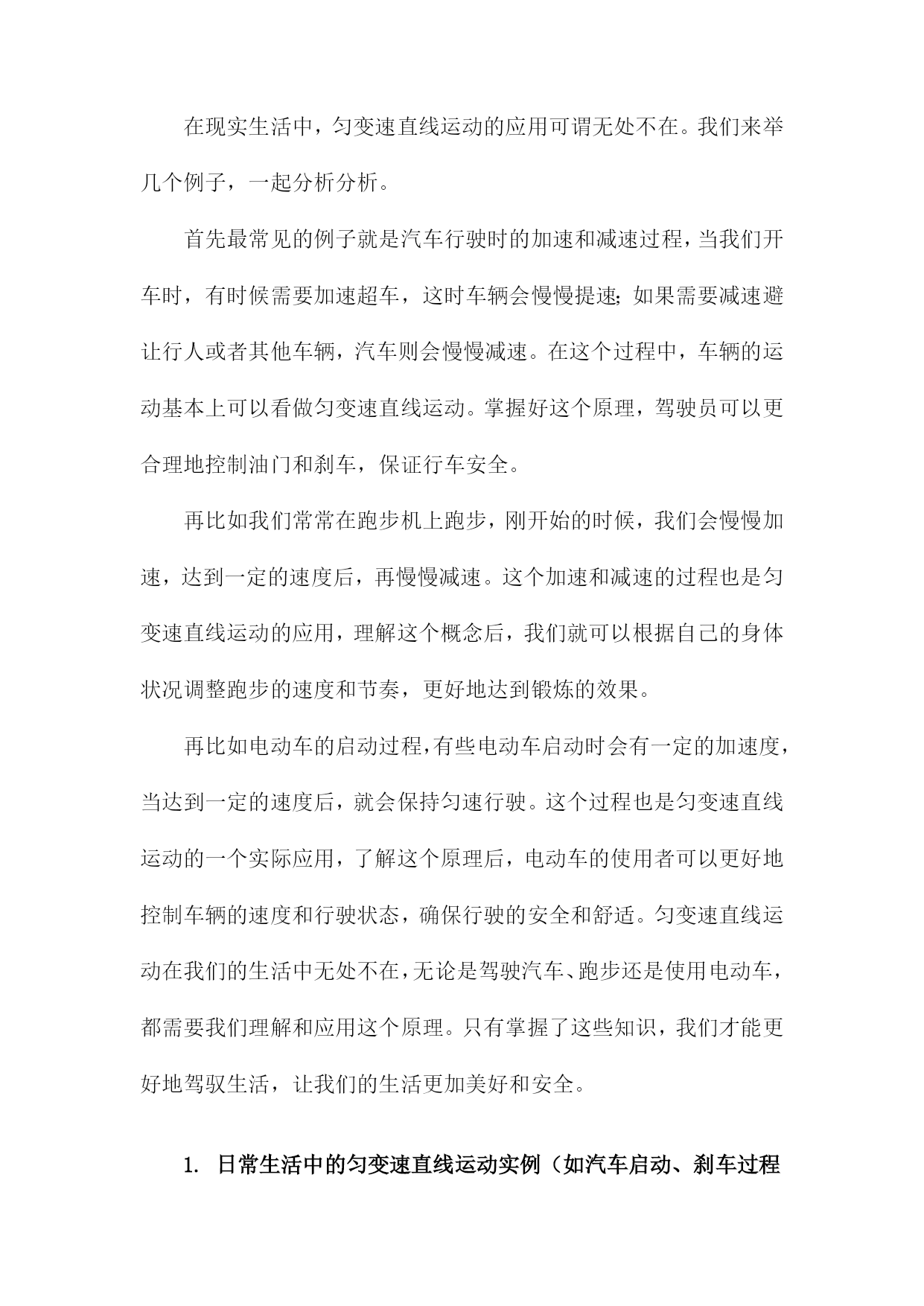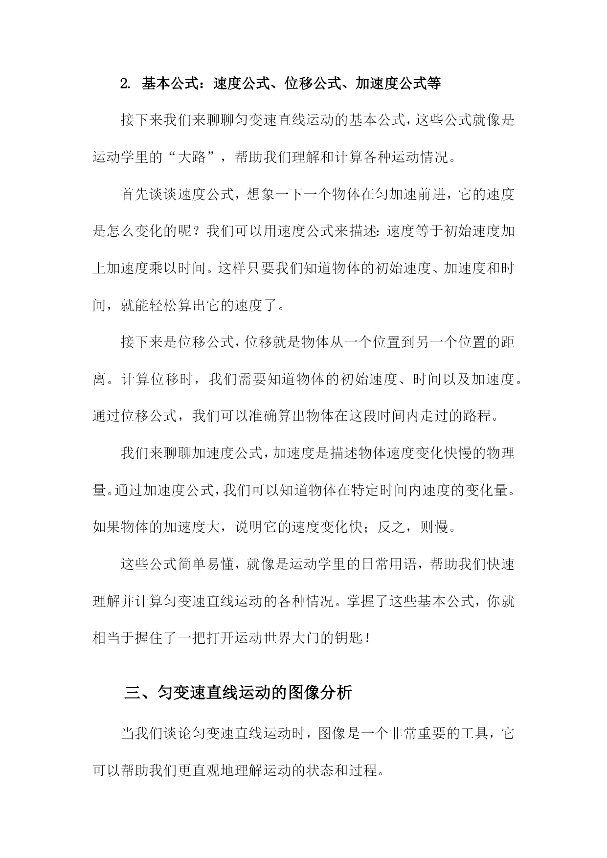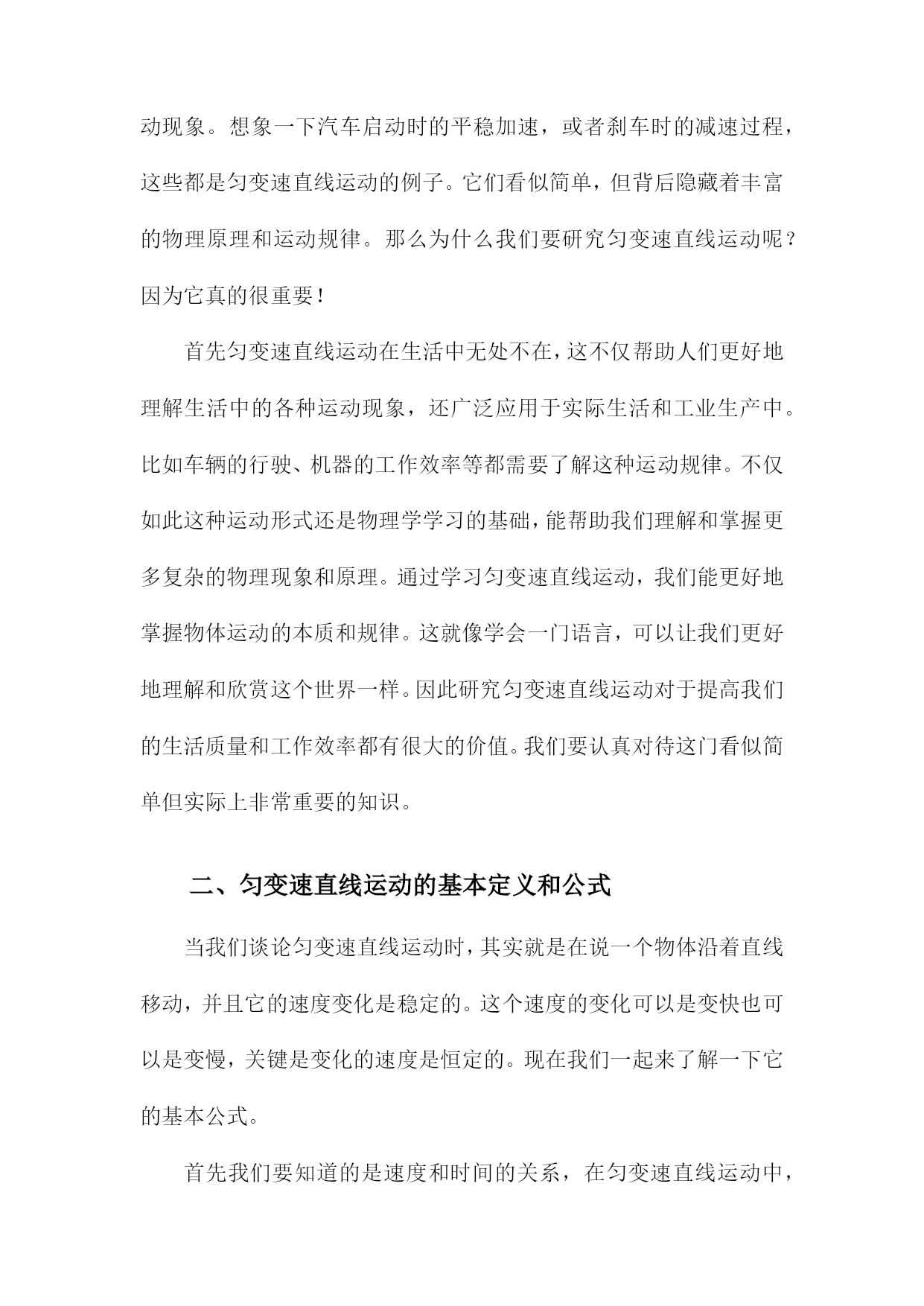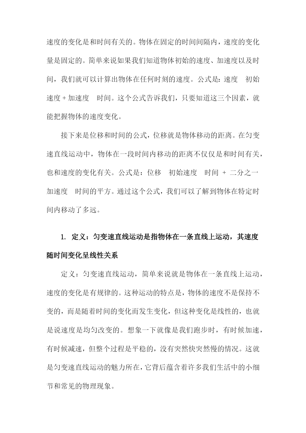 匀变速直线运动总结一、综述了解了这一点,你可能会问,为什么匀变速直线运动这么重要呢?其实它不仅是我们物理学中的一个基础概念,而且在工程、机械、甚至是体育训练中都有着广泛的应用。比如汽车工程师在设计汽车的时候,就需要考虑到车辆的匀加速性能;在运动员的训练中,了解匀变速运动规律也能帮助我们更好地掌握运动技巧。所以可以说,匀变速直线运动是我们生活中的一个基础而又重要的知识点。接下来我们就来深入了解一下它的具体内容吧!1.简要介绍匀变速直线运动的概念及其在实际生活中的应用想象一下你在开车时加速超车,或者在过马路时看到汽车紧急刹车,这些都涉及到匀变速直线运动的知识。再比如汽车导航显示速度和时间,工厂流水线作业中的匀速运行产品等场景。我们生活的很多场景中都能见到匀变速的影子,特别是在涉及物体的运动和行驶状态的描述时。这个看似抽象的概念其实是生活的一部分,和我们息息相关。让我们一起探索它背后的秘密吧!2.阐述匀变速直线运动的重要性和研究价值当我们谈论匀变速直线运动时,其实就是在讨论生活中常见的运动现象。想象一下汽车启动时的平稳加速,或者刹车时的减速过程,这些都是匀变速直线运动的例子。它们看似简单,但背后隐藏着丰富的物理原理和运动规律。那么为什么我们要研究匀变速直线运动呢?因为它真的很重要!首先匀变速直线运动在生活中无处不在,这不仅帮助人们更好地理解生活中的各种运动现象,还广泛应用于实际生活和工业生产中。比如车辆的行驶、机器的工作效率等都需要了解这种运动规律。不仅如此这种运动形式还是物理学学习的基础,能帮助我们理解和掌握更多复杂的物理现象和原理。通过学习匀变速直线运动,我们能更好地掌握物体运动的本质和规律。这就像学会一门语言,可以让我们更好地理解和欣赏这个世界一样。因此研究匀变速直线运动对于提高我们的生活质量和工作效率都有很大的价值。我们要认真对待这门看似简单但实际上非常重要的知识。二、匀变速直线运动的基本定义和公式当我们谈论匀变速直线运动时,其实就是在说一个物体沿着直线移动,并且它的速度变化是稳定的。这个速度的变化可以是变快也可以是变慢,关键是变化的速度是恒定的。现在我们一起来了解一下它的基本公式。首先我们要知道的是速度和时间的关系,在匀变速直线运动中,速度的变化是和时间有关的。物体在固定的时间间隔内,速度的变化量是固定的。简单来说如果我们知道物体初始的速度、加速度以及时间,我们就可以计算出物体在任何时刻的速度。公式是:速度初始速度+加速度时间。这个公式告诉我们,只要知道这三个因素,就能把握物体的速度变化。接下来是位移和时间的公式,位移就是物体移动的距离。在匀变速直线运动中,物体在一段时间内移动的距离不仅仅是和时间有关,也和速度的变化有关。公式是:位移初始速度时间+二分之一加速度时间的平方。通过这个公式,我们可以了解到物体在特定时间内移动了多远。1.定义:匀变速直线运动是指物体在一条直线上运动,其速度随时间变化呈线性关系定义:匀变速直线运动,简单来说就是物体在一条直线上运动,速度的变化是有规律的。这种运动的特点是,物体的速度不是保持不变的,而是随着时间的变化而发生变化,但这种变化是线性的,也就是说速度是均匀改变的。想象一下就像是我们跑步时,有时候加速,有时候减速,但整个过程是平稳的,没有突然快突然慢的情况。这就是匀变速直线运动的魅力所在,它背后蕴含着许多我们生活中的小细节和常见的物理现象。2.基本公式:速度公式、位移公式、加速度公式等接下来我们来聊聊匀变速直线运动的基本公式,这些公式就像是运动学里的“大路”,帮助我们理解和计算各种运动情况。首先谈谈速度公式,想象一下一个物体在匀加速前进,它的速度是怎么变化的呢?我们可以用速度公式来描述:速度等于初始速度加上加速度乘以时间。这样只要我们知道物体的初始速度、加速度和时间,就能轻松算出它的速度了。接下来是位移公式,位移就是物体从一个位置到另一个位置的距离。计算位移时,我们需要知道物体的初始速度、时间以及加速度。通过位移公式,我们可以准确算出物体在这段时间内走过的路程。我们来聊聊加速度公式,加速度是描述物体速度变化快慢的物理量。通过加速度公式,我们可以知道物体在特定时间内速度的变化量。如果物体的加速度大,说明它的速度变化快;反之,则慢。这些公式简单易懂,就像是运动学里的日常用语,帮助我们快速理解并计算匀变速直线运动的各种情况。掌握了这些基本公式,你就相当于握住了一把打开运动世界大门的钥匙!三、匀变速直线运动的图像分析当我们谈论匀变速直线运动时,图像是一个非常重要的工具,它可以帮助我们更直观地理解运动的状态和过程。想象一下如果我们把时间作为x轴,把物体的位移作为y轴,那么物体的运动轨迹就会形成一个美丽的抛物线。但匀变速直线运动的图像并不是那么复杂,它的图像是