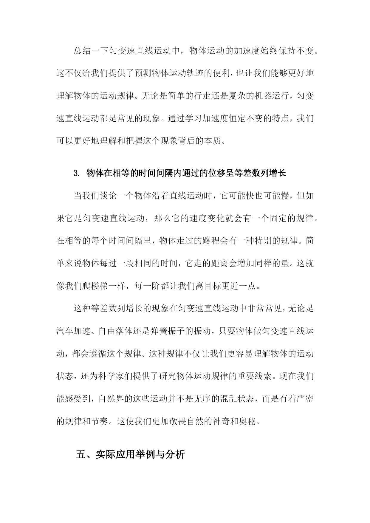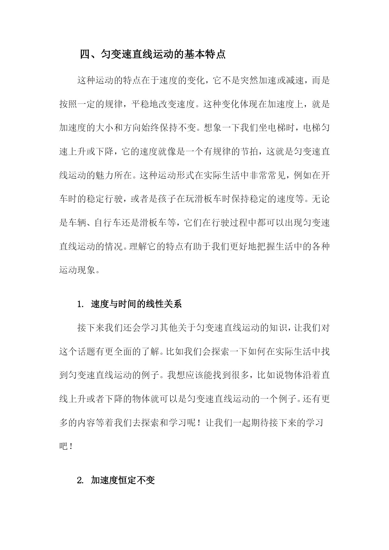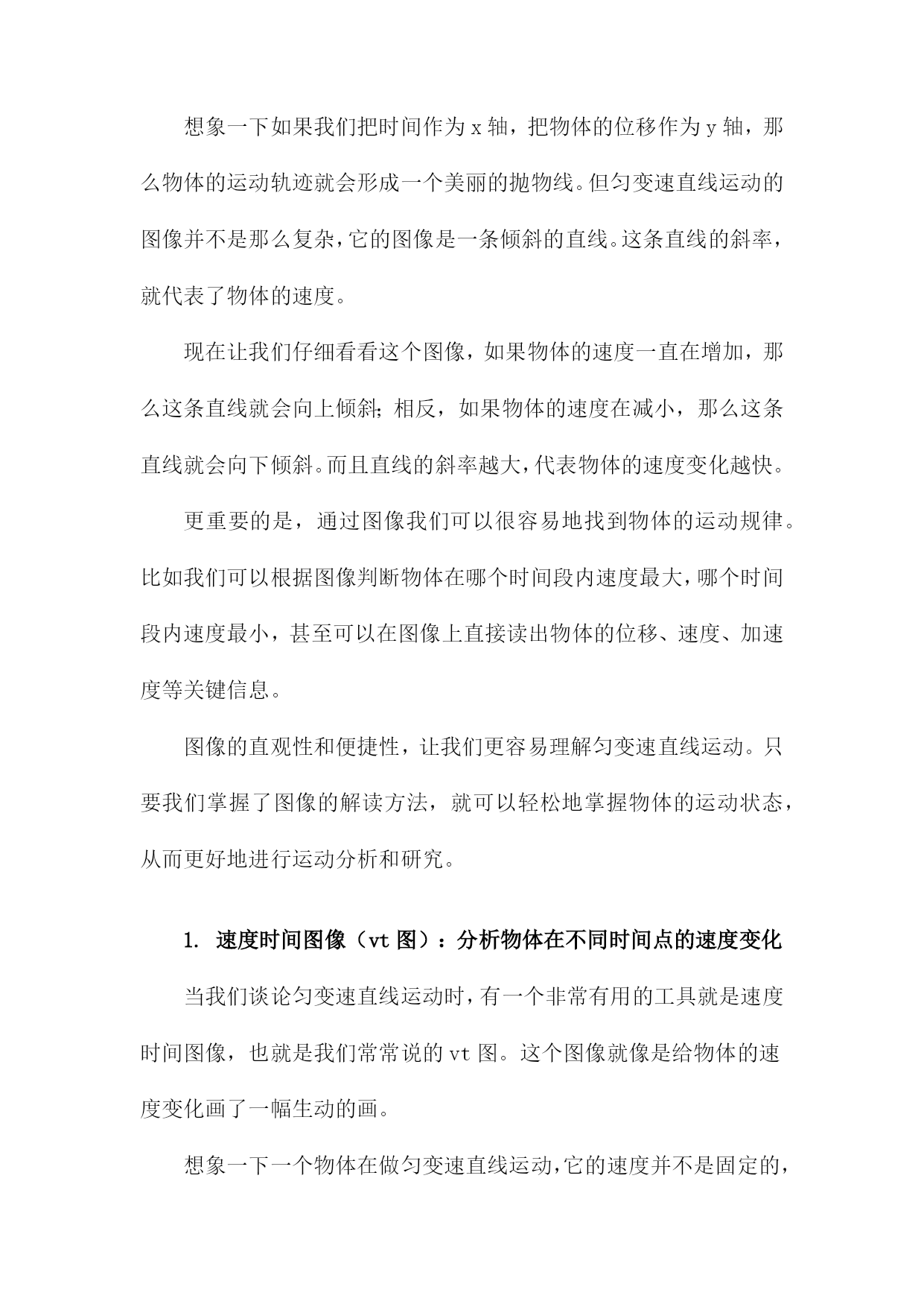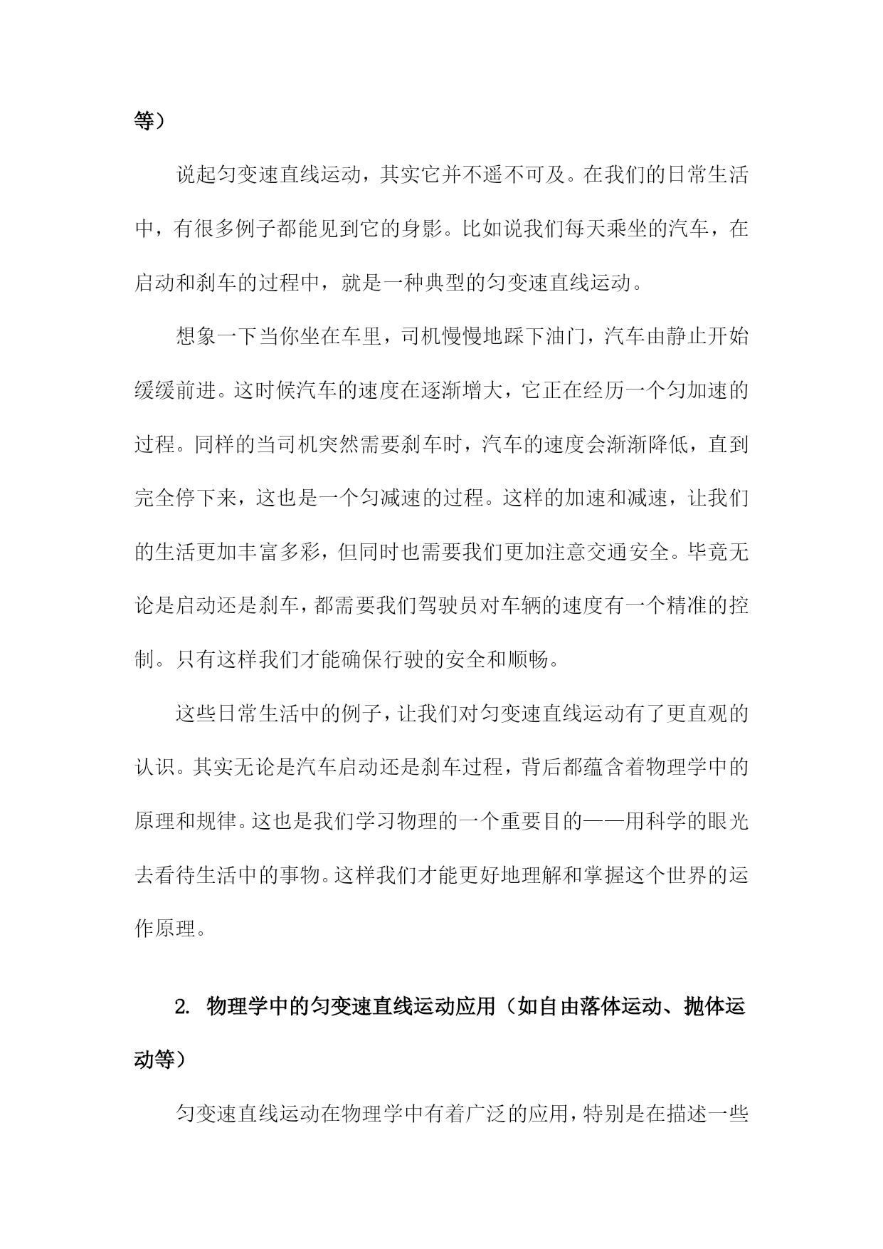 匀变速直线运动总结一、综述了解了这一点,你可能会问,为什么匀变速直线运动这么重要呢?其实它不仅是我们物理学中的一个基础概念,而且在工程、机械、甚至是体育训练中都有着广泛的应用。比如汽车工程师在设计汽车的时候,就需要考虑到车辆的匀加速性能;在运动员的训练中,了解匀变速运动规律也能帮助我们更好地掌握运动技巧。所以可以说,匀变速直线运动是我们生活中的一个基础而又重要的知识点。接下来我们就来深入了解一下它的具体内容吧!1.简要介绍匀变速直线运动的概念及其在实际生活中的应用想象一下你在开车时加速超车,或者在过马路时看到汽车紧急刹车,这些都涉及到匀变速直线运动的知识。再比如汽车导航显示速度和时间,工厂流水线作业中的匀速运行产品等场景。我们生活的很多场景中都能见到匀变速的影子,特别是在涉及物体的运动和行驶状态的描述时。这个看似抽象的概念其实是生活的一部分,和我们息息相关。让我们一起探索它背后的秘密吧!2.阐述匀变速直线运动的重要性和研究价值当我们谈论匀变速直线运动时,其实就是在讨论生活中常见的运动现象。想象一下汽车启动时的平稳加速,或者刹车时的减速过程,这些都是匀变速直线运动的例子。它们看似简单,但背后隐藏着丰富的物理原理和运动规律。那么为什么我们要研究匀变速直线运动呢?因为它真的很重要!首先匀变速直线运动在生活中无处不在,这不仅帮助人们更好地理解生活中的各种运动现象,还广泛应用于实际生活和工业生产中。比如车辆的行驶、机器的工作效率等都需要了解这种运动规律。不仅如此这种运动形式还是物理学学习的基础,能帮助我们理解和掌握更多复杂的物理现象和原理。通过学习匀变速直线运动,我们能更好地掌握物体运动的本质和规律。这就像学会一门语言,可以让我们更好地理解和欣赏这个世界一样。因此研究匀变速直线运动对于提高我们的生活质量和工作效率都有很大的价值。我们要认真对待这门看似简单但实际上非常重要的知识。二、匀变速直线运动的基本定义和公式当我们谈论匀变速直线运动时,其实就是在说一个物体沿着直线移动,并且它的速度变化是稳定的。这个速度的变化可以是变快也可以是变慢,关键是变化的速度是恒定的。现在我们一起来了解一下它的基本公式。首先我们要知道的是速度和时间的关系,在匀变速直线运动中,速度的变化是和时间有关的。物体在固定的时间间隔内,速度的变化量是固定的。简单来说如果我们知道物体初始的速度、加速度以及时间,我们就可以计算出物体在任何时刻的速度。公式是:速度初始速度+加速度时间。这个公式告诉我们,只要知道这三个因素,就能把握物体的速度变化。接下来是位移和时间的公式,位移就是物体移动的距离。在匀变速直线运动中,物体在一段时间内移动的距离不仅仅是和时间有关,也和速度的变化有关。公式是:位移初始速度时间+二分之一加速度时间的平方。通过这个公式,我们可以了解到物体在特定时间内移动了多远。1.定义:匀变速直线运动是指物体在一条直线上运动,其速度随时间变化呈线性关系定义:匀变速直线运动,简单来说就是物体在一条直线上运动,速度的变化是有规律的。这种运动的特点是,物体的速度不是保持不变的,而是随着时间的变化而发生变化,但这种变化是线性的,也就是说速度是均匀改变的。想象一下就像是我们跑步时,有时候加速,有时候减速,但整个过程是平稳的,没有突然快突然慢的情况。这就是匀变速直线运动的魅力所在,它背后蕴含着许多我们生活中的小细节和常见的物理现象。2.基本公式:速度公式、位移公式、加速度公式等接下来我们来聊聊匀变速直线运动的基本公式,这些公式就像是运动学里的“大路”,帮助我们理解和计算各种运动情况。首先谈谈速度公式,想象一下一个物体在匀加速前进,它的速度是怎么变化的呢?我们可以用速度公式来描述:速度等于初始速度加上加速度乘以时间。这样只要我们知道物体的初始速度、加速度和时间,就能轻松算出它的速度了。接下来是位移公式,位移就是物体从一个位置到另一个位置的距离。计算位移时,我们需要知道物体的初始速度、时间以及加速度。通过位移公式,我们可以准确算出物体在这段时间内走过的路程。我们来聊聊加速度公式,加速度是描述物体速度变化快慢的物理量。通过加速度公式,我们可以知道物体在特定时间内速度的变化量。如果物体的加速度大,说明它的速度变化快;反之,则慢。这些公式简单易懂,就像是运动学里的日常用语,帮助我们快速理解并计算匀变速直线运动的各种情况。掌握了这些基本公式,你就相当于握住了一把打开运动世界大门的钥匙!三、匀变速直线运动的图像分析当我们谈论匀变速直线运动时,图像是一个非常重要的工具,它可以帮助我们更直观地理解运动的状态和过程。想象一下如果我们把时间作为x轴,把物体的位移作为y轴,那么物体的运动轨迹就会形成一个美丽的抛物线。但匀变速直线运动的图像并不是那么复杂,它的图像是