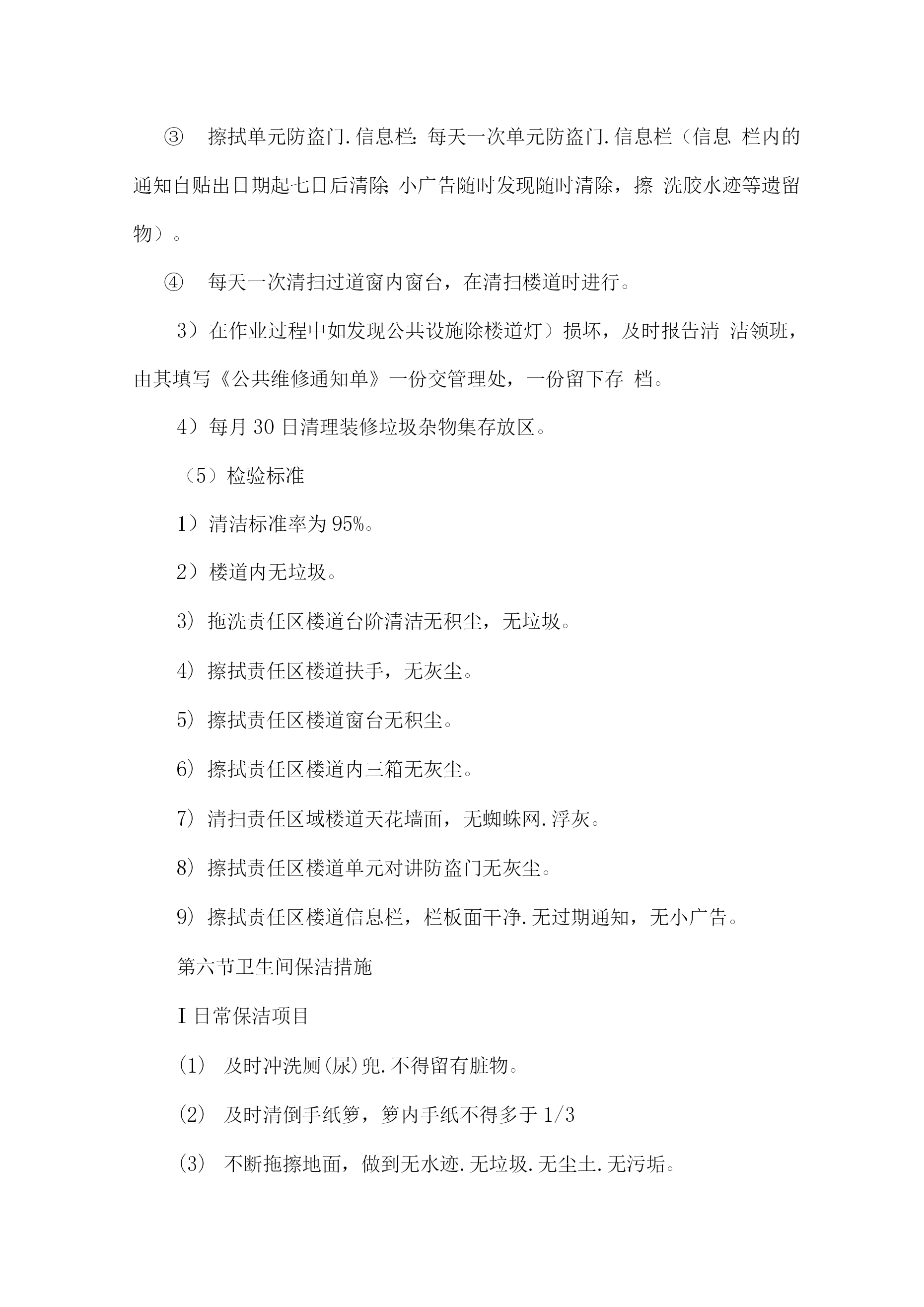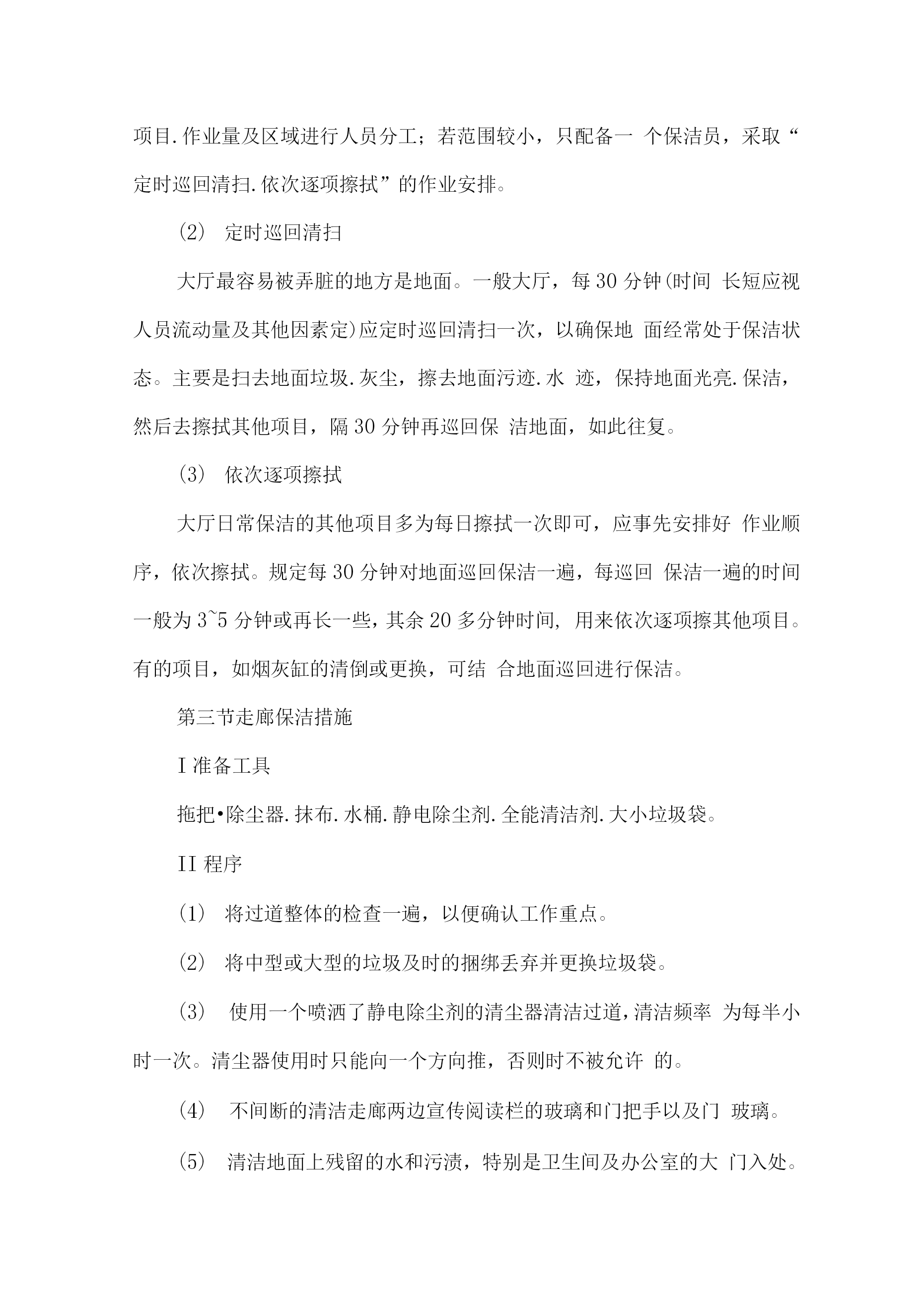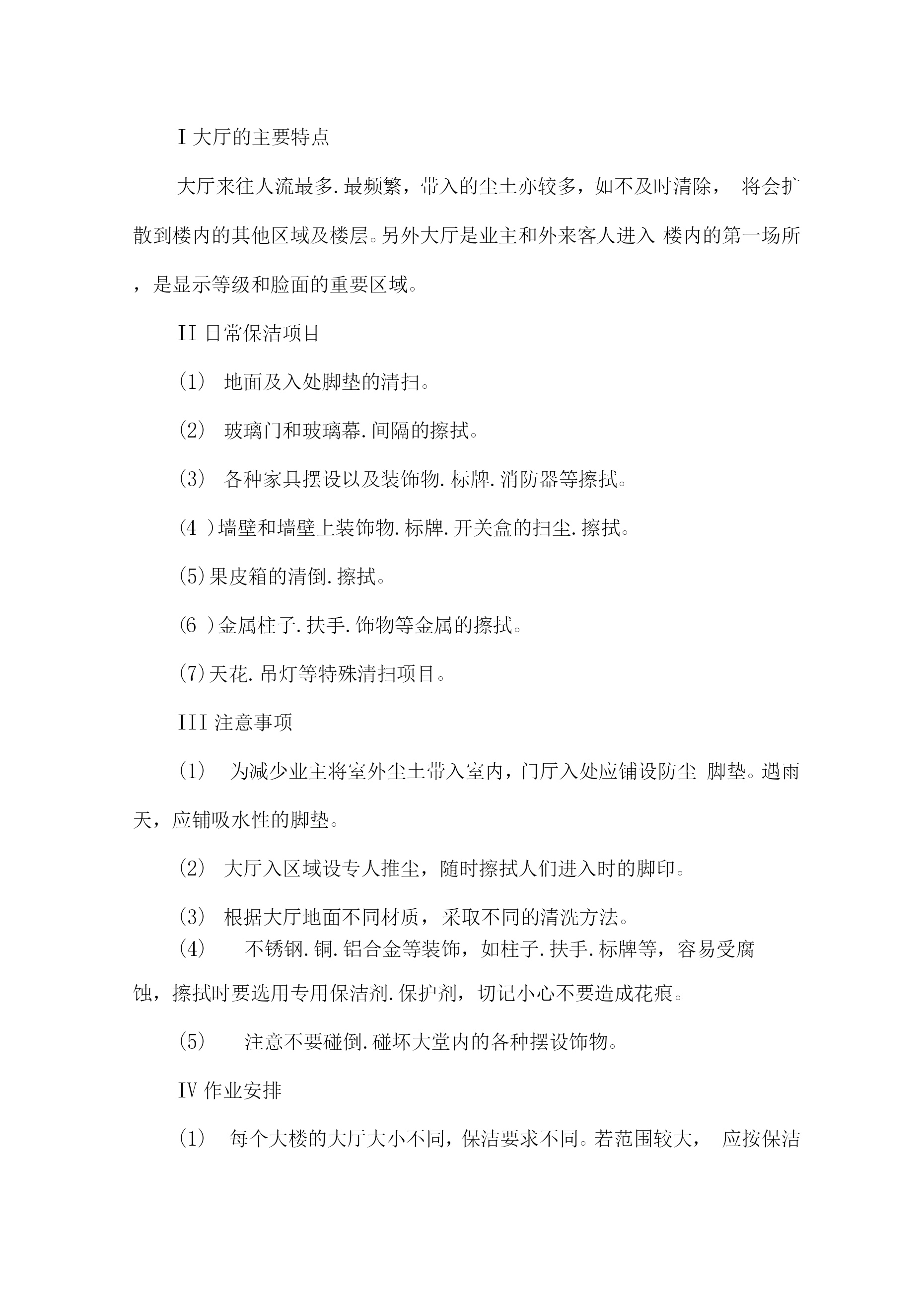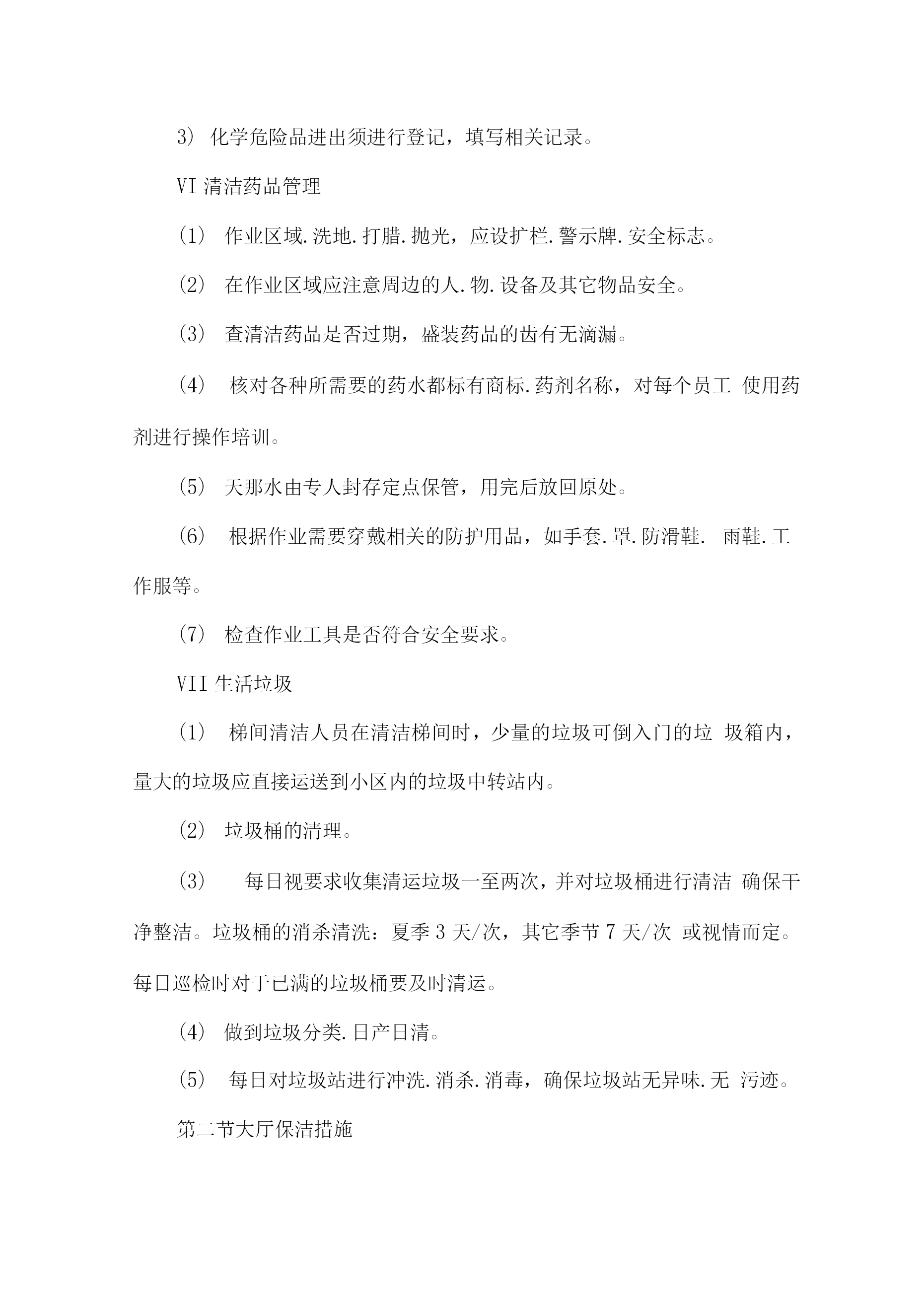 物业服务区域保洁方案第一节保洁服务的主要措施I清洁基本处理技术打扫用合适良好的扫帚清扫灰尘.垃圾,并用垃圾铲清走,将之倒入最近的垃圾箱里。拖地把拖把放入混有干净水及适量清洁剂的清洁桶内清洗.拧干,保持微湿,把尘土拖干净,每拖十平方米地至少要清洗一次拖把,水脏了要及时换掉。(3)抹用一块软而干净的布配合清洁剂来回擦拭,抹布脏了百分之五十就应换一块干净的。除尘用一块软而干净的布(不要毛毡)轻轻地清除扬尘。洗地用合适带尼龙垫或刷子的擦地机,配以合适清洁剂在机器前端进行擦洗,擦洗完毕用真空吸湿机把污水吸走并用干净拖把再拖一次。冲洗先将地面垃圾扫掉,用水管直接射水把尘土清理干净,再用大扫帚把地面的积水清洁干净。消毒用强力杀菌剂来喷洒对建筑物的装置.墙等)或用毛巾配合有消毒作用的清洁剂来抹对地板)。II化粪池清理技术处理程序(1)工作程序接到工作指令单后,必须先了解所工作的位置距离,配备足够长度的吸管。到现场后,首先检查排污管道是否堵塞,如有堵塞先疏通后吸粪。在作业时,要先揭开化粪池全部盖板排除沼气,后把结块的粪渣捣烂,再进行吸运(水桶中按1:50配制清洁剂,喷壶中按1:10配制清洁剂)。清洗程序首先用涂水器或毛巾将1:50配制的清洁剂涂于玻璃表面;用涂水器或毛巾用力涂擦,洗去浮尘和污渍;用玻璃刮刀刮净水渍;如仍有少量污渍,将1:10配制清洁剂喷于污渍上;用软质洁垫用力涂擦,或用刀片去除污渍直至干净为止;仁用水管将玻璃表面.窗框和粘接缝等灰尘和残留清洁剂冲干净;j用毛巾将窗框.粘接缝上的水渍抹清。III“四害”发生特性及防治方法(1)蚊类生活习性和环境不同而有很大变化。一般以3〜6月形成第一次高峰,9—12月出现第二次高峰。蚊类防治蚊虫在繁殖过程中,必须有水.把积水控制.管理好是灭蚊的根本。由于其生长发育与外界气温.环境有密切关系。因此必须采取综合防治措施;改造环境,平整洼地,排出积水,清出蚊孽生场所;在大中型蚊虫孽生场所定期把芽孢杆菌喷洒在孽生蚊虫的积水处,每立方米水体施花3〜5毫升;急杀成蚊:用家早消等用雾化效果好的喷害器对着蚊群或其栖息地喷雾;滞留毒杀:在白天,将残效期长的杀虫剂如40%快克,家虫清等喷洒在箱柜背面或杂物表面,让蚊子触药致死。蝇类消除和有效控制蝇类孽尘地,是防止蝇类孽生繁殖的治本措施。主要包括垃圾日产日清•不积存.不残留.不孽生蝇类,对粪池加强管理,保持粪池盖密封,绿化带不能残留食物.水果.动物尸体等。化学杀虫剂灭蛆灭蛆的药剂较多,可40%快克1溶液进行室内滞留喷洒,50%马拉硫磷250-5溶液做堆喷洒等。它们同时具有杀灭成蝇的功效。杀灭成蝇可用灭蝇蝇.粘蝇纸.灭蝇毒饵等诱杀成蝇。也可直接用蝇拍拍死成蝇。化学药物杀灭成蝇与灭蛆相同。(4)蟑螂防治改造蟑螂栖息场所,堵塞可供蟑螂躲藏的裂缝.孔洞,使之无处藏身。随时清除垃圾,断绝其食物和水源。用物理方法杀灭:如在厨房内用开水浇灌蟑螂栖息的缝隙.孔洞等。化学药物杀灭:主要用毒饵成粉剂毒杀。(5)灭鼠抗凝血剂“大隆”.“敌鼠纳盐”.“澳敌隆”等慢性药物灭鼠。其特点是害鼠中毒发映慢,食饵量大,灭鼠彻底,对人畜无害。使用浓度均为0.5%用“磷化锌”等急性或亚急性鼠花药对鼠害重发生区域控制使用。使用这类鼠药具有投药后死鼠时间快(2〜5小时),可在较短时间内有效降低鼠密度。因毒性在,使用不当会对人畜环境造成不良影响。使用时必须严格按照国家有关规定,山技术人员监控使用。IV固体废弃物处理(1)所有的固体废弃物可分为三类:可以回收利用(A类)不可回收利用(B类)和危险废弃物(C类),其中C类又分为“可回收危险废弃物类”和“不可回收危险废弃物类”。(2)固体废弃物处理程序:分类回收.集中保管.统一处理。V化学危险品管理(1)化学危险品指易燃•易爆.有毒.具有强烈腐蚀性和刺激性等物品。其储存和保管程序由专门仓库储存,仓库须保持良好通风.严禁烟火,须配备灭火器和消防砂等消防设施。盛装化学危险品的容器须牢固.密封.不易破裂,井进行标识。化学危险品进出须进行登记,填写相关记录。VI清洁药品管理作业区域.洗地.打腊.抛光,应设扩栏.警示牌.安全标志。在作业区域应注意周边的人.物.设备及其它物品安全。查清洁药品是否过期,盛装药品的齿有无滴漏。核对各种所需要的药水都标有商标.药剂名称,对每个员工使用药剂进行操作培训。天那水由专人封存定点保管,用完后放回原处。根据作业需要穿戴相关的防护用品,如手套.罩.防滑鞋.雨鞋.工作服等。检查作业工具是否符合安全要求。VII生活垃圾梯间清洁人员在清洁梯间时,少量的垃圾可倒入门的垃圾箱内,量大的垃圾应直接运送到小区内的垃圾中转站