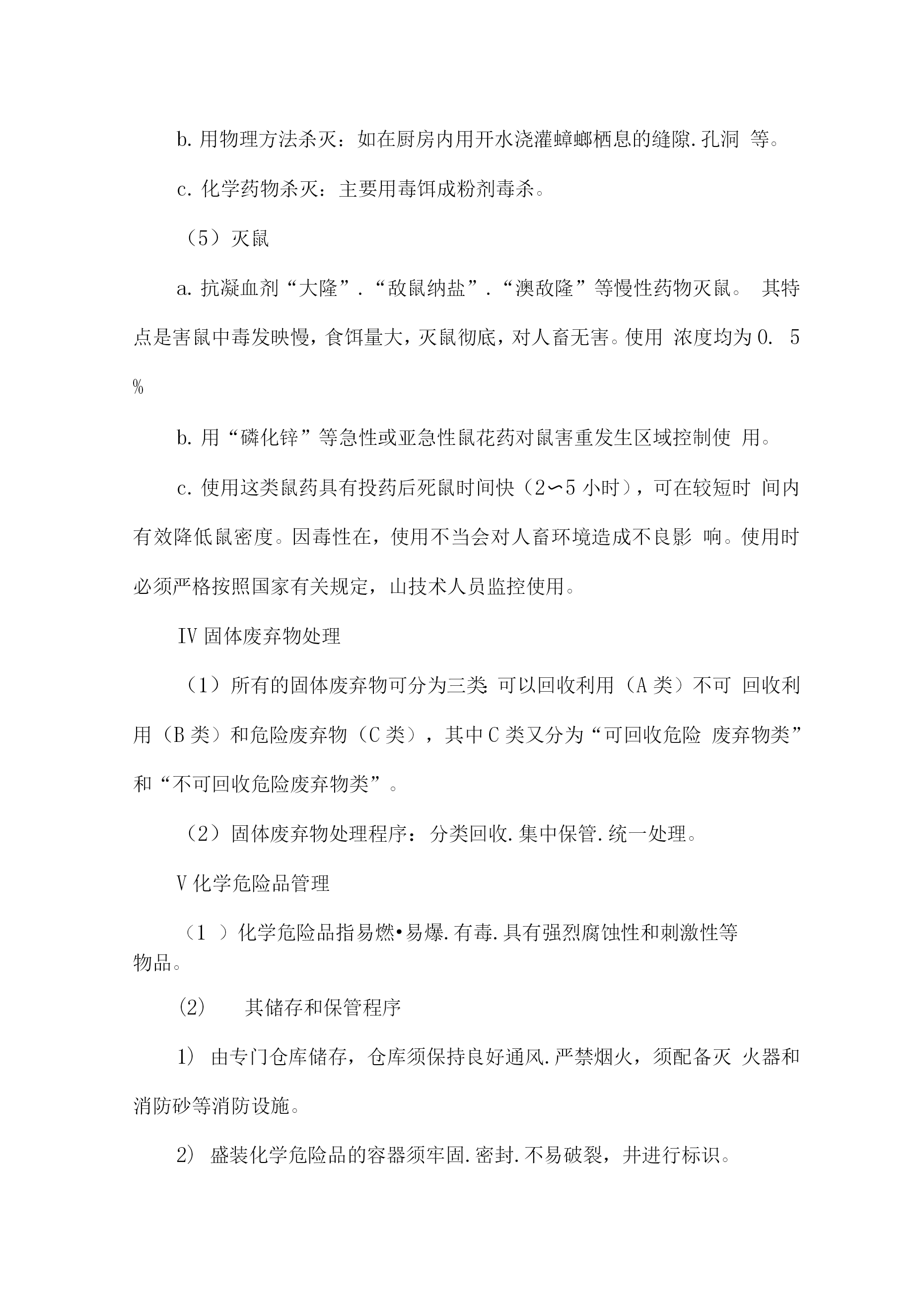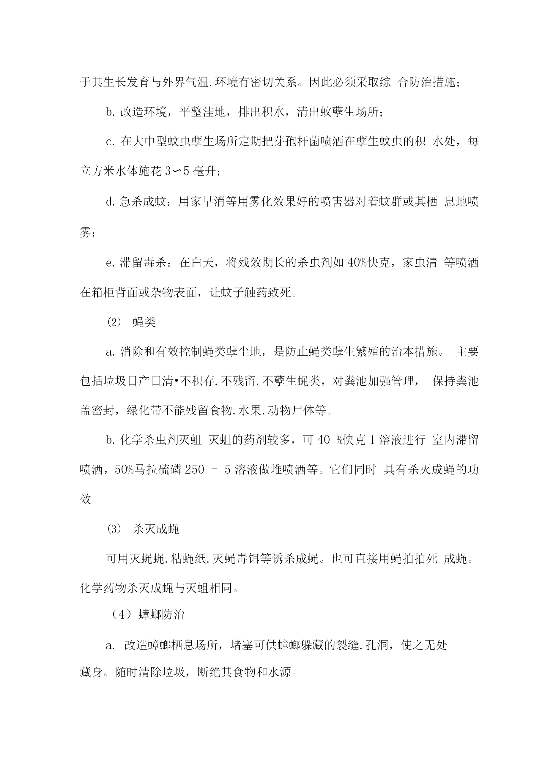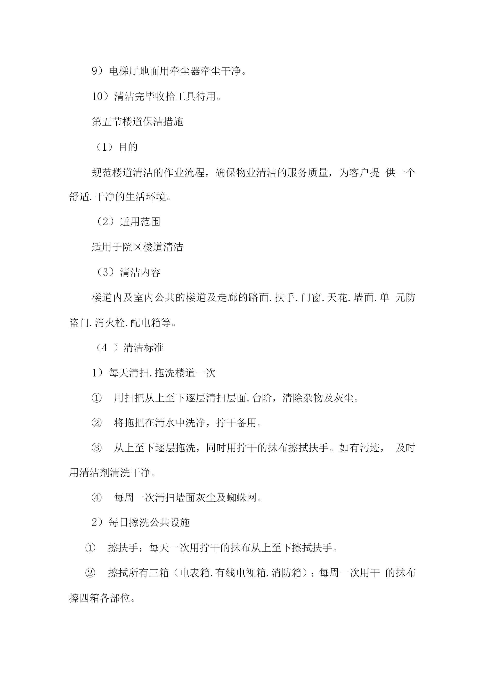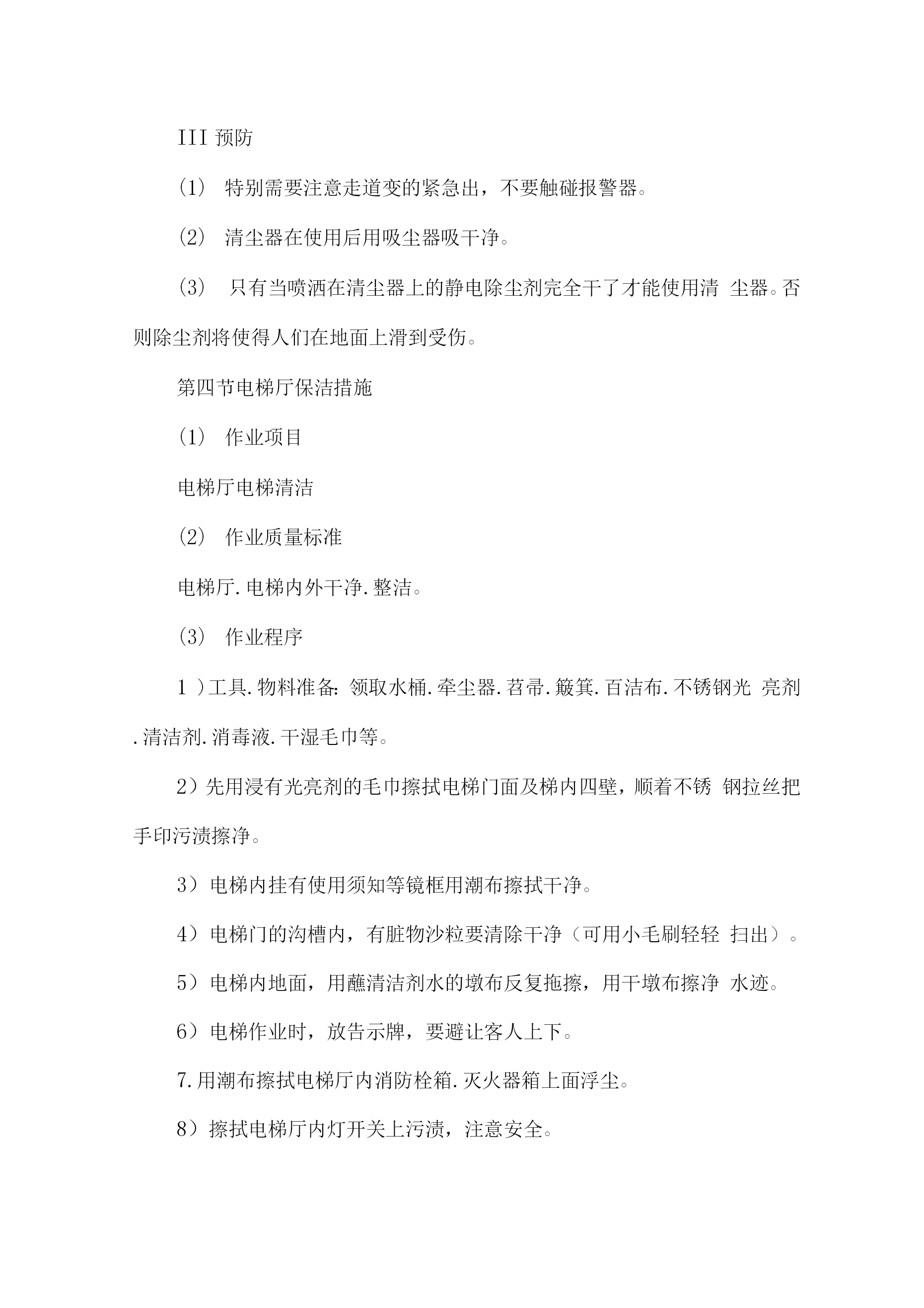 物业服务区域保洁方案第一节保洁服务的主要措施I清洁基本处理技术打扫用合适良好的扫帚清扫灰尘.垃圾,并用垃圾铲清走,将之倒入最近的垃圾箱里。拖地把拖把放入混有干净水及适量清洁剂的清洁桶内清洗.拧干,保持微湿,把尘土拖干净,每拖十平方米地至少要清洗一次拖把,水脏了要及时换掉。(3)抹用一块软而干净的布配合清洁剂来回擦拭,抹布脏了百分之五十就应换一块干净的。除尘用一块软而干净的布(不要毛毡)轻轻地清除扬尘。洗地用合适带尼龙垫或刷子的擦地机,配以合适清洁剂在机器前端进行擦洗,擦洗完毕用真空吸湿机把污水吸走并用干净拖把再拖一次。冲洗先将地面垃圾扫掉,用水管直接射水把尘土清理干净,再用大扫帚把地面的积水清洁干净。消毒用强力杀菌剂来喷洒对建筑物的装置.墙等)或用毛巾配合有消毒作用的清洁剂来抹对地板)。II化粪池清理技术处理程序(1)工作程序接到工作指令单后,必须先了解所工作的位置距离,配备足够长度的吸管。到现场后,首先检查排污管道是否堵塞,如有堵塞先疏通后吸粪。在作业时,要先揭开化粪池全部盖板排除沼气,后把结块的粪渣捣烂,再进行吸运(水桶中按1:50配制清洁剂,喷壶中按1:10配制清洁剂)。清洗程序首先用涂水器或毛巾将1:50配制的清洁剂涂于玻璃表面;用涂水器或毛巾用力涂擦,洗去浮尘和污渍;用玻璃刮刀刮净水渍;如仍有少量污渍,将1:10配制清洁剂喷于污渍上;用软质洁垫用力涂擦,或用刀片去除污渍直至干净为止;仁用水管将玻璃表面.窗框和粘接缝等灰尘和残留清洁剂冲干净;j用毛巾将窗框.粘接缝上的水渍抹清。III“四害”发生特性及防治方法(1)蚊类生活习性和环境不同而有很大变化。一般以3〜6月形成第一次高峰,9—12月出现第二次高峰。蚊类防治蚊虫在繁殖过程中,必须有水.把积水控制.管理好是灭蚊的根本。由于其生长发育与外界气温.环境有密切关系。因此必须采取综合防治措施;改造环境,平整洼地,排出积水,清出蚊孽生场所;在大中型蚊虫孽生场所定期把芽孢杆菌喷洒在孽生蚊虫的积水处,每立方米水体施花3〜5毫升;急杀成蚊:用家早消等用雾化效果好的喷害器对着蚊群或其栖息地喷雾;滞留毒杀:在白天,将残效期长的杀虫剂如40%快克,家虫清等喷洒在箱柜背面或杂物表面,让蚊子触药致死。蝇类消除和有效控制蝇类孽尘地,是防止蝇类孽生繁殖的治本措施。主要包括垃圾日产日清•不积存.不残留.不孽生蝇类,对粪池加强管理,保持粪池盖密封,绿化带不能残留食物.水果.动物尸体等。化学杀虫剂灭蛆灭蛆的药剂较多,可40%快克1溶液进行室内滞留喷洒,50%马拉硫磷250-5溶液做堆喷洒等。它们同时具有杀灭成蝇的功效。杀灭成蝇可用灭蝇蝇.粘蝇纸.灭蝇毒饵等诱杀成蝇。也可直接用蝇拍拍死成蝇。化学药物杀灭成蝇与灭蛆相同。(4)蟑螂防治改造蟑螂栖息场所,堵塞可供蟑螂躲藏的裂缝.孔洞,使之无处藏身。随时清除垃圾,断绝其食物和水源。用物理方法杀灭:如在厨房内用开水浇灌蟑螂栖息的缝隙.孔洞等。化学药物杀灭:主要用毒饵成粉剂毒杀。(5)灭鼠抗凝血剂“大隆”.“敌鼠纳盐”.“澳敌隆”等慢性药物灭鼠。其特点是害鼠中毒发映慢,食饵量大,灭鼠彻底,对人畜无害。使用浓度均为0.5%用“磷化锌”等急性或亚急性鼠花药对鼠害重发生区域控制使用。使用这类鼠药具有投药后死鼠时间快(2〜5小时),可在较短时间内有效降低鼠密度。因毒性在,使用不当会对人畜环境造成不良影响。使用时必须严格按照国家有关规定,山技术人员监控使用。IV固体废弃物处理(1)所有的固体废弃物可分为三类:可以回收利用(A类)不可回收利用(B类)和危险废弃物(C类),其中C类又分为“可回收危险废弃物类”和“不可回收危险废弃物类”。(2)固体废弃物处理程序:分类回收.集中保管.统一处理。V化学危险品管理(1)化学危险品指易燃•易爆.有毒.具有强烈腐蚀性和刺激性等物品。其储存和保管程序由专门仓库储存,仓库须保持良好通风.严禁烟火,须配备灭火器和消防砂等消防设施。盛装化学危险品的容器须牢固.密封.不易破裂,井进行标识。化学危险品进出须进行登记,填写相关记录。VI清洁药品管理作业区域.洗地.打腊.抛光,应设扩栏.警示牌.安全标志。在作业区域应注意周边的人.物.设备及其它物品安全。查清洁药品是否过期,盛装药品的齿有无滴漏。核对各种所需要的药水都标有商标.药剂名称,对每个员工使用药剂进行操作培训。天那水由专人封存定点保管,用完后放回原处。根据作业需要穿戴相关的防护用品,如手套.罩.防滑鞋.雨鞋.工作服等。检查作业工具是否符合安全要求。VII生活垃圾梯间清洁人员在清洁梯间时,少量的垃圾可倒入门的垃圾箱内,量大的垃圾应直接运送到小区内的垃圾中转站