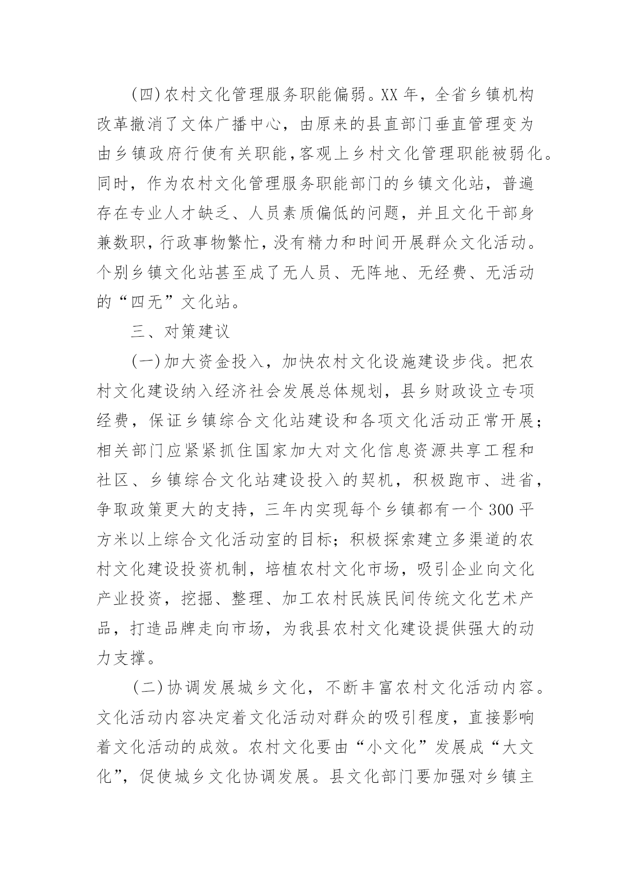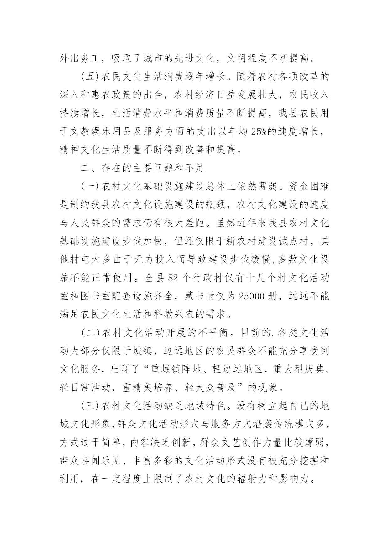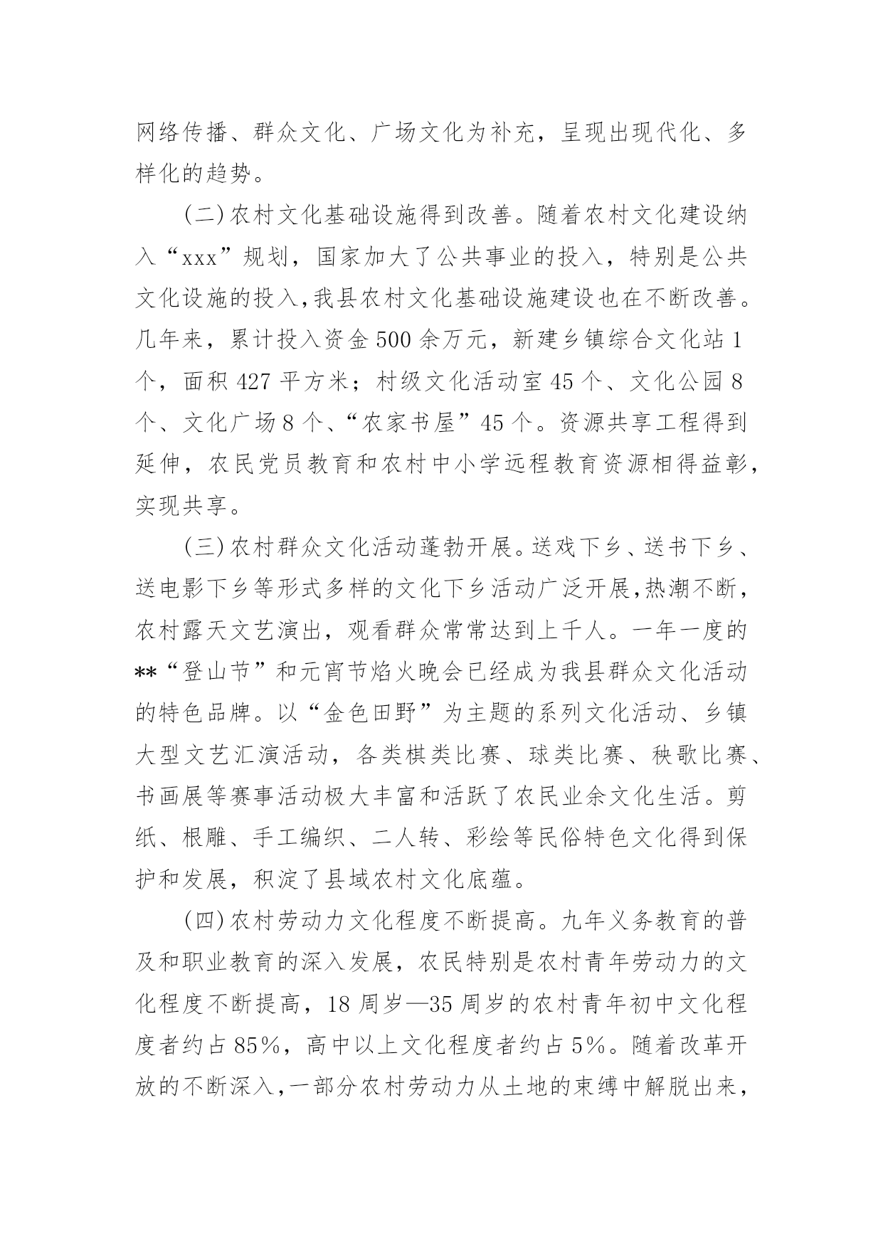 农村调研报告在人们素养不断提高的今天,报告的使用成为日常生活的常态,写报告的时候要注意内容的完整。你所见过的报告是什么样的呢?下面是小编帮大家整理的农村调研报告,欢迎大家分享。农村调研报告1农业要发展,农民要致富,农村要进步,加强农村文化建设是基本工程。用先进文化占领农村文化阵地,为群众提供健康而又丰富多采的精神食粮,既是深入落实科学发展观,构建农村和谐社会,促进农村物质文明、政治文明、精神文明建设的内在要求,也是建设社会主义新农村的重要手段和有效措施,更是实现国家长治久安和全面建设小康社会的需要。在推进新农村建设进程中,如何把农村文化建设纳入全县文化立县建设的整体规划,与农村民主政治建设、发展村级经济、整治村容村貌等同步建设,整体推进,这是我们当前必须着重解决的一个重要课题。一、我县农村文化事业发展基本情况(一)农民文化生活日益丰富。近年来,随着国家粮食保护价的上调,惠农政策的出台,新农村建设步伐的加快,我县农村经济社会实现了较快发展,农民的生活水平显著提高,文化生活也得到了一定改善,物质文化生活日益丰富。目前,我县农村文化活动形式主要以广播电视为主,以报刊杂志、网络传播、群众文化、广场文化为补充,呈现出现代化、多样化的趋势。(二)农村文化基础设施得到改善。随着农村文化建设纳入“xxx”规划,国家加大了公共事业的投入,特别是公共文化设施的投入,我县农村文化基础设施建设也在不断改善。几年来,累计投入资金500余万元,新建乡镇综合文化站1个,面积427平方米;村级文化活动室45个、文化公园8个、文化广场8个、“农家书屋”45个。资源共享工程得到延伸,农民党员教育和农村中小学远程教育资源相得益彰,实现共享。(三)农村群众文化活动蓬勃开展。送戏下乡、送书下乡、送电影下乡等形式多样的文化下乡活动广泛开展,热潮不断,农村露天文艺演出,观看群众常常达到上千人。一年一度的**“登山节”和元宵节焰火晚会已经成为我县群众文化活动的特色品牌。以“金色田野”为主题的系列文化活动、乡镇大型文艺汇演活动,各类棋类比赛、球类比赛、秧歌比赛、书画展等赛事活动极大丰富和活跃了农民业余文化生活。剪纸、根雕、手工编织、二人转、彩绘等民俗特色文化得到保护和发展,积淀了县域农村文化底蕴。(四)农村劳动力文化程度不断提高。九年义务教育的普及和职业教育的深入发展,农民特别是农村青年劳动力的文化程度不断提高,18周岁—35周岁的农村青年初中文化程度者约占85%,高中以上文化程度者约占5%。随着改革开放的不断深入,一部分农村劳动力从土地的束缚中解脱出来,外出务工,吸取了城市的先进文化,文明程度不断提高。(五)农民文化生活消费逐年增长。随着农村各项改革的深入和惠农政策的出台,农村经济日益发展壮大,农民收入持续增长,生活消费水平和消费质量不断提高,我县农民用于文教娱乐用品及服务方面的支出以年均25%的速度增长,精神文化生活质量不断得到改善和提高。二、存在的主要问题和不足(一)农村文化基础设施建设总体上依然薄弱。资金困难是制约我县农村文化设施建设的瓶颈,农村文化建设的速度与人民群众的需求仍有很大差距。虽然近年来我县农村文化基础设施建设步伐加快,但还仅限于新农村建设试点村,其他村屯大多由于无力投入而导致建设步伐缓慢,多数文化设施不能正常使用。全县82个行政村仅有十几个村文化活动室和图书室配套设施齐全,藏书量仅为25000册,远远不能满足农民文化生活和科教兴农的需求。(二)农村文化活动开展的不平衡。目前的.各类文化活动大部分仅限于城镇,边远地区的农民群众不能充分享受到文化服务,出现了“重城镇阵地、轻边远地区,重大型庆典、轻日常活动,重精美培养、轻大众普及”的现象。(三)农村文化活动缺乏地域特色。没有树立起自己的地域文化形象,群众文化活动形式与服务方式沿袭传统模式多,方式过于简单,内容缺乏创新,群众文艺创作力量比较薄弱,群众喜闻乐见、丰富多彩的文化活动形式没有被充分挖掘和利用,在一定程度上限制了农村文化的辐射力和影响力。(四)农村文化管理服务职能偏弱。XX年,全省乡镇机构改革撤消了文体广播中心,由原来的县直部门垂直管理变为由乡镇政府行使有关职能,客观上乡村文化管理职能被弱化。同时,作为农村文化管理服务职能部门的乡镇文化站,普遍存在专业人才缺乏、人员素质偏低的问题,并且文化干部身兼数职,行政事物繁忙,没有精力和时间开展群众文化活动。个别乡镇文化站甚至成了无人员、无阵地、无经费、无活动的“四无”文化站。三、对策建议(一)加大资金投入,加快农村文化设施建设步伐。把农村文化建设纳入经济社会发展总体规划,县乡财政设立专项经费,保证乡镇综合文化站建设和各项文化活动正常开展;相关部门应紧紧抓住国家加大对文化信息资源共享工程和社区、乡镇综合文化站建设投入的契机,积极跑市、进省,争取政策更大的支持,