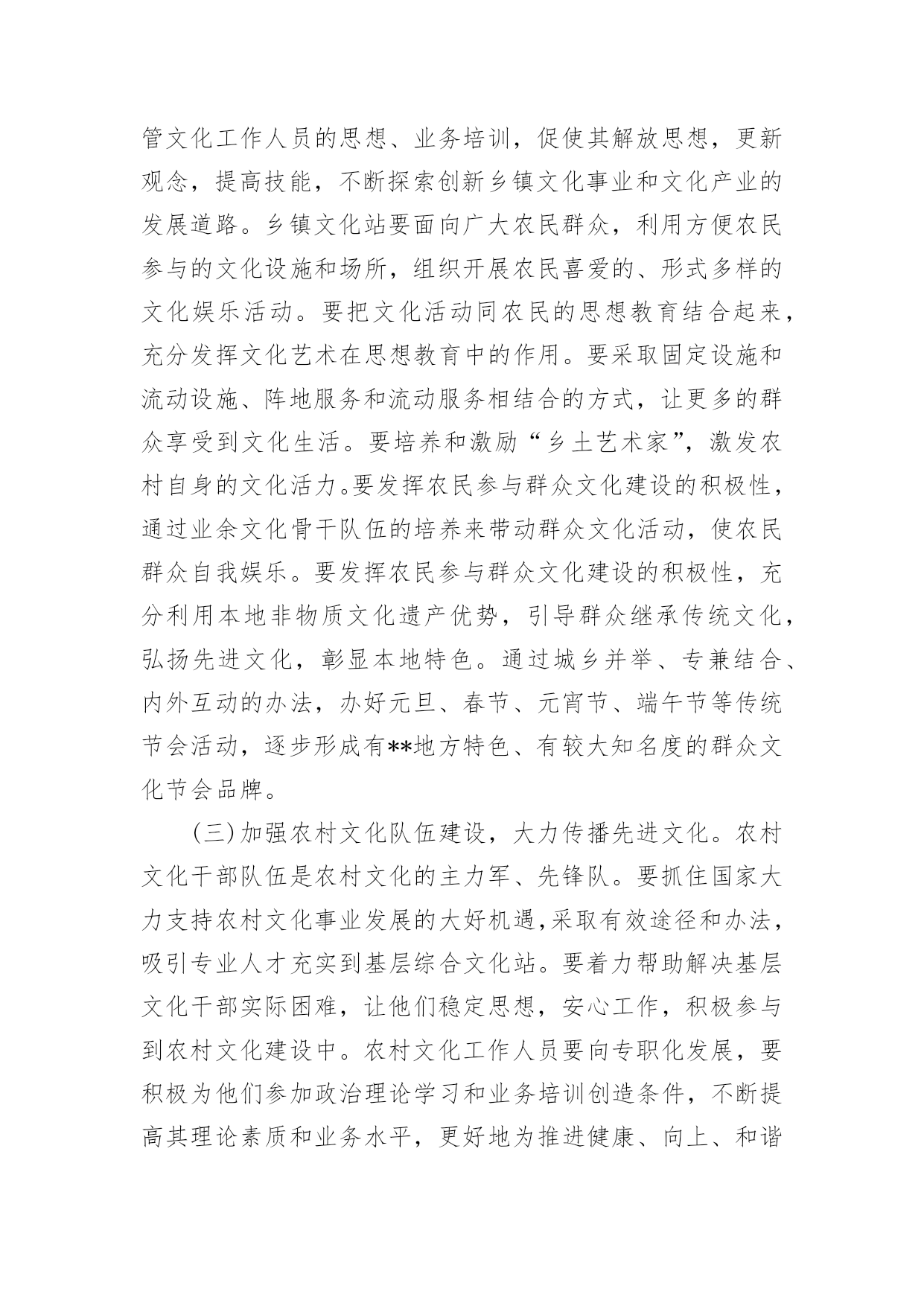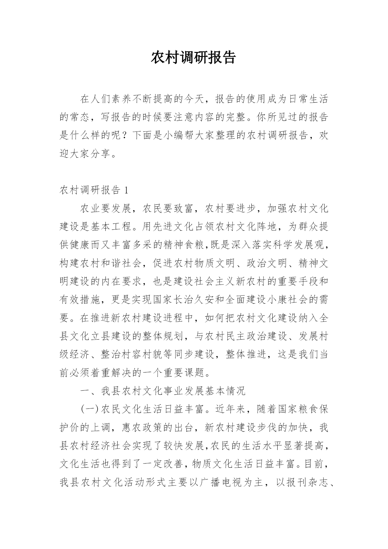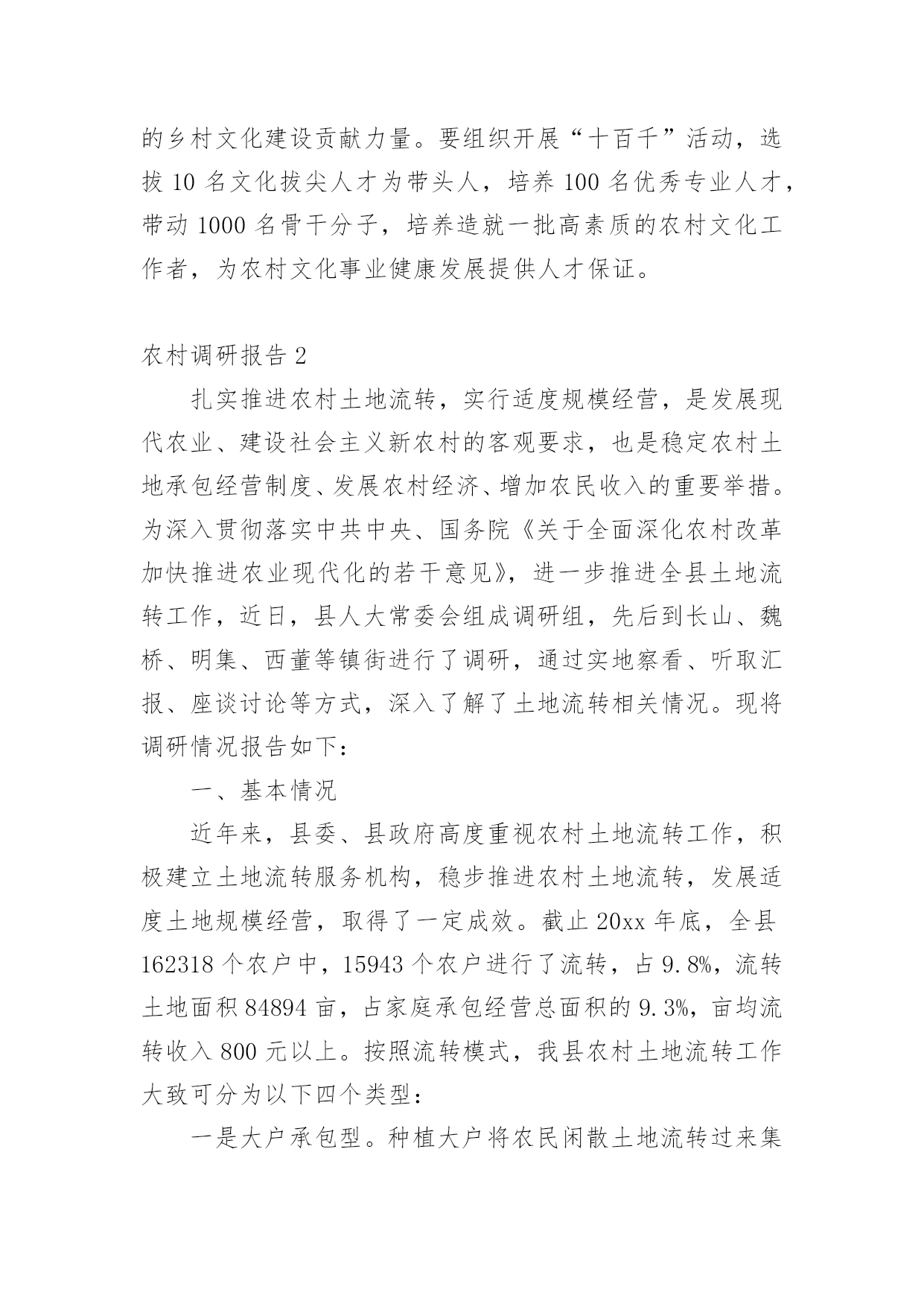 农村调研报告在人们素养不断提高的今天,报告的使用成为日常生活的常态,写报告的时候要注意内容的完整。你所见过的报告是什么样的呢?下面是小编帮大家整理的农村调研报告,欢迎大家分享。农村调研报告1农业要发展,农民要致富,农村要进步,加强农村文化建设是基本工程。用先进文化占领农村文化阵地,为群众提供健康而又丰富多采的精神食粮,既是深入落实科学发展观,构建农村和谐社会,促进农村物质文明、政治文明、精神文明建设的内在要求,也是建设社会主义新农村的重要手段和有效措施,更是实现国家长治久安和全面建设小康社会的需要。在推进新农村建设进程中,如何把农村文化建设纳入全县文化立县建设的整体规划,与农村民主政治建设、发展村级经济、整治村容村貌等同步建设,整体推进,这是我们当前必须着重解决的一个重要课题。一、我县农村文化事业发展基本情况(一)农民文化生活日益丰富。近年来,随着国家粮食保护价的上调,惠农政策的出台,新农村建设步伐的加快,我县农村经济社会实现了较快发展,农民的生活水平显著提高,文化生活也得到了一定改善,物质文化生活日益丰富。目前,我县农村文化活动形式主要以广播电视为主,以报刊杂志、网络传播、群众文化、广场文化为补充,呈现出现代化、多样化的趋势。(二)农村文化基础设施得到改善。随着农村文化建设纳入“xxx”规划,国家加大了公共事业的投入,特别是公共文化设施的投入,我县农村文化基础设施建设也在不断改善。几年来,累计投入资金500余万元,新建乡镇综合文化站1个,面积427平方米;村级文化活动室45个、文化公园8个、文化广场8个、“农家书屋”45个。资源共享工程得到延伸,农民党员教育和农村中小学远程教育资源相得益彰,实现共享。(三)农村群众文化活动蓬勃开展。送戏下乡、送书下乡、送电影下乡等形式多样的文化下乡活动广泛开展,热潮不断,农村露天文艺演出,观看群众常常达到上千人。一年一度的**“登山节”和元宵节焰火晚会已经成为我县群众文化活动的特色品牌。以“金色田野”为主题的系列文化活动、乡镇大型文艺汇演活动,各类棋类比赛、球类比赛、秧歌比赛、书画展等赛事活动极大丰富和活跃了农民业余文化生活。剪纸、根雕、手工编织、二人转、彩绘等民俗特色文化得到保护和发展,积淀了县域农村文化底蕴。(四)农村劳动力文化程度不断提高。九年义务教育的普及和职业教育的深入发展,农民特别是农村青年劳动力的文化程度不断提高,18周岁—35周岁的农村青年初中文化程度者约占85%,高中以上文化程度者约占5%。随着改革开放的不断深入,一部分农村劳动力从土地的束缚中解脱出来,外出务工,吸取了城市的先进文化,文明程度不断提高。(五)农民文化生活消费逐年增长。随着农村各项改革的深入和惠农政策的出台,农村经济日益发展壮大,农民收入持续增长,生活消费水平和消费质量不断提高,我县农民用于文教娱乐用品及服务方面的支出以年均25%的速度增长,精神文化生活质量不断得到改善和提高。二、存在的主要问题和不足(一)农村文化基础设施建设总体上依然薄弱。资金困难是制约我县农村文化设施建设的瓶颈,农村文化建设的速度与人民群众的需求仍有很大差距。虽然近年来我县农村文化基础设施建设步伐加快,但还仅限于新农村建设试点村,其他村屯大多由于无力投入而导致建设步伐缓慢,多数文化设施不能正常使用。全县82个行政村仅有十几个村文化活动室和图书室配套设施齐全,藏书量仅为25000册,远远不能满足农民文化生活和科教兴农的需求。(二)农村文化活动开展的不平衡。目前的.各类文化活动大部分仅限于城镇,边远地区的农民群众不能充分享受到文化服务,出现了“重城镇阵地、轻边远地区,重大型庆典、轻日常活动,重精美培养、轻大众普及”的现象。(三)农村文化活动缺乏地域特色。没有树立起自己的地域文化形象,群众文化活动形式与服务方式沿袭传统模式多,方式过于简单,内容缺乏创新,群众文艺创作力量比较薄弱,群众喜闻乐见、丰富多彩的文化活动形式没有被充分挖掘和利用,在一定程度上限制了农村文化的辐射力和影响力。(四)农村文化管理服务职能偏弱。XX年,全省乡镇机构改革撤消了文体广播中心,由原来的县直部门垂直管理变为由乡镇政府行使有关职能,客观上乡村文化管理职能被弱化。同时,作为农村文化管理服务职能部门的乡镇文化站,普遍存在专业人才缺乏、人员素质偏低的问题,并且文化干部身兼数职,行政事物繁忙,没有精力和时间开展群众文化活动。个别乡镇文化站甚至成了无人员、无阵地、无经费、无活动的“四无”文化站。三、对策建议(一)加大资金投入,加快农村文化设施建设步伐。把农村文化建设纳入经济社会发展总体规划,县乡财政设立专项经费,保证乡镇综合文化站建设和各项文化活动正常开展;相关部门应紧紧抓住国家加大对文化信息资源共享工程和社区、乡镇综合文化站建设投入的契机,积极跑市、进省,争取政策更大的支持,