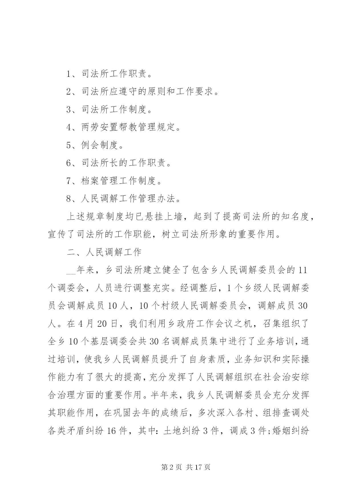 第PAGE\*Arabic\*MERGEFORMAT17页共NUMPAGES\*MERGEFORMAT17页司法工作个人总结多篇由会员“leememmn112”投稿推荐,但愿对你的学习工作能带来参考借鉴作用。工作总结可以全面地,系统地了解以往的工作情况,可以正确认识以往工作中的优缺点。下面是小编给大家精心挑选的工作总结,希望能帮助到大家。司法工作个人总结篇一根据市司法局的工作部署,结合___乡的工作实际,在司法所收编的第一年,我们以创新务实的工作姿态,认真学习党的“__大”,按照“执法为民”的要求,认真实践依法治国的方略,创新普法与依法治理工作,拓展和规范法律服务,夯实基层基础,加强队伍建设,坚持执法为民的思想,牢固树立正确的执法观念和服务观念,切实改进工作作风,做到观念上有新转变,思想上有新飞跃,思路上有新调整,工作上有新突破,在提高工作水平,提升干部形象上有新发展,更好地为地方经济发展和社会稳定服务。现将~年全乡司法行政各项工作开展情况总结如下:一、司法所建设今年是司法所收编的第一年,高标准、高质量、高起点建好司法所是我们的工作重点之一,司法所现有编制2人。为了逐步实现司法所的规范化管理,我们制定了下列规章制度:1、司法所工作职责。2、司法所应遵守的原则和工作要求。3、司法所工作制度。4、两劳安置帮教管理规定。5、例会制度。6、司法所长的工作职责。7、档案管理工作制度。8、人民调解工作管理办法。上述规章制度均已悬挂上墙,起到了提高司法所的知名度,宣传了司法所的工作职能,树立司法所形象的重要作用。二、人民调解工作__年来,乡司法所建立健全了包含乡人民调解委员会的11个调委会,人员进行调整充实。经调整后,1个乡级人民调解委员会调解成员10人,10个村级人民调解委员会,调解成员30人。在4月20日,我们利用乡政府工作会议之机,召集组织了全乡10个基层调委会共30名调解成员集中进行了业务培训,通过培训,使我乡人民调解员提升了自身素质,业务知识和实际操作能力有了很大的提高,充分发挥了人民调解组织在社会治安综合治理方面的重要作用。半年来,我乡人民调解委员会充分发挥其职能作用,在巩固去年的成绩后,多次深入各村、组排查调处各类矛盾纠纷16件,其中:土地纠纷3件,调成3件;婚姻纠纷6件,调成6件;邻里纠纷4件,调成4件;其他纠纷3件,调成3件,调处成功率100%。三、两劳安置帮教工作抓好两劳安置帮教工作组织是保证,制度是规范。在组织健全的基础上,我们建立了两劳安置帮教工作管理规定并悬挂上墙。管理规定的主要内容有:(1)两劳安置帮教工作管理规定(2)衔接制度(3)重点帮教制度(4)例会制度(5)汇报制度(6)档案制度。两劳安置帮教工作是维护地区稳定,维护社会治安,防止释放人员重新犯罪,给社会重新造成危害的重要日常工作。目前全乡范围内共有刑释解教人员8名,其中:凤鸣村3名,李维村2名,前刘村2名,盐锅村1名。在各村帮教领导小组的指导下,对每一个帮教对象成立了帮教小组,做他们的思想工作,想尽一切办法帮他们解决这样那样的困难,经过各个帮教小组耐心细致的工作,很好的完成了帮教工作任务,为维护我乡的稳定和创建“平安乡”做出了重大贡献。目前,我乡8名安置帮教对象(含新回归1名)均已得到妥善安置,无重新犯罪迹象,今年我乡共解除了3名安置帮教人员。四、普法和法宣工作普法和法宣工作是司法所日常工作的重要组成部分,主动协调乡政府各职能部门,做好经常性和阶段性普法和法宣工作是我们的责任。今年我们配合计生办、民政办、综治办、土地建设办宣传各项法律四次,宣传的法律有:《人口和计划生育法》、《土地法》、《婚姻法》、《交通法规》等。宣传的主要形式有:张贴法宣标语、出动宣传广播车、悬挂横幅、下发法宣材料、制作法宣板报等。据不完全统计,接受宣传的人数在5000人以上。20__年,我们对在校学生进行了以预防青少年犯罪为主题的法制宣讲活动3次,受教育师生达600余人次,收到了很好的效果。法制宣传教育工作是一件经常性的日常工作,通过法制宣传教育,使全体干部和广大群众知法、懂法、守法和利用法律维护自己合法权益的能力。五、工作中存在问题一是思想仍比较保守。造成司法所工作开展与我市先进乡镇司法所相比仍存在较大差距,仍待进一步解放思想。二是资金匮乏。司法行政事业的发展需要资金支持,现在普法、法律援助等工作的开展急需资金支持。三是办公环境仍待优化。司法所的办公环境半年来有一定改观,但距离工作要求仍存在差距,仍待优化。总之,在今后的工作中,我们一定进一步加强学习,在学习的深度和广度上下功夫,大胆创新,在灵活多样地开展好工作上下功夫,把我所的工作推上一个新台阶。司法工作个人总结篇二在过去的一年里,在区司法局、桥南镇党委的正确领导下,我按照所在岗位的职责要求,自觉服从组织