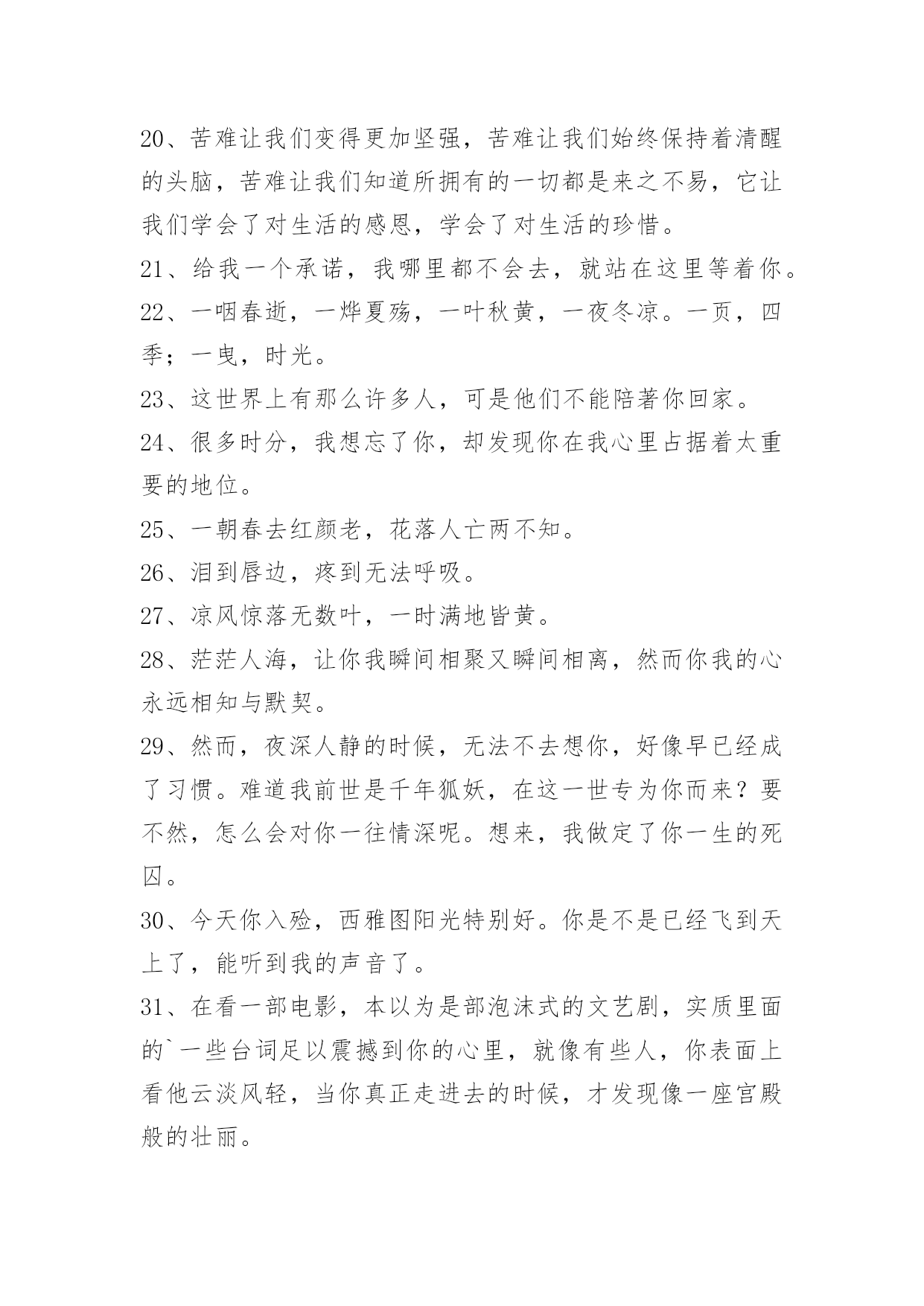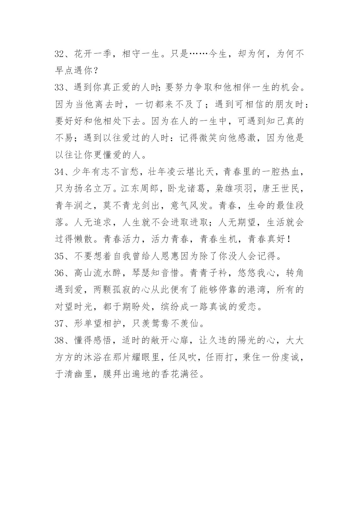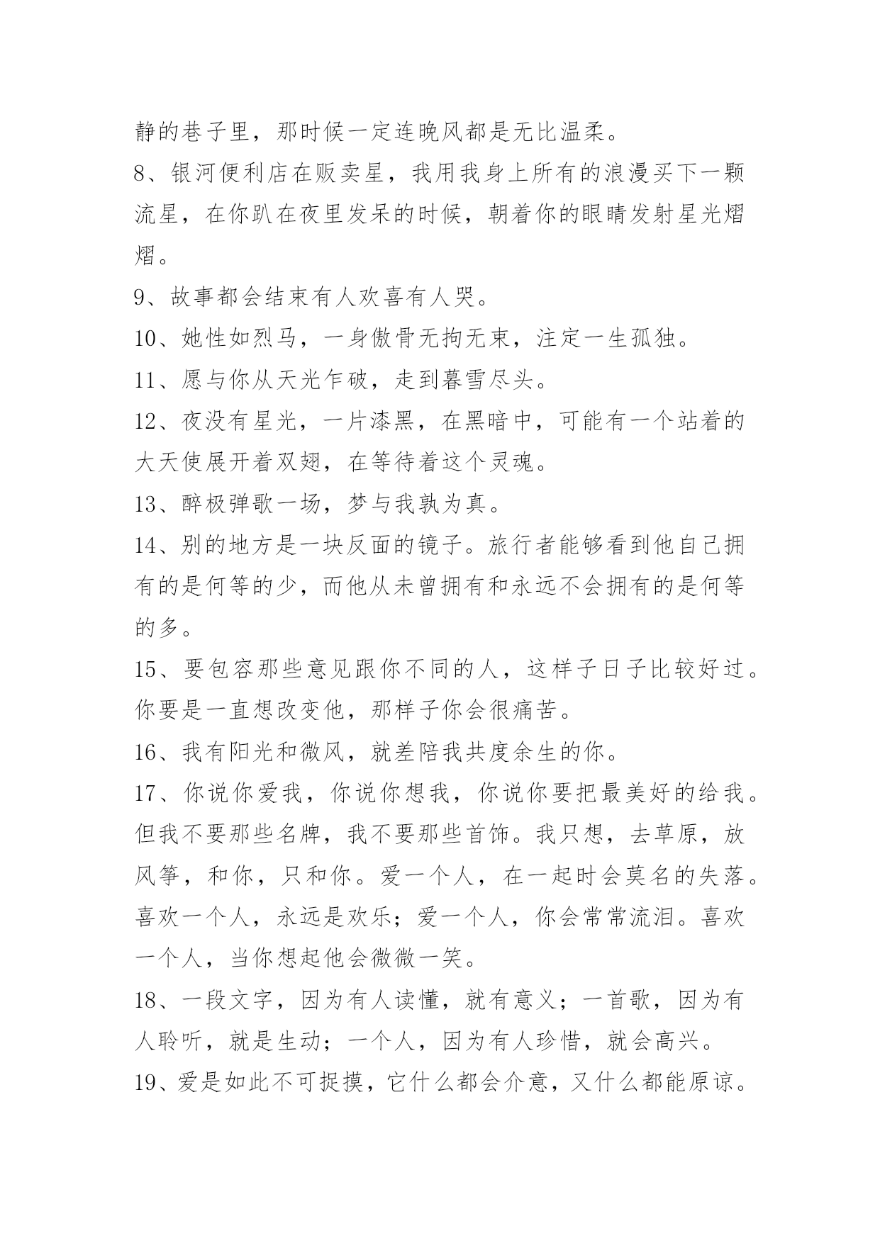 常用文艺句子38条常用文艺句子合集38条有些时候,最难放下的是一些你从没真正拥有过的事。以下是关于文艺句子38条,欢迎大家前来欣赏。1、一个小时前我想吃玉米,但是因为冷我不想出去所以吃了包薯片,半个小时前我又想吃玉米,于是我又吃了一个橙子,我现在还是想吃玉米,所以我又吃了饼干和酸奶,但是我还是想吃玉米,这种感觉就像是我真的喜欢你,让我半途去喜欢别人也没用,到最后还是喜欢你。2、颤抖的双手无法拾取一叶叶飘零的回忆,只能敲着键盘上可爱的按钮,让它们带走心里泛起的片片涟漪。3、这一杯敬你,敬你干净如洗,敬我漂泊无依,我干杯你随意。4、经年后,我才发现。正因为当年留下过太多遗憾,现在我们才拥有了无数美好的回忆。也因为曾经留下的遗憾,我们才拥有了今天意想不到的收获。5、青春,喜怒哀乐分明,有激情,有动力,追梦的路上,有人陪伴是宝贵的回忆。6、秋天不如春天那么羞涩,夏天那么坦露,冬天那么内向,劲风飞舞,枯叶飘落,秋蝉低鸣,虽衰败,但孕育着希望,虽凋零,但酝酿着收获。7、如果能在夏天的傍晚,去见一个喜欢的人,和他走在安静的巷子里,那时候一定连晚风都是无比温柔。8、银河便利店在贩卖星,我用我身上所有的浪漫买下一颗流星,在你趴在夜里发呆的时候,朝着你的眼睛发射星光熠熠。9、故事都会结束有人欢喜有人哭。10、她性如烈马,一身傲骨无拘无束,注定一生孤独。11、愿与你从天光乍破,走到暮雪尽头。12、夜没有星光,一片漆黑,在黑暗中,可能有一个站着的大天使展开着双翅,在等待着这个灵魂。13、醉极弹歌一场,梦与我孰为真。14、别的地方是一块反面的镜子。旅行者能够看到他自己拥有的是何等的少,而他从未曾拥有和永远不会拥有的是何等的多。15、要包容那些意见跟你不同的人,这样子日子比较好过。你要是一直想改变他,那样子你会很痛苦。16、我有阳光和微风,就差陪我共度余生的你。17、你说你爱我,你说你想我,你说你要把最美好的给我。但我不要那些名牌,我不要那些首饰。我只想,去草原,放风筝,和你,只和你。爱一个人,在一起时会莫名的失落。喜欢一个人,永远是欢乐;爱一个人,你会常常流泪。喜欢一个人,当你想起他会微微一笑。18、一段文字,因为有人读懂,就有意义;一首歌,因为有人聆听,就是生动;一个人,因为有人珍惜,就会高兴。19、爱是如此不可捉摸,它什么都会介意,又什么都能原谅。20、苦难让我们变得更加坚强,苦难让我们始终保持着清醒的头脑,苦难让我们知道所拥有的一切都是来之不易,它让我们学会了对生活的感恩,学会了对生活的珍惜。21、给我一个承诺,我哪里都不会去,就站在这里等着你。22、一咽春逝,一烨夏殇,一叶秋黄,一夜冬凉。一页,四季;一曳,时光。23、这世界上有那么许多人,可是他们不能陪著你回家。24、很多时分,我想忘了你,却发现你在我心里占据着太重要的地位。25、一朝春去红颜老,花落人亡两不知。26、泪到唇边,疼到无法呼吸。27、凉风惊落无数叶,一时满地皆黄。28、茫茫人海,让你我瞬间相聚又瞬间相离,然而你我的心永远相知与默契。29、然而,夜深人静的时候,无法不去想你,好像早已经成了习惯。难道我前世是千年狐妖,在这一世专为你而来?要不然,怎么会对你一往情深呢。想来,我做定了你一生的死囚。30、今天你入殓,西雅图阳光特别好。你是不是已经飞到天上了,能听到我的声音了。31、在看一部电影,本以为是部泡沫式的文艺剧,实质里面的`一些台词足以震撼到你的心里,就像有些人,你表面上看他云淡风轻,当你真正走进去的时候,才发现像一座宫殿般的壮丽。32、花开一季,相守一生。只是……今生,却为何,为何不早点遇你?33、遇到你真正爱的人时:要努力争取和他相伴一生的机会。因为当他离去时,一切都来不及了;遇到可相信的朋友时:要好好和他相处下去。因为在人的一生中,可遇到知己真的不易;遇到以往爱过的人时:记得微笑向他感激,因为他是以往让你更懂爱的人。34、少年有志不言愁,壮年凌云堪比天,青春里的一腔热血,只为扬名立万。江东周郎,卧龙诸葛,枭雄项羽,唐王世民,青年润之,莫不青龙剑出,意气风发。青春,生命的最佳段落。人无追求,人生就不会进取进取;人无期望,生活就会过得懒散。青春活力,活力青春,青春生机,青春真好!35、不要想着自我曾给人恩惠因为除了你没人会记得。36、高山流水醉,琴瑟知音惜。青青子衿,悠悠我心,转角遇到爱,两颗孤寂的心从此便有了能够停靠的港湾,所有的对望时光,都于期盼处,缤纷成一路真诚的爱恋。37、形单望相护,只羡鸳鸯不羡仙。38、懂得感悟,适时的敞开心扉,让久违的陽光的心,大大方方的沐浴在那片耀眼里,任风吹,任雨打,秉住一份虔诚,于清幽里,膜拜出遍地的香花满径。