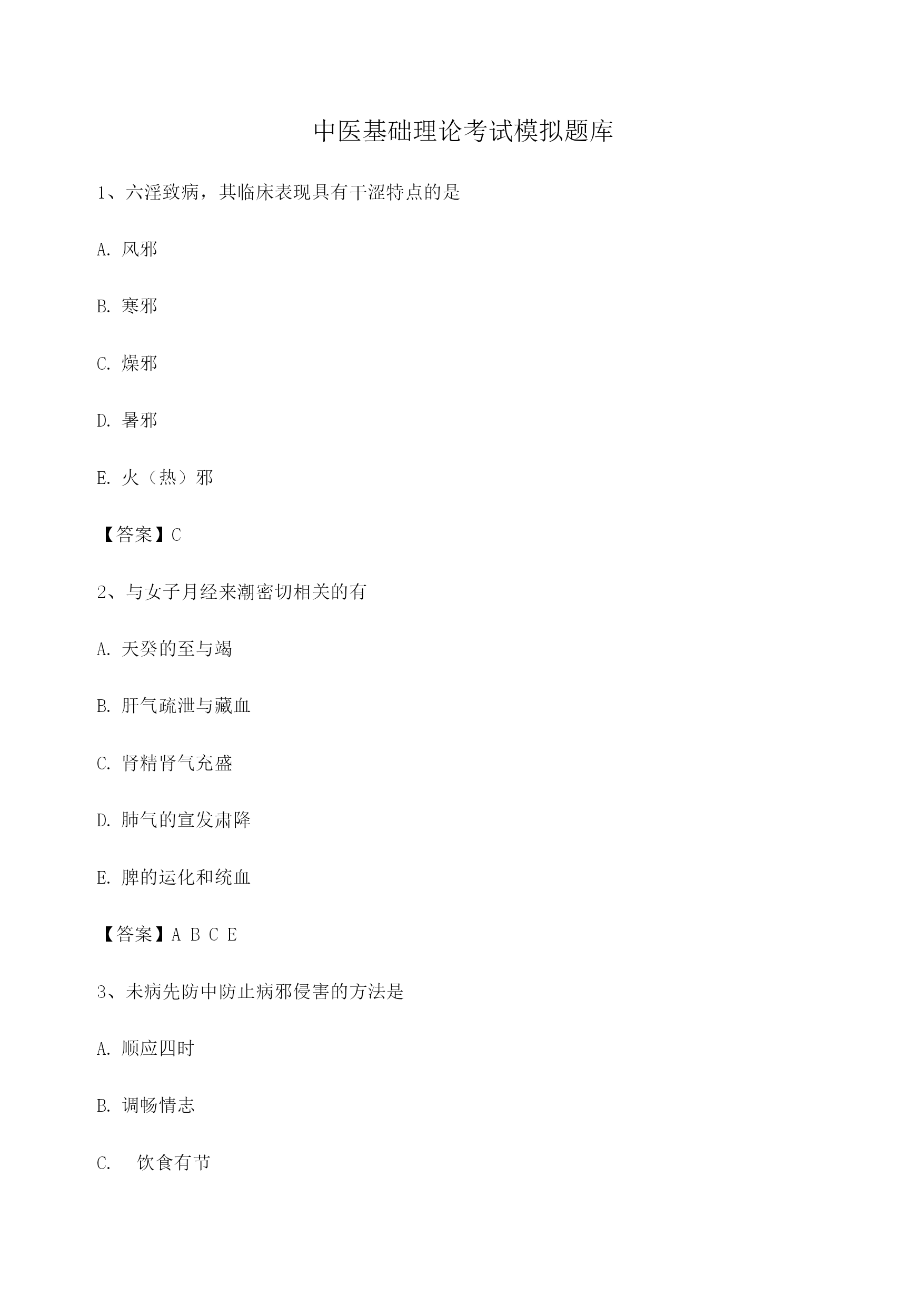 中医基础理论考试模拟题库1、六淫致病,其临床表现具有干涩特点的是风邪寒邪燥邪暑邪火(热)邪【答案】C2、与女子月经来潮密切相关的有天癸的至与竭肝气疏泄与藏血肾精肾气充盛肺气的宣发肃降脾的运化和统血【答案】ABCE3、未病先防中防止病邪侵害的方法是顺应四时调畅情志饮食有节起居有常药物预防【答案】E4、肺与脾的关系表现在宗气生成和津液代谢血的生成运行气机的调节呼吸运动与消化吸收阴液互资互济【答案】A5、不属于评价心理发育水平的是智力情感个性意志耐力【答案】E6、肺气的宣发生理功能有呼出浊气宣散卫气布散津液精微上输生成宗气【答案】ABCD7、体现火.燥.暑三种外邪的共同致病特点的是上炎耗气伤津动血扰乱心神【答案】C8、具有统帅.联络和调节十二经脉气血作用的是十二经别十二皮部奇经八脉十五别络络脉【答案】C9、属于阴阳平和质的有喜动好强精力充沛身体强壮胖瘦适度工作潜力大【答案】BCDE10、对三焦描述错误的是决渎之官原气之别使水谷之道路孤脏孤府【答案】D11、形象思维可以同时运用感知的许多形象,或由一个形象跳跃到另一个形象,常可产生的思维是联想思维灵感思维创新思维发散思维逻辑思维【答案】ABD12、中医学的系统思维包括天人合一以人为本恒动变化整体宏观动静相召【答案】AD13、整体观念的内涵包括五脏一体观形神一体观天人一体观精气神一体观人与社会统一观【答案】ABCDE14、心与脾的关系包括血液运行津液输布津液代谢气机调畅血液生成【答案】AE15、根据《素问•上古天真论》,关于女子生命过程表述正确的有七岁肾气盛二七天癸至三七肾气平均五七三阳脉衰于上,面皆焦发始白七七天癸竭地道不通【答案】ABCDE16、疾病发生的内在因素是邪气强盛正气不足邪胜正负正虚邪恋正胜邪衰【答案】B17、湿邪.寒邪的共同致病特点是损伤阳气易致疼痛黏腻重浊凝滞收引易袭阳位【答案】A18、起于胞中,循行于腹部正中的奇经是督脉冲脉阴维脉任脉足少阴肾经【答案】D19、患者出现面色苍白,汗出不止,目闭开,全身瘫软,二便失禁,脉微欲绝等症状,从病机而言属于气滞气逆气陷气闭气脱【答案】E20、疠气形成和疫病流行的原因有气候反常社会因素暴饮暴食环境污染预防隔离工作不好【答案】ABDE21、在五神脏中,肝所藏的神是TOC\o"1-5"\h\z神魂魄意志【答案】B22、真寒假热证的治法是寒者热之热者寒之用热远热寒因寒用热因热用【答案】E23、小肠泌别清浊功能包括将饮食分离为精微和残渣吸收精微和输送食物残渣吸收水谷中的水液将精微上输心肺将糟粕排出体外【答案】ABC24、不属于正治的是寒者热之热者寒之虚则补之寒因寒用实则泻之【答案】D25、疾病复发的基本条件有邪未尽除正虚未复诱因情志安和气血失和【答案】ABC26、在血液运行中起关键作用的是/心血充盈M气充沛。.心神安宁/心阳正常脉道通利【答案】B27、与情志内伤关系最密切的脏有TOC\o"1-5"\h\z/心肝5肺肾【答案】ABC28、某男,38岁。外伤大出血,而后出现唇干燥.渴多饮,尿少,其病机是失血伤津津液亏虚血虚濡养气随血脱气血两虚【答案】A29、不属于药邪形成原因的是用药过量药量过少炮制不当配伍不当£.用法不当【答案】B30、某男,65岁。年老体弱,少气乏力,自汗,小便清长,尿频,夜间尤重,其病机是气失推动气失防御气失固摄气失温煦气失营养【答案】C31、脏与脏关系中,主要表现为气机调节的两脏是入.心与肺肺与肾肺与肝肝与肾脾与肾【答案】C32、某女,46岁。鼻咽.皮肤干燥,渴欲饮,尿少,大便干结,舌苔干燥,其病机是精亏气虚血虚津液亏虚气血两虚【答案】D33、在滋阴剂中适当佐以补阳药是滋阴温阳阴中求阳阳中求阴阳病治阴【答案】D34、思虑过度最易损伤的脏是TOC\o"1-5"\h\z心肝5肺肾【答案】C35、邪郁化火的形成因素包括寒郁化热湿郁化火痰郁化火血郁化火食积化火【答案】ABCDE36、血虚引起气虚病变的理论根据是气能生血气能行血气能摄血血能养气血能载气【答案】D37、阐述温病卫气营血传变正确的是病在卫分为病势较轻浅病在气分为邪已传里,病势较重病在营分为邪已深入,病势更重病在血分为邪气更加深入,最为严重病位越深,病