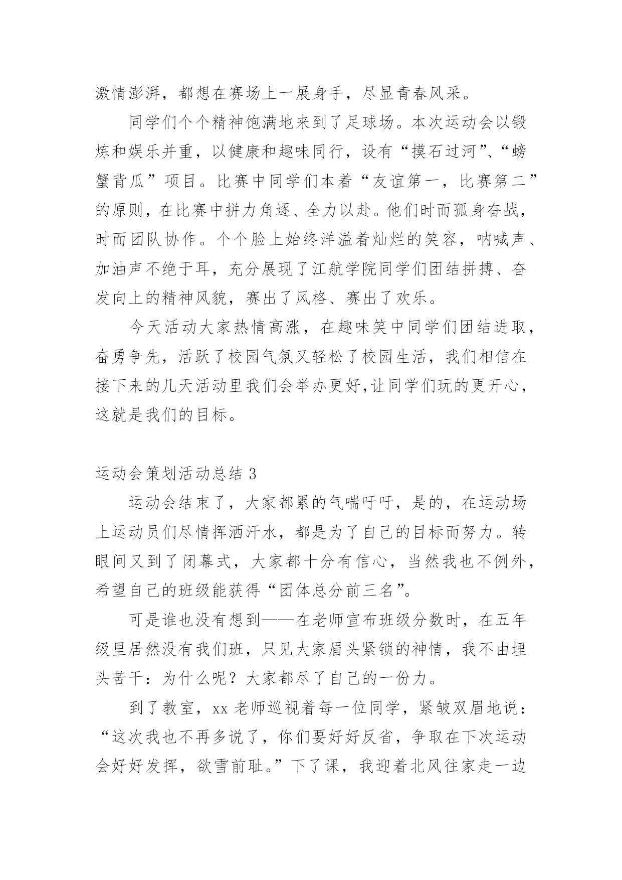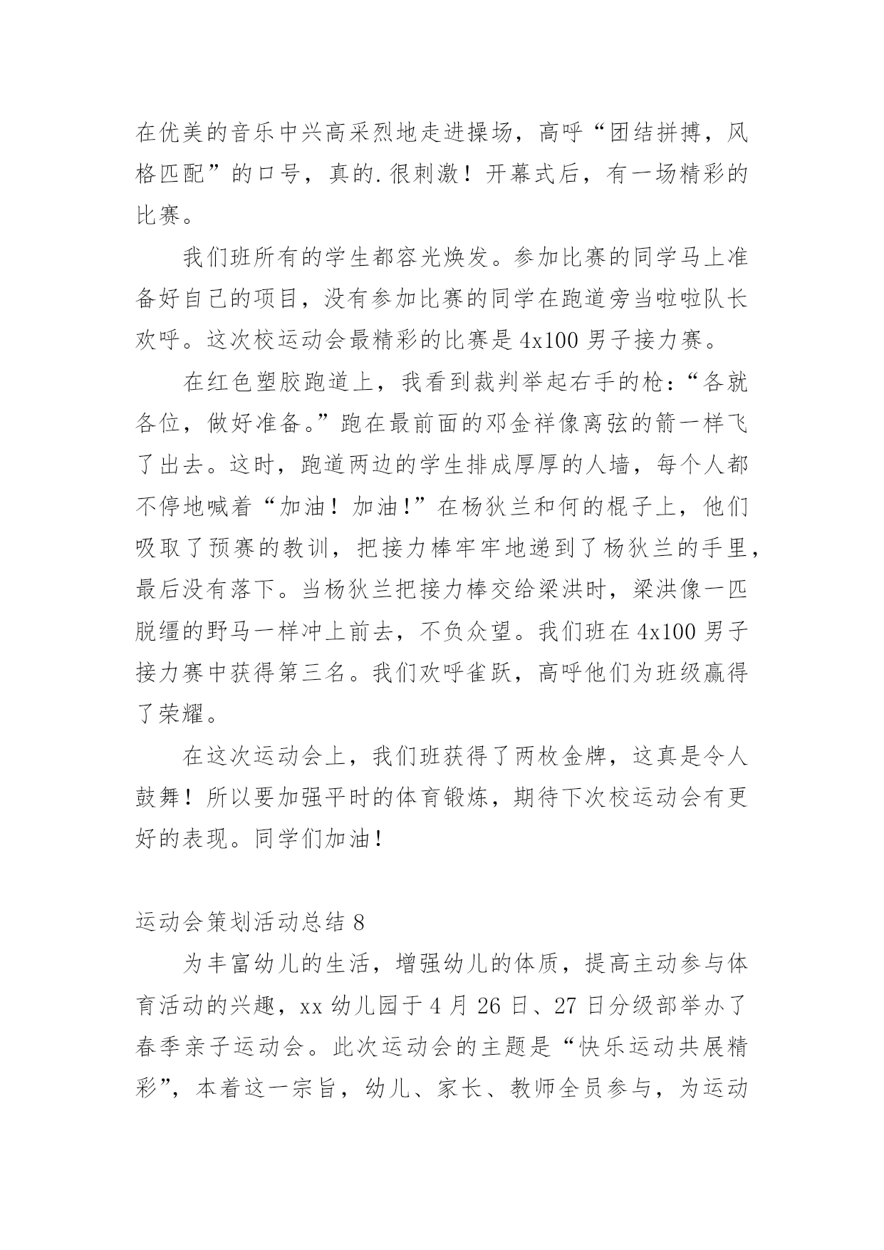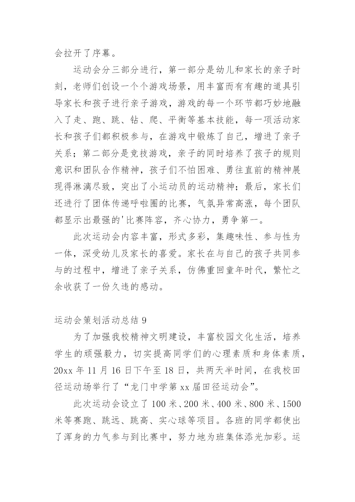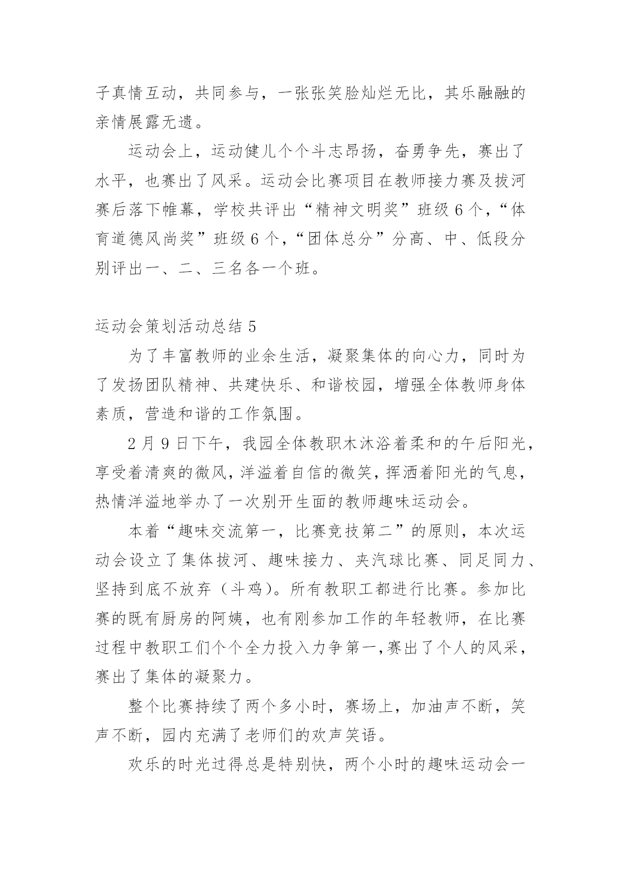 运动会策划活动总结总结是指社会团体、企业单位和个人对某一阶段的学习、工作或其完成情况加以回顾和分析,得出教训和一些规律性认识的一种书面材料,它能够给人努力工作的动力,让我们抽出时间写写总结吧。那么总结要注意有什么内容呢?下面是小编为大家收集的运动会策划活动总结,希望对大家有所帮助。运动会策划活动总结111月4日在这个秋末冬初的季节里,太阳如此的温暖,像是知道就在今天孩子们要进行亲子游戏一样,暖暖的,舒服极了!就在今天下午2:30我园举行了秋季亲子趣味运动会,本次运动会以“游戏中学习,快乐中成长”为主题,在运动会中,幼儿收获了快乐与成功,家长们收获了童贞,老师们也从中获得了成就感。在这次活动中:1、让幼儿真正体会到了运动的快乐,本次活动是以孩子和家长为主体,主要体现“游戏中学习,快乐中成长”这个主题,今天,幼儿与家长们都玩的很开心,让幼儿感觉到原来运动是如此的快乐;2、增强了家园联系,本次活动面向全体家长开放,家长们既观看了孩子们的早操表演,了解了自已孩子在活动中的表现,又亲自参与了亲子游戏。家长们都积极参与,气氛十分热烈。此次运动会给了孩子们一个展示自我的机会,孩子们在运动会中体会了竞争的'意义,学会了坚持,学会了为别人喝彩。我们以后会组织更多类似的活动,给孩子们更多的锻炼和学习机会,相信在以后的活动中,我们还会收获更多,孩子们也会收获的更多。运动会策划活动总结2幼儿园冬季运动会在学院领导的大力支持和关心下,通过各部门的协作和配合,以及全院师生的共同努力下,各项工作已安全顺利地结束,达到了预期举办的目标。为进一步改进和提高工作,现对本届运动会总结如下:一、这是一个安全的运动会在所有教师与家长的共同努力下,整个活动过程中没有发生安全事故。二、运动会上体现了每个家庭良好的精神风貌赛场上,小运动员们积极努力,勇敢拼搏,家长们精神抖擞,不甘落后。观看的同伴们不停地加油呐喊助威。爸爸妈妈和孩子们脸上洋溢着幸福与快乐。三、赛事回顾、精彩无限在这些活动当中,最别具一格的游戏是“XX兜兜”,和“大小乌龟齐上阵”由于投乒乓球需要掌握一定的技巧,所以家长们在旁边又激动又担心,热烈欢快的游戏让家长们兴奋积极地参与,充分的拉近了家长和孩子之间的距离,“大小乌龟齐上阵”让家长们体验到运动中的快乐与童真。我们的家长很踊跃、很投入、很配合,使我们的赛场气氛非常热烈;为活动添了更精彩的一笔,运动会上,有的父母请假参加本次活动,更是把此次亲子运动会推向一个又一个的XX。四、教师集思广益、上下团结整个活动由教师们共同商讨设计游戏项目,共同进行游戏道具的收集制作,共同策划游戏场地的布置,每个环节都体现了教师之间配合的协调与默契。活动过程中,教师们各持岗位,尽职尽责的完成各项工作。老师们不怕苦不怕累,目的只有一个,让所有的孩子与家长在这一天玩的开心,快乐!五、家长支持配合运动会能够这样顺利的`开展与家长的支持与配合是分不开的,他们的积极配合与努力让我们老师都感到很欣慰。部分家长还充分发挥个人资源,为我们的运动会助力。总之、本次首届大手牵小手—冬季运动会是圆满成功的。与学院领导的重视、师生的共同努力、家长的紧密配合是分不开的。通过这次的运动会,我们的团队更强大了,我们的家园更紧密了,我们的孩子更坚强了。所有的家长和孩子在参与活动的过程中锻炼了身体,体验了运动的快乐、游戏的快乐、比赛的智慧,同时我们的家长也体会到了久违的童真。为了丰富同学们的业余生活,学校体育协会、电子协会和院学生生体育部的成员于x月x日下午开展了主题为“青春快乐、快乐青春”的学生趣味运动会。同学们活力四射、激情澎湃,都想在赛场上一展身手,尽显青春风采。同学们个个精神饱满地来到了足球场。本次运动会以锻炼和娱乐并重,以健康和趣味同行,设有“摸石过河”、“螃蟹背瓜”项目。比赛中同学们本着“友谊第一,比赛第二”的原则,在比赛中拼力角逐、全力以赴。他们时而孤身奋战,时而团队协作。个个脸上始终洋溢着灿烂的笑容,呐喊声、加油声不绝于耳,充分展现了江航学院同学们团结拼搏、奋发向上的精神风貌,赛出了风格、赛出了欢乐。今天活动大家热情高涨,在趣味笑中同学们团结进取,奋勇争先,活跃了校园气氛又轻松了校园生活,我们相信在接下来的几天活动里我们会举办更好,让同学们玩的更开心,这就是我们的目标。运动会策划活动总结3运动会结束了,大家都累的气喘吁吁,是的,在运动场上运动员们尽情挥洒汗水,都是为了自己的目标而努力。转眼间又到了闭幕式,大家都十分有信心,当然我也不例外,希望自己的班级能获得“团体总分前三名”。可是谁也没有想到——在老师宣布班级分数时,在五年级里居然没有我们班,只见大家眉头紧锁的神情,我不由埋头苦干:为什么呢?大家都尽了自己的一份力。到了教室,xx老师巡视着每一位同学,紧皱双眉地说:“这次我也不再多说了,你们要好好反