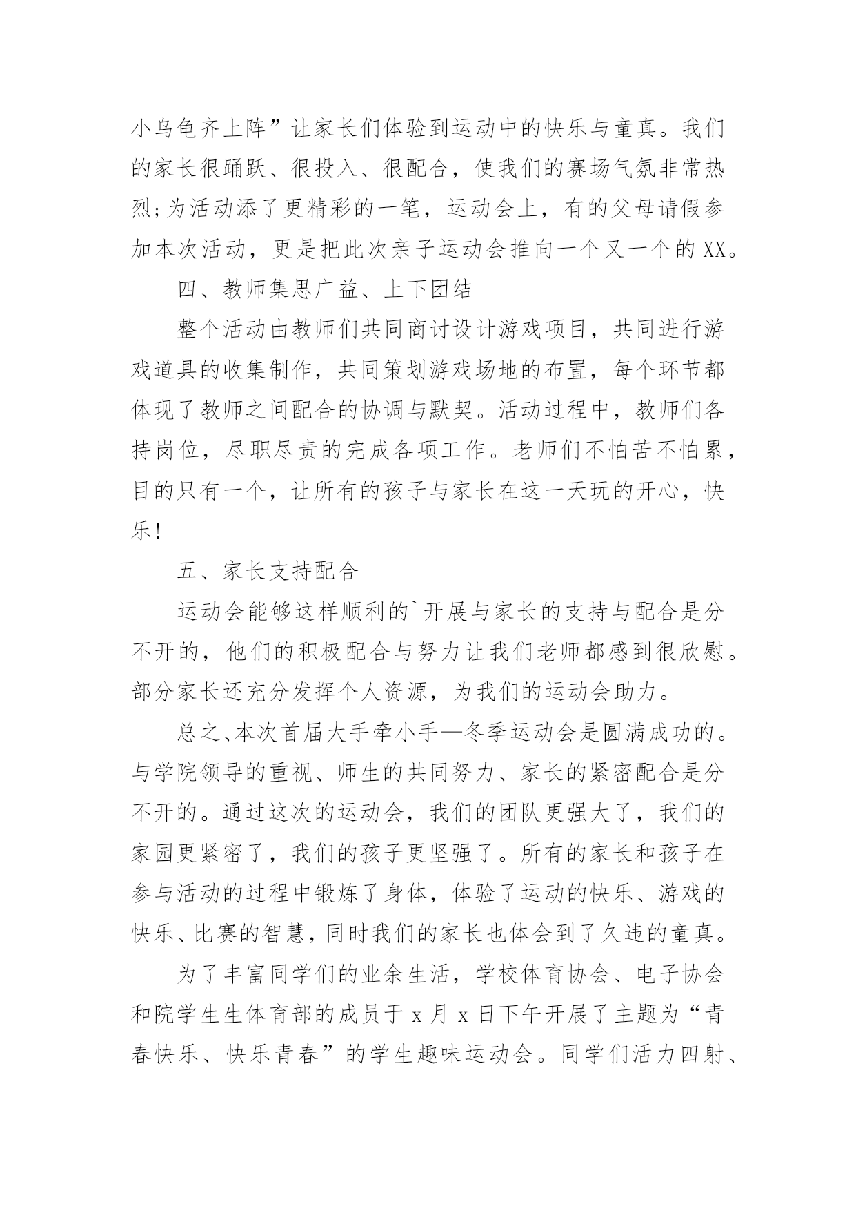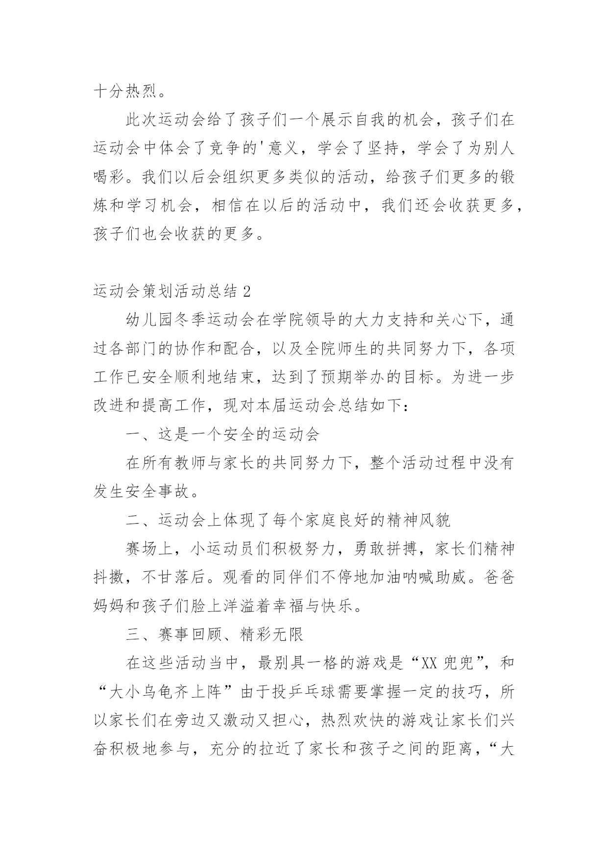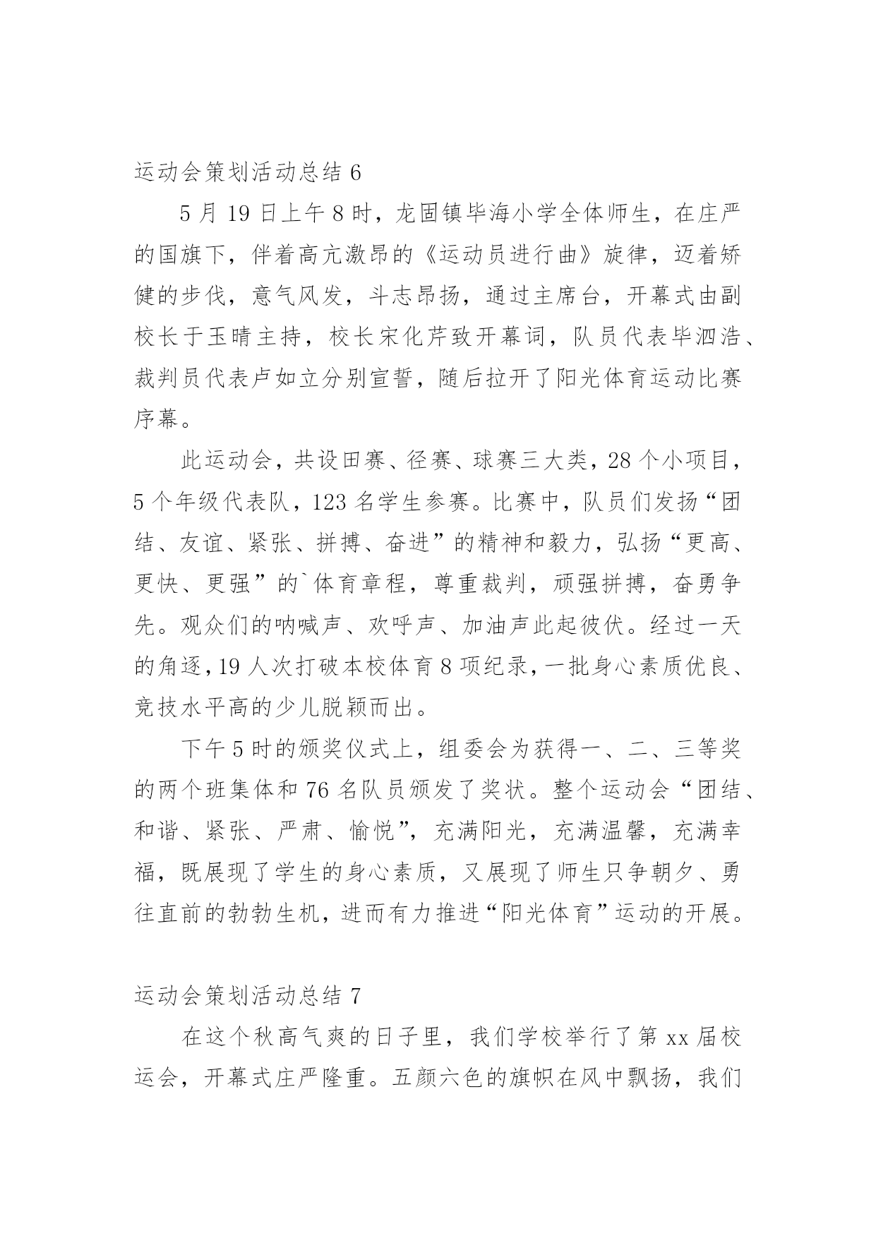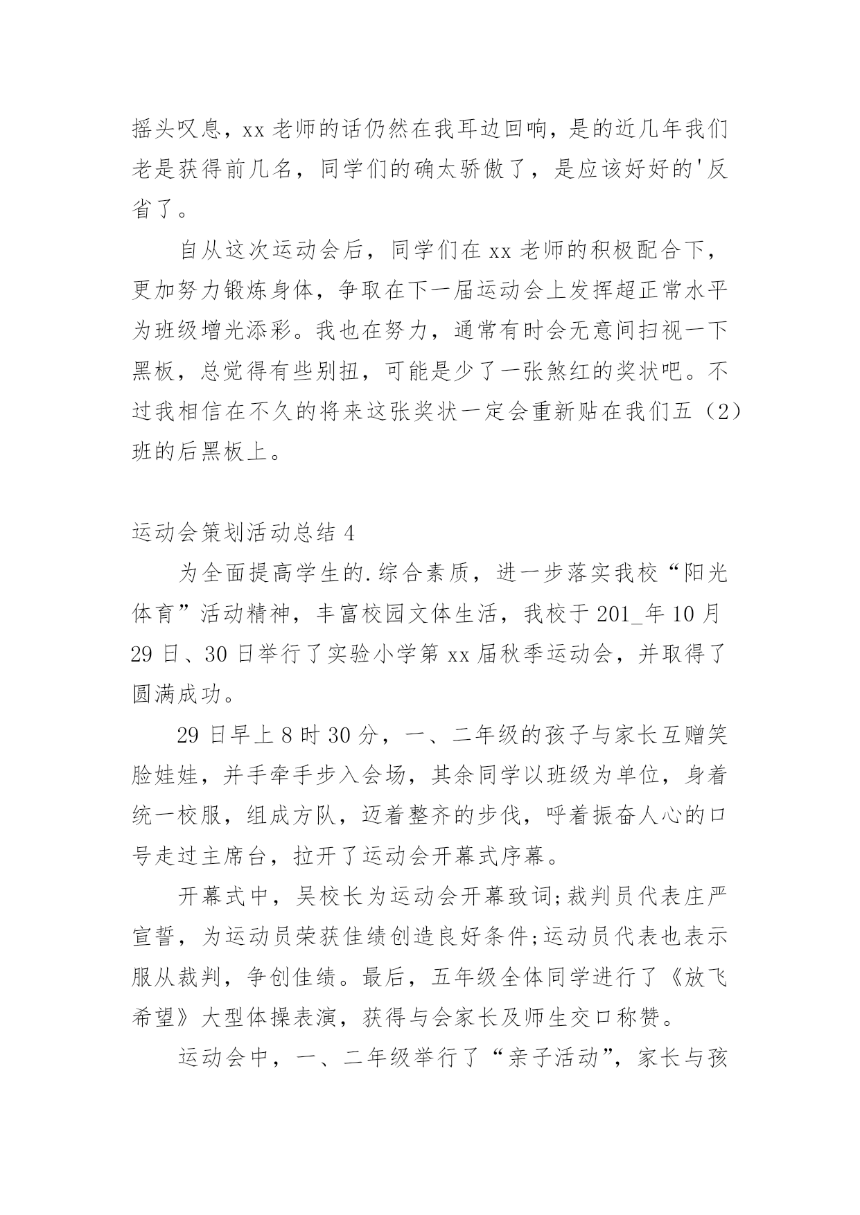 运动会策划活动总结总结是指社会团体、企业单位和个人对某一阶段的学习、工作或其完成情况加以回顾和分析,得出教训和一些规律性认识的一种书面材料,它能够给人努力工作的动力,让我们抽出时间写写总结吧。那么总结要注意有什么内容呢?下面是小编为大家收集的运动会策划活动总结,希望对大家有所帮助。运动会策划活动总结111月4日在这个秋末冬初的季节里,太阳如此的温暖,像是知道就在今天孩子们要进行亲子游戏一样,暖暖的,舒服极了!就在今天下午2:30我园举行了秋季亲子趣味运动会,本次运动会以“游戏中学习,快乐中成长”为主题,在运动会中,幼儿收获了快乐与成功,家长们收获了童贞,老师们也从中获得了成就感。在这次活动中:1、让幼儿真正体会到了运动的快乐,本次活动是以孩子和家长为主体,主要体现“游戏中学习,快乐中成长”这个主题,今天,幼儿与家长们都玩的很开心,让幼儿感觉到原来运动是如此的快乐;2、增强了家园联系,本次活动面向全体家长开放,家长们既观看了孩子们的早操表演,了解了自已孩子在活动中的表现,又亲自参与了亲子游戏。家长们都积极参与,气氛十分热烈。此次运动会给了孩子们一个展示自我的机会,孩子们在运动会中体会了竞争的'意义,学会了坚持,学会了为别人喝彩。我们以后会组织更多类似的活动,给孩子们更多的锻炼和学习机会,相信在以后的活动中,我们还会收获更多,孩子们也会收获的更多。运动会策划活动总结2幼儿园冬季运动会在学院领导的大力支持和关心下,通过各部门的协作和配合,以及全院师生的共同努力下,各项工作已安全顺利地结束,达到了预期举办的目标。为进一步改进和提高工作,现对本届运动会总结如下:一、这是一个安全的运动会在所有教师与家长的共同努力下,整个活动过程中没有发生安全事故。二、运动会上体现了每个家庭良好的精神风貌赛场上,小运动员们积极努力,勇敢拼搏,家长们精神抖擞,不甘落后。观看的同伴们不停地加油呐喊助威。爸爸妈妈和孩子们脸上洋溢着幸福与快乐。三、赛事回顾、精彩无限在这些活动当中,最别具一格的游戏是“XX兜兜”,和“大小乌龟齐上阵”由于投乒乓球需要掌握一定的技巧,所以家长们在旁边又激动又担心,热烈欢快的游戏让家长们兴奋积极地参与,充分的拉近了家长和孩子之间的距离,“大小乌龟齐上阵”让家长们体验到运动中的快乐与童真。我们的家长很踊跃、很投入、很配合,使我们的赛场气氛非常热烈;为活动添了更精彩的一笔,运动会上,有的父母请假参加本次活动,更是把此次亲子运动会推向一个又一个的XX。四、教师集思广益、上下团结整个活动由教师们共同商讨设计游戏项目,共同进行游戏道具的收集制作,共同策划游戏场地的布置,每个环节都体现了教师之间配合的协调与默契。活动过程中,教师们各持岗位,尽职尽责的完成各项工作。老师们不怕苦不怕累,目的只有一个,让所有的孩子与家长在这一天玩的开心,快乐!五、家长支持配合运动会能够这样顺利的`开展与家长的支持与配合是分不开的,他们的积极配合与努力让我们老师都感到很欣慰。部分家长还充分发挥个人资源,为我们的运动会助力。总之、本次首届大手牵小手—冬季运动会是圆满成功的。与学院领导的重视、师生的共同努力、家长的紧密配合是分不开的。通过这次的运动会,我们的团队更强大了,我们的家园更紧密了,我们的孩子更坚强了。所有的家长和孩子在参与活动的过程中锻炼了身体,体验了运动的快乐、游戏的快乐、比赛的智慧,同时我们的家长也体会到了久违的童真。为了丰富同学们的业余生活,学校体育协会、电子协会和院学生生体育部的成员于x月x日下午开展了主题为“青春快乐、快乐青春”的学生趣味运动会。同学们活力四射、激情澎湃,都想在赛场上一展身手,尽显青春风采。同学们个个精神饱满地来到了足球场。本次运动会以锻炼和娱乐并重,以健康和趣味同行,设有“摸石过河”、“螃蟹背瓜”项目。比赛中同学们本着“友谊第一,比赛第二”的原则,在比赛中拼力角逐、全力以赴。他们时而孤身奋战,时而团队协作。个个脸上始终洋溢着灿烂的笑容,呐喊声、加油声不绝于耳,充分展现了江航学院同学们团结拼搏、奋发向上的精神风貌,赛出了风格、赛出了欢乐。今天活动大家热情高涨,在趣味笑中同学们团结进取,奋勇争先,活跃了校园气氛又轻松了校园生活,我们相信在接下来的几天活动里我们会举办更好,让同学们玩的更开心,这就是我们的目标。运动会策划活动总结3运动会结束了,大家都累的气喘吁吁,是的,在运动场上运动员们尽情挥洒汗水,都是为了自己的目标而努力。转眼间又到了闭幕式,大家都十分有信心,当然我也不例外,希望自己的班级能获得“团体总分前三名”。可是谁也没有想到——在老师宣布班级分数时,在五年级里居然没有我们班,只见大家眉头紧锁的神情,我不由埋头苦干:为什么呢?大家都尽了自己的一份力。到了教室,xx老师巡视着每一位同学,紧皱双眉地说:“这次我也不再多说了,你们要好好反