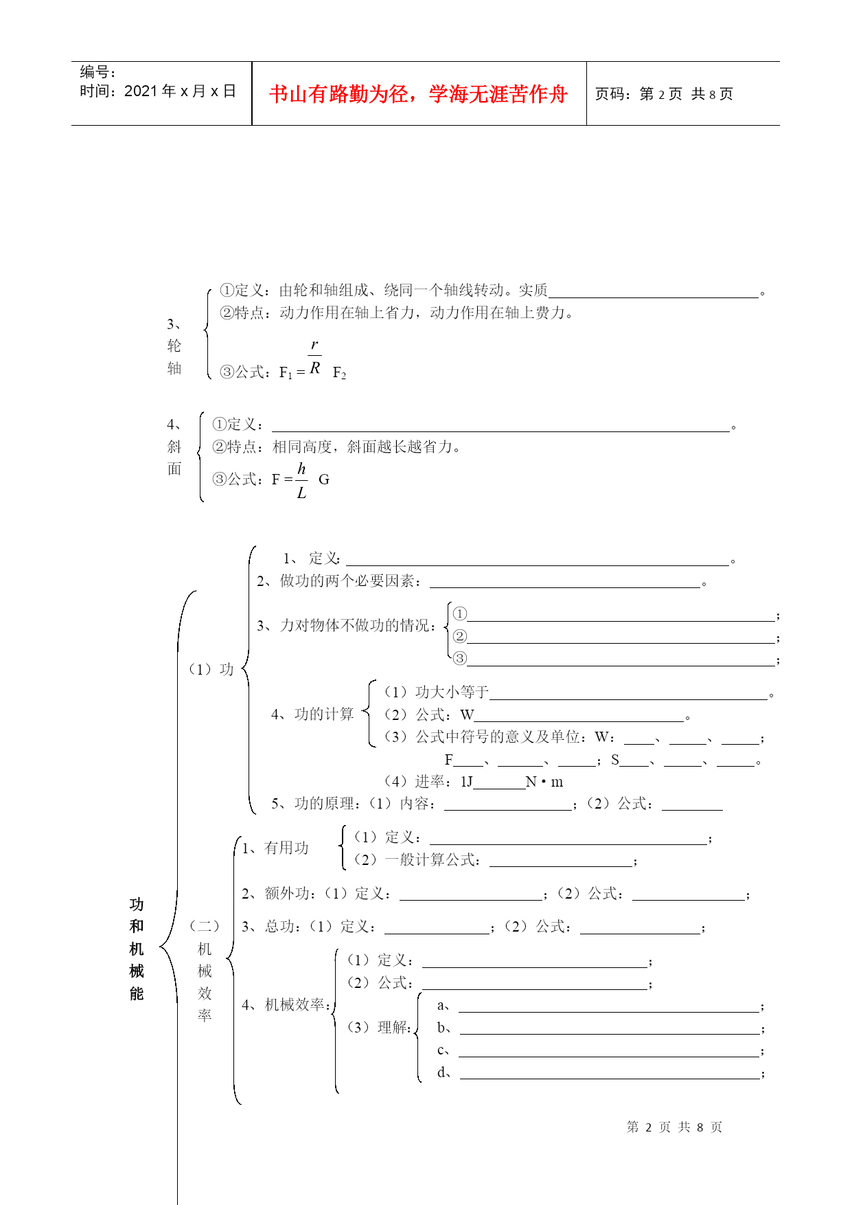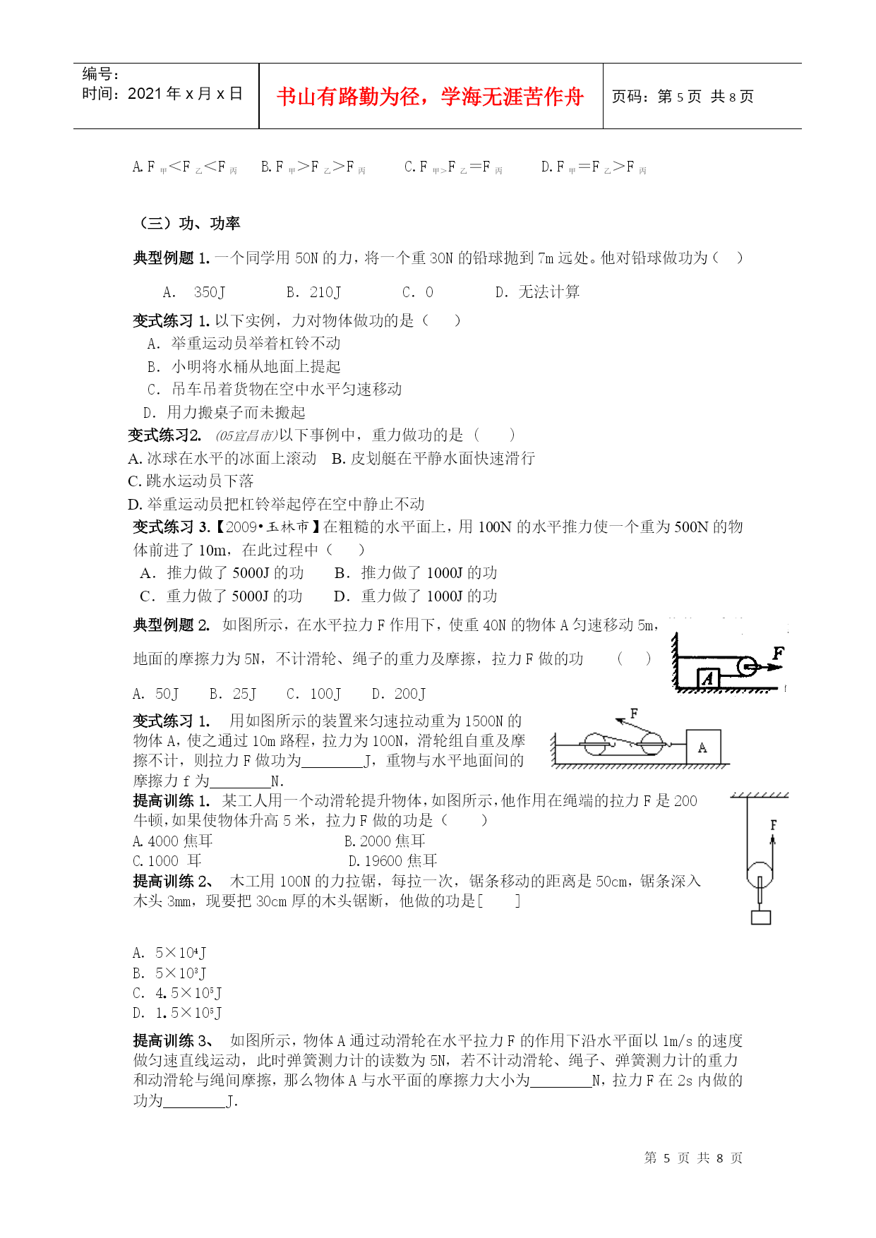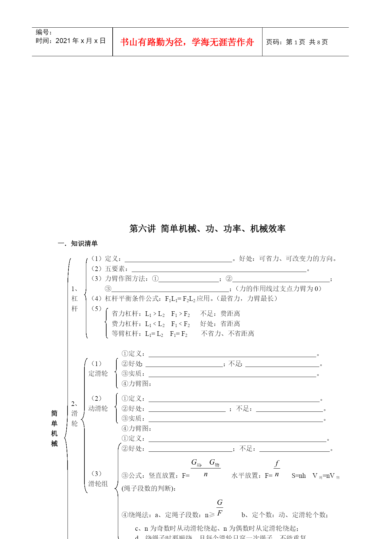 编号:时间:2021年x月x日书山有路勤为径,学海无涯苦作舟页码:第PAGE8页共NUMPAGES8页第PAGE\*MERGEFORMAT8页共NUMPAGES\*MERGEFORMAT8页HYPERLINK""第六讲简单机械、功、功率、机械效率一.知识清单(1)定义:。好处:可省力、可改变力的方向。(2)五要素:。(3)力臂作图方法:①;②;③;(力的作用线过支点力臂为0)(4)杠杆平衡条件公式:F1L1=F2L2应用。(最省力,力臂最长)(5)1、杠杆省力杠杆:L1﹥L2F1﹥F2不足:费距离费力杠杆:L1﹤L2F1﹤F2好处:省距离等臂杠杆:L1=L2F1=F2不省力、不省距离①定义:。②好处:;不足:。③实质:。④力臂图:(1)定滑轮2、滑轮①定义:。②好处:;不足:。③实质:。④力臂图:(2)动滑轮简单机械①定义:。②好处:;不足:。③公式:竖直放置:F=水平放置:F=S=nhV绳=nV物(绳子段数的判断):④绕绳法:a、定绳子段数:n≥b、定个数:动、定滑轮个数;c、n为奇数时从动滑轮绕起、n为偶数时从定滑轮绕起;d、绕绳子时要顺绕,且每个滑轮只穿一次绳子,不能重复。(3)滑轮组①定义:由轮和轴组成、绕同一个轴线转动。实质。②特点:动力作用在轴上省力,动力作用在轴上费力。③公式:F1=F23、轮轴①定义:。②特点:相同高度,斜面越长越省力。③公式:F=G4、斜面定义:。2、做功的两个必要因素:。3、力对物体不做功的情况:①;②;③;(1)功(1)功大小等于。(2)公式:W。(3)公式中符号的意义及单位:W:、、;F、、;S、、。(4)进率:1JN·m4、功的计算5、功的原理:(1)内容:;(2)公式:(1)定义:;(2)一般计算公式:;1、有用功2、额外功:(1)定义:;(2)公式:;功和机械能3、总功:(1)定义:;(2)公式:;(二)机械效率(1)定义:;(2)公式:;a、;b、;c、;d、;4、机械效率:(3)理解:(三)1、意义:;功2、建义::;率3、公式:P==;符号的意义及单位:P:、单位:单位符号:;W:、单位:单位符号:;t:、单位:单位符号:;4、单位:、进率。5、实验:测功率的方法:二.典型例题(一)杠杆、杠杆的平衡典型例题1.如图7所示的工具中,使用时属于费力杠杆的是()图7变式练习1(09福州市)如图1所示,使用中属于费力杠杆的工具是()图1图2典型例题2。(09兰州)如图2为用道钉撬来撬铁路枕木上道钉的图片,若阻力F2为1500N,根据图片估算此道钉撬所用最小动力F1的大小。图5变式练习1.如图5所示,在“研究杠杆的平衡条件”的实验中,杠杆上每小格的长度都相同,两边挂上钩码后杠杆平衡,如果把两边的钩码都同时向里移动一个格,则杠杆()A.仍能平衡.B.不能平衡,A端上升.C.不能平衡,B端上升.D.无法判断.变式练习2.一个原来处于平衡状态的杠杆,如果再作用一个力后,杠杆仍然平衡,则此力是()A.只能作用在动力的作用点上B.只能作用在阻力的作用点上C.只能作用在支点上D.作用在杠杆的任意一点上,而力的作用线通过支点变式练习3.某人将一根木棒的一端抬起,另上端搁在地上。在抬起的过程中(棒竖直时除外),所用的力始终竖直向上,则用力的大小()A.保持不变B.逐渐增大C.逐渐减小D.先减小后增大能力提高.有一架不准确的天平,主要是由于它横梁左右两臂不等长.为减小实验误差,常用“交换法’’来测定物体质量,即先将被测物体放在左盘中,当天平平衡时,右盘中砝码总质量为m1;再把被测物体放在右盘中,当天平平衡时,左盘中砝码总质量为m2,则被测物体质量的真实值为()(二)滑轮、滑轮组典型例题1.下列各图中利用了动滑轮的是()变式练习1.用滑轮组拉出陷人泥中的汽车.在图11中画出最省力的绳子绕法变式练习2.(09四川自贡)同一物体沿相同水平地面被匀速移动,如图3所示,拉力分别为F甲、F乙、F丙,不记滑轮与轻绳间的摩擦,比较它们的大小,则()图3A.F甲<F乙<F丙B.F甲>F乙>F丙C.F甲>F乙=F丙D.F甲=F乙>F丙(三)功、功率典型例题1.一个同学用5