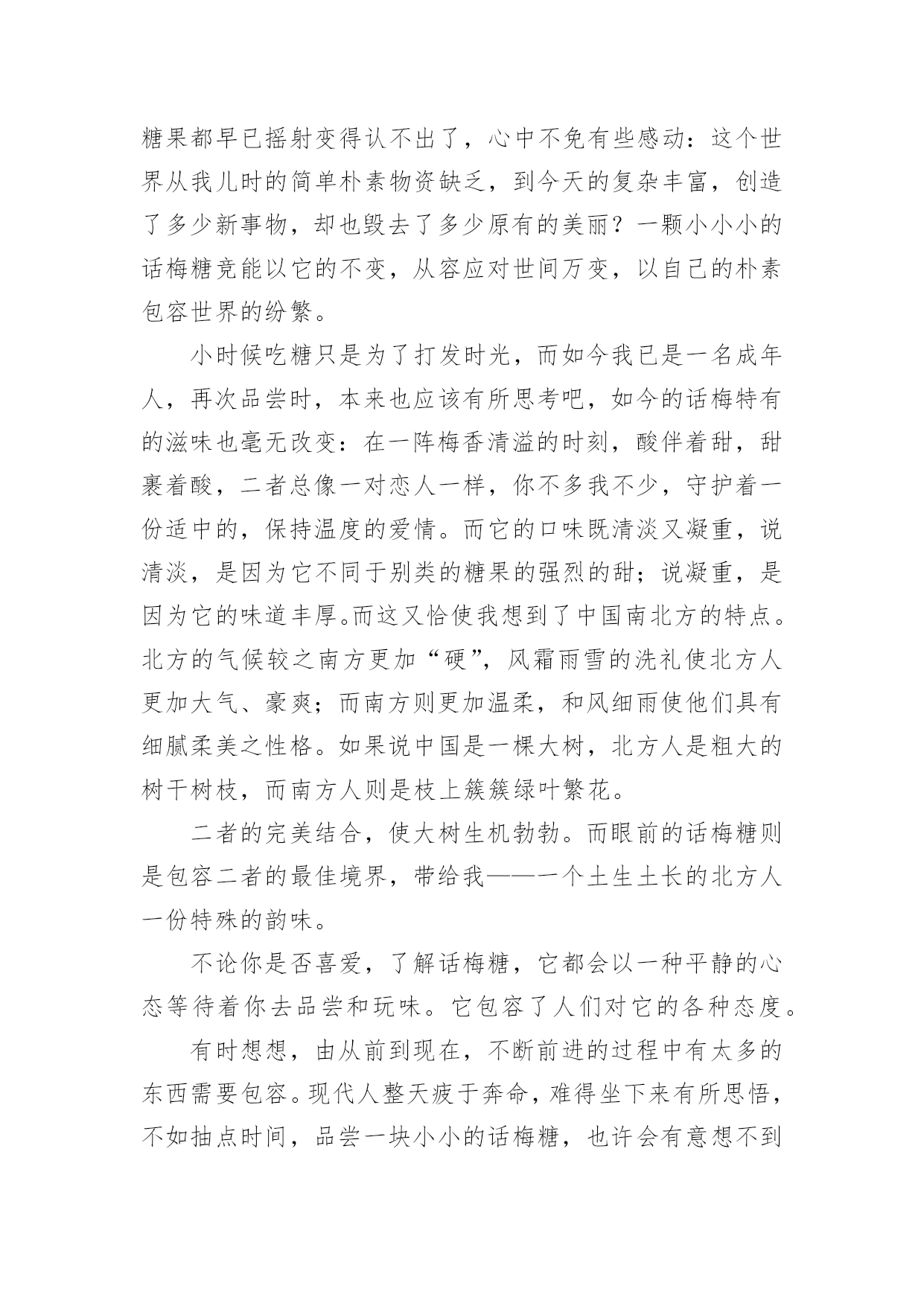 包容高考满分作文包容高考满分作文在平凡的学习、工作、生活中,大家都接触过作文吧,作文是人们以书面形式表情达意的言语活动。那么问题来了,到底应如何写一篇优秀的作文呢?以下是小编为大家整理的包容高考满分作文,仅供参考,希望能够帮助到大家。自然可以包容天地与川流,音乐可以包容爱与恨,人心可以包容幸福与痛苦--这是千百年来留传下来的。不变的真理。然而你是否想到,世间除以广博包容微小之外,微小也能包容广博?商店里,货架上有一种名为“话梅糖”的小小物品,也许能为我们带来一些启示。我也是一个偶然的机会才慢慢有所感悟的。买糖果的时候,看货架上五彩缤纷的“花花公子”在用他们美丽的外表招揽每一位过客,“乱花渐欲迷人眼”的诗句涌上心头,都把我的心也埋没在其中了,正当我犹豫不决选择哪一种时,陡然,一个被挤在角落里的身影吸引了我的目光,那深棕色的朴素外衣上分明画着一对简笔青梅图,旁边仅仅写着三个素静的字“话梅糖”,好熟悉的身影!我想:曾记得很小的时候就常用攒了几个月的零用钱却换几块朴素的糖来满足贪馋的小嘴。而十年过去了,如今,当我与话梅糖重逢的时候,却惊奇地发现:它的包装竞丝毫没有改变,让我在第一眼看到的时候就认出了老朋友,而我想起小时候那些其他的糖果都早已摇射变得认不出了,心中不免有些感动:这个世界从我儿时的简单朴素物资缺乏,到今天的复杂丰富,创造了多少新事物,却也毁去了多少原有的美丽?一颗小小小的话梅糖竞能以它的不变,从容应对世间万变,以自己的朴素包容世界的纷繁。小时候吃糖只是为了打发时光,而如今我已是一名成年人,再次品尝时,本来也应该有所思考吧,如今的话梅特有的滋味也毫无改变:在一阵梅香清溢的时刻,酸伴着甜,甜裹着酸,二者总像一对恋人一样,你不多我不少,守护着一份适中的,保持温度的爱情。而它的口味既清淡又凝重,说清淡,是因为它不同于别类的糖果的强烈的甜;说凝重,是因为它的味道丰厚。而这又恰使我想到了中国南北方的特点。北方的气候较之南方更加“硬”,风霜雨雪的洗礼使北方人更加大气、豪爽;而南方则更加温柔,和风细雨使他们具有细腻柔美之性格。如果说中国是一棵大树,北方人是粗大的树干树枝,而南方人则是枝上簇簇绿叶繁花。二者的完美结合,使大树生机勃勃。而眼前的话梅糖则是包容二者的最佳境界,带给我——一个土生土长的北方人一份特殊的韵味。不论你是否喜爱,了解话梅糖,它都会以一种平静的心态等待着你去品尝和玩味。它包容了人们对它的各种态度。有时想想,由从前到现在,不断前进的过程中有太多的东西需要包容。现代人整天疲于奔命,难得坐下来有所思悟,不如抽点时间,品尝一块小小的话梅糖,也许会有意想不到的收获。