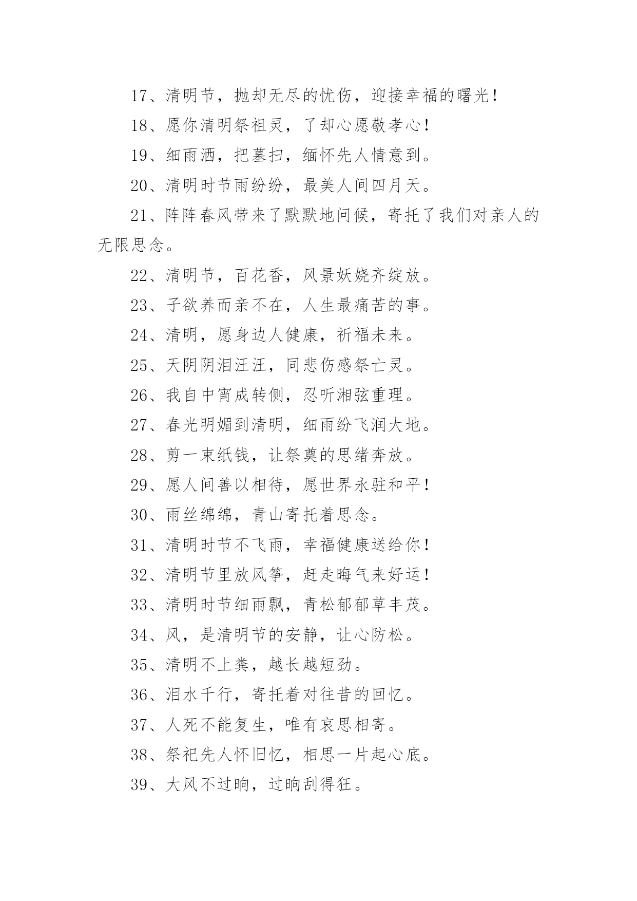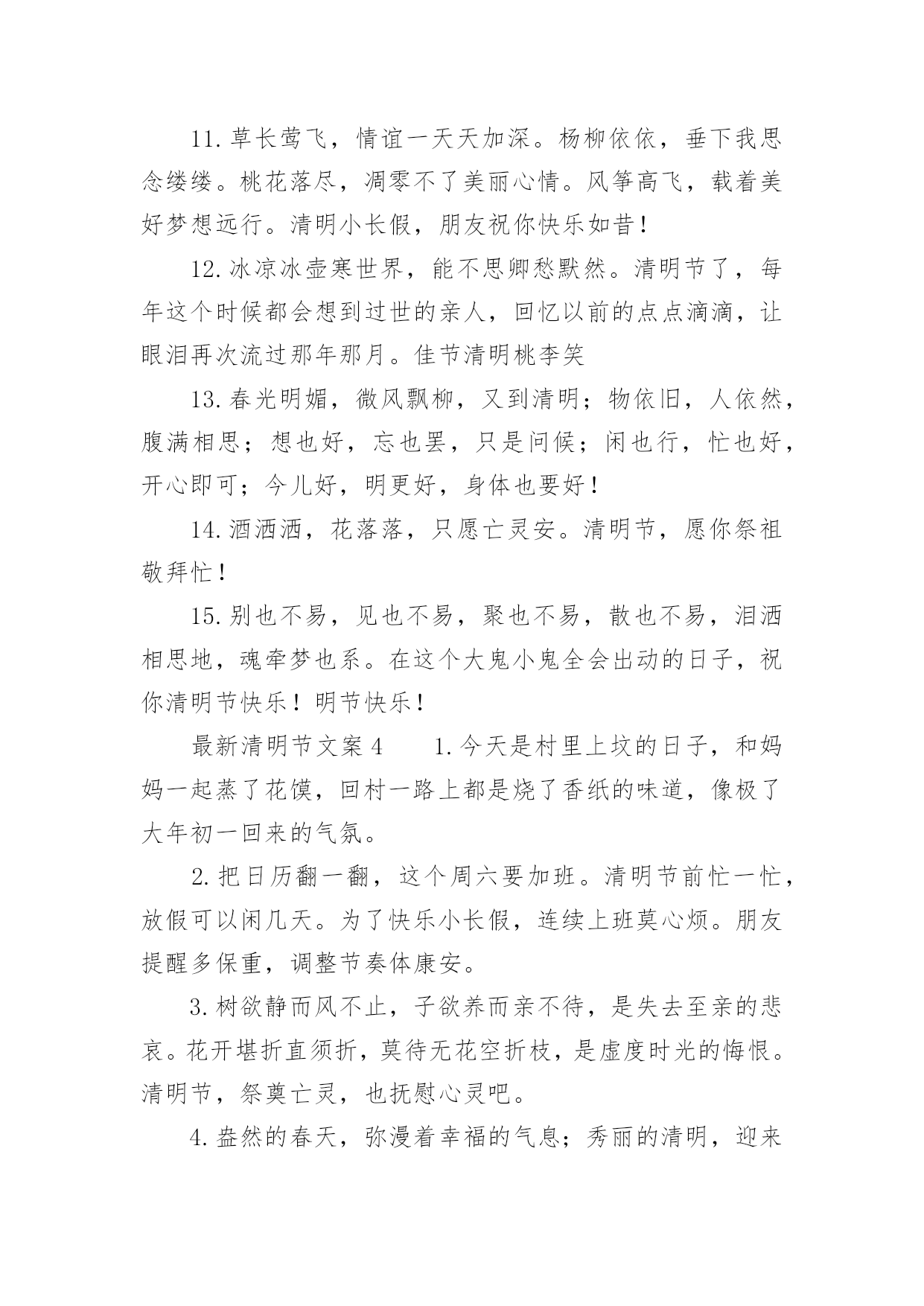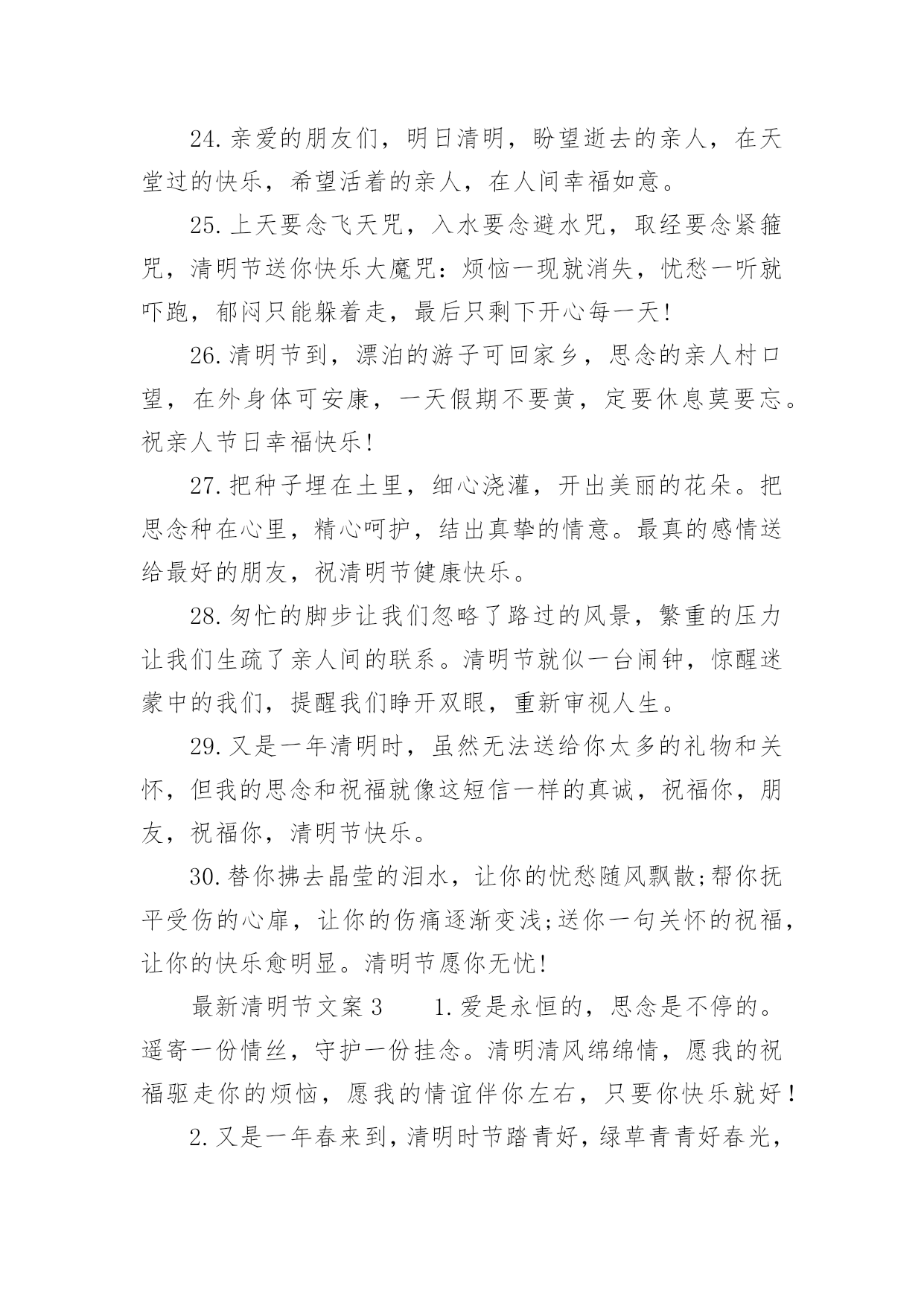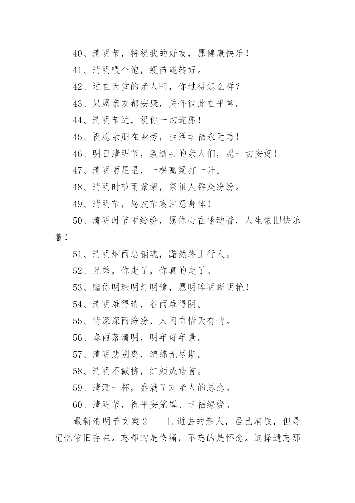 最新清明节文案最新清明节文案(精选120句)在我们平凡的日常里,越来越多人钟情于在社交平台上发布文案,文案用以展现自己对生活的热爱。还苦于找不到好的文案?以下是小编帮大家整理的最新清明节文案,欢迎大家分享。最新清明节文案11、今夜星繁又明亮,明天风小好太阳。2、赠你清水清石清天,愿清声清气清韵。3、清明小长假,祝你健康快乐!4、菊花一朵,包裹着对逝者的牵挂。5、清明节送上祝福,祝生活永远美满!6、烟袅袅雾蒙蒙,天国归宿自由行。7、清明天气难预料,三天小假美滋滋。8、愿你清明舒心畅,美满生活似花绽!9、雨打清明前,洼地好种田。10、清明时节雨纷纷,回家祭祖情意长。11、雨淋坟头钱,春苗出齐全。12、点一盏灯,愿天堂的父亲不再孤冷!13、清明节,淡化忧伤的侵扰,叙叙情。14、麦吃两年土,只怕清明饿了肚。15、春雷日日阴,半晴半雨到清明。16、清明到,柳枝笑,春风吹来笑弯腰。17、清明节,抛却无尽的忧伤,迎接幸福的曙光!18、愿你清明祭祖灵,了却心愿敬孝心!19、细雨洒,把墓扫,缅怀先人情意到。20、清明时节雨纷纷,最美人间四月天。21、阵阵春风带来了默默地问候,寄托了我们对亲人的无限思念。22、清明节,百花香,风景妖娆齐绽放。23、子欲养而亲不在,人生最痛苦的事。24、清明,愿身边人健康,祈福未来。25、天阴阴泪汪汪,同悲伤感祭亡灵。26、我自中宵成转侧,忍听湘弦重理。27、春光明媚到清明,细雨纷飞润大地。28、剪一束纸钱,让祭奠的思绪奔放。29、愿人间善以相待,愿世界永驻和平!30、雨丝绵绵,青山寄托着思念。31、清明时节不飞雨,幸福健康送给你!32、清明节里放风筝,赶走晦气来好运!33、清明时节细雨飘,青松郁郁草丰茂。34、风,是清明节的安静,让心防松。35、清明不上粪,越长越短劲。36、泪水千行,寄托着对往昔的回忆。37、人死不能复生,唯有哀思相寄。38、祭祀先人怀旧忆,相思一片起心底。39、大风不过晌,过晌刮得狂。40、清明节,特祝我的好友,愿健康快乐!41、清明喂个饱,瘦苗能转好。42、远在天堂的亲人啊,你过得怎么样?43、只愿亲友都安康,关怀彼此在平常。44、清明节近,祝你一切遂愿!45、祝愿亲朋在身旁,生活幸福永无恙!46、明日清明节,致逝去的亲人们,愿一切安好!47、清明雨星星,一棵高粱打一升。48、清明时节雨蒙蒙,祭祖人群众纷纷。49、清明节,愿友节哀注意身体!50、清明时节雨纷纷,愿你心在悸动着,人生依旧快乐着!51、清明烟雨总销魂,黯然路上行人。52、兄弟,你走了,你真的走了。53、赠你明珠明灯明镜,愿明眸明晰明艳!54、清明难得晴,谷雨难得阴。55、情深深雨纷纷,人间有情天有情。56、春雨落清明,明年好年景。57、清明悲别离,绵绵无尽期。58、清明不戴柳,红颜成皓首。59、清酒一杯,盛满了对亲人的思念。60、清明节,祝平安笼罩、幸福缭绕。最新清明节文案21.逝去的亲人,虽已消散,但是记忆依旧存在。忘却的是伤痛,不忘的是怀念。选择遗忘那伤心的种种,对你的思念永存心头。清明节来临,愿你忘却烦恼无忧愁。2.过多的安慰无法拂去你的泪水,过多的短信也不能抚平你受伤的心扉。我只想轻轻地对你说:清明节到了!远方的我永远在你身边祝福你、支持你。年清明节祝福语3.为你擦干满脸的泪花,让你忧愁随风飘散,帮你抚平受伤的心灵,让快乐幸福逐渐好转,发条祝福短信送关怀,让你幸福+健康+快乐,清明节愿你无忧无虑无烦恼。4.扬起我们的微笑,祭奠过往的苦难,用一颗坚强的心,迎接生活的美好,珍惜我们拥有的,不抱怨,不放弃,清明节到了,跟我们颓废的过去告别,迎接新的明天。5.生命中,总会有人缺席;曾经拥有的,原来轻若尘埃;幸福很脆弱,每个人只是站在中转站;把过去一页轻翻,幸福只跟自己有关。清明节近,祝你一切遂愿!清明节短信贺语6.清明春光多美丽,桃李芳菲醉心底。欣赏美景虽惬意,游玩踏青需注意。花粉过敏应提防,穿戴轻便要适当。量力而行选近郊,防晒保健要做好。愿你踏青多欢笑,幸福生活无限妙。7.清明节到了,祭奠先祖去扫墓,诚心缅怀深深把情意诉;人生之路莫停步,勇敢向前大踏步。清明节,祝幸福快乐来相伴,平安如意吉祥罩。8.清明时节到,养生要做好。饮食有规律,合理食五谷。天气仍多变,保暖需防寒。心情要舒畅,血压才能将。户外去春游,轻松无忧愁。愿友身康健,春来福绵绵。9.清明小小三天假,幸福天天来拥抱:烦恼连连道永别,忙碌匆匆说再见,微笑点点来蔓延,轻松悄悄时刻见,健康日日难逃离,快乐天天来签到。清明小长假,祝君健康快乐喜呵呵!10.清明时节花开放,细雨纷纷柳丝扬。风雨无阻祭祖先,无限悲伤泪两行。纸钱飞舞空中扬,清酒一杯诉衷肠。声声问候天国传,生活是否都安康。双手合十心祈愿,但愿亲人都无恙!11.清明节到了,送个清明果,让你忧愁消去乐逍遥;送片柳叶飞