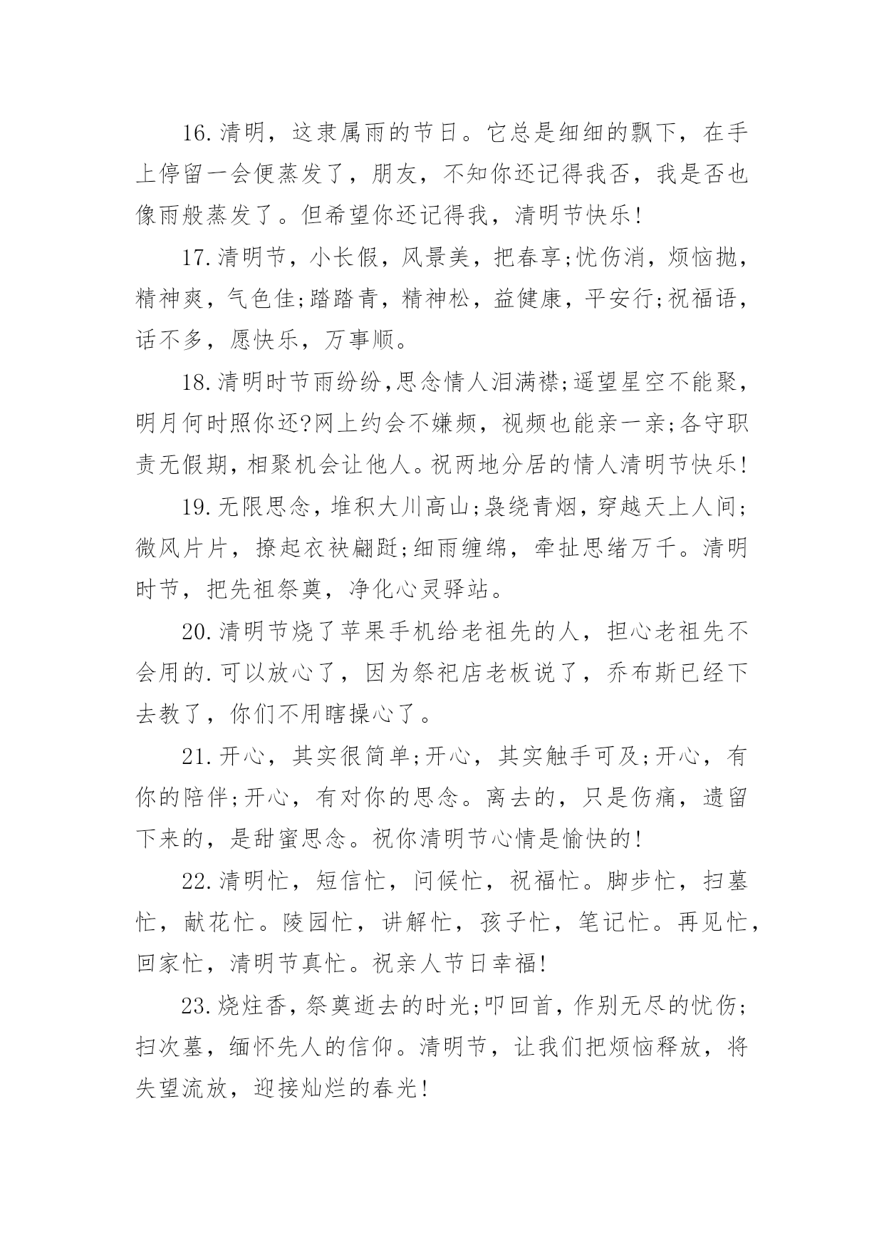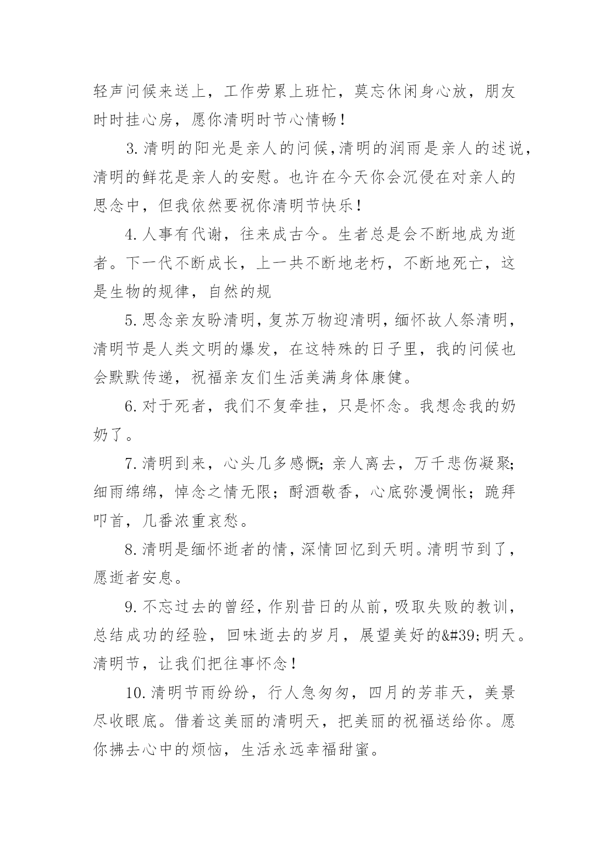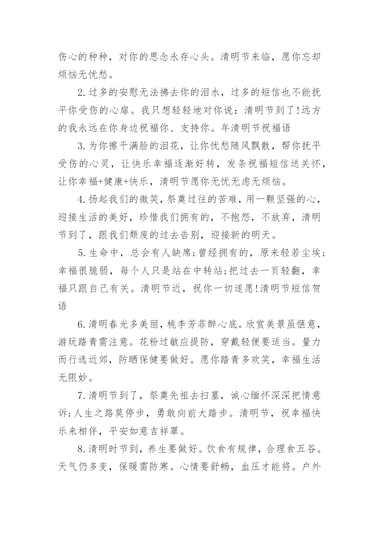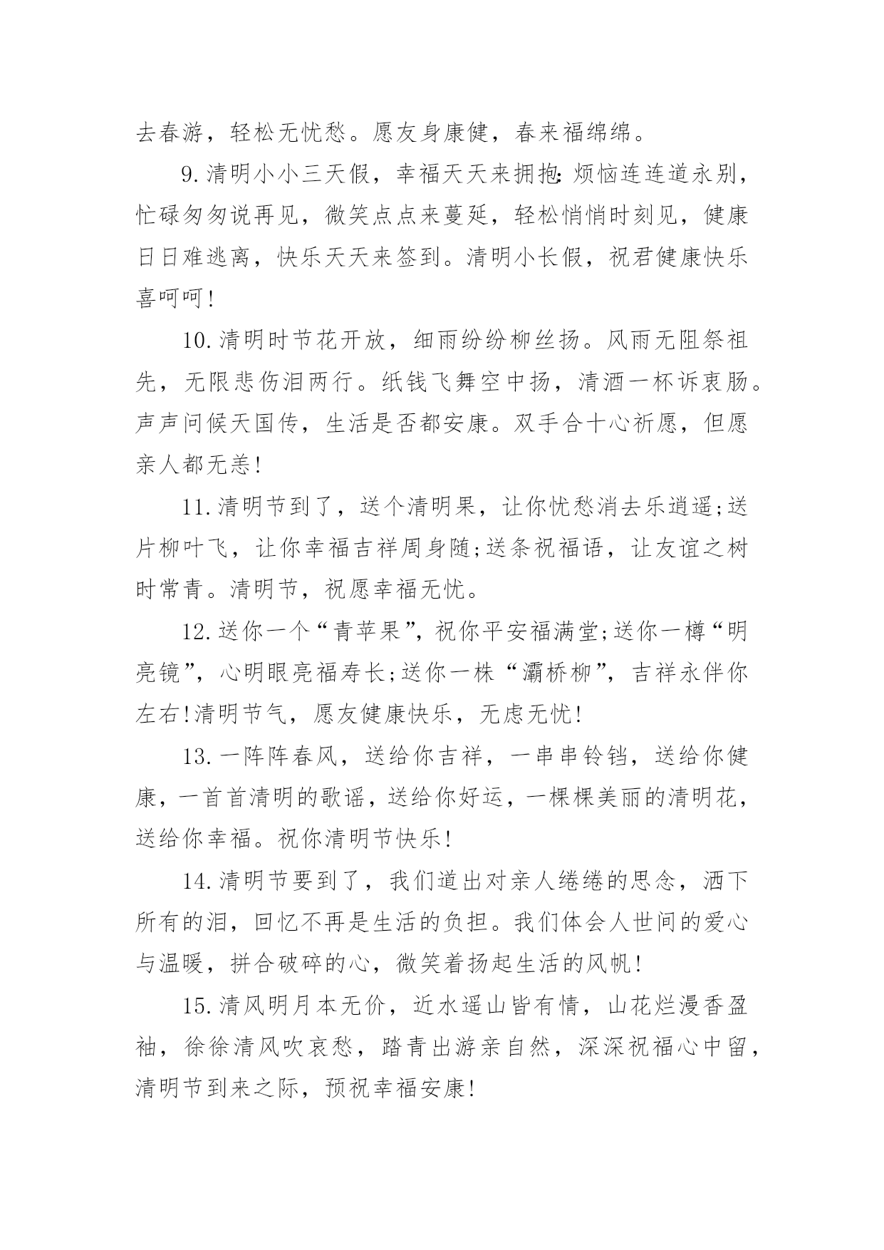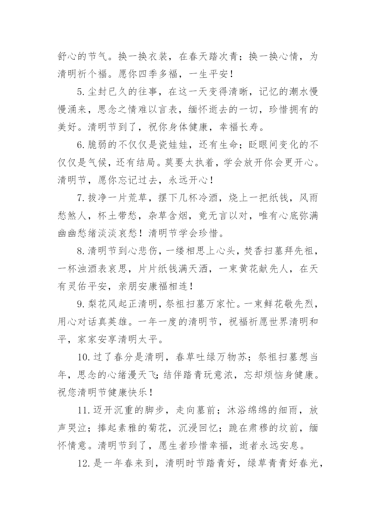 最新清明节文案最新清明节文案(精选120句)在我们平凡的日常里,越来越多人钟情于在社交平台上发布文案,文案用以展现自己对生活的热爱。还苦于找不到好的文案?以下是小编帮大家整理的最新清明节文案,欢迎大家分享。最新清明节文案11、今夜星繁又明亮,明天风小好太阳。2、赠你清水清石清天,愿清声清气清韵。3、清明小长假,祝你健康快乐!4、菊花一朵,包裹着对逝者的牵挂。5、清明节送上祝福,祝生活永远美满!6、烟袅袅雾蒙蒙,天国归宿自由行。7、清明天气难预料,三天小假美滋滋。8、愿你清明舒心畅,美满生活似花绽!9、雨打清明前,洼地好种田。10、清明时节雨纷纷,回家祭祖情意长。11、雨淋坟头钱,春苗出齐全。12、点一盏灯,愿天堂的父亲不再孤冷!13、清明节,淡化忧伤的侵扰,叙叙情。14、麦吃两年土,只怕清明饿了肚。15、春雷日日阴,半晴半雨到清明。16、清明到,柳枝笑,春风吹来笑弯腰。17、清明节,抛却无尽的忧伤,迎接幸福的曙光!18、愿你清明祭祖灵,了却心愿敬孝心!19、细雨洒,把墓扫,缅怀先人情意到。20、清明时节雨纷纷,最美人间四月天。21、阵阵春风带来了默默地问候,寄托了我们对亲人的无限思念。22、清明节,百花香,风景妖娆齐绽放。23、子欲养而亲不在,人生最痛苦的事。24、清明,愿身边人健康,祈福未来。25、天阴阴泪汪汪,同悲伤感祭亡灵。26、我自中宵成转侧,忍听湘弦重理。27、春光明媚到清明,细雨纷飞润大地。28、剪一束纸钱,让祭奠的思绪奔放。29、愿人间善以相待,愿世界永驻和平!30、雨丝绵绵,青山寄托着思念。31、清明时节不飞雨,幸福健康送给你!32、清明节里放风筝,赶走晦气来好运!33、清明时节细雨飘,青松郁郁草丰茂。34、风,是清明节的安静,让心防松。35、清明不上粪,越长越短劲。36、泪水千行,寄托着对往昔的回忆。37、人死不能复生,唯有哀思相寄。38、祭祀先人怀旧忆,相思一片起心底。39、大风不过晌,过晌刮得狂。40、清明节,特祝我的好友,愿健康快乐!41、清明喂个饱,瘦苗能转好。42、远在天堂的亲人啊,你过得怎么样?43、只愿亲友都安康,关怀彼此在平常。44、清明节近,祝你一切遂愿!45、祝愿亲朋在身旁,生活幸福永无恙!46、明日清明节,致逝去的亲人们,愿一切安好!47、清明雨星星,一棵高粱打一升。48、清明时节雨蒙蒙,祭祖人群众纷纷。49、清明节,愿友节哀注意身体!50、清明时节雨纷纷,愿你心在悸动着,人生依旧快乐着!51、清明烟雨总销魂,黯然路上行人。52、兄弟,你走了,你真的走了。53、赠你明珠明灯明镜,愿明眸明晰明艳!54、清明难得晴,谷雨难得阴。55、情深深雨纷纷,人间有情天有情。56、春雨落清明,明年好年景。57、清明悲别离,绵绵无尽期。58、清明不戴柳,红颜成皓首。59、清酒一杯,盛满了对亲人的思念。60、清明节,祝平安笼罩、幸福缭绕。最新清明节文案21.逝去的亲人,虽已消散,但是记忆依旧存在。忘却的是伤痛,不忘的是怀念。选择遗忘那伤心的种种,对你的思念永存心头。清明节来临,愿你忘却烦恼无忧愁。2.过多的安慰无法拂去你的泪水,过多的短信也不能抚平你受伤的心扉。我只想轻轻地对你说:清明节到了!远方的我永远在你身边祝福你、支持你。年清明节祝福语3.为你擦干满脸的泪花,让你忧愁随风飘散,帮你抚平受伤的心灵,让快乐幸福逐渐好转,发条祝福短信送关怀,让你幸福+健康+快乐,清明节愿你无忧无虑无烦恼。4.扬起我们的微笑,祭奠过往的苦难,用一颗坚强的心,迎接生活的美好,珍惜我们拥有的,不抱怨,不放弃,清明节到了,跟我们颓废的过去告别,迎接新的明天。5.生命中,总会有人缺席;曾经拥有的,原来轻若尘埃;幸福很脆弱,每个人只是站在中转站;把过去一页轻翻,幸福只跟自己有关。清明节近,祝你一切遂愿!清明节短信贺语6.清明春光多美丽,桃李芳菲醉心底。欣赏美景虽惬意,游玩踏青需注意。花粉过敏应提防,穿戴轻便要适当。量力而行选近郊,防晒保健要做好。愿你踏青多欢笑,幸福生活无限妙。7.清明节到了,祭奠先祖去扫墓,诚心缅怀深深把情意诉;人生之路莫停步,勇敢向前大踏步。清明节,祝幸福快乐来相伴,平安如意吉祥罩。8.清明时节到,养生要做好。饮食有规律,合理食五谷。天气仍多变,保暖需防寒。心情要舒畅,血压才能将。户外去春游,轻松无忧愁。愿友身康健,春来福绵绵。9.清明小小三天假,幸福天天来拥抱:烦恼连连道永别,忙碌匆匆说再见,微笑点点来蔓延,轻松悄悄时刻见,健康日日难逃离,快乐天天来签到。清明小长假,祝君健康快乐喜呵呵!10.清明时节花开放,细雨纷纷柳丝扬。风雨无阻祭祖先,无限悲伤泪两行。纸钱飞舞空中扬,清酒一杯诉衷肠。声声问候天国传,生活是否都安康。双手合十心祈愿,但愿亲人都无恙!11.清明节到了,送个清明果,让你忧愁消去乐逍遥;送片柳叶飞