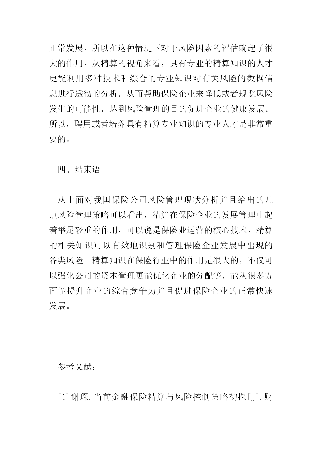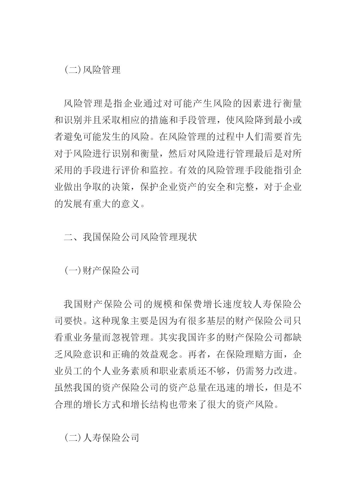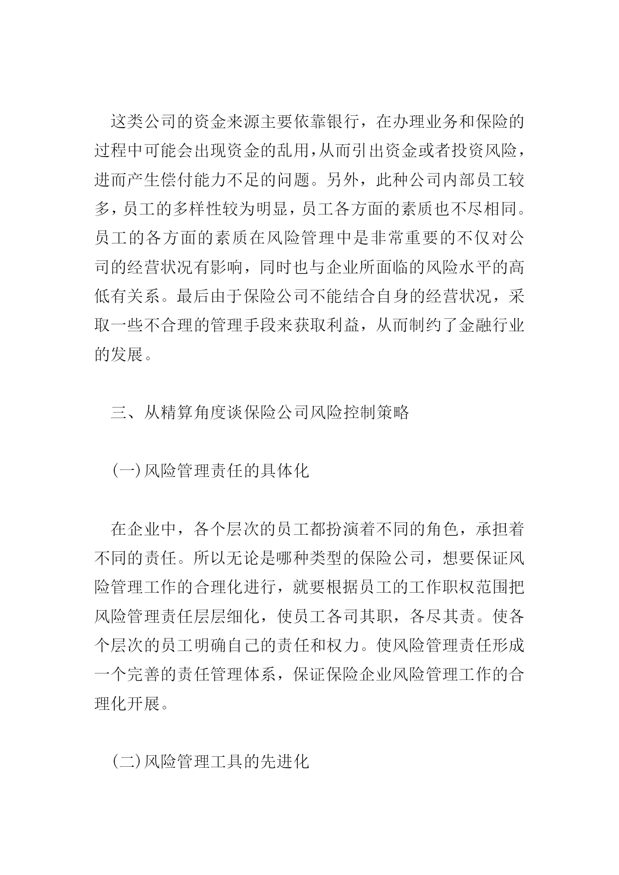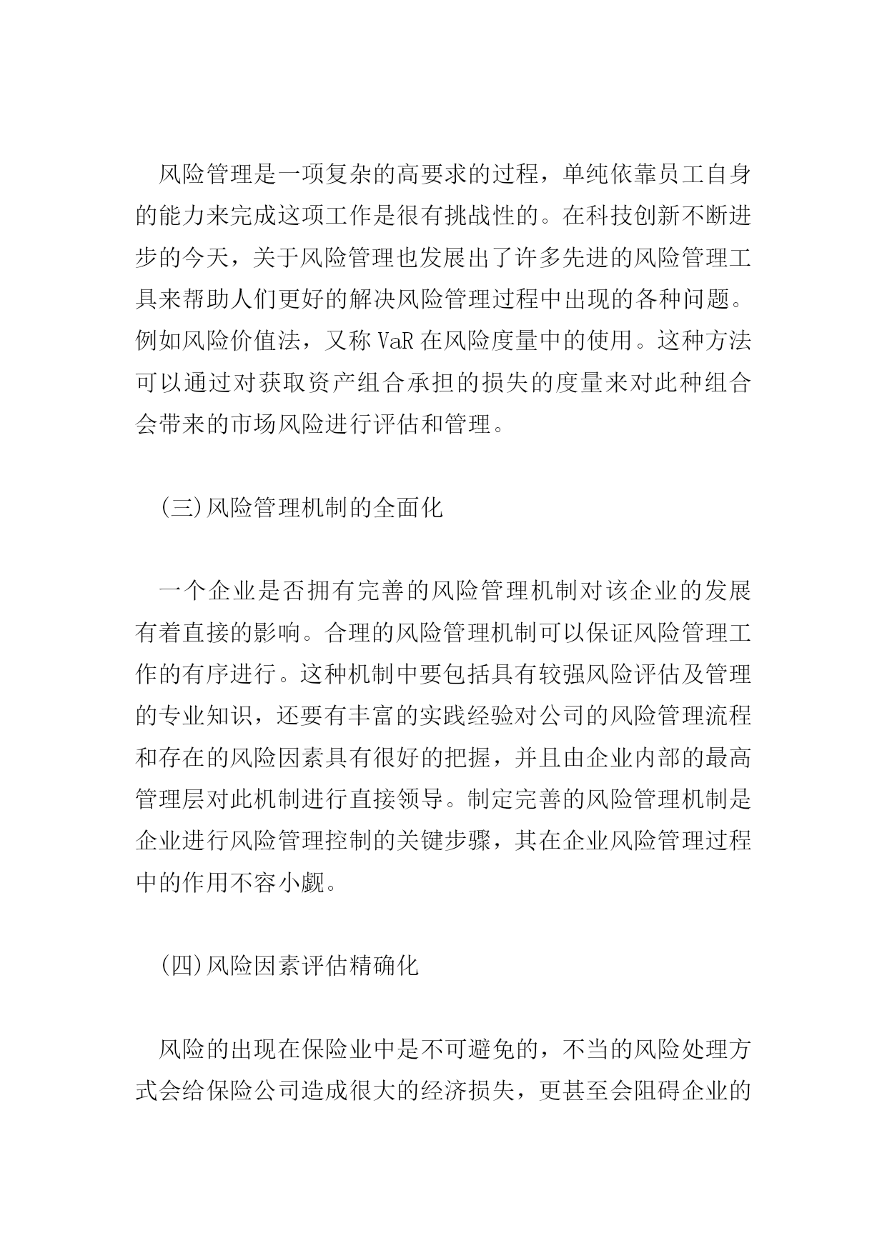 保险公司风险控制探讨保险公司风险控制探讨摘要:随着我国金融市场的发展与壮大,行业之间的竞争也不断增强。增强企业的综合竞争力是企业面临的最大问题。保险业的发展也是如此,在此情况下,保险公司可以通过提高风险管理的能力来增强自身的竞争力。保险精算是运用经济学原理,结合统计学、金融学等的科学方法对经济活动中的风险进行分析和估价管理的学科。所以从精算的视角来为保险公司提供风险管理策略是促进公司发展的有效途径。关键词:保险公司;精算;风险管理策略一、相关概念的阐释(一)精算理论哈雷制作的第一张生命表的产生标志着保险精算的诞生。保险精算在20世纪90年代初进入中国。在保险行业里保险精算被广泛的应用于保险产品、保险费率计算、准备金评估、保险金额和保险费率的修订、保险公司财务报表,精算报告、重大投资决策以及保险公司战略规划和发展计划这几个方面。对保险企业的发展做出了很大的贡献。(二)风险管理风险管理是指企业通过对可能产生风险的因素进行衡量和识别并且采取相应的措施和手段管理,使风险降到最小或者避免可能发生的风险。在风险管理的过程中人们需要首先对于风险进行识别和衡量,然后对风险进行管理最后是对所采用的手段进行评价和监控。有效的风险管理手段能指引企业做出争取的决策,保护企业资产的安全和完整,对于企业的发展有重大的意义。二、我国保险公司风险管理现状(一)财产保险公司我国财产保险公司的规模和保费增长速度较人寿保险公司要快。这种现象主要是因为有很多基层的财产保险公司只看重业务量而忽视管理。其实我国许多的财产保险公司都缺乏风险意识和正确的效益观念。再者,在保险理赔方面,企业员工的个人业务素质和职业素质还不够,仍需努力改进。虽然我国的资产保险公司的资产总量在迅速的增长,但是不合理的增长方式和增长结构也带来了很大的资产风险。(二)人寿保险公司这类公司的资金来源主要依靠银行,在办理业务和保险的过程中可能会出现资金的乱用,从而引出资金或者投资风险,进而产生偿付能力不足的问题。另外,此种公司内部员工较多,员工的多样性较为明显,员工各方面的素质也不尽相同。员工的各方面的素质在风险管理中是非常重要的不仅对公司的经营状况有影响,同时也与企业所面临的风险水平的高低有关系。最后由于保险公司不能结合自身的经营状况,采取一些不合理的管理手段来获取利益,从而制约了金融行业的发展。三、从精算角度谈保险公司风险控制策略(一)风险管理责任的具体化在企业中,各个层次的员工都扮演着不同的角色,承担着不同的责任。所以无论是哪种类型的保险公司,想要保证风险管理工作的合理化进行,就要根据员工的工作职权范围把风险管理责任层层细化,使员工各司其职,各尽其责。使各个层次的员工明确自己的责任和权力。使风险管理责任形成一个完善的责任管理体系,保证保险企业风险管理工作的合理化开展。(二)风险管理工具的先进化风险管理是一项复杂的高要求的过程,单纯依靠员工自身的能力来完成这项工作是很有挑战性的。在科技创新不断进步的今天,关于风险管理也发展出了许多先进的风险管理工具来帮助人们更好的解决风险管理过程中出现的各种问题。例如风险价值法,又称VaR在风险度量中的使用。这种方法可以通过对获取资产组合承担的损失的度量来对此种组合会带来的市场风险进行评估和管理。(三)风险管理机制的全面化一个企业是否拥有完善的风险管理机制对该企业的发展有着直接的影响。合理的风险管理机制可以保证风险管理工作的有序进行。这种机制中要包括具有较强风险评估及管理的专业知识,还要有丰富的实践经验对公司的风险管理流程和存在的风险因素具有很好的把握,并且由企业内部的最高管理层对此机制进行直接领导。制定完善的风险管理机制是企业进行风险管理控制的关键步骤,其在企业风险管理过程中的作用不容小觑。(四)风险因素评估精确化风险的出现在保险业中是不可避免的,不当的风险处理方式会给保险公司造成很大的经济损失,更甚至会阻碍企业的正常发展。所以在这种情况下对于风险因素的评估就起了很大的作用。从精算的视角来看,具有专业的精算知识的人才更能利用多种技术和综合的专业知识对有关风险的数据信息进行透彻的分析,从而帮助保险企业来降低或者规避风险发生的可能性,达到风险管理的目的促进企业的健康发展。所以,聘用或者培养具有精算专业知识的专业人才是非常重要的。四、结束语从上面对我国保险公司风险管理现状分析并且给出的几点风险管理策略可以看出,精算在保险企业的发展管理中起着举足轻重的作用,可以说是保险业运营的核心技术。精算的相关知识可以有效地识别和管理保险企业发展中出现的各类风险。精算知识在保险行业中的作用是很大的,