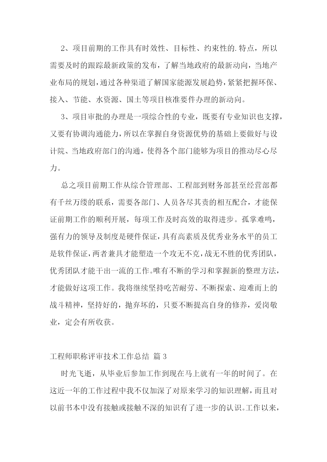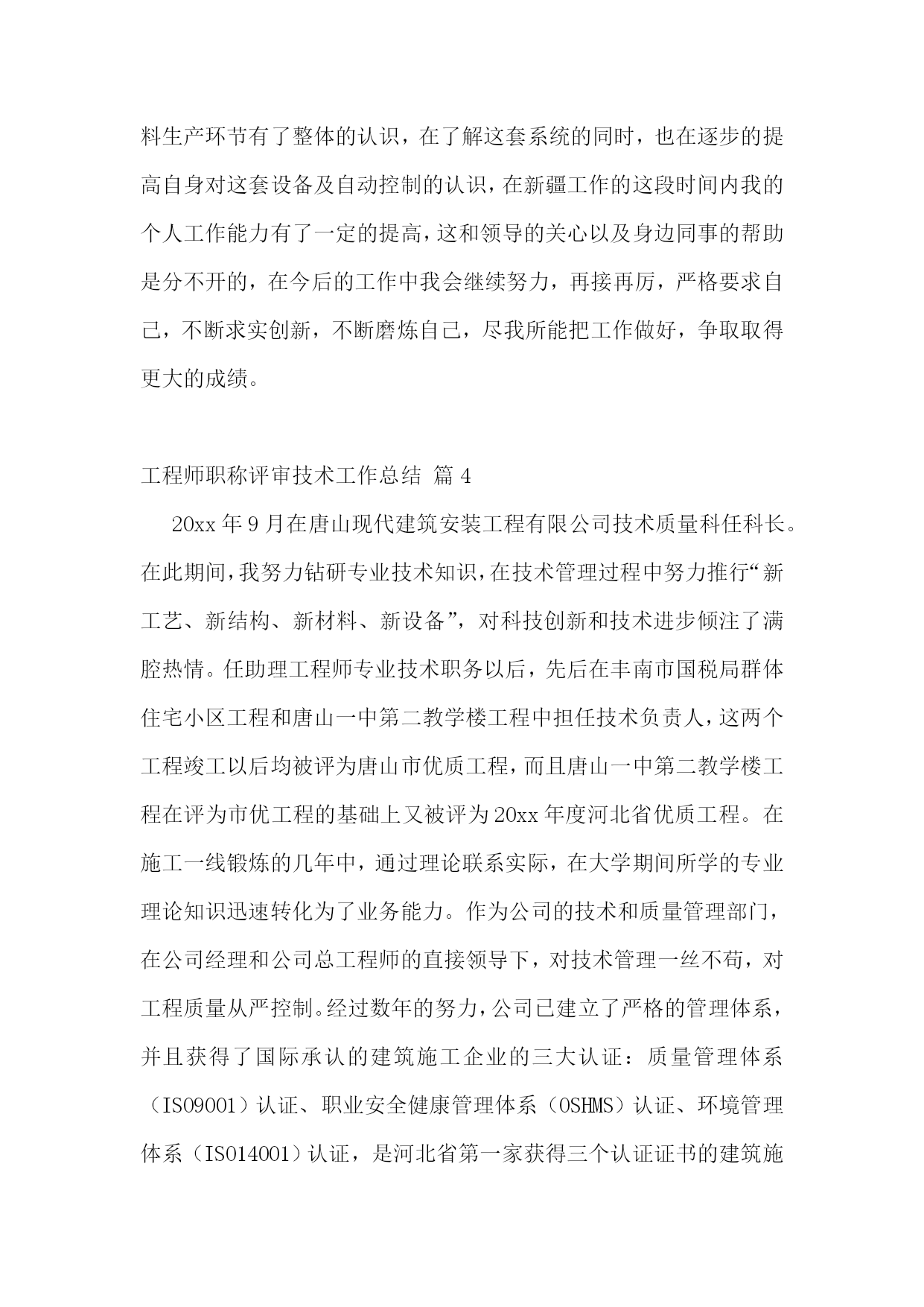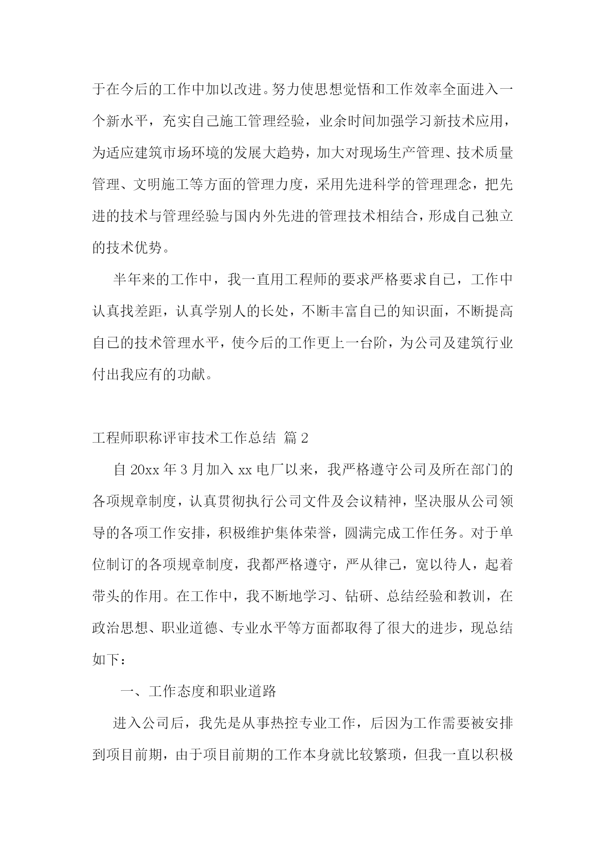 工程师职称评审技术工作总结14篇工程师职称评审技术工作总结篇1本人担任公司助理工程师以来,在工作中认真负责,能按时完成领导交给的各项工作任务。入司半年以来,公司领导及各位同事的支持与帮助下,按照公司要求,严格要求自己,较好地完成了自己的本职工作。通过在公司的学习和工作,我在专业技术上、思想上都有了较大的收获。现将本人上半年工作总结如下:一、专业知识、工作能力和具体工作从拿到图纸到图纸会审,认真的查看每一个部位细节,核对数据,思考施工步骤方案。做到脑中有图。组织图纸会审。协调交换与业主、设计、监理各方意见。进入工程开工,认真了解每一个部位施工细节,按设计图纸要求,严格编制本专业施工方案,对关键点编制作业指导书,监理单位确认后执行。同时在施工准备过程中对班组进行技术、安全交底,班组对所施工内容做到心中有数,按施工规范严格要求。施工过程中,做好班组自检、复检、专职检“三检”工作,同时做好分部分项质量检验评定记录、隐蔽记录及相关质保资料。严格控制原材料、半成品、成品材料应用于工程。刚入公司的时候,对民用建筑不太熟悉,对施工工艺实践不太熟悉,我就虚心的请教师傅,晚上的时间先看好图纸,并做好笔记;白天带着问题去看工人们如何施工,并不懂得请教施工员,很快我对施工工艺及图纸不再陌生,由不懂看图纸到拿到图纸能自已独立施工;并能在按图施工的基础上,还能够高效创新的完成施工任务并协调各种工序的配合。后来我开始担任xx装修工程的施工员,怎样合理组织各个班组完成施工任务是对我的一项考验。在工作中我不断在实践中探索并在这个工程施工保质保量并提前完成工作任务;并得建设方及公司领导致好评。主要工作有:施工前准备包括技术准备、材料准备、机具准备、场地准备、施工组织及人员准备;配合土建施工进度做好各项预留孔洞、管槽的复合工作;管道支架、支座的制作并进行防腐处理和妥善保管;管道系统液压试验合格后,进行管道清洗。并编好内业资料并组织验收。二、工作态度和勤奋敬业方面热爱自己的本职工作,能够正确认真的`对待每一项工作,全身心地投入工作,认真遵守公司的各项规章制度。有效利用工作时间,坚守岗位,需要加班完成工作按时加班加点,保证工作能按时完成。在现场跟工人打成一片,做到以理服人。三、工作质量成绩、效益和贡献在开展工作之前做好个人工作计划,有主次的先后及时的完成各项工作,达到预期的效果,保质保量的完成工作,工作效率高,同时在工作中学习了很多东西,也锻炼了自己,经过不懈的努力,使工作水平有了长足的进步,开创了工作的新局面,为公司工作做出了应有的贡献。尽管有了一定的进步和成绩,但在一些方面还存在着不足。比如有创造性的工作思路还不是很多,个别工作做的还不够完善,这有待于在今后的工作中加以改进。努力使思想觉悟和工作效率全面进入一个新水平,充实自己施工管理经验,业余时间加强学习新技术应用,为适应建筑市场环境的发展大趋势,加大对现场生产管理、技术质量管理、文明施工等方面的管理力度,采用先进科学的管理理念,把先进的技术与管理经验与国内外先进的管理技术相结合,形成自己独立的技术优势。半年来的工作中,我一直用工程师的要求严格要求自已,工作中认真找差距,认真学别人的长处,不断丰富自已的知识面,不断提高自已的技术管理水平,使今后的工作更上一台阶,为公司及建筑行业付出我应有的功献。工程师职称评审技术工作总结篇2自20xx年3月加入xx电厂以来,我严格遵守公司及所在部门的各项规章制度,认真贯彻执行公司文件及会议精神,坚决服从公司领导的各项工作安排,积极维护集体荣誉,圆满完成工作任务。对于单位制订的各项规章制度,我都严格遵守,严从律己,宽以待人,起着带头的作用。在工作中,我不断地学习、钻研、总结经验和教训,在政治思想、职业道德、专业水平等方面都取得了很大的进步,现总结如下:一、工作态度和职业道路进入公司后,我先是从事热控专业工作,后因为工作需要被安排到项目前期,由于项目前期的工作本身就比较繁琐,但我一直以积极工作态度去处理工作中遇到的事情,虽然偶尔会出现一些情绪问题,但我很快能够处理好自身问题,积极投入到工作中去,对工作勤勤恳恳、任劳任怨,有始有终,能够正确认真的对待每一项工作;认真学习公司的各项规章制度,认真遵守劳动纪律,保证按时出勤,对于再苦再累的工作,我都坚持圆满完成,并做出成效,从不计较个人得失,坚守在岗位上,完成一个个工作中的小里程碑,看着工作的顺利开展以及项目核准批复的取得,我心中感到无比地自豪和光荣,自己曾经付出的无数艰辛和汗水,得到了回报,我内心也就无怨无悔,心满意足了。二、学识水平、专业能力在工作中,我不断地学习文化知识和专业知识,努力提高自己的学识水平和专用能力。对于项目审批的新规范、新标准,我都及时去了解并认真学习和研究,掌握新规范、新标准,把
