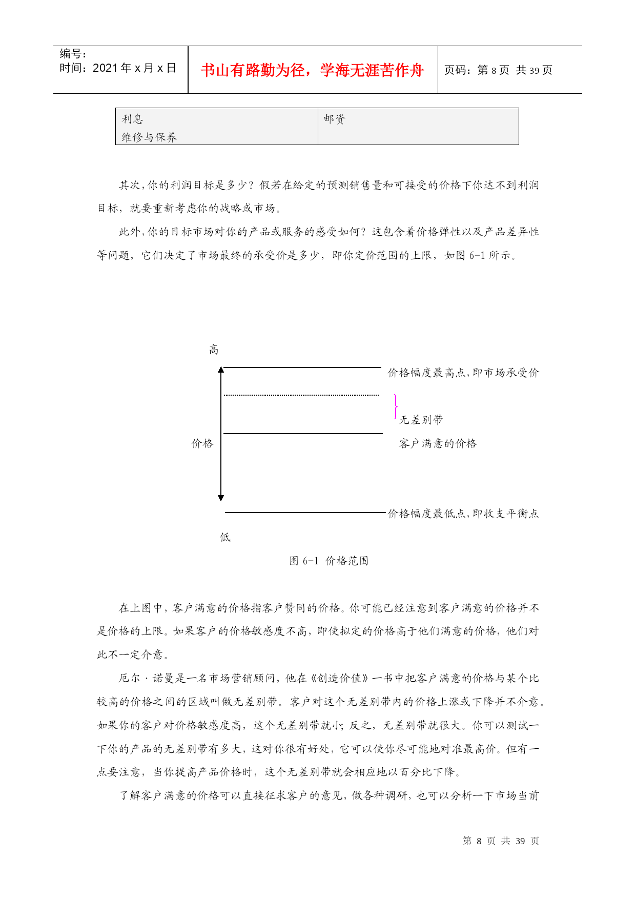 编号:时间:2021年x月x日书山有路勤为径,学海无涯苦作舟页码:第PAGE39页共NUMPAGES39页第PAGE\*MERGEFORMAT39页共NUMPAGES\*MERGEFORMAT39页如何定价与设计分销渠道导言真正的问题所在是价值,而不是价格。——罗伯特·林格伦中间商不属于由制造商所铸成的锁链中被雇用的一个环节,而是一个独立的市场,并成了为一大群客户购买的焦点。——菲利普·麦克威在营销组合中,价格是唯一能产生收入的因素,其它因素则表现为成本。价格也是营销组合中最灵活的因素,它与产品和渠道不同,其变化异常迅速。价格与价格竞争是公司所面临的首要问题。为产品定价是商业中令人感到头痛的问题。价格是你的利益的体现,也是客户对你所做的一切努力的应有回报。在定价时,你必须确保你的公司得到应有的利益。没有人会付给你高于你的定价的价钱,因此,你不要定低了价格。营销活动的关键是:让客户心甘情愿地、快速地为你的产品或服务付费。本课件主要探讨以下内容:从客户的立场上如何看待产品的价格?定价时要考虑的主要因素有哪些?价格制定的过程,对价格的修订以及对价格变动所要采取的措施;分销渠道的结构和设计分销渠道的作用及其相互关系分销渠道的政策分销渠道的管理市场后勤客户如何看待你产品的价格?客户在评价价格时通常会考虑下列因素:以前使用你的产品和竞争者的产品的经验;从朋友、同事及其他人那里得到关于你的公司和产品声誉的口头传播信息;通过对产品和品牌的比较所得到的信息;公司的整体形象和服务质量;附加在主要产品上的附加品或服务的价值;其它方面。客户如何看得你的产品或服务的价格这对你很重要,你必须弄清楚他们对价格变化的反应灵敏程度是怎样的。对价格变化的灵敏度叫做“价格弹性”,价格的微小上升导致销售量的巨大下降,表明价格是弹性的;相反,价格的大幅度提升只引起微不足道的销售下降,表明价格是非弹性的。阅读材料===价格弹性测试说明:在你认为正确的问题前的方框内打上“∨”价格在意料之中吗?如果你在别人意料到的范围内变动价格,那么客户的价格敏感度就不会高;反之,则完全不同。产品价格与实际价值相匹配吗?有些产品是独一无二的,客户自己也知道很难找到更便宜的替代品。这时,他们对产品价格的敏感度就会降低。产品是急需的吗?如果是急需的产品或服务,价格就不重要;相反,客户的价格敏感度就会高。你的产品有替代品吗?如果客户购买你的产品时,没有其它可供选择的替代品,价格敏感度就低。只有在所购产品由不同价格替代品的情况下,客户购物时才会考虑价格。客户是否不知道其它替代品?客户不了解的东西,价格敏感度就低;客户难以对产品做出比较吗?有时,客户很难对某些产品进行比较,做出选择。产品是否令客户感觉到便宜?客户想买高价值的产品时,并不太在意价钱。然而,一到真正购买时,他们就心痛了。如果一件产品的价格属于高档价位,那么即使它的价格定得已经很低了,仍会被客户认为非常贵。例如,你购买一部价格高、性能好的便携式电脑时的价格敏感度肯定比购买一台普通台式电脑时的价格敏感度高。你打的“∨”越多,说明你的客户价格敏感度越低,即使你提高了价格也不会太影响产品的销售量。许多公司在定价时陷入了所谓的“低价误区”。他们以为只要把价格定得低一些,销售量就会增加。虽然降价促销是很有效的一种策略,但并不都是这样。有时客户可能不像你担心的那样对价格非常敏感,他们有可能认为价格是质量的标志,如果你过分压低你的产品的价格,反倒会引起他们对你的产品的怀疑。同时,降价的结果也会导致公司利润的下降,使你白白丧失了本来应得的利益。价格并不是客户选择你的产品或服务时唯一考量因素。你完全可以参考其它选择,比如建立品牌信誉、提高产品质量、采取声望定价或利用时间、地点优势,创造额外价值来吸引客户。要经常同你的客户接触,观察了解他们对你的产品价格的反应。另外,公司对产品的定价,必须与希望建立的公司形象保持一致。客户通常会把产品或服务的价格与诸如质量等因素直接联系起来。高质量的产品加上低价格等于低质量的产品形象。如果你为一种产品定了高价,必须:确保广告和其它促销信息强调质量的产品形象;通过与客户沟通并强调公司的经验、业绩或声誉,来解释你的价格为什么高;不断地监督产品或服务的质量。如果客户付了高价,你最好能超出他们的期望;如果你为一种产品定了低价,必须:·确保营销组合的其它因素(产品质量、品牌、包装、渠道及广告等)支持你的低价形象;·提供真正的价值(客户不想得到低质量的产品,即使他们付了低价);·在广告中解释你的公司为什么能制定如此低的价格;·监督产品或服务的质量,质量至少应等于客户的期望,这样你就可以保持它们对公司的信