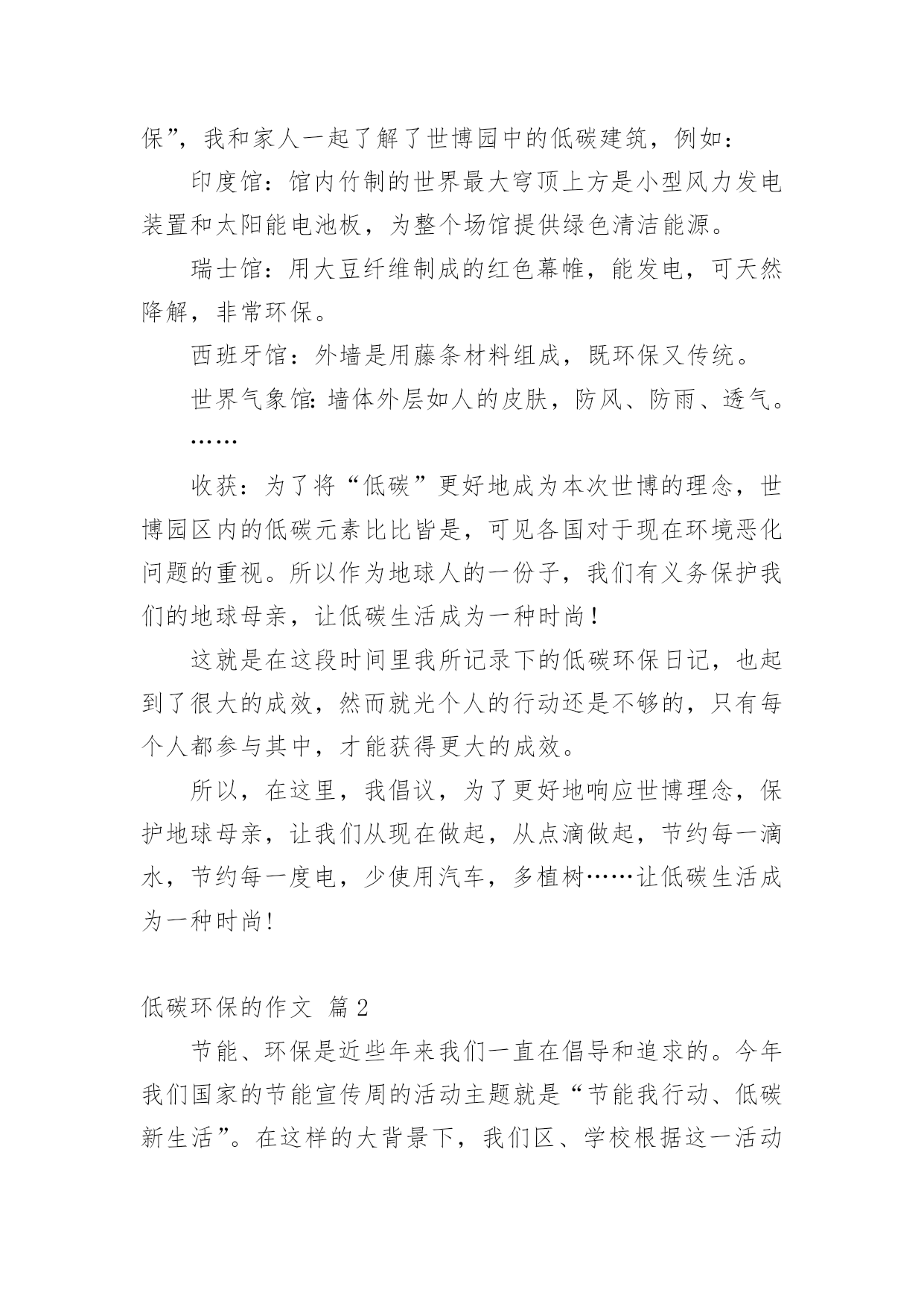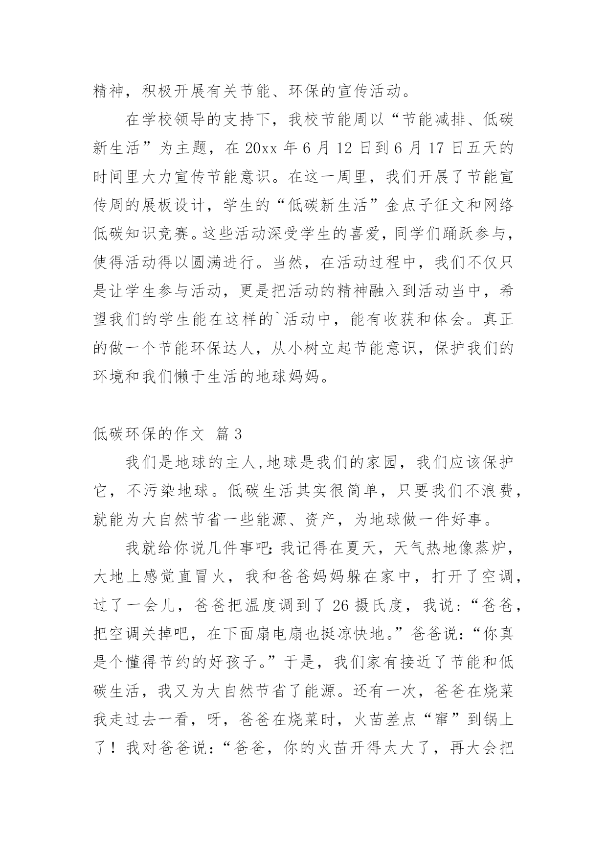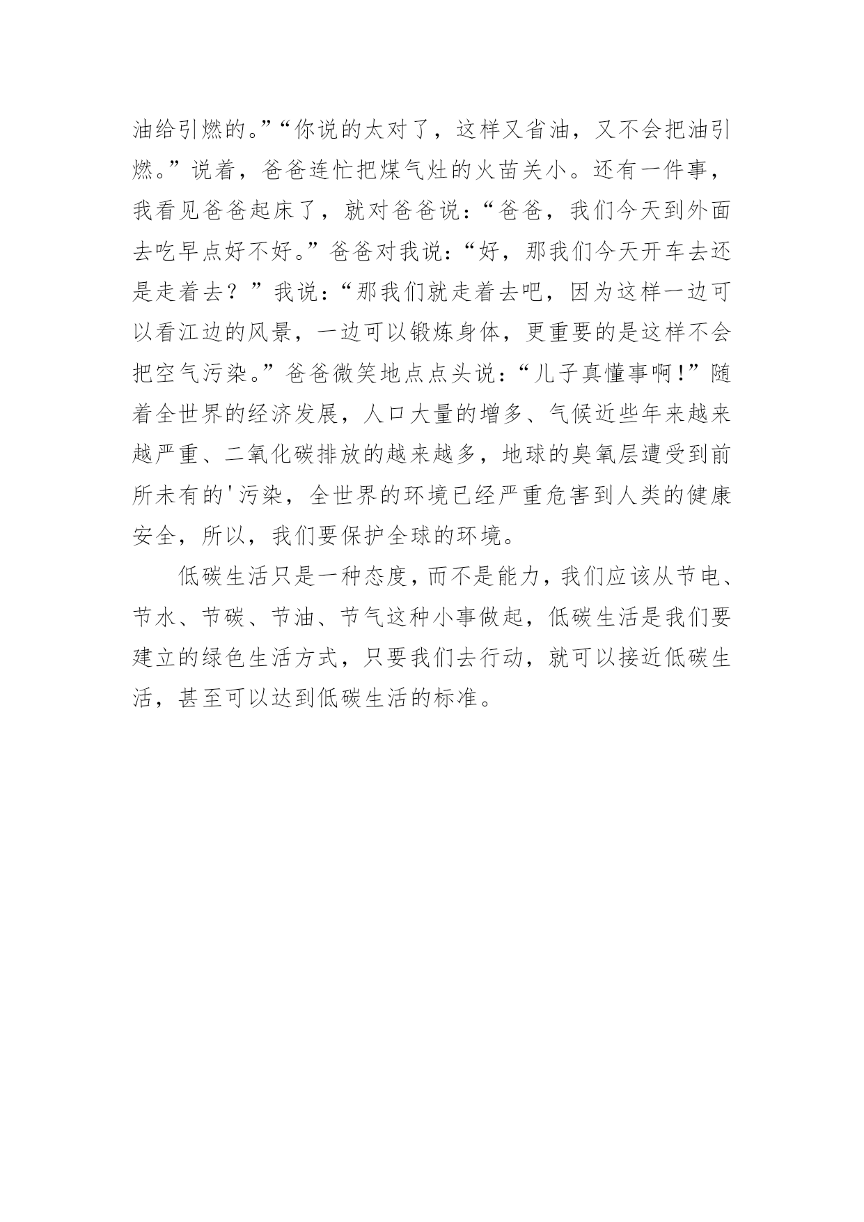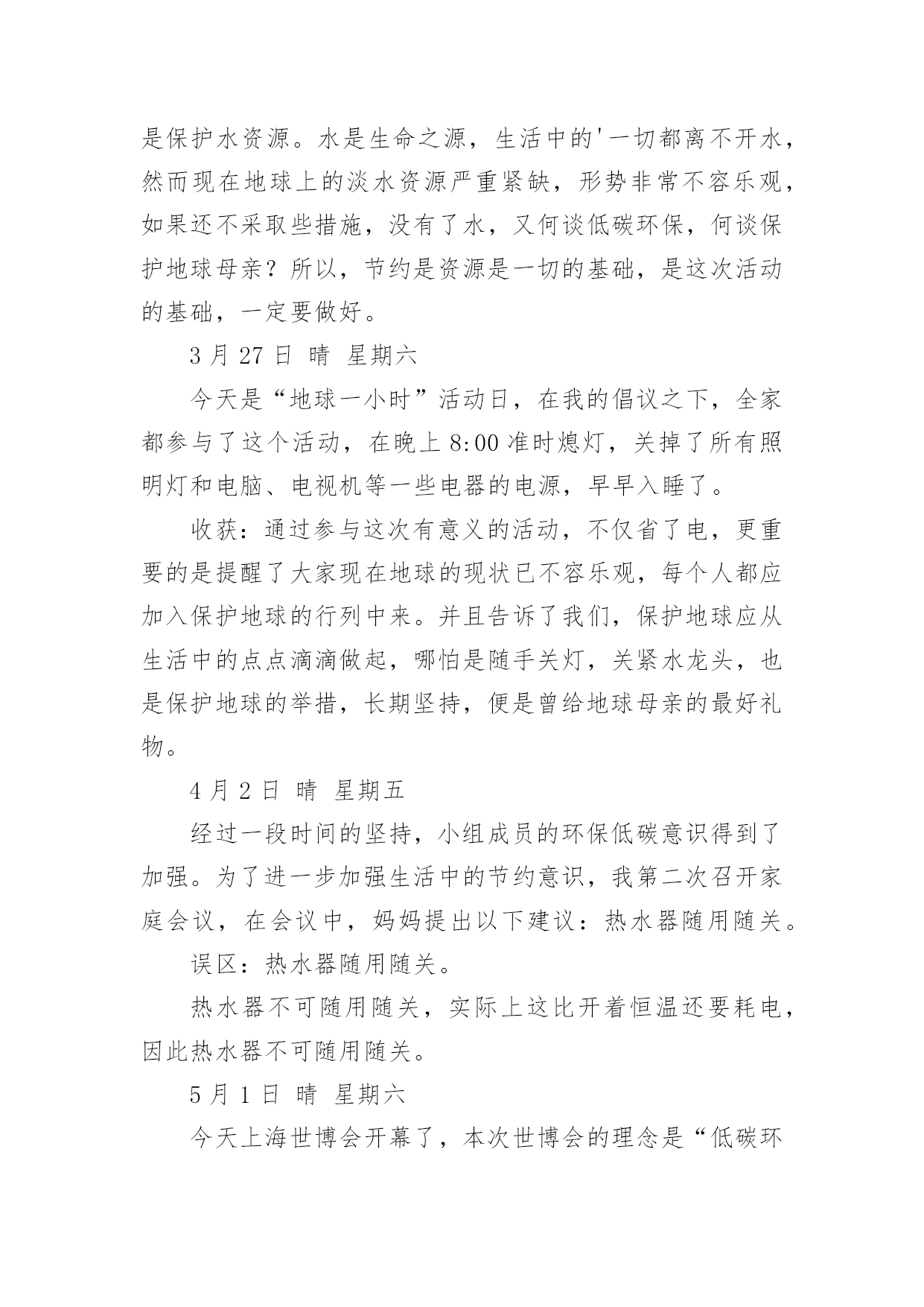 低碳环保的作文低碳环保的作文(集合)在现实生活或工作学习中,大家都不可避免地要接触到作文吧,作文可分为小学作文、中学作文、大学作文(论文)。怎么写作文才能避免踩雷呢?以下是小编帮大家整理的低碳环保的作文3篇,供大家参考借鉴,希望可以帮助到有需要的朋友。低碳环保的作文篇121世纪的今天,各国纷纷加快进入“低碳环保新时代”的步伐。作为世界公民,我当然也不例外,在家成立了一个低碳环保生活小组,我也正式成为这个小组的组长,负责督促各家庭成员,从生活中的点滴做起,走出误区,身体力行。接下来,就请大家来看看我们的行动和收获吧!3月22日雨星期一今天是世界水日,为了做到节水,我在家召开了家庭会议,制定了一系列节水计划,例如洗菜、淘米、洗澡水的二次利用等,并同家人上网了解了一些基本的节水常识。一旁的爷爷看了嘟哝着:“不就是为了电水费吗?这么麻烦!这点水费我包了还不行吗?”误区:“不就是为了电水费吗?这么麻烦!这点水费我包了还不行吗?”这句话犯了认识上的错误,节水并非为了节省水费,而是保护水资源。水是生命之源,生活中的'一切都离不开水,然而现在地球上的淡水资源严重紧缺,形势非常不容乐观,如果还不采取些措施,没有了水,又何谈低碳环保,何谈保护地球母亲?所以,节约是资源是一切的基础,是这次活动的基础,一定要做好。3月27日晴星期六今天是“地球一小时”活动日,在我的倡议之下,全家都参与了这个活动,在晚上8:00准时熄灯,关掉了所有照明灯和电脑、电视机等一些电器的电源,早早入睡了。收获:通过参与这次有意义的活动,不仅省了电,更重要的是提醒了大家现在地球的现状已不容乐观,每个人都应加入保护地球的行列中来。并且告诉了我们,保护地球应从生活中的点点滴滴做起,哪怕是随手关灯,关紧水龙头,也是保护地球的举措,长期坚持,便是曾给地球母亲的最好礼物。4月2日晴星期五经过一段时间的坚持,小组成员的环保低碳意识得到了加强。为了进一步加强生活中的节约意识,我第二次召开家庭会议,在会议中,妈妈提出以下建议:热水器随用随关。误区:热水器随用随关。热水器不可随用随关,实际上这比开着恒温还要耗电,因此热水器不可随用随关。5月1日晴星期六今天上海世博会开幕了,本次世博会的理念是“低碳环保”,我和家人一起了解了世博园中的低碳建筑,例如:印度馆:馆内竹制的世界最大穹顶上方是小型风力发电装置和太阳能电池板,为整个场馆提供绿色清洁能源。瑞士馆:用大豆纤维制成的红色幕帷,能发电,可天然降解,非常环保。西班牙馆:外墙是用藤条材料组成,既环保又传统。世界气象馆:墙体外层如人的皮肤,防风、防雨、透气。……收获:为了将“低碳”更好地成为本次世博的理念,世博园区内的低碳元素比比皆是,可见各国对于现在环境恶化问题的重视。所以作为地球人的一份子,我们有义务保护我们的地球母亲,让低碳生活成为一种时尚!这就是在这段时间里我所记录下的低碳环保日记,也起到了很大的成效,然而就光个人的行动还是不够的,只有每个人都参与其中,才能获得更大的成效。所以,在这里,我倡议,为了更好地响应世博理念,保护地球母亲,让我们从现在做起,从点滴做起,节约每一滴水,节约每一度电,少使用汽车,多植树……让低碳生活成为一种时尚!低碳环保的作文篇2节能、环保是近些年来我们一直在倡导和追求的。今年我们国家的节能宣传周的活动主题就是“节能我行动、低碳新生活”。在这样的大背景下,我们区、学校根据这一活动精神,积极开展有关节能、环保的宣传活动。在学校领导的支持下,我校节能周以“节能减排、低碳新生活”为主题,在20xx年6月12日到6月17日五天的时间里大力宣传节能意识。在这一周里,我们开展了节能宣传周的展板设计,学生的“低碳新生活”金点子征文和网络低碳知识竞赛。这些活动深受学生的喜爱,同学们踊跃参与,使得活动得以圆满进行。当然,在活动过程中,我们不仅只是让学生参与活动,更是把活动的精神融入到活动当中,希望我们的学生能在这样的`活动中,能有收获和体会。真正的做一个节能环保达人,从小树立起节能意识,保护我们的环境和我们懒于生活的地球妈妈。低碳环保的作文篇3我们是地球的主人,地球是我们的家园,我们应该保护它,不污染地球。低碳生活其实很简单,只要我们不浪费,就能为大自然节省一些能源、资产,为地球做一件好事。我就给你说几件事吧:我记得在夏天,天气热地像蒸炉,大地上感觉直冒火,我和爸爸妈妈躲在家中,打开了空调,过了一会儿,爸爸把温度调到了26摄氏度,我说:“爸爸,把空调关掉吧,在下面扇电扇也挺凉快地。”爸爸说:“你真是个懂得节约的好孩子。”于是,我们家有接近了节能和低碳生活,我又为大自然节省了能源。还有一次,爸爸在烧菜我走过去一看,呀,爸爸在烧菜时,火苗差点“窜”到锅上了!我对爸爸说:“爸爸,你的火苗开得太大了,再大会把油给引燃的。”“你说的太对了,这样又省