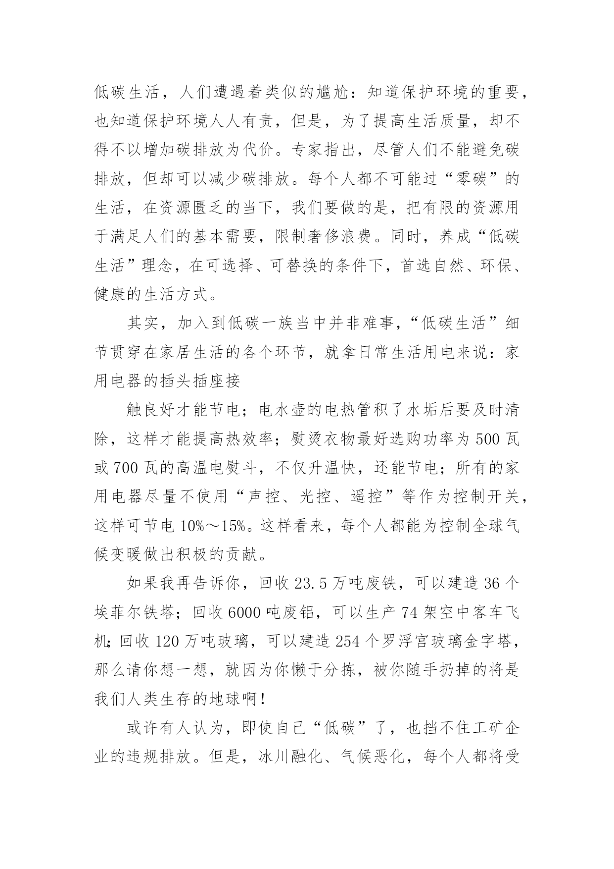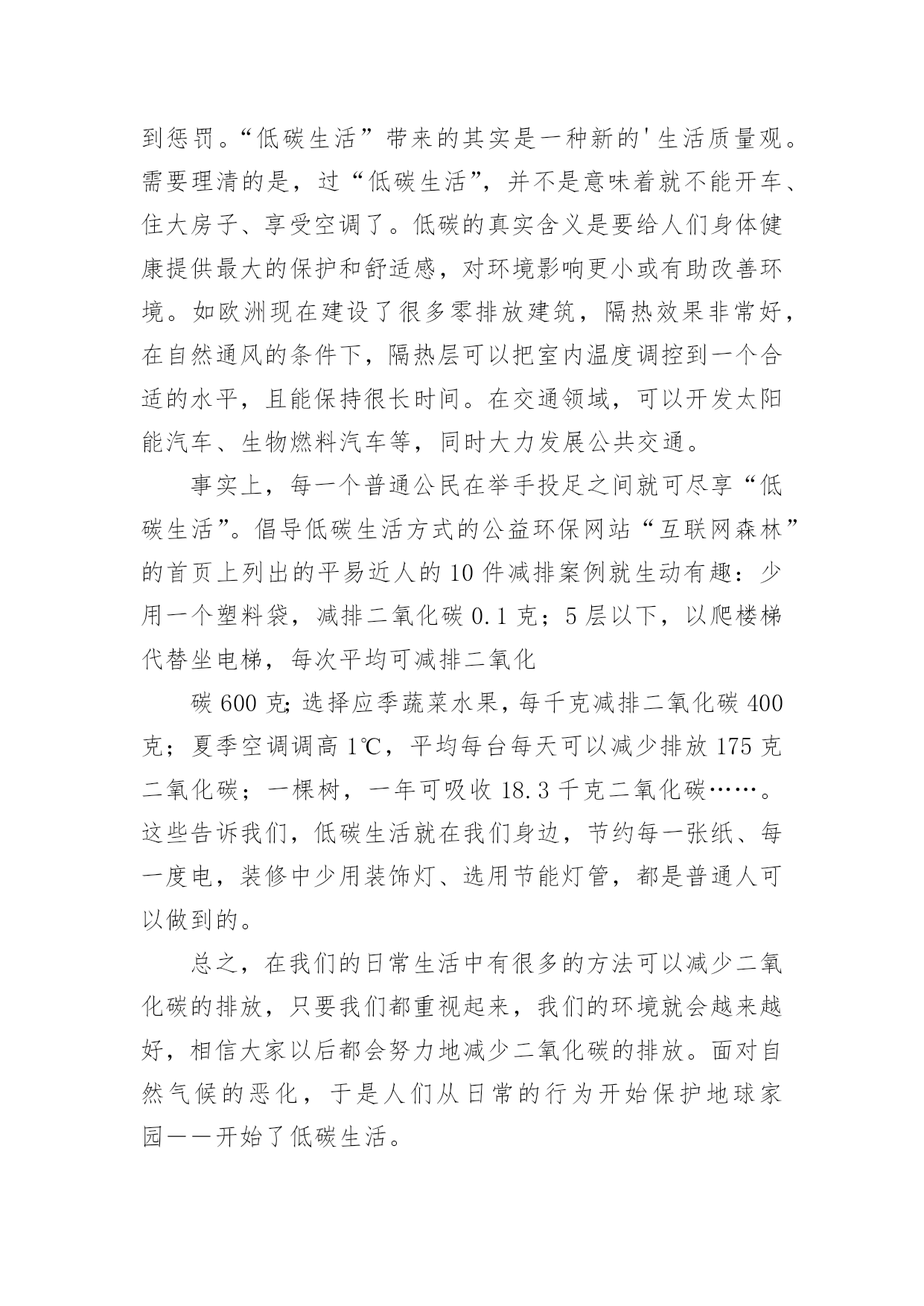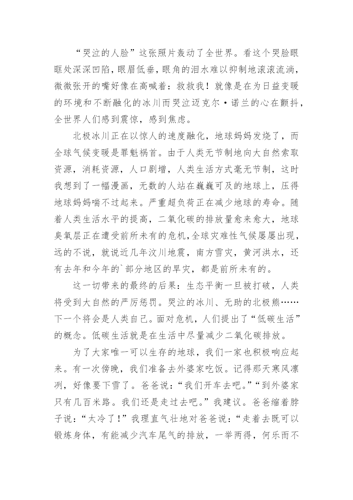 低碳环保的作文[推荐]实用的低碳环保的作文在平日的学习、工作和生活里,大家总少不了接触作文吧,作文是人们把记忆中所存储的有关知识、经验和思想用书面形式表达出来的记叙方式。写起作文来就毫无头绪?下面是小编整理的低碳环保的作文4篇,仅供参考,希望能够帮助到大家。低碳环保的作文篇1节能、环保是近些年来我们一直在倡导和追求的。今年我们国家的节能宣传周的活动主题就是“节能我行动、低碳新生活”。在这样的大背景下,我们区、学校根据这一活动精神,积极开展有关节能、环保的宣传活动。在学校领导的支持下,我校节能周以“节能减排、低碳新生活”为主题,在20xx年6月12日到6月17日五天的时间里大力宣传节能意识。在这一周里,我们开展了节能宣传周的展板设计,学生的“低碳新生活”金点子征文和网络低碳知识竞赛。这些活动深受学生的喜爱,同学们踊跃参与,使得活动得以圆满进行。当然,在活动过程中,我们不仅只是让学生参与活动,更是把活动的精神融入到活动当中,希望我们的学生能在这样的活动中,能有收获和体会。真正的.做一个节能环保达人,从小树立起节能意识,保护我们的环境和我们懒于生活的地球妈妈。低碳环保的作文篇2“哭泣的人脸”这张照片轰动了全世界。看这个哭脸眼眶处深深凹陷,眼眉低垂,眼角的泪水难以抑制地滚滚流淌,微微张开的嘴好像在高喊着:救救我!就像是在为日益变暖的环境和不断融化的冰川而哭泣迈克尔·诺兰的心在颤抖,全世界人们感到震惊,感到焦虑。北极冰川正在以惊人的速度融化,地球妈妈发烧了,而全球气候变暖是罪魁祸首。由于人类无节制地向大自然索取资源,消耗资源,人口剧增,人类生活方式毫无节制,这时我想到了一幅漫画,无数的人站在巍巍可及的地球上,压得地球妈妈喘不过起来。严重超负荷正在减少地球的寿命。随着人类生活水平的提高,二氧化碳的排放量愈来愈大,地球臭氧层正在遭受前所未有的危机,全球灾难性气候屡屡出现,远的不说,就说近几年汶川地震,南方雪灾,黄河洪水,还有去年和今年的`部分地区的旱灾,都是前所未有的。这一切带来的最终的后果:生态平衡一旦被打破,人类将受到大自然的严厉惩罚。哭泣的冰川、无助的北极熊……下一个将会是人类自己。面对危机,人们提出了“低碳生活”的概念。低碳生活就是在生活中尽量减少二氧化碳排放。为了大家唯一可以生存的地球,我们一家也积极响应起来。有一次傍晚,我们准备去外婆家吃饭。记得那天寒风凛冽,好像要下雪了。爸爸说:“我们开车去吧。”“到外婆家只有几百米路。我们还是走过去吧。”我建议。爸爸缩着脖子说:“太冷了!”我理直气壮地对爸爸说:“走着去既可以锻炼身体,有能减少汽车尾气的排放,一举两得,何乐而不为呢?”妈妈连忙附和道:“对!这就叫低碳生活。”爸爸摸摸我的头,惭愧地说:“我服了你们。”我们一家有说有笑地走向外婆家。这之后,我们一般都是走着去外婆家的。大家都知道,今年天气特别冷,家里不穿一件厚厚的棉袄手脚就热不起来。妈妈体质差,特别怕冷,老想着开空调,每次妈妈打开空调,我就像苍蝇一样在妈妈耳边嗡嗡烦着:“空调中的温室气体——佛里昂会破坏大气层,低碳生活,妈妈。”于是妈妈只能把空调关掉。慢慢地我们习惯了冷冰冰的环境,我们会通过做家务,做瑜伽等等让身体热起来。同学们,保护地球就是保护人类,今天地球妈妈发烧了,我们应该帮他降温。低碳生活,从我做起。低碳环保的作文篇3人人都知道,我们只有一个地球;而地球是人类与所有生命共同的地球。生命的延续,人类的生存,一刻也离不开自然资源。而面对今天地球的现状,每一个稍有良知的人都不能不为地球的明天而忧虑。自从我在电视里了解到二氧化碳的危害,我便意识到低碳生活的重要性。通过看电视、查资料,我明白了什么是低碳生活。低碳生活就是在我们的生活中尽量少排放二氧化碳。因为二氧化碳多了会使我们生活的空间环境变暖,也就是“温室效应”。我们生活的环境温度升高了,就会使南极的冰川融化成水,大量的水流到海里,会使海平面升高,可能就会淹没一些海岛国家上的居民。所以我们在日常生活中要减少二氧化碳的排放。具体到我们的生活中,就是要节约能源。但是对于低碳生活,人们遭遇着类似的尴尬:知道保护环境的重要,也知道保护环境人人有责,但是,为了提高生活质量,却不得不以增加碳排放为代价。专家指出,尽管人们不能避免碳排放,但却可以减少碳排放。每个人都不可能过“零碳”的生活,在资源匮乏的当下,我们要做的是,把有限的资源用于满足人们的基本需要,限制奢侈浪费。同时,养成“低碳生活”理念,在可选择、可替换的条件下,首选自然、环保、健康的生活方式。其实,加入到低碳一族当中并非难事,“低碳生活”细节贯穿在家居生活的各个环节,就拿日常生活用电来说:家用电器的插头插座接触良好才能节电;电水壶的电热管积了水垢后要及时清除,这样才能提高热效率;熨烫衣物最好选购功率为500瓦或700瓦的高温电熨