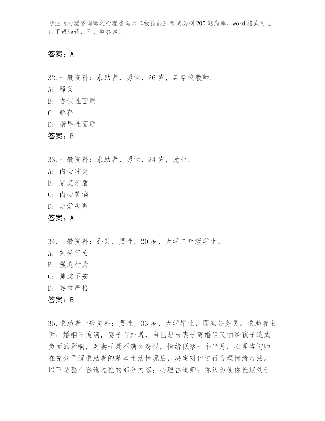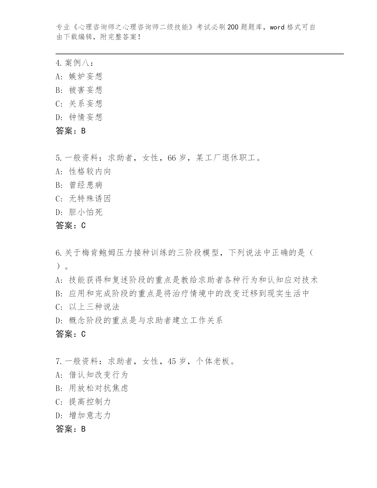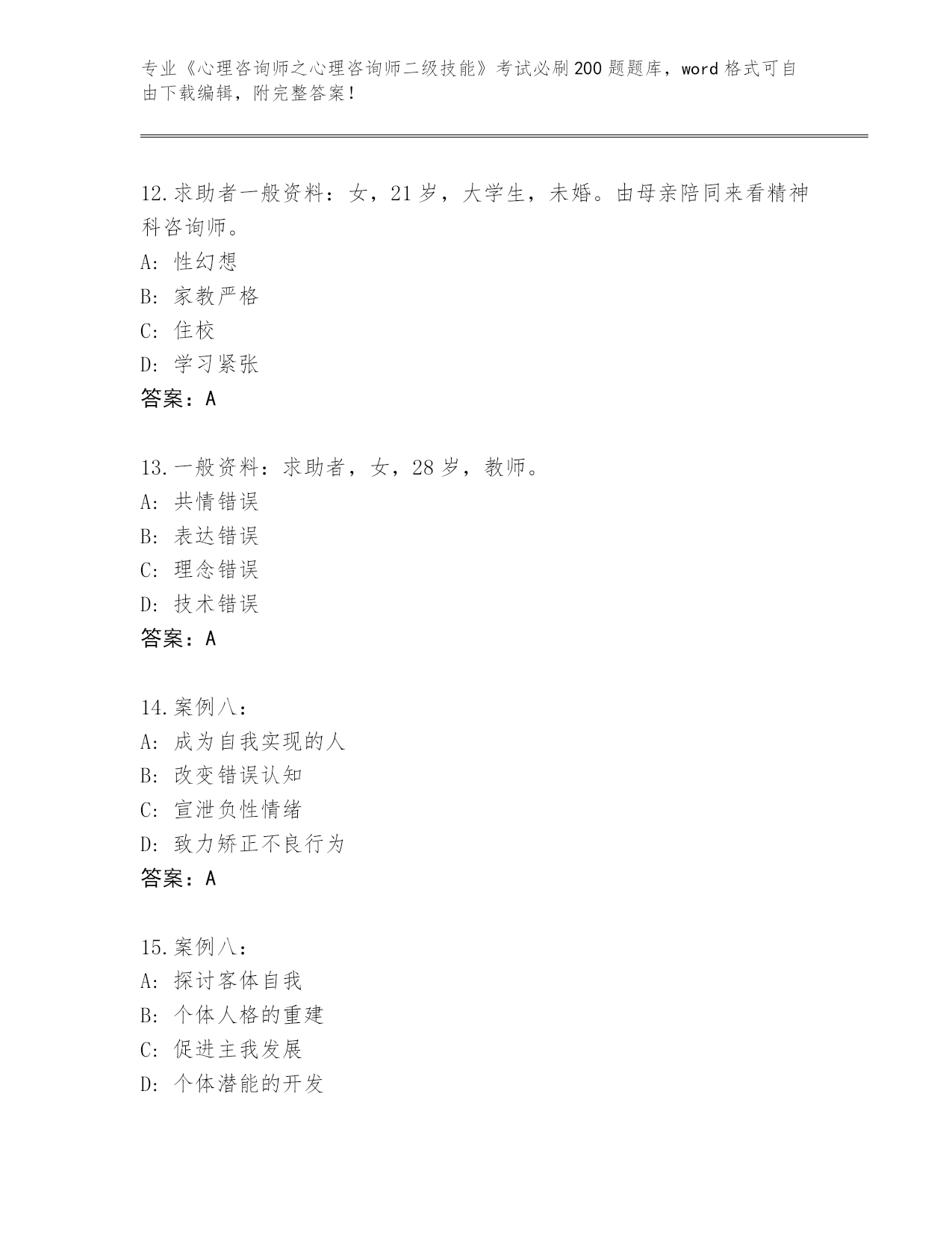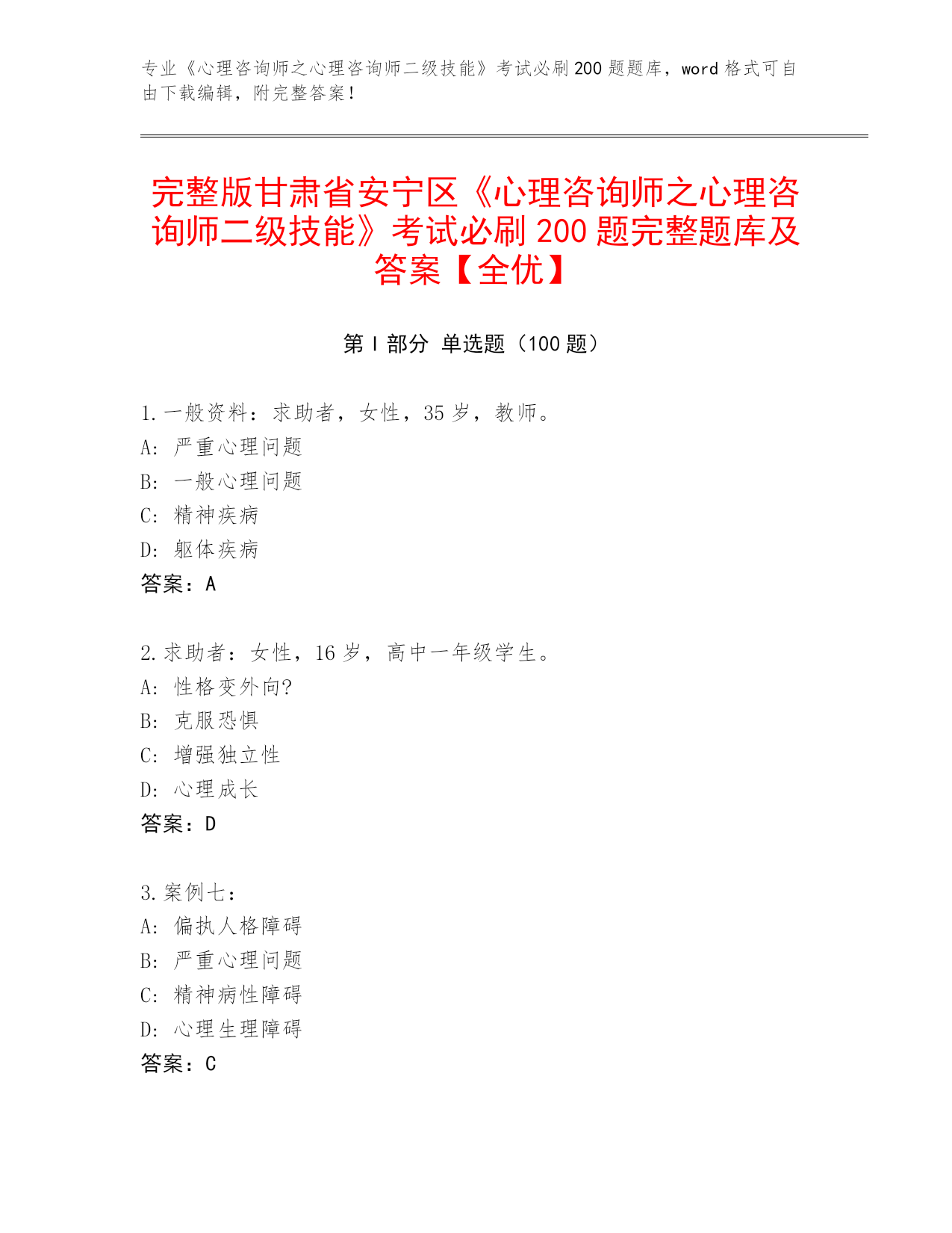 完整版甘肃省安宁区《心理咨询师之心理咨询师二级技能》考试必刷200题完整题库及答案【全优】
