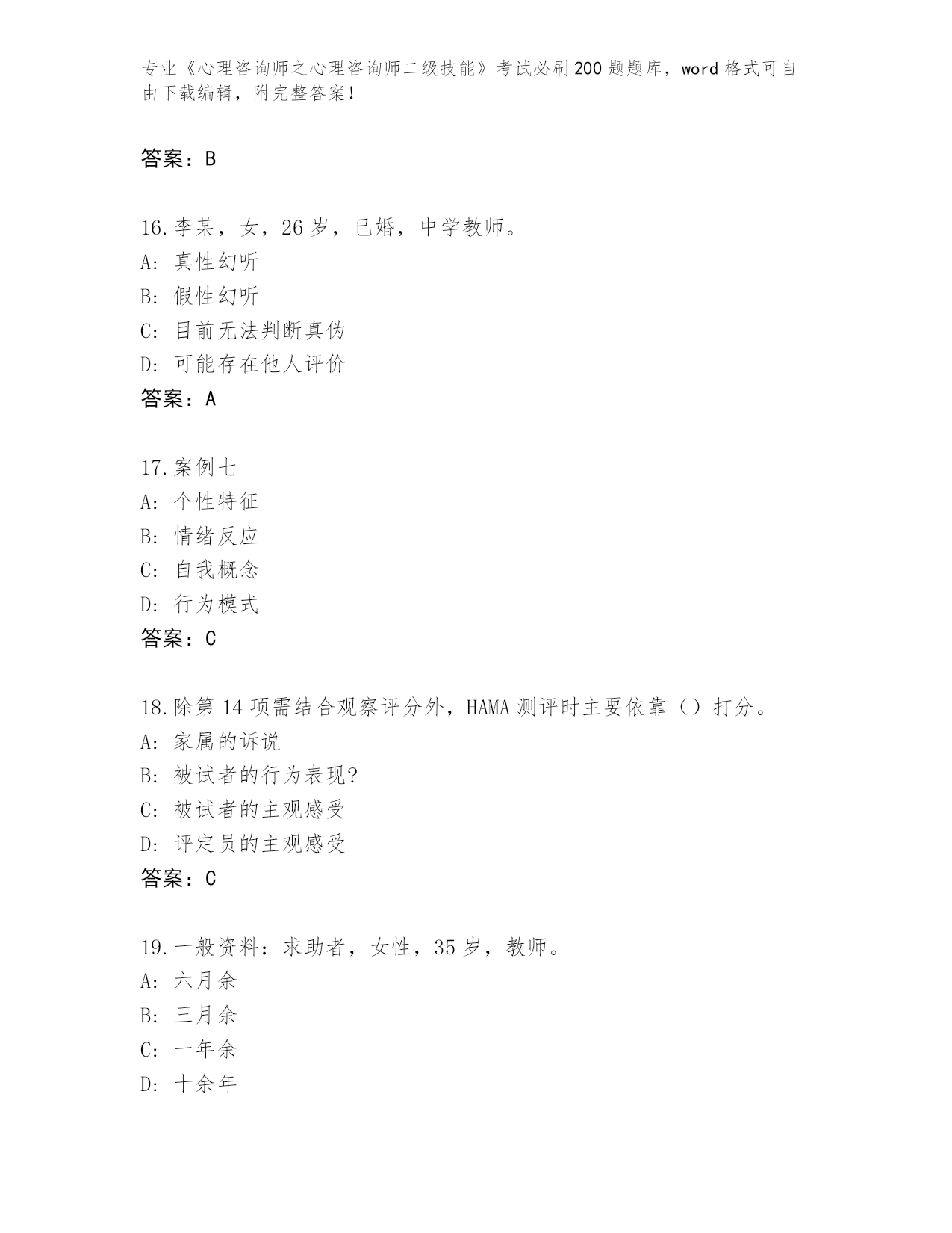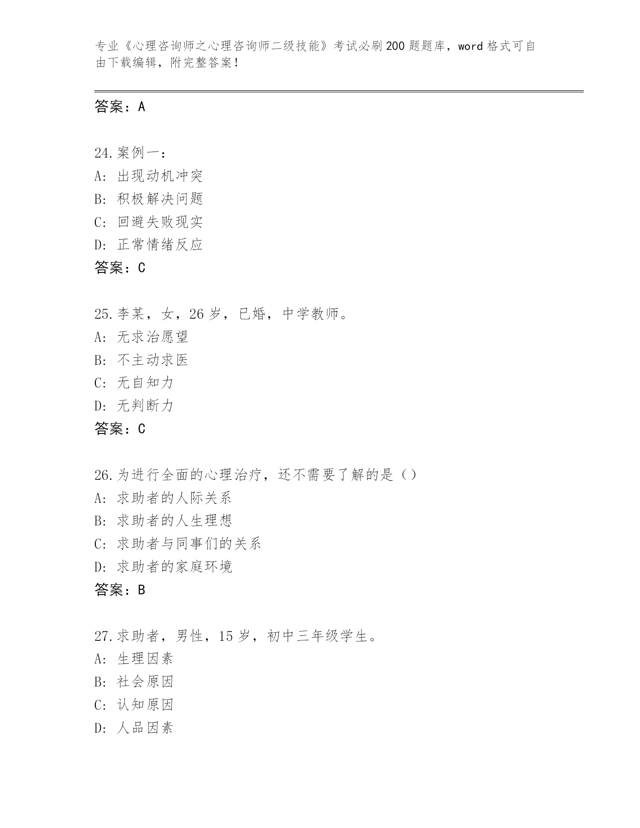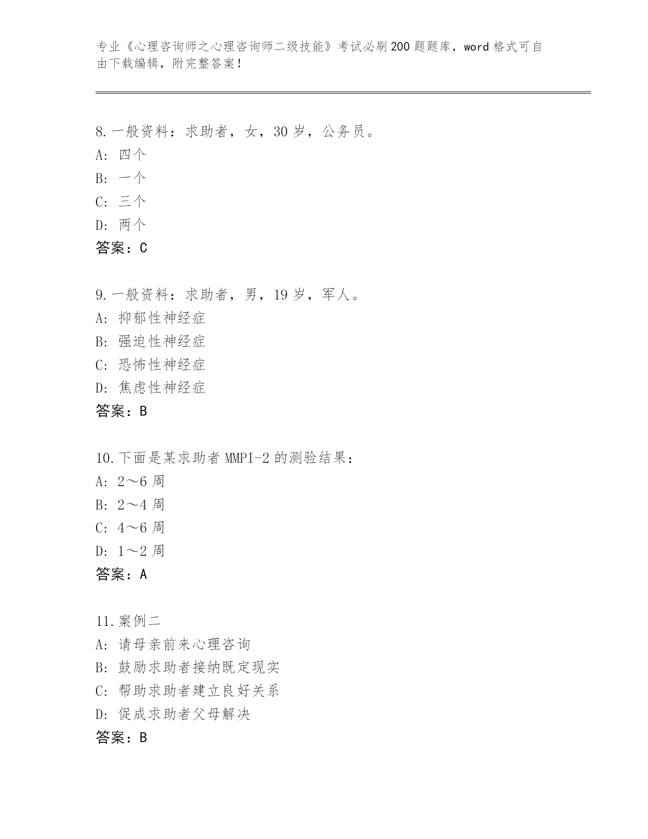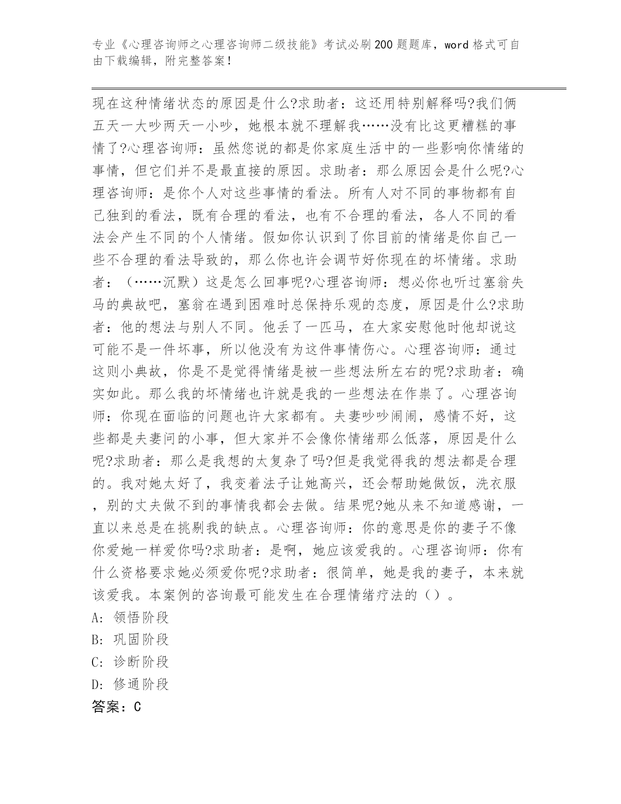 福建省完整版《心理咨询师之心理咨询师二级技能》考试必刷200题王牌题库【全优】