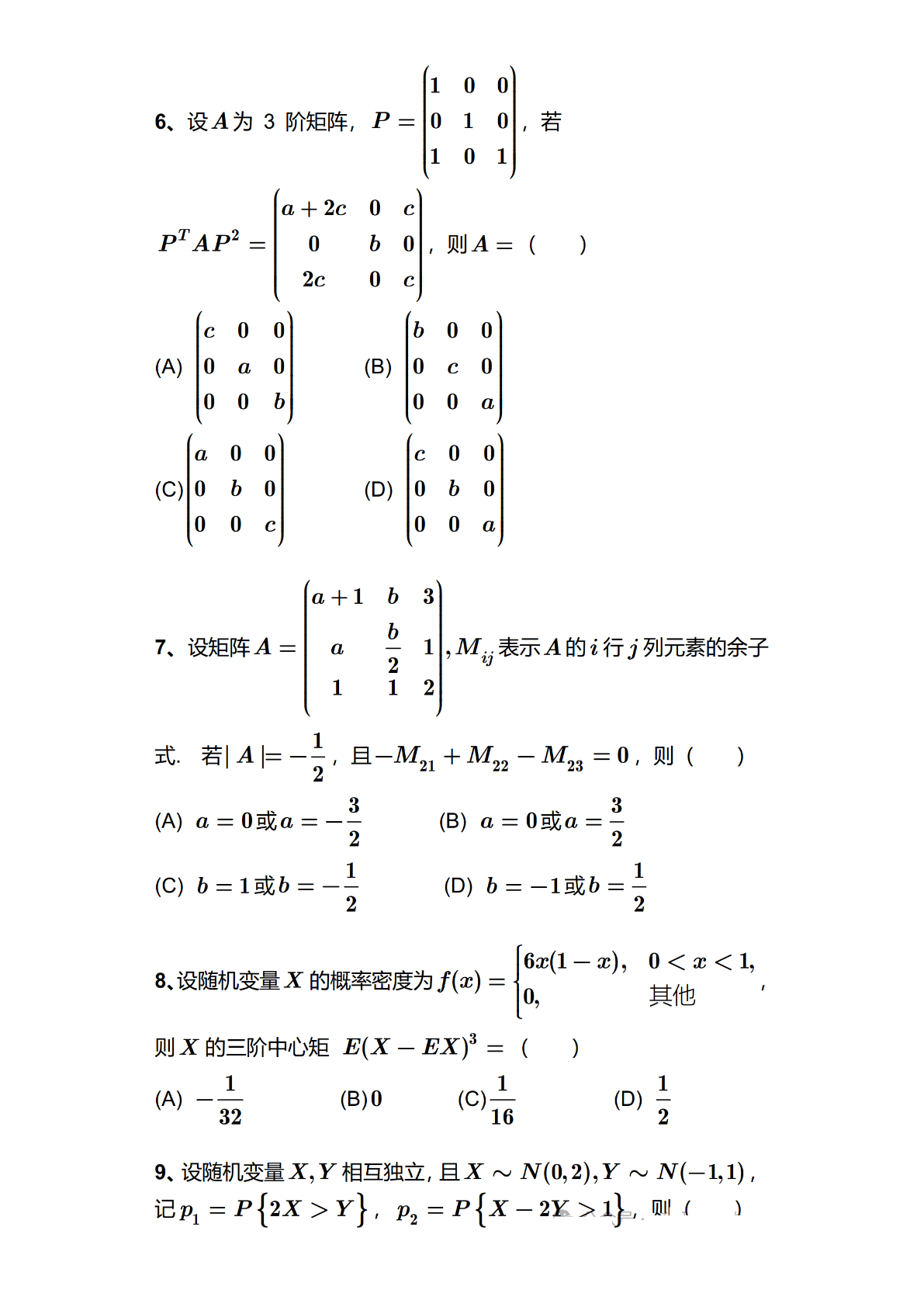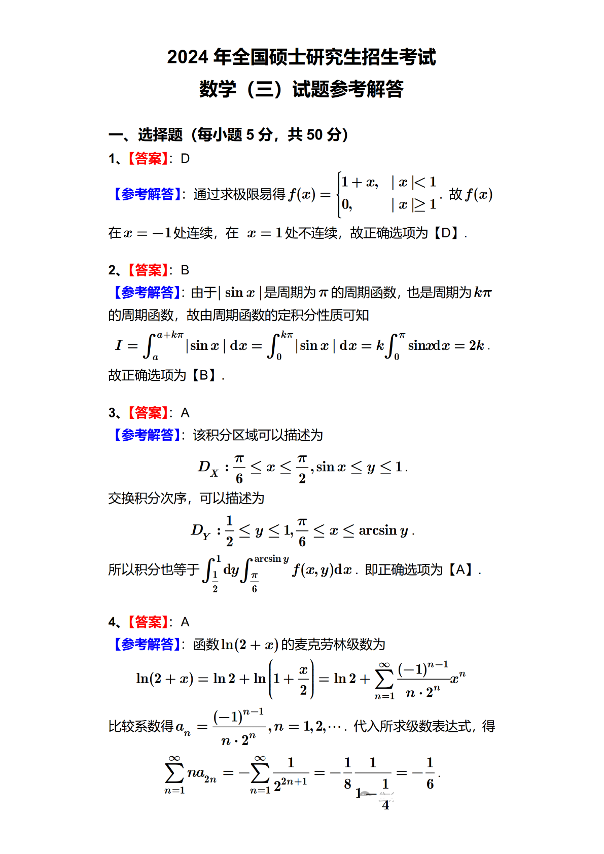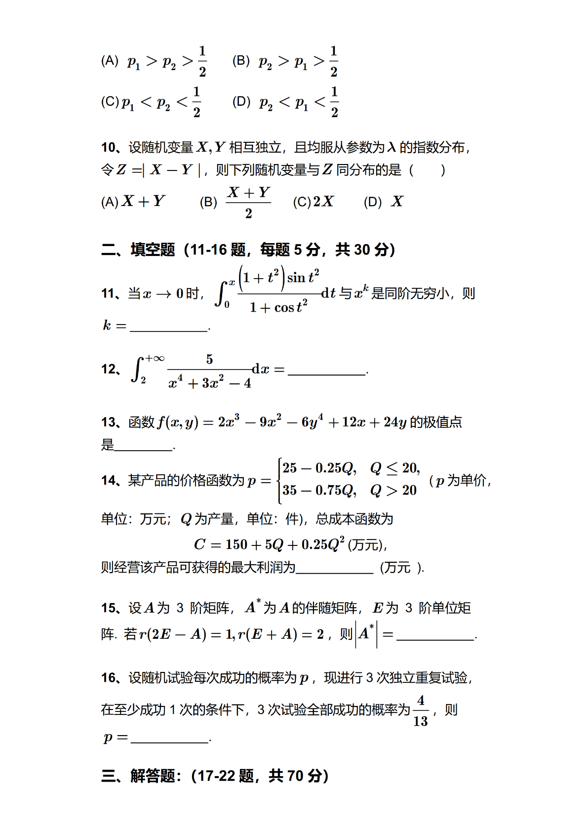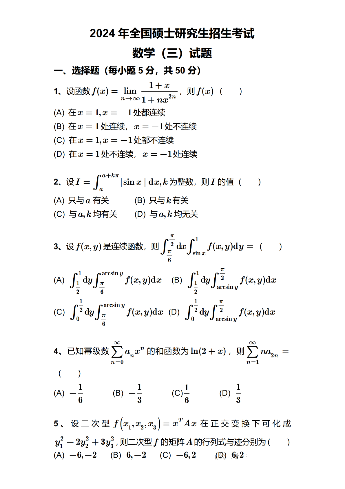 2024年全国硕士研究生招生考试数学(三)试题及答案