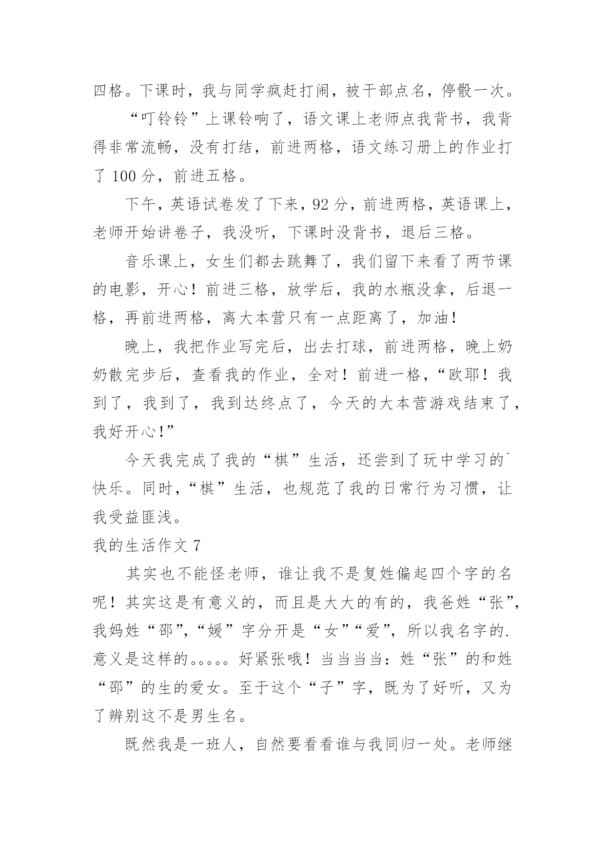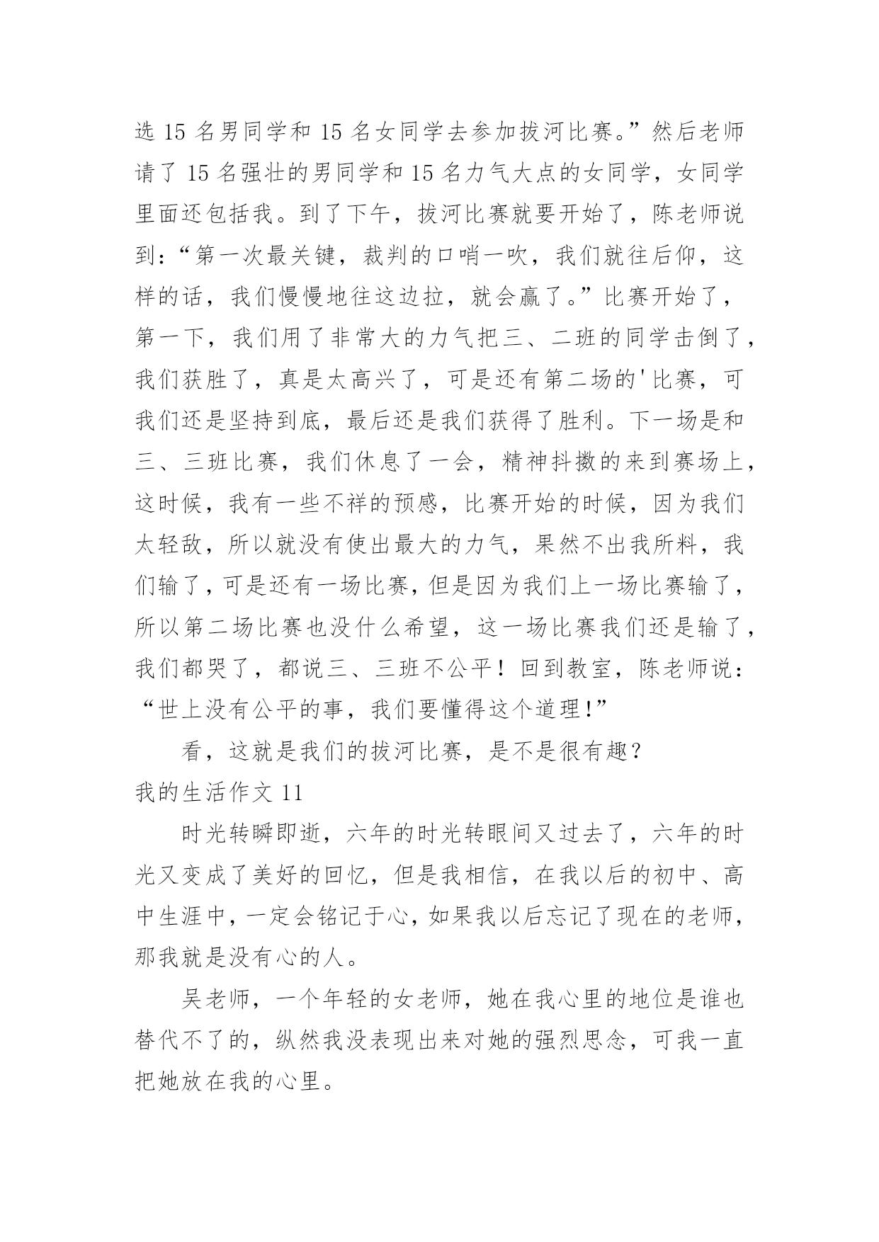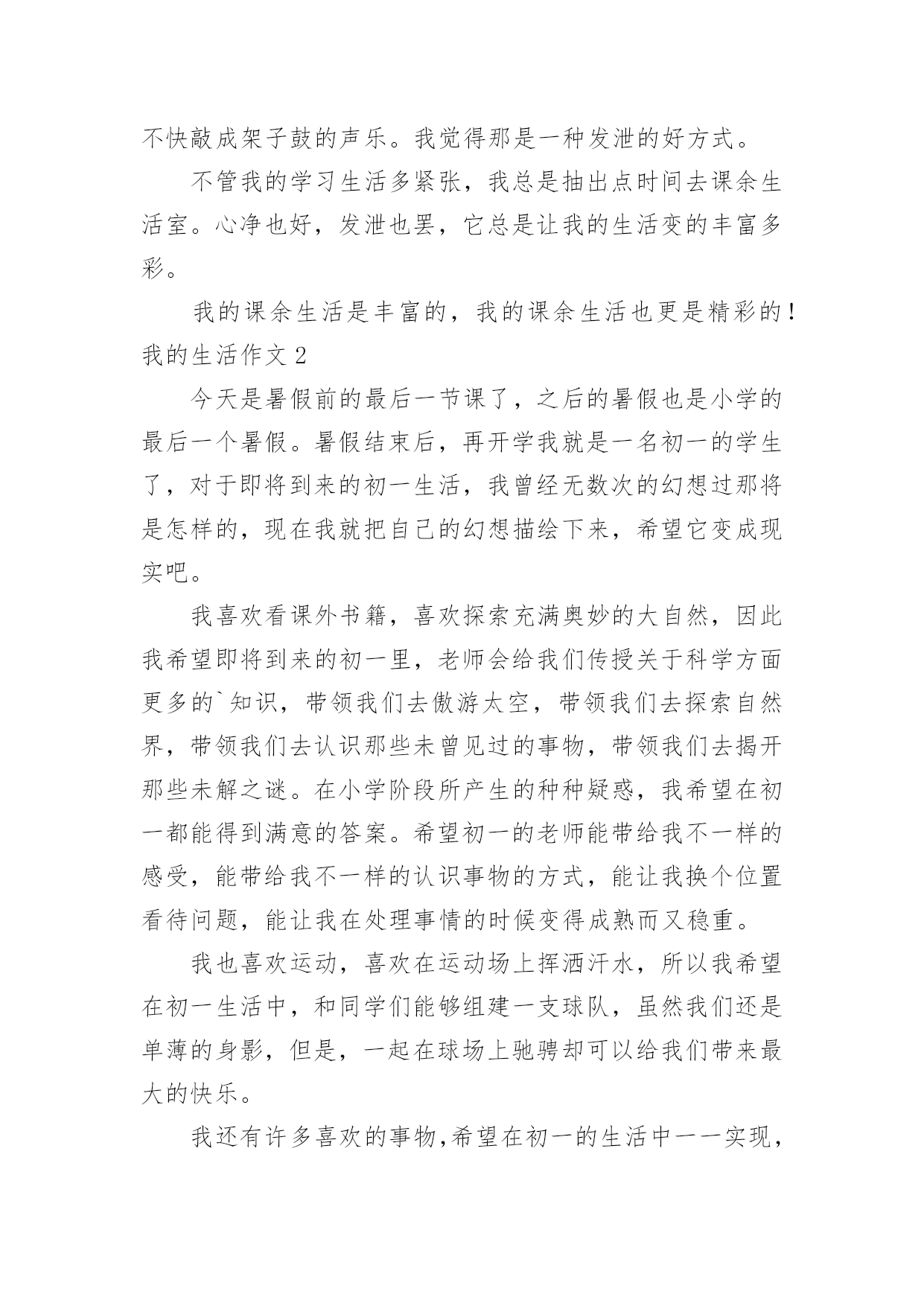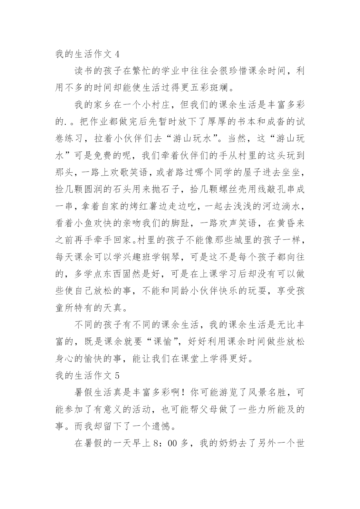 我的生活作文[优秀]我的生活作文在日复一日的学习、工作或生活中,大家或多或少都会接触过作文吧,作文是由文字组成,经过人的思想考虑,通过语言组织来表达一个主题意义的文体。你所见过的作文是什么样的呢?以下是小编为大家收集的我的生活作文,供大家参考借鉴,希望可以帮助到有需要的朋友。我的生活作文1我的学习生活有那么一点点紧张,但这不能阻碍我丰富的课余生活。我喜欢弹琴,喜欢敲架子鼓,喜欢听音乐。所以,我们学校的课余生活室给我提供了很大的方便。我喜欢弹琴,天生长长的手指让我变得更有自信。小学暑假的时候专门报了个电子琴班,一个暑假不敢说弹什么繁琐的曲谱,简单的'还是掌握的绰绰有余的。所以,当我学习生活累了,倦了的时候,我便跑到课余生活室去寻找我的自信,我的快乐。当我看着我的指尖跳跃在黑白琴键上,别人被我的琴声震惊的时候,心底总还是喜悦的。自信和快乐当然也就随之而来。电子琴,能陶冶人的情操,也能让我变的更加“淑女”。弹琴,也能让人心净,即使到了菜市场,依然心如止水。架子鼓,却和琴不同。弹琴,让我心净。而架子鼓,却能让我忘了暂时的不快。当我心情不好的时候,我便喜欢把不快敲成架子鼓的声乐。我觉得那是一种发泄的好方式。不管我的学习生活多紧张,我总是抽出点时间去课余生活室。心净也好,发泄也罢,它总是让我的生活变的丰富多彩。我的课余生活是丰富的,我的课余生活也更是精彩的!我的生活作文2今天是暑假前的最后一节课了,之后的暑假也是小学的最后一个暑假。暑假结束后,再开学我就是一名初一的学生了,对于即将到来的初一生活,我曾经无数次的幻想过那将是怎样的,现在我就把自己的幻想描绘下来,希望它变成现实吧。我喜欢看课外书籍,喜欢探索充满奥妙的大自然,因此我希望即将到来的初一里,老师会给我们传授关于科学方面更多的`知识,带领我们去傲游太空,带领我们去探索自然界,带领我们去认识那些未曾见过的事物,带领我们去揭开那些未解之谜。在小学阶段所产生的种种疑惑,我希望在初一都能得到满意的答案。希望初一的老师能带给我不一样的感受,能带给我不一样的认识事物的方式,能让我换个位置看待问题,能让我在处理事情的时候变得成熟而又稳重。我也喜欢运动,喜欢在运动场上挥洒汗水,所以我希望在初一生活中,和同学们能够组建一支球队,虽然我们还是单薄的身影,但是,一起在球场上驰骋却可以给我们带来最大的快乐。我还有许多喜欢的事物,希望在初一的生活中一一实现,期待初一生活的早日到来吧。我的生活作文3时光在匆匆的流逝,眼看着寒假渐渐的到来了我们的身边。大家也都在细心筹划着自己的假期生活。准备过一个有趣的寒假!假期终于来临了,大家的假期生活开始了。首先我们回到了久别的家里,来到家里大家都吃到了父母为我们准备的丰盛的饭菜。然后大家都洗了一个热水澡,洗去了自己身上的风尘。我们开始自己理想的假期生活了,说实话我的假期生活之中不包含学习哟。我首先去了我家附近同学的家,去他们的`家里和他们一起玩耍。慢慢长假一个人在家玩不是很无聊吗?大家一起玩不是很好嘛?然后我开始努力筹钱准备去外地玩耍。我打算在这个寒假我可以去外面的世界看看,领略一下外面的奇异风光。于是,在我的努力下,我终于攒够了钱,随着旅游社我们一行来到了云南。大家都说:“云南山水甲天下”。今天一见果然与众不同啊!云南的风景是那么的美丽迷人,云南的水是那样的清澈,那高山是那样的挺拔。看到这美丽的风景,我感叹到了大自然的神奇啊!我同时也明白到了,人要多出去走走开阔自己的视野,不要一直在自己所处的环境里面,犹如坐井观天一般,将自己的视野越看越小。这就是我的寒假生活,一个开心,快乐的寒假生活!我希望每年的寒假生活都可以这样的开心和快乐!我的生活作文4读书的孩子在繁忙的学业中往往会很珍惜课余时间,利用不多的时间却能使生活过得更五彩斑斓。我的家乡在一个小村庄,但我们的课余生活是丰富多彩的.。把作业都做完后先暂时放下了厚厚的书本和成沓的试卷练习,拉着小伙伴们去“游山玩水”。当然,这“游山玩水”可是免费的呢,我们牵着伙伴们的手从村里的这头玩到那头,一路上欢歌笑语,或者路过哪个同学的屋子进去坐坐,捡几颗圆润的石头用来抛石子,拾几颗螺丝壳用线敲孔串成一串,拿着自家的烤红薯边走边吃,一起去浅浅的河边淌水,看着小鱼欢快的亲吻我们的脚趾,一路欢声笑语,在黄昏来之前再手牵手回家。村里的孩子不能像那些城里的孩子一样,每天课余可以学兴趣班学钢琴,可是这不是每个孩子都向往的,多学点东西固然是好,可是在上课学习后却没有可以做些使自己放松的事,不能和同龄小伙伴快乐的玩耍,享受孩童所特有的天真。不同的孩子有不同的课余生活,我的课余生活是无比丰富的,既是课余就要“课愉”,好好利用课余时间做些放松身心的愉快的事,能让我们在课堂上学得更好。我的生活作文5暑假生活真是丰富多彩啊!你可能游览了风景名胜,可能参加了有