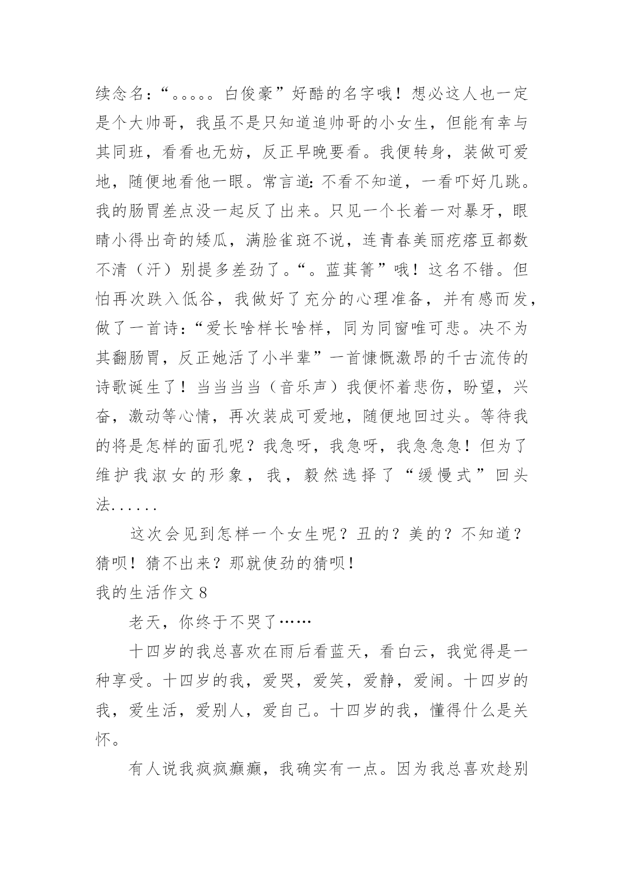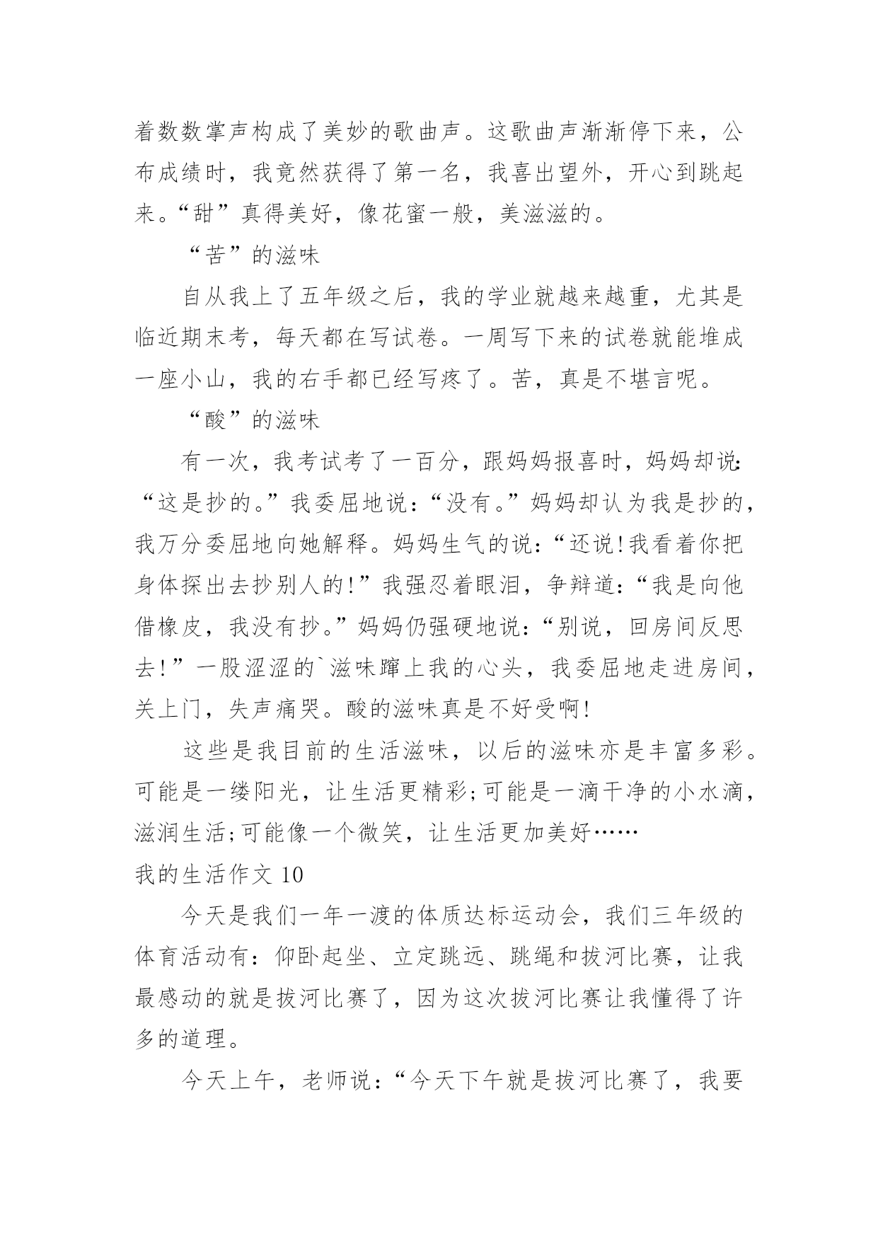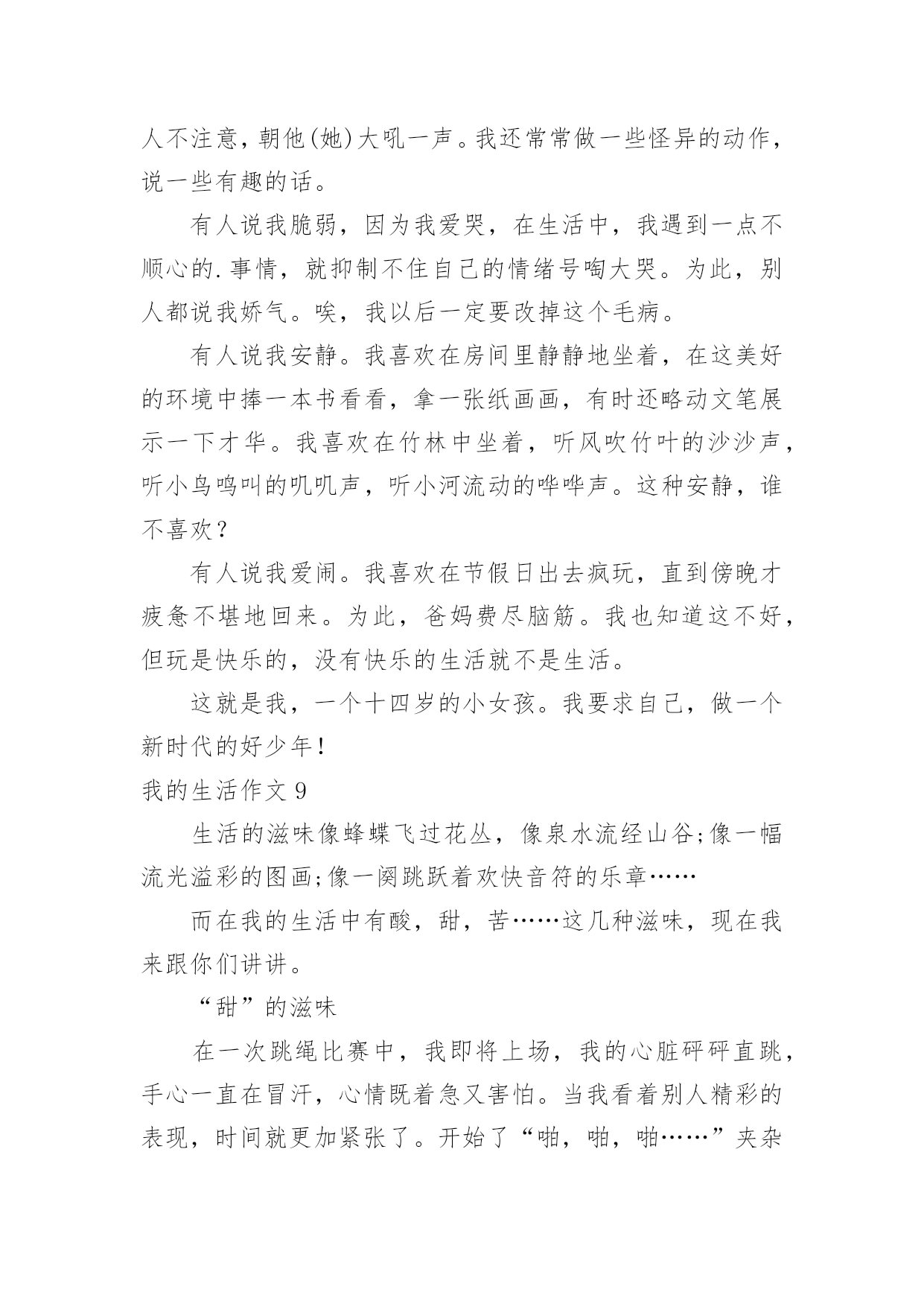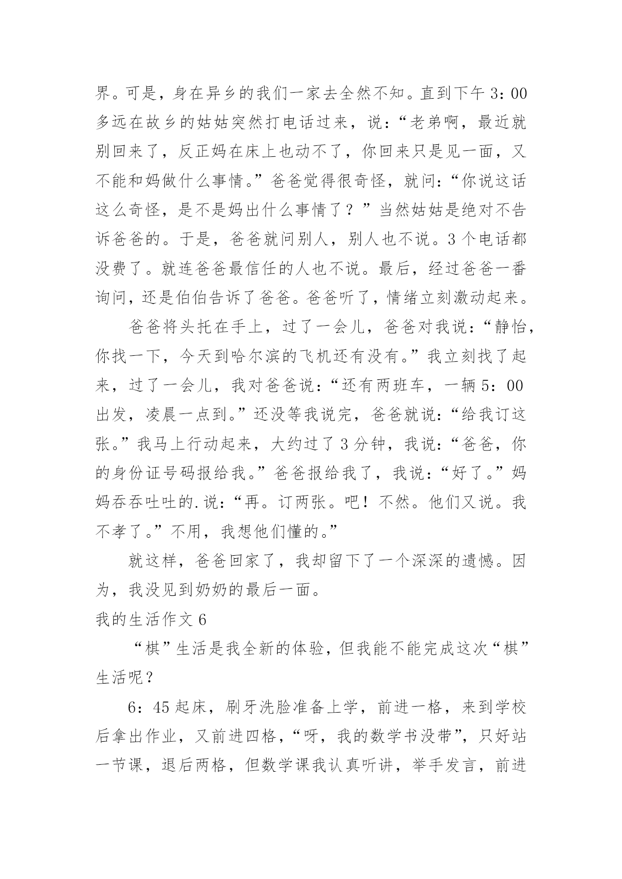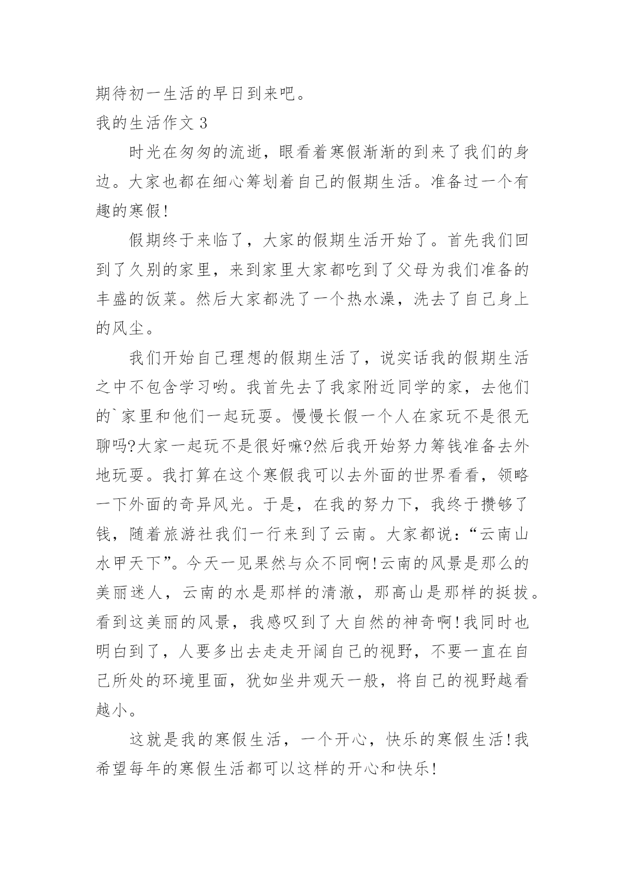 我的生活作文[优秀]我的生活作文在日复一日的学习、工作或生活中,大家或多或少都会接触过作文吧,作文是由文字组成,经过人的思想考虑,通过语言组织来表达一个主题意义的文体。你所见过的作文是什么样的呢?以下是小编为大家收集的我的生活作文,供大家参考借鉴,希望可以帮助到有需要的朋友。我的生活作文1我的学习生活有那么一点点紧张,但这不能阻碍我丰富的课余生活。我喜欢弹琴,喜欢敲架子鼓,喜欢听音乐。所以,我们学校的课余生活室给我提供了很大的方便。我喜欢弹琴,天生长长的手指让我变得更有自信。小学暑假的时候专门报了个电子琴班,一个暑假不敢说弹什么繁琐的曲谱,简单的'还是掌握的绰绰有余的。所以,当我学习生活累了,倦了的时候,我便跑到课余生活室去寻找我的自信,我的快乐。当我看着我的指尖跳跃在黑白琴键上,别人被我的琴声震惊的时候,心底总还是喜悦的。自信和快乐当然也就随之而来。电子琴,能陶冶人的情操,也能让我变的更加“淑女”。弹琴,也能让人心净,即使到了菜市场,依然心如止水。架子鼓,却和琴不同。弹琴,让我心净。而架子鼓,却能让我忘了暂时的不快。当我心情不好的时候,我便喜欢把不快敲成架子鼓的声乐。我觉得那是一种发泄的好方式。不管我的学习生活多紧张,我总是抽出点时间去课余生活室。心净也好,发泄也罢,它总是让我的生活变的丰富多彩。我的课余生活是丰富的,我的课余生活也更是精彩的!我的生活作文2今天是暑假前的最后一节课了,之后的暑假也是小学的最后一个暑假。暑假结束后,再开学我就是一名初一的学生了,对于即将到来的初一生活,我曾经无数次的幻想过那将是怎样的,现在我就把自己的幻想描绘下来,希望它变成现实吧。我喜欢看课外书籍,喜欢探索充满奥妙的大自然,因此我希望即将到来的初一里,老师会给我们传授关于科学方面更多的`知识,带领我们去傲游太空,带领我们去探索自然界,带领我们去认识那些未曾见过的事物,带领我们去揭开那些未解之谜。在小学阶段所产生的种种疑惑,我希望在初一都能得到满意的答案。希望初一的老师能带给我不一样的感受,能带给我不一样的认识事物的方式,能让我换个位置看待问题,能让我在处理事情的时候变得成熟而又稳重。我也喜欢运动,喜欢在运动场上挥洒汗水,所以我希望在初一生活中,和同学们能够组建一支球队,虽然我们还是单薄的身影,但是,一起在球场上驰骋却可以给我们带来最大的快乐。我还有许多喜欢的事物,希望在初一的生活中一一实现,期待初一生活的早日到来吧。我的生活作文3时光在匆匆的流逝,眼看着寒假渐渐的到来了我们的身边。大家也都在细心筹划着自己的假期生活。准备过一个有趣的寒假!假期终于来临了,大家的假期生活开始了。首先我们回到了久别的家里,来到家里大家都吃到了父母为我们准备的丰盛的饭菜。然后大家都洗了一个热水澡,洗去了自己身上的风尘。我们开始自己理想的假期生活了,说实话我的假期生活之中不包含学习哟。我首先去了我家附近同学的家,去他们的`家里和他们一起玩耍。慢慢长假一个人在家玩不是很无聊吗?大家一起玩不是很好嘛?然后我开始努力筹钱准备去外地玩耍。我打算在这个寒假我可以去外面的世界看看,领略一下外面的奇异风光。于是,在我的努力下,我终于攒够了钱,随着旅游社我们一行来到了云南。大家都说:“云南山水甲天下”。今天一见果然与众不同啊!云南的风景是那么的美丽迷人,云南的水是那样的清澈,那高山是那样的挺拔。看到这美丽的风景,我感叹到了大自然的神奇啊!我同时也明白到了,人要多出去走走开阔自己的视野,不要一直在自己所处的环境里面,犹如坐井观天一般,将自己的视野越看越小。这就是我的寒假生活,一个开心,快乐的寒假生活!我希望每年的寒假生活都可以这样的开心和快乐!我的生活作文4读书的孩子在繁忙的学业中往往会很珍惜课余时间,利用不多的时间却能使生活过得更五彩斑斓。我的家乡在一个小村庄,但我们的课余生活是丰富多彩的.。把作业都做完后先暂时放下了厚厚的书本和成沓的试卷练习,拉着小伙伴们去“游山玩水”。当然,这“游山玩水”可是免费的呢,我们牵着伙伴们的手从村里的这头玩到那头,一路上欢歌笑语,或者路过哪个同学的屋子进去坐坐,捡几颗圆润的石头用来抛石子,拾几颗螺丝壳用线敲孔串成一串,拿着自家的烤红薯边走边吃,一起去浅浅的河边淌水,看着小鱼欢快的亲吻我们的脚趾,一路欢声笑语,在黄昏来之前再手牵手回家。村里的孩子不能像那些城里的孩子一样,每天课余可以学兴趣班学钢琴,可是这不是每个孩子都向往的,多学点东西固然是好,可是在上课学习后却没有可以做些使自己放松的事,不能和同龄小伙伴快乐的玩耍,享受孩童所特有的天真。不同的孩子有不同的课余生活,我的课余生活是无比丰富的,既是课余就要“课愉”,好好利用课余时间做些放松身心的愉快的事,能让我们在课堂上学得更好。我的生活作文5暑假生活真是丰富多彩啊!你可能游览了风景名胜,可能参加了有