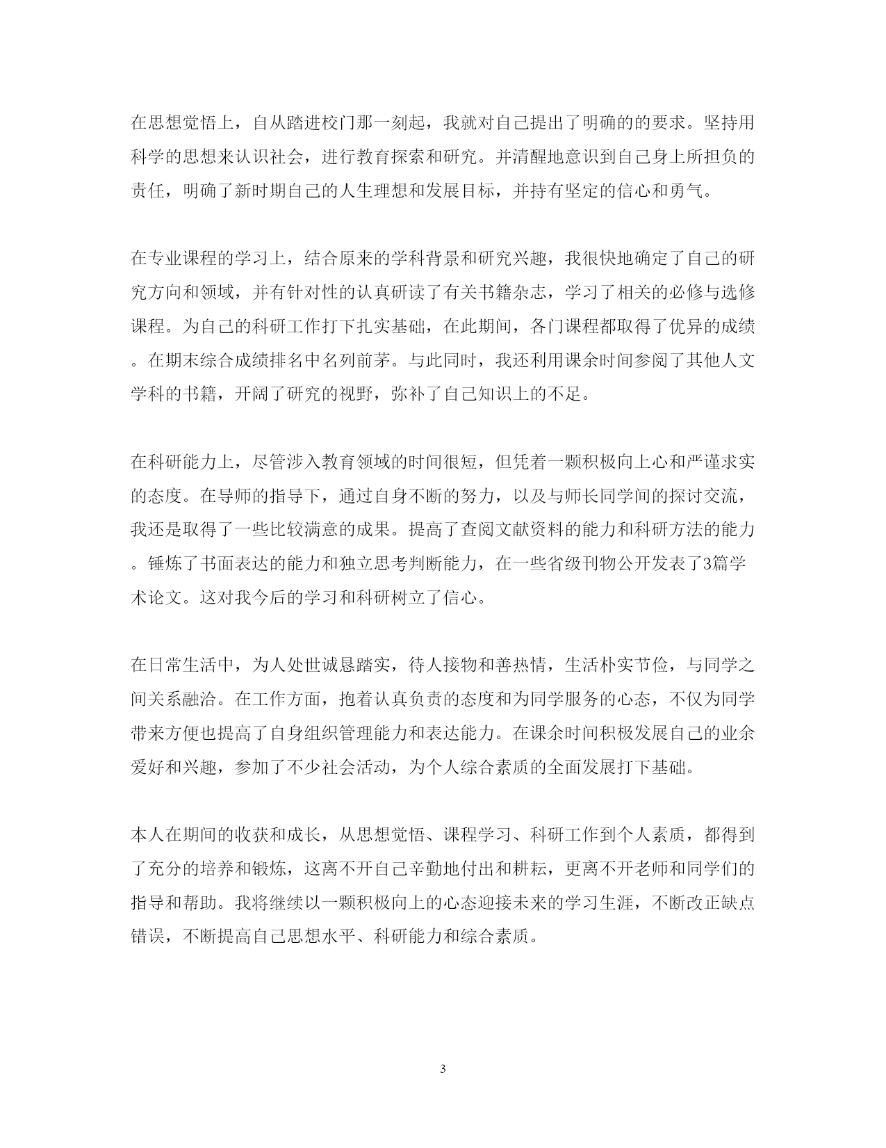 此资料由网络收集而来,如有侵权请告知上传者立即删除。资料共分享,我们负责传递知识。PAGEPAGE3研究生学年自我总结【3篇】每一个学年研究生们都会对自己的学习对自己的工作进行总结,分析,不断完善自我。下面是小编搜集整理的研究生学年自我总结,欢迎阅读。更多资讯尽在自我总结栏目!研究生学年自我总结又是一个新的学年,将在华中农业大学度过的第七个年头。现实是历史的延续,现将硕士二年级进行总结。总体来说,这一学年,是一个富有挑战性的、转折性的一年。于学业、于个人人生发展来说。这一年,也就是硕士二年级,我们结束了长达2019年的教师教授学生自学的学习模式,开始了科研的初步探索。这是一种与单纯汲取知识完全不同的模式,需要很多的主观能动性的创新。这种转变是一个痛苦的过程,唯有经历过这种痛苦,才会渐渐成长起来。我们渐渐地对搞科研入了门,却马上面临着毕业了。说实话,很是不舍。不舍自己破茧重生后积累的经验迅速的贬值,封尘于人生的藏宝箱。幸好,做学问,学业亦或科研,上升到哲学的角度,与做其他事情都是有共性的。在这一年之中,我更大的收获是对自己性格方面、处理事情方面的历练。科研是需要独立完成的。从最初的无所适从,到现在的渐渐地适应自己给自己提出一个思路,然后当机立断的执行,并对自己的创意、自己的执行力负责。这种独立性的培养,这种责任心的培养,对整个人生是大有裨益的。另外,科研极大的磨练了我的心智。除却培养了我的独立性以外,大大提升了我的执行力。渐渐地明白,有些事情是逃不掉的,无论早晚,自己去做并且做好,没有人可以代劳,早执行早得出结果,而且无论再繁杂,都要一步一步按部就班地执行,急躁不得。这一年的磨练让我的行动力和耐力得到极大的提升。这一年,我离开了从20岁到25岁待久了习惯了它的美丽、它的亲切的校园。来到了天津的这个研究所做联合培养生。在一个熟悉的环境呆得太久,对新环境的适应能力都有些忘却了。研究生学年自我总结本人自入学以来,秉承“笃学慎思、明辨尚行”的校训,通过不懈努力,圆满地完成了硕士研究生阶段的学习任务。在学习上,极为珍惜研究生院良好的学习氛围和资源条件,刻苦学习,乐于登攀,通过良师的悉心教导和自身的刻苦努力,掌握了技术经济及管理领域的基础理论和专业知识,具备了较强的业务能力和英语运用能力;在思想品德修养上,认真学习实践科学发展观,牢固树立了为党、为国、为民贡献青春的信念,党性觉悟得到锤炼,思想政治素质进一步提高;在生活上,崇尚质朴的生活方式,养成了正直的作风和良好的生活习惯,待人诚恳、热情,尊敬师长、团结同学,在同学中具有一定的威信;在工作上,勤勤恳恳、扎扎实实,重视小事、关注细节,能够独立承担一些工作任务,适应性强,得到领导和同事的好评。在过去的三年里,本人所获颇丰,这些经历和积累都将成为我人生道路上的宝贵财富。在今后的工作和学习中,将继续保持并发扬严谨治学的态度和作风,自强不息,求实进取,争取有更大的成绩。硕士研究生学年自我总结本人自xx年考取大学的研究生以来,经过两年的成长,使我在思想、学习、工作以及生活等各方都有了较大的进步:在思想觉悟上,自从踏进校门那一刻起,我就对自己提出了明确的的要求。坚持用科学的思想来认识社会,进行教育探索和研究。并清醒地意识到自己身上所担负的责任,明确了新时期自己的人生理想和发展目标,并持有坚定的信心和勇气。在专业课程的学习上,结合原来的学科背景和研究兴趣,我很快地确定了自己的研究方向和领域,并有针对性的认真研读了有关书籍杂志,学习了相关的必修与选修课程。为自己的科研工作打下扎实基础,在此期间,各门课程都取得了优异的成绩。在期末综合成绩排名中名列前茅。与此同时,我还利用课余时间参阅了其他人文学科的书籍,开阔了研究的视野,弥补了自己知识上的不足。在科研能力上,尽管涉入教育领域的时间很短,但凭着一颗积极向上心和严谨求实的态度。在导师的指导下,通过自身不断的努力,以及与师长同学间的探讨交流,我还是取得了一些比较满意的成果。提高了查阅文献资料的能力和科研方法的能力。锤炼了书面表达的能力和独立思考判断能力,在一些省级刊物公开发表了3篇学术论文。这对我今后的学习和科研树立了信心。在日常生活中,为人处世诚恳踏实,待人接物和善热情,生活朴实节俭,与同学之间关系融洽。在工作方面,抱着认真负责的态度和为同学服务的心态,不仅为同学带来方便也提高了自身组织管理能力和表达能力。在课余时间积极发展自己的业余爱好和兴趣,参加了不少社会活动,为个人综合素质的全面发展打下基础。本人在期间的收获和成长,从思想觉悟、课程学习、科研工作到个人素质,都得到了充分的培养和锻炼,这离不开自己辛勤地付出和耕耘,更离不开老师和同学们的指导和帮助。我将继续以一颗积极向上的心态迎接未来的学习生涯,不断