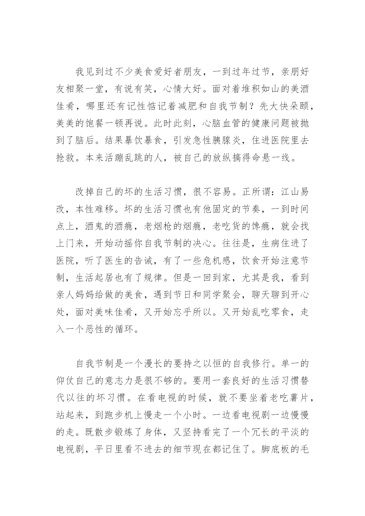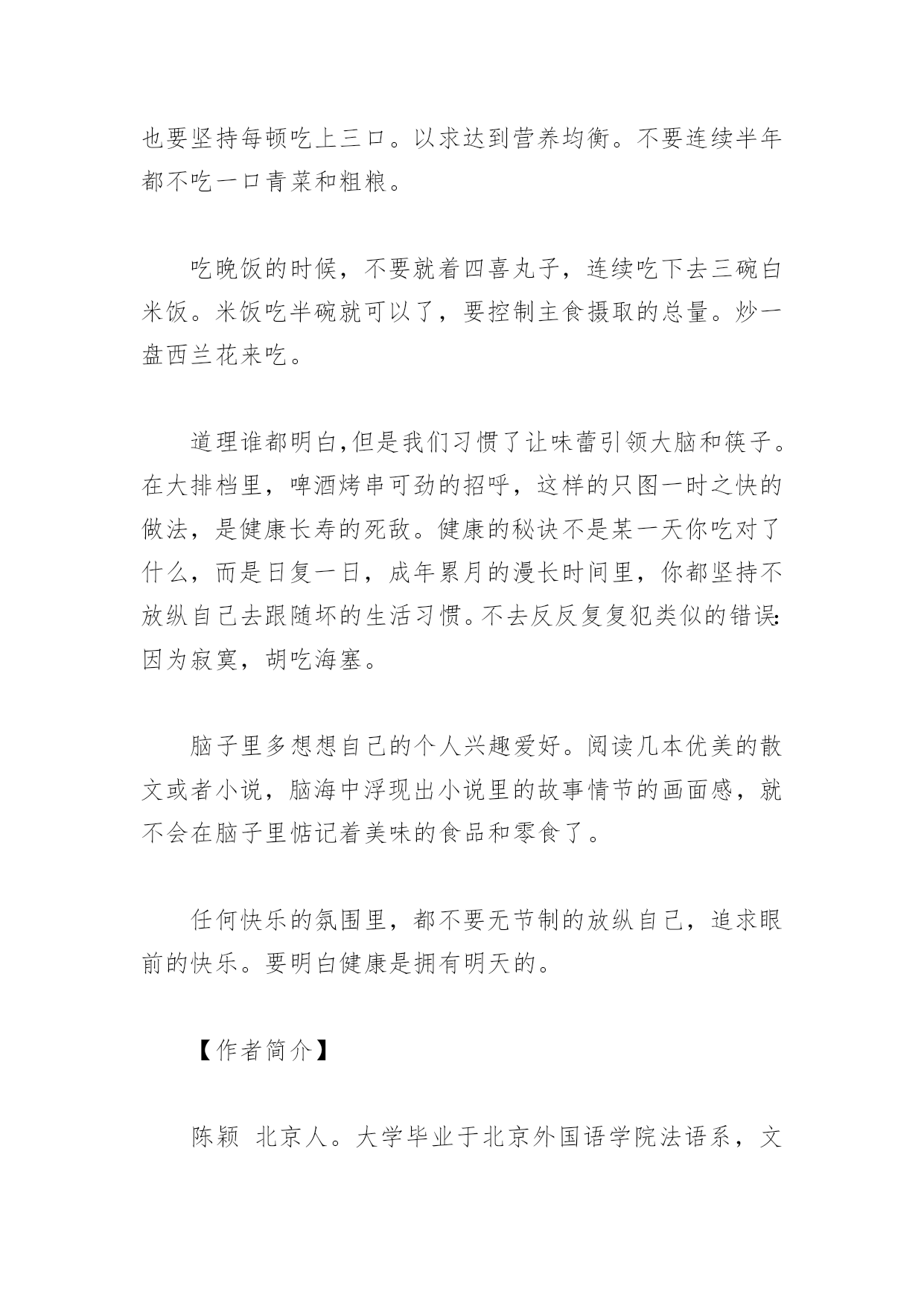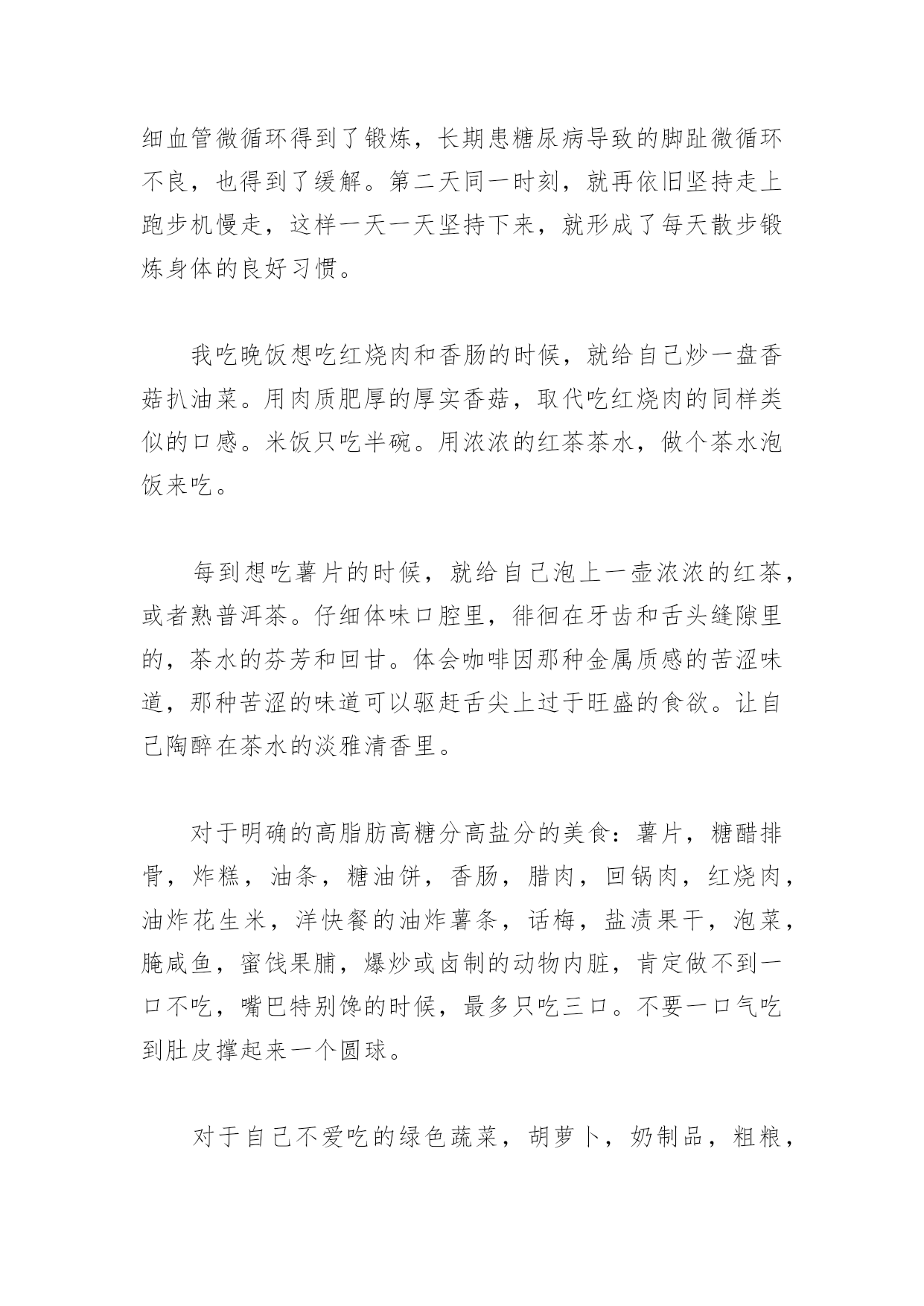 健康是自我修炼健康是自我修炼文/陈颖要想获得健康,长命百岁,不是依靠吃什么名贵的仙丹补药,而是养成日复一日的良好的生活习惯,约束自己的过分行为,让生活变得有规律,使自己的生物钟按照一定的节奏运转下去。这是一场漫长的自我修行。在平淡的每一天里坚持,在节假日的狂欢里也要坚持,面对任何诱惑都不会忘乎所以。想要做到这些,说起来容易,其实很困难。要打败两大敌人:平淡的普通日子里,精神上的空虚寂寞;节假日的狂欢气氛里放纵自我的各类诱惑。我退休后拥有了大把的空闲时间,一个人面对赤裸裸真实的自己,精神空虚,感到无所事事。就想做点什么出格的事情,来发泄一下压抑的情绪。最简单直接的就是暴饮暴食。在看电视的时候随手乱抓零食来吃,猛吃薯片一类的油炸食品和膨化食品,天长地久,腰围上长出来许多肥肉,五脏六腑被脂肪包裹,影响了他们的正常运作。从而疾病丛生,患上了高血脂症和糖尿病。我见到过不少美食爱好者朋友,一到过年过节,亲朋好友相聚一堂,有说有笑,心情大好。面对着堆积如山的美酒佳肴,哪里还有记性惦记着减肥和自我节制?先大快朵颐,美美的饱餐一顿再说。此时此刻,心脑血管的健康问题被抛到了脑后。结果暴饮暴食,引发急性胰腺炎,住进医院里去抢救。本来活蹦乱跳的人,被自己的放纵搞得命悬一线。改掉自己的坏的生活习惯,很不容易。正所谓:江山易改,本性难移。坏的生活习惯也有他固定的节奏,一到时间点上,酒鬼的酒瘾,老烟枪的烟瘾,老吃货的馋瘾,就会找上门来,开始动摇你自我节制的决心。往往是,生病住进了医院,听了医生的告诫,有了一些危机感,饮食开始注意节制,生活起居也有了规律。但是一回到家,尤其是我,看到亲人妈妈给做的美食,遇到节日和同学聚会,聊天聊到开心处,面对美味佳肴,又开始忘乎所以。又开始乱吃零食,走入一个恶性的循环。自我节制是一个漫长的要持之以恒的自我修行。单一的仰仗自己的意志力是很不够的。要用一套良好的生活习惯替代以往的坏习惯。在看电视的时候,就不要坐着老吃薯片,站起来,到跑步机上慢走一个小时。一边看电视剧一边慢慢的走。既散步锻炼了身体,又坚持看完了一个冗长的平淡的电视剧,平日里看不进去的细节现在都记住了。脚底板的毛细血管微循环得到了锻炼,长期患糖尿病导致的脚趾微循环不良,也得到了缓解。第二天同一时刻,就再依旧坚持走上跑步机慢走,这样一天一天坚持下来,就形成了每天散步锻炼身体的良好习惯。我吃晚饭想吃红烧肉和香肠的时候,就给自己炒一盘香菇扒油菜。用肉质肥厚的厚实香菇,取代吃红烧肉的同样类似的口感。米饭只吃半碗。用浓浓的红茶茶水,做个茶水泡饭来吃。每到想吃薯片的时候,就给自己泡上一壶浓浓的红茶,或者熟普洱茶。仔细体味口腔里,徘徊在牙齿和舌头缝隙里的,茶水的芬芳和回甘。体会咖啡因那种金属质感的苦涩味道,那种苦涩的味道可以驱赶舌尖上过于旺盛的食欲。让自己陶醉在茶水的淡雅清香里。对于明确的高脂肪高糖分高盐分的美食:薯片,糖醋排骨,炸糕,油条,糖油饼,香肠,腊肉,回锅肉,红烧肉,油炸花生米,洋快餐的油炸薯条,话梅,盐渍果干,泡菜,腌咸鱼,蜜饯果脯,爆炒或卤制的动物内脏,肯定做不到一口不吃,嘴巴特别馋的时候,最多只吃三口。不要一口气吃到肚皮撑起来一个圆球。对于自己不爱吃的绿色蔬菜,胡萝卜,奶制品,粗粮,也要坚持每顿吃上三口。以求达到营养均衡。不要连续半年都不吃一口青菜和粗粮。吃晚饭的时候,不要就着四喜丸子,连续吃下去三碗白米饭。米饭吃半碗就可以了,要控制主食摄取的总量。炒一盘西兰花来吃。道理谁都明白,但是我们习惯了让味蕾引领大脑和筷子。在大排档里,啤酒烤串可劲的招呼,这样的只图一时之快的做法,是健康长寿的死敌。健康的秘诀不是某一天你吃对了什么,而是日复一日,成年累月的漫长时间里,你都坚持不放纵自己去跟随坏的生活习惯。不去反反复复犯类似的错误:因为寂寞,胡吃海塞。脑子里多想想自己的个人兴趣爱好。阅读几本优美的散文或者小说,脑海中浮现出小说里的故事情节的画面感,就不会在脑子里惦记着美味的食品和零食了。任何快乐的氛围里,都不要无节制的放纵自己,追求眼前的快乐。要明白健康是拥有明天的。【作者简介】陈颖北京人。大学毕业于北京外国语学院法语系,文学学士。工作于华润集团。现已退休。喜欢品茶。热爱文学写作。坚持十二年,写博客一千五百余篇。热衷传播茶文化,宣传环境保护理念。