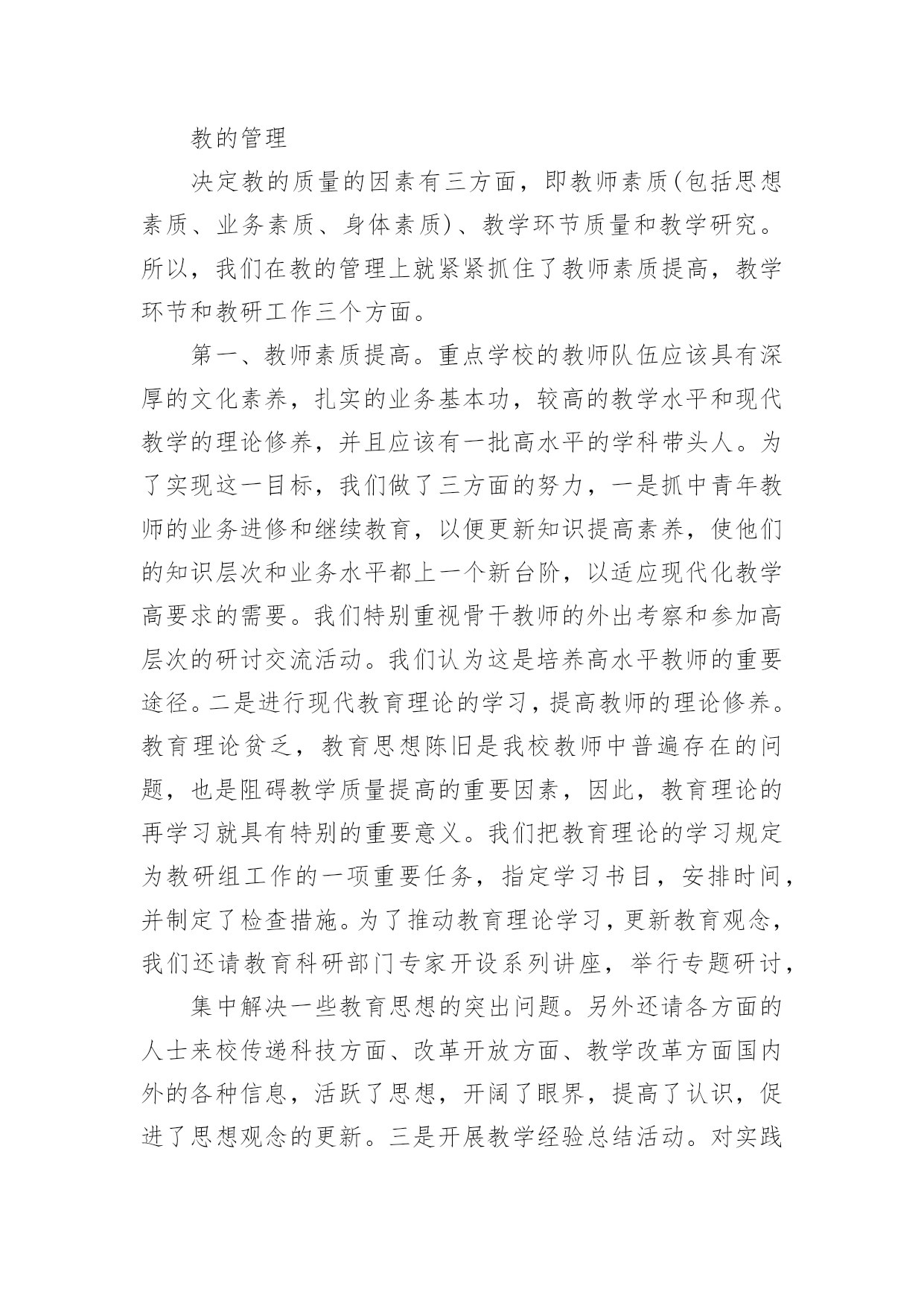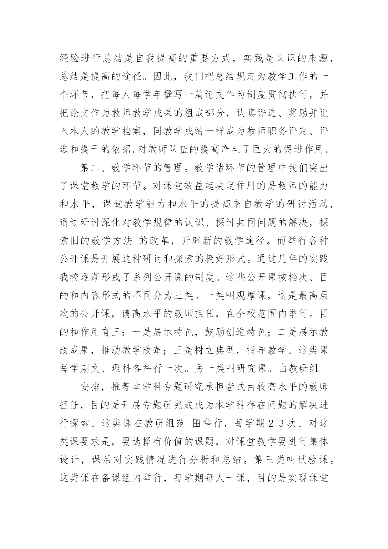 小学教育教学管理论文教学工作是有目的有计划的活动,要提高质量必须靠管理,教学工作是个系统工程,它由多个要素构成,要发挥教学的整体功能也要靠管理。教学是一个动态过程,要对教和学的众多环节实行控制,取得效益还要靠管理。管理是一门科学,要想搞好教学管理,必须认真探索教学管理的科学化之路,几年来我们在教学管理的科学化道路上进行探索和实践,积累了一定的经验,形成了自己的一整套管理方法,它们概括起来有四条:一是以质量为中心实行全面管理;二是以规范化为内容实行制度化管理;三是健全检查、评价、激励机制,实行效率管理;四是以民主和科研为手段实行科学管理。在教学管理中必须树立质量中心观念和全面管理观念,因为提高质量是教学管理的目的,也是教学管理追求的目标,还是检验教学管理效果的标准,所以质量应该成为管理的中心。而质量的提高又必须通过全面管理来实现。质量是教学各项工作的综合效果的表现,离开了全面的管理,就不可能有质量的提高。因此,以质量为中心实行全面管理应该成为教学管理的一大原则。什么叫全项管理?教师和学生是教学系统的两大要素,教和学是教学工作的两个基本方面,教学质量由教的质量和学的质量决定,因此,全面管理就是既要抓教的管理,又要抓学的管理,并把二者有机地结合起来。教的管理决定教的质量的因素有三方面,即教师素质(包括思想素质、业务素质、身体素质)、教学环节质量和教学研究。所以,我们在教的管理上就紧紧抓住了教师素质提高,教学环节和教研工作三个方面。第一、教师素质提高。重点学校的教师队伍应该具有深厚的文化素养,扎实的业务基本功,较高的教学水平和现代教学的理论修养,并且应该有一批高水平的学科带头人。为了实现这一目标,我们做了三方面的努力,一是抓中青年教师的业务进修和继续教育,以便更新知识提高素养,使他们的知识层次和业务水平都上一个新台阶,以适应现代化教学高要求的需要。我们特别重视骨干教师的外出考察和参加高层次的研讨交流活动。我们认为这是培养高水平教师的重要途径。二是进行现代教育理论的学习,提高教师的理论修养。教育理论贫乏,教育思想陈旧是我校教师中普遍存在的问题,也是阻碍教学质量提高的重要因素,因此,教育理论的再学习就具有特别的重要意义。我们把教育理论的学习规定为教研组工作的一项重要任务,指定学习书目,安排时间,并制定了检查措施。为了推动教育理论学习,更新教育观念,我们还请教育科研部门专家开设系列讲座,举行专题研讨,集中解决一些教育思想的突出问题。另外还请各方面的人士来校传递科技方面、改革开放方面、教学改革方面国内外的各种信息,活跃了思想,开阔了眼界,提高了认识,促进了思想观念的更新。三是开展教学经验总结活动。对实践经验进行总结是自我提高的重要方式,实践是认识的来源,总结是提高的途径。因此,我们把总结规定为教学工作的一个环节,把每人每学年撰写一篇论文作为制度贯彻执行,并把论文作为教师教学成果的组成部分,认真评选、奖励并记入本人的教学档案,同教学成绩一样成为教师职务评定、评选和提干的依据。对教师队伍的提高产生了巨大的促进作用。第二、教学环节的管理。教学诸环节的管理中我们突出了课堂教学的环节。对课堂效益起决定作用的是教师的能力和水平,课堂教学能力和水平的提高来自教学的研讨活动,通过研讨深化对教学规律的认识、探讨共同问题的解决,探索旧的教学方法的改革,开辟新的教学途径。而举行各种公开课是开展这种研讨和探索的极好形式。通过几年的实践我校逐渐形成了系列公开课的制度。这些公开课按档次、目的和内容形式的不同分为三类。一类叫观摩课,这是最高层次的公开课,请高水平的教师担任,在全校范围内举行。目的和作用有三:一是展示特色,鼓励创造特色;二是展示教改成果,推动教学改革;三是树立典型,指导教学。这类课每学期文、理科各举行一次。另一类叫研究课。由教研组安排,推荐本学科专题研究承担者或由较高水平的教师担任,目的是开展专题研究或成为本学科存在问题的解决进行探索。这类课在教研组范围举行,每学期2-3次。对这类课要求是,要选择有价值的课题,对课堂教学要进行集体设计,课后对实践情况进行分析和总结。第三类叫试验课。这类课在备课组内举行,每学期每人一课,目的是实现课堂教学研究的群众化,把全体教师都吸引到教学改革的研究中来。这三个层次的公开课均实行一课一研讨的办法,就是每次公开课后要有不同形式的研讨会。这样就形成了每学期的公开课系列和研讨系列,每学期全校仅校级和学科级的公开课就有20多个,要举办20多次研讨,这一系列的教学活动有力地推动了教学质量和教师水平的提高.