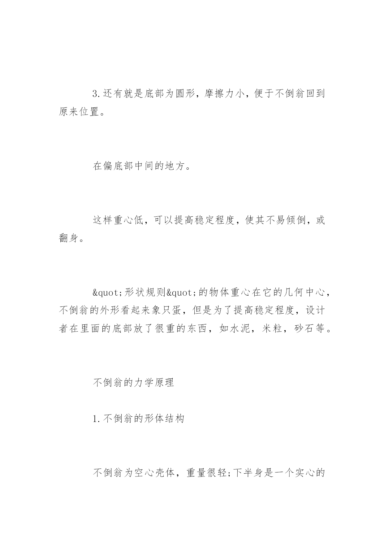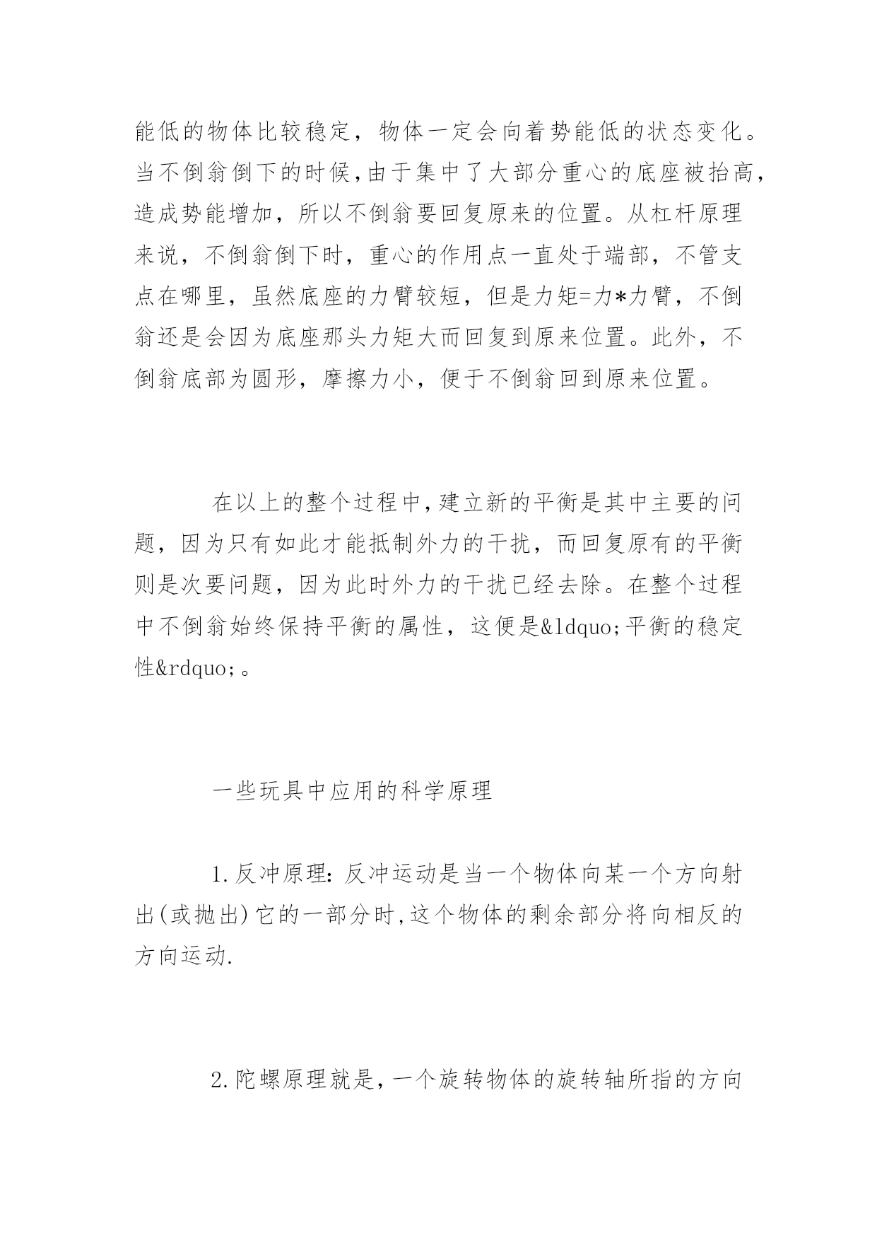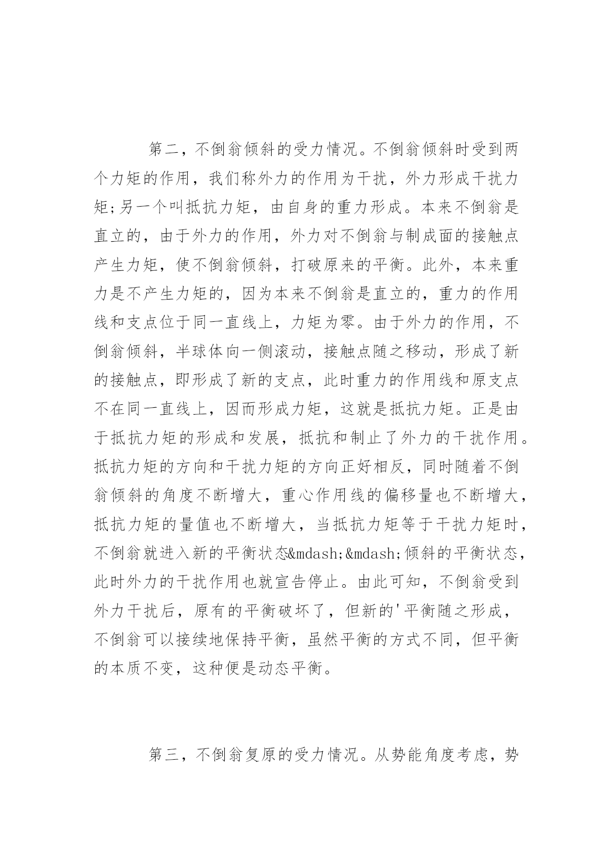 不倒翁的科学与力学原理介绍不倒翁的科学与力学原理介绍不倒翁大家都有玩过,但是大家知道不倒翁的一些科学原理吗?下面是百分网小编为你精心推荐的不倒翁科学原理,希望对您有所帮助。不倒翁的科学原理1.势能低的物体比较稳定,物体一定会向着势能低的状态变化。当不倒翁倒下的时候,由于集中了大部分重心的底座被抬高,造成势能增加,所以不倒翁要回复原来的位置。2.从杠杆原理来说,不倒翁倒下时,重心的作用点一直处于端部,不管支点在哪里,虽然底座的力臂较短,但是力矩=力*力臂,不倒翁还是会因为底座那头力矩大而回复到原来位置。3.还有就是底部为圆形,摩擦力小,便于不倒翁回到原来位置。在偏底部中间的地方。这样重心低,可以提高稳定程度,使其不易倾倒,或翻身。"形状规则"的物体重心在它的几何中心,不倒翁的外形看起来象只蛋,但是为了提高稳定程度,设计者在里面的底部放了很重的东西,如水泥,米粒,砂石等。不倒翁的力学原理1.不倒翁的形体结构不倒翁为空心壳体,重量很轻;下半身是一个实心的半球体,重量较大,不倒翁的重心就在半球体之内。下面的半球体和支承面之间有一个接触点,这个半球体在支承面上滚动时,接触点的位置就要发生改变。不倒翁始终用一个接触点站立在支承面上,它永远是一个独脚体。2.不倒翁的平衡的稳定性不倒翁在受到外力的作用时,就要失去平衡,而在外力去除后,不倒翁能自行回复到平衡状态,这说明不倒翁具有一种抵抗外力干扰保持平衡的能力,这就是平衡的稳定性。这种抵抗干扰保持平衡的能力的形成,应该从不倒翁的受力情况来看。3.不倒翁的受力情况有三种第一,不倒翁平衡的受力情况。不倒翁在桌面上,受到两个外力的作用:一个是重力G,地球对不倒翁的吸引力;另一个是支持力,桌面对牛球体的反作用力。根据物体的平衡条件,只要这两个力大小相等、方向相反、作用在一条直线上,不倒翁就能够保持平衡的状态。第二,不倒翁倾斜的受力情况。不倒翁倾斜时受到两个力矩的作用,我们称外力的作用为干扰,外力形成干扰力矩;另一个叫抵抗力矩,由自身的重力形成。本来不倒翁是直立的,由于外力的作用,外力对不倒翁与制成面的接触点产生力矩,使不倒翁倾斜,打破原来的平衡。此外,本来重力是不产生力矩的,因为本来不倒翁是直立的,重力的作用线和支点位于同一直线上,力矩为零。由于外力的作用,不倒翁倾斜,半球体向一侧滚动,接触点随之移动,形成了新的接触点,即形成了新的支点,此时重力的作用线和原支点不在同一直线上,因而形成力矩,这就是抵抗力矩。正是由于抵抗力矩的形成和发展,抵抗和制止了外力的干扰作用。抵抗力矩的方向和干扰力矩的方向正好相反,同时随着不倒翁倾斜的角度不断增大,重心作用线的偏移量也不断增大,抵抗力矩的量值也不断增大,当抵抗力矩等于干扰力矩时,不倒翁就进入新的平衡状态——倾斜的平衡状态,此时外力的干扰作用也就宣告停止。由此可知,不倒翁受到外力干扰后,原有的平衡破坏了,但新的'平衡随之形成,不倒翁可以接续地保持平衡,虽然平衡的方式不同,但平衡的本质不变,这种便是动态平衡。第三,不倒翁复原的受力情况。从势能角度考虑,势能低的物体比较稳定,物体一定会向着势能低的状态变化。当不倒翁倒下的时候,由于集中了大部分重心的底座被抬高,造成势能增加,所以不倒翁要回复原来的位置。从杠杆原理来说,不倒翁倒下时,重心的作用点一直处于端部,不管支点在哪里,虽然底座的力臂较短,但是力矩=力*力臂,不倒翁还是会因为底座那头力矩大而回复到原来位置。此外,不倒翁底部为圆形,摩擦力小,便于不倒翁回到原来位置。在以上的整个过程中,建立新的平衡是其中主要的问题,因为只有如此才能抵制外力的干扰,而回复原有的平衡则是次要问题,因为此时外力的干扰已经去除。在整个过程中不倒翁始终保持平衡的属性,这便是“平衡的稳定性”。一些玩具中应用的科学原理1.反冲原理:反冲运动是当一个物体向某一个方向射出(或抛出)它的一部分时,这个物体的剩余部分将向相反的方向运动.2.陀螺原理就是,一个旋转物体的旋转轴所指的方向在不受外力影响时,是不会改变的。人们根据这个道理,用它来保持方向,制造出来的东西就叫陀螺仪。我们骑自行车其实也是利用了这个原理。轮子转得越快越不容易倒,因为车轴有一股保持水平的力量。陀螺仪在工作时要给它一个力,使它快速旋转起来,一般能达到每分钟几十万转,可以工作很长时间。然后用多种方法读取轴所指示的方向,并自动将数据信号传给控制系统。3.不倒翁原理:使重力的作用线偏离支点,使重力对支点产生力矩,即抵抗力距。由于不倒翁倾斜的角度不断增大,重力作用线的偏移量随之增大,抵抗力矩也随之增大,最终实现和外力力矩的平衡,不倒翁抵抗外力干扰、保持平衡的能力就是这样形成的。4.发条