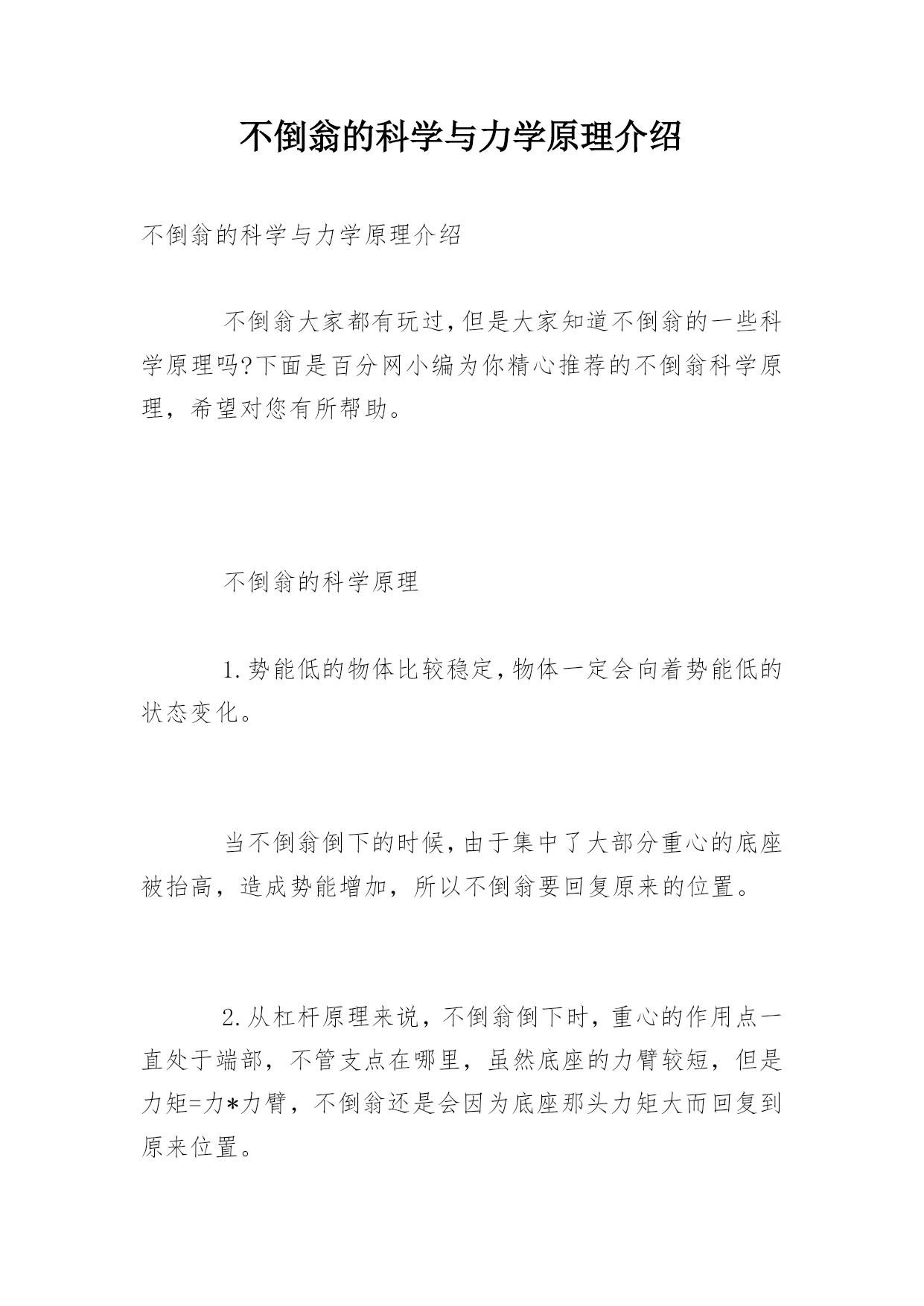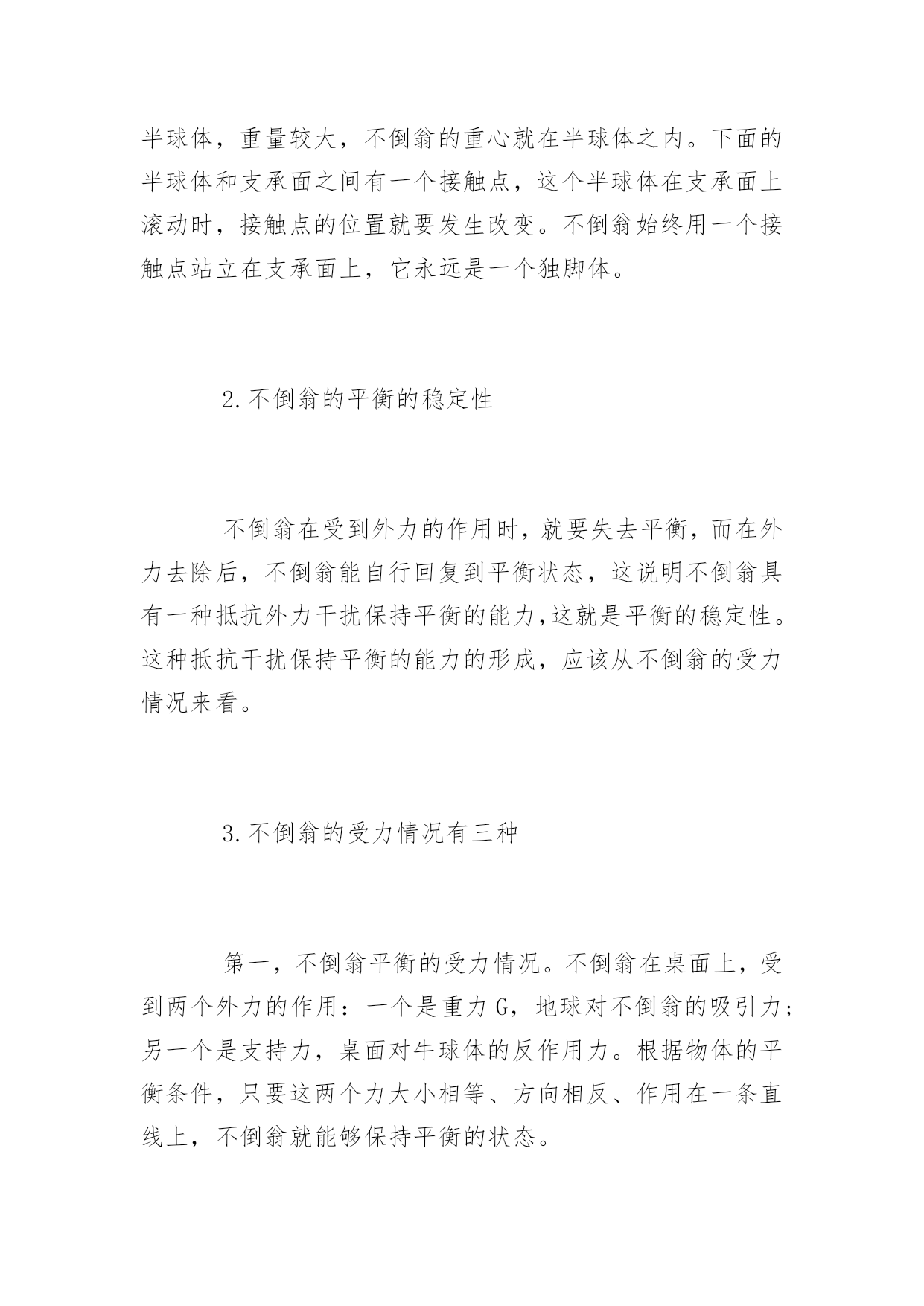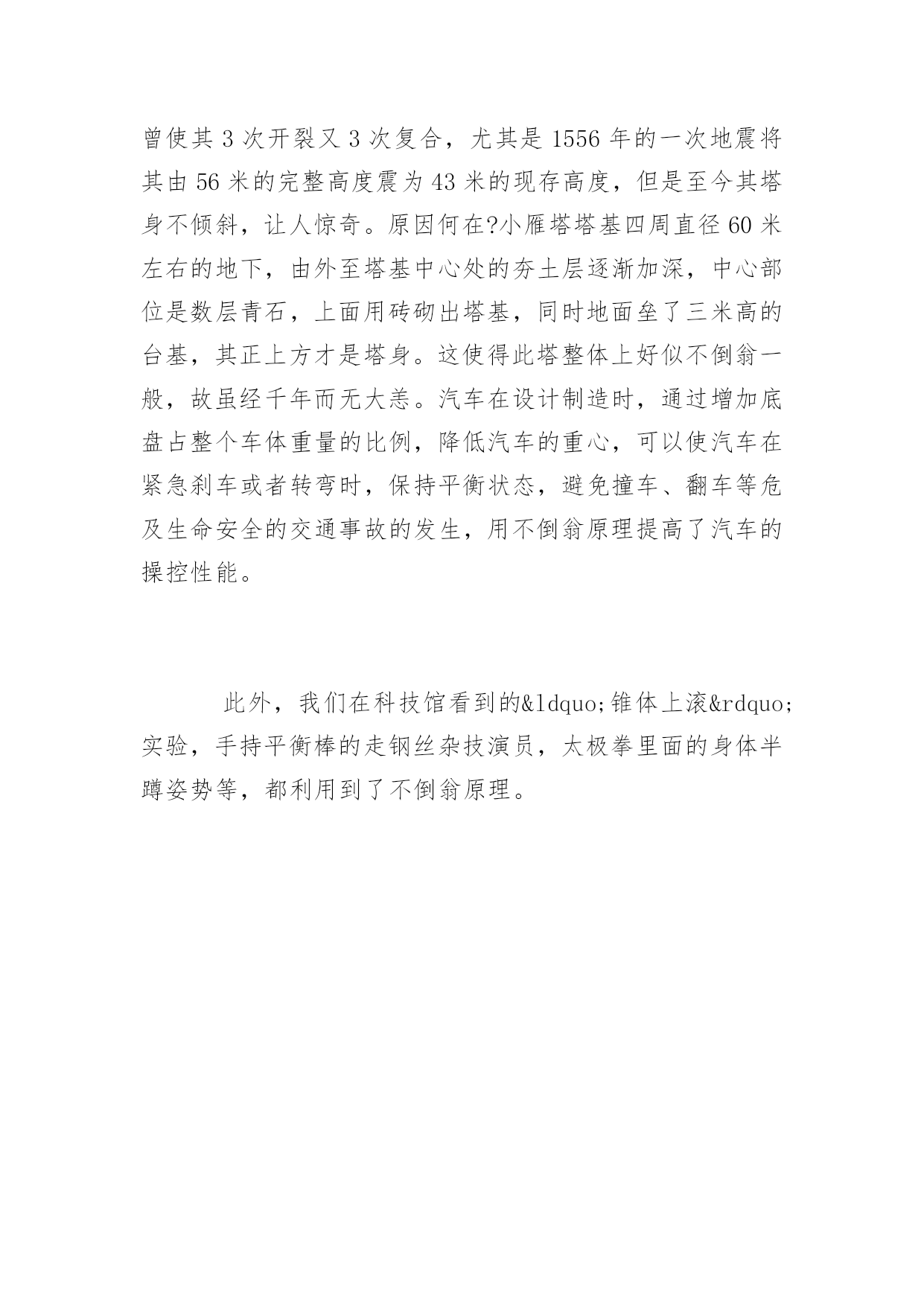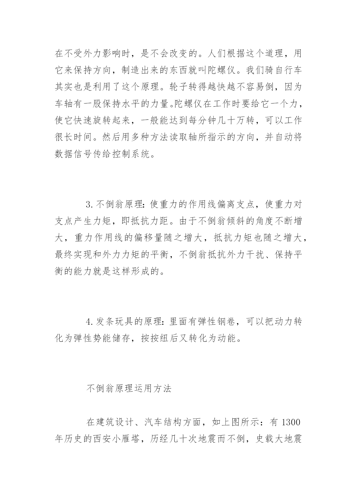 不倒翁的科学与力学原理介绍不倒翁的科学与力学原理介绍不倒翁大家都有玩过,但是大家知道不倒翁的一些科学原理吗?下面是百分网小编为你精心推荐的不倒翁科学原理,希望对您有所帮助。不倒翁的科学原理1.势能低的物体比较稳定,物体一定会向着势能低的状态变化。当不倒翁倒下的时候,由于集中了大部分重心的底座被抬高,造成势能增加,所以不倒翁要回复原来的位置。2.从杠杆原理来说,不倒翁倒下时,重心的作用点一直处于端部,不管支点在哪里,虽然底座的力臂较短,但是力矩=力*力臂,不倒翁还是会因为底座那头力矩大而回复到原来位置。3.还有就是底部为圆形,摩擦力小,便于不倒翁回到原来位置。在偏底部中间的地方。这样重心低,可以提高稳定程度,使其不易倾倒,或翻身。"形状规则"的物体重心在它的几何中心,不倒翁的外形看起来象只蛋,但是为了提高稳定程度,设计者在里面的底部放了很重的东西,如水泥,米粒,砂石等。不倒翁的力学原理1.不倒翁的形体结构不倒翁为空心壳体,重量很轻;下半身是一个实心的半球体,重量较大,不倒翁的重心就在半球体之内。下面的半球体和支承面之间有一个接触点,这个半球体在支承面上滚动时,接触点的位置就要发生改变。不倒翁始终用一个接触点站立在支承面上,它永远是一个独脚体。2.不倒翁的平衡的稳定性不倒翁在受到外力的作用时,就要失去平衡,而在外力去除后,不倒翁能自行回复到平衡状态,这说明不倒翁具有一种抵抗外力干扰保持平衡的能力,这就是平衡的稳定性。这种抵抗干扰保持平衡的能力的形成,应该从不倒翁的受力情况来看。3.不倒翁的受力情况有三种第一,不倒翁平衡的受力情况。不倒翁在桌面上,受到两个外力的作用:一个是重力G,地球对不倒翁的吸引力;另一个是支持力,桌面对牛球体的反作用力。根据物体的平衡条件,只要这两个力大小相等、方向相反、作用在一条直线上,不倒翁就能够保持平衡的状态。第二,不倒翁倾斜的受力情况。不倒翁倾斜时受到两个力矩的作用,我们称外力的作用为干扰,外力形成干扰力矩;另一个叫抵抗力矩,由自身的重力形成。本来不倒翁是直立的,由于外力的作用,外力对不倒翁与制成面的接触点产生力矩,使不倒翁倾斜,打破原来的平衡。此外,本来重力是不产生力矩的,因为本来不倒翁是直立的,重力的作用线和支点位于同一直线上,力矩为零。由于外力的作用,不倒翁倾斜,半球体向一侧滚动,接触点随之移动,形成了新的接触点,即形成了新的支点,此时重力的作用线和原支点不在同一直线上,因而形成力矩,这就是抵抗力矩。正是由于抵抗力矩的形成和发展,抵抗和制止了外力的干扰作用。抵抗力矩的方向和干扰力矩的方向正好相反,同时随着不倒翁倾斜的角度不断增大,重心作用线的偏移量也不断增大,抵抗力矩的量值也不断增大,当抵抗力矩等于干扰力矩时,不倒翁就进入新的平衡状态——倾斜的平衡状态,此时外力的干扰作用也就宣告停止。由此可知,不倒翁受到外力干扰后,原有的平衡破坏了,但新的'平衡随之形成,不倒翁可以接续地保持平衡,虽然平衡的方式不同,但平衡的本质不变,这种便是动态平衡。第三,不倒翁复原的受力情况。从势能角度考虑,势能低的物体比较稳定,物体一定会向着势能低的状态变化。当不倒翁倒下的时候,由于集中了大部分重心的底座被抬高,造成势能增加,所以不倒翁要回复原来的位置。从杠杆原理来说,不倒翁倒下时,重心的作用点一直处于端部,不管支点在哪里,虽然底座的力臂较短,但是力矩=力*力臂,不倒翁还是会因为底座那头力矩大而回复到原来位置。此外,不倒翁底部为圆形,摩擦力小,便于不倒翁回到原来位置。在以上的整个过程中,建立新的平衡是其中主要的问题,因为只有如此才能抵制外力的干扰,而回复原有的平衡则是次要问题,因为此时外力的干扰已经去除。在整个过程中不倒翁始终保持平衡的属性,这便是“平衡的稳定性”。一些玩具中应用的科学原理1.反冲原理:反冲运动是当一个物体向某一个方向射出(或抛出)它的一部分时,这个物体的剩余部分将向相反的方向运动.2.陀螺原理就是,一个旋转物体的旋转轴所指的方向在不受外力影响时,是不会改变的。人们根据这个道理,用它来保持方向,制造出来的东西就叫陀螺仪。我们骑自行车其实也是利用了这个原理。轮子转得越快越不容易倒,因为车轴有一股保持水平的力量。陀螺仪在工作时要给它一个力,使它快速旋转起来,一般能达到每分钟几十万转,可以工作很长时间。然后用多种方法读取轴所指示的方向,并自动将数据信号传给控制系统。3.不倒翁原理:使重力的作用线偏离支点,使重力对支点产生力矩,即抵抗力距。由于不倒翁倾斜的角度不断增大,重力作用线的偏移量随之增大,抵抗力矩也随之增大,最终实现和外力力矩的平衡,不倒翁抵抗外力干扰、保持平衡的能力就是这样形成的。4.发条