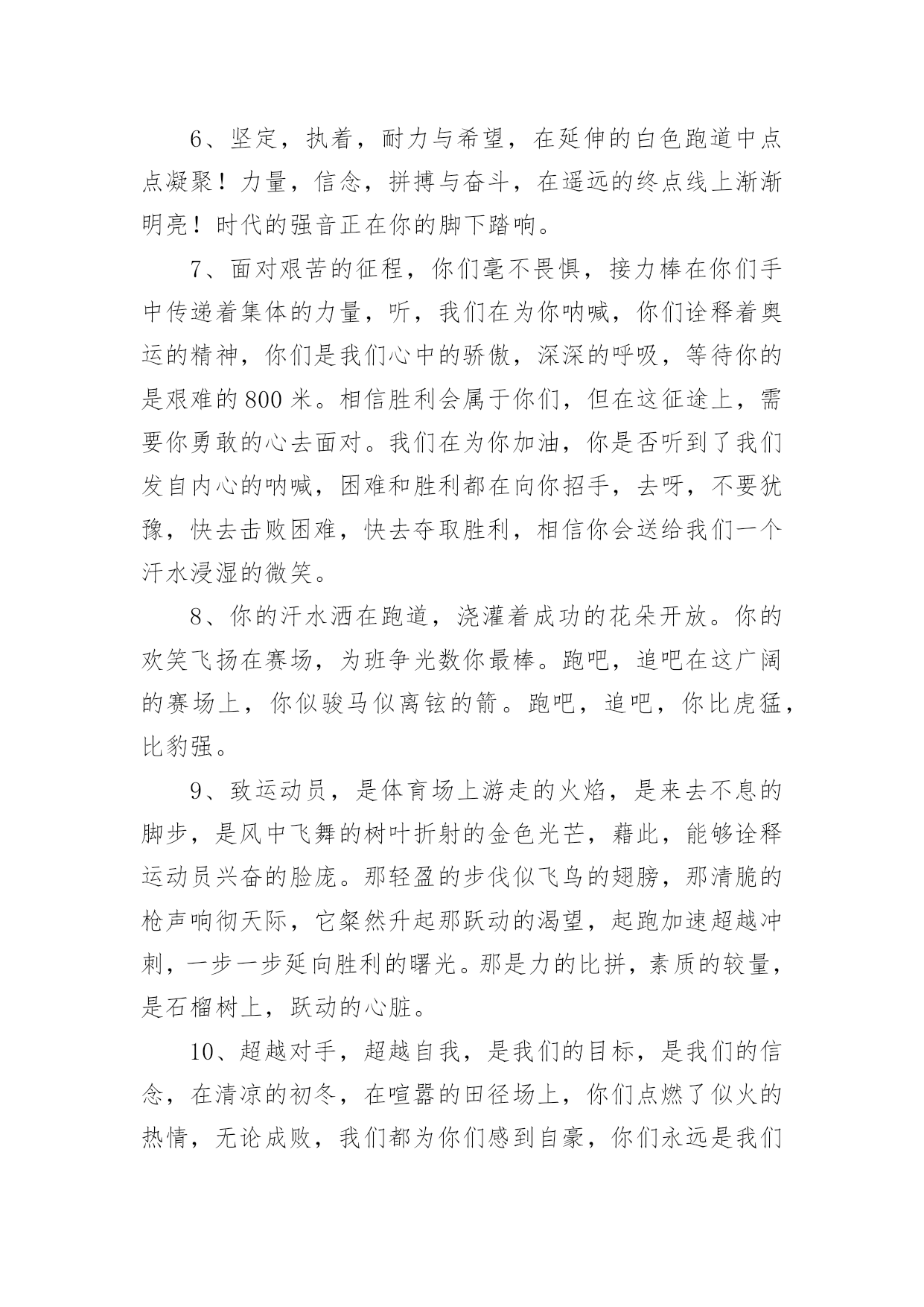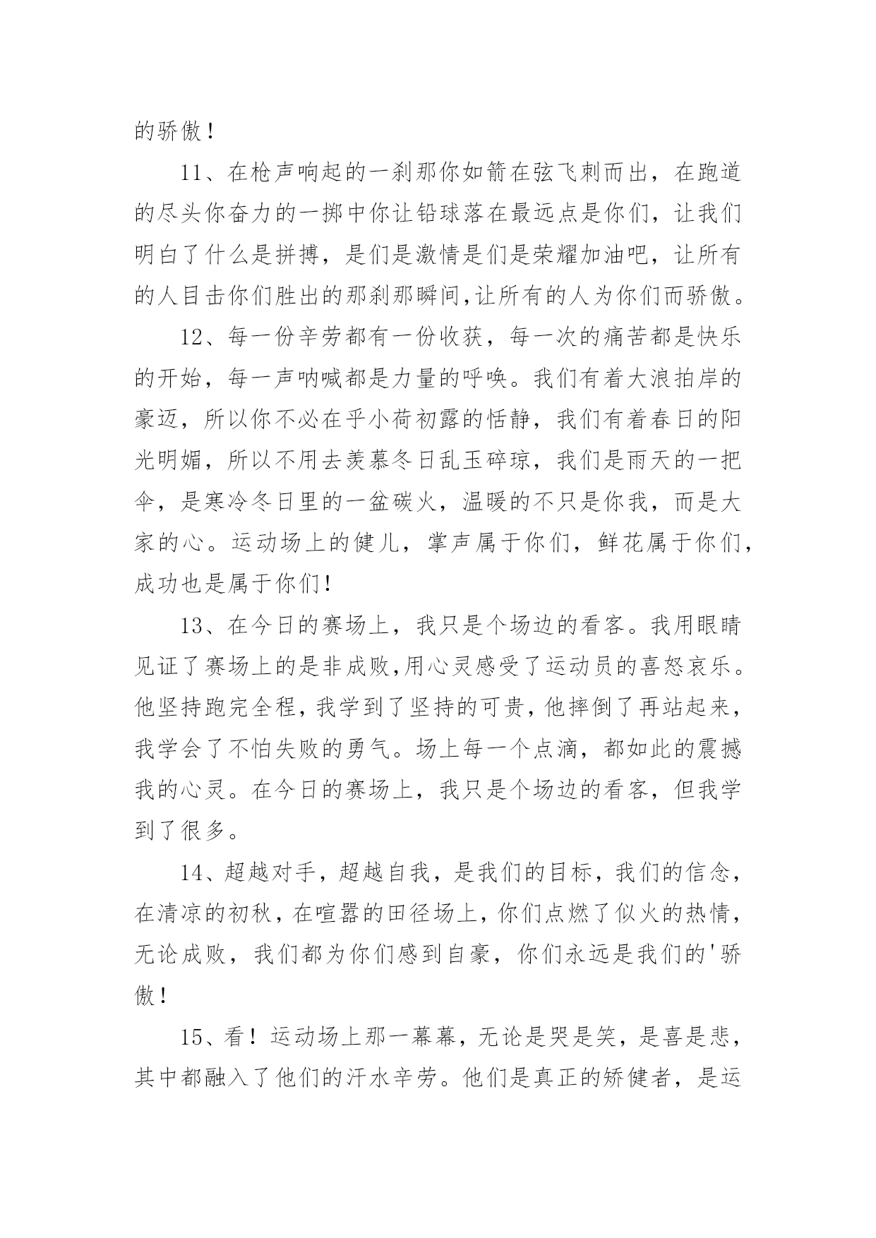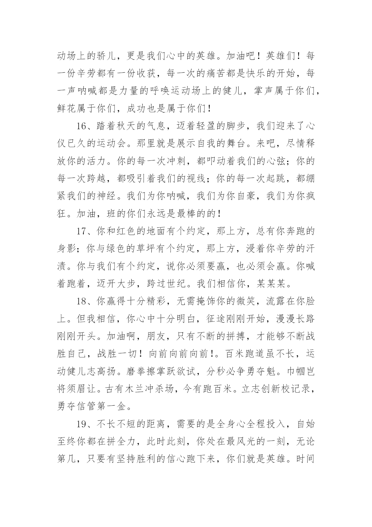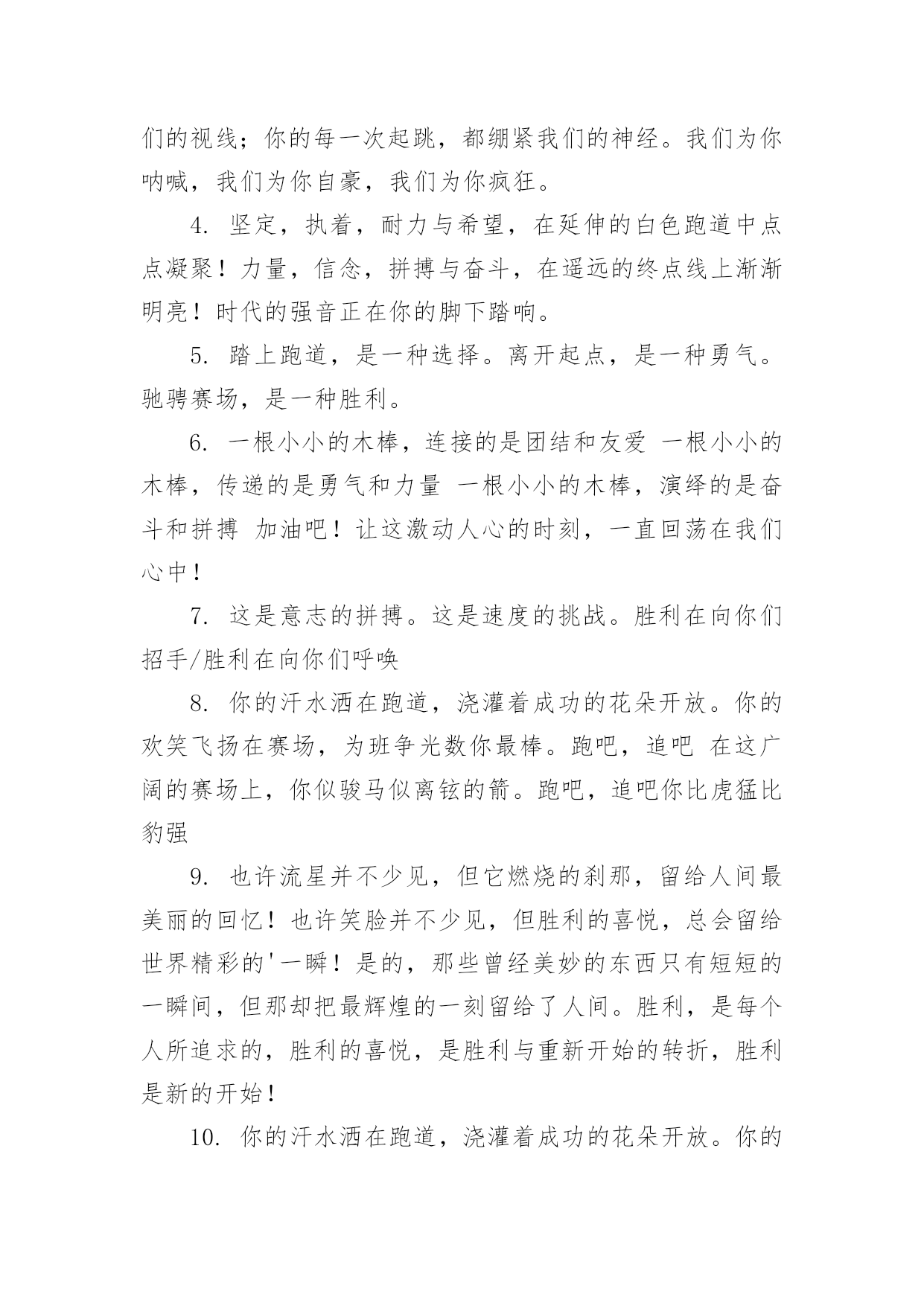 秋季运动会的加油稿在日常生活和工作中,能够利用到加油稿的场合越来越多,加油稿可以增添对方必胜的勇气和信心。写加油稿的注意事项有许多,你确定会写吗?以下是小编收集整理的秋季运动会的加油稿,仅供参考,大家一起来看看吧。秋季运动会的加油稿1一声枪响班着飒爽的秋风,你们亮出自己的风采,在这短短的100米中,你们与时间争分夺秒,只为了那最后的冲刺。不管结果如何,你们都是胜利者。因为,你们曾与时间竞赛。致长跑运动员磨炼的`是你那非凡的毅力,较量的是你那超常的体力,拼搏的是你那出类拔萃的耐久力.把长长的跑道跑出一段漫漫的征途,听!呼啸的风儿为你喝彩,看!飘扬的彩旗为你加油,加油吧!为了到达终点时那一刻的辉煌!秋季运动会的加油稿2迎接你的,是五千米跑道等待你的,是漫漫征途勇敢的`冲吧,勇士们不要畏惧对手的强大你的对手只有自己勇敢的冲吧五千米算不得什么付出的汗水就要得到回报胜利的泪水就要顺颊而下秋风会为你喝彩阳光会为你庆功掌声就要为你响起秋季运动会的加油稿3亲爱的运动员们,不论你们是否会获得第一,你们都会得到观众的赞美和鼓励。因为在观众的心中,运动员们都发挥出了不屈不挠,顽强拼搏的体育精神。这种不断超越自我的精神是个人的巨大财富,更是将来能够走得更高更远的稳固基石。你们是运动场上的勇士。每一项的竞赛都是意志对体能的超越,每一个坚持到最后的成绩,都是对目标的不懈追求。纵然是雄关漫道,纵然是千山万险——运动的旗帜永远飘扬,运动的脚步永远向前。不断超越,正是体育蕴含的精神,也正是人生追求的'精神写照。让我们用运动实现自己的梦想,用运动写意我们的人生,让“我运动,我健康,我快乐”的口号伴随我们茁壮成长!秋季运动会的加油稿41.今天的阳光似乎格外艳丽,大早起来太阳就老高了。街边,树在笑,花在笑,连汽车也欢快的叫着。我还没到24中就听到里边传来的喊声,广播声,忙加快了脚步往里跑着。今天可是一年一度的运动会呀!2.呵,大家都来了,我刚坐下,运动会就在响亮的国歌声中拉开了序幕。3.先看看跳高吧。现在比赛的是初二男子组,横杆好高哇,差不多和我的海拔一样了,不知道他们跳不跳的过去。一个高高的男生轻轻松松的跑了几步,脚一跨便过去了,后面几个也都是如此。我不禁想:“这么简单也太没挑战性了吧?”谁知难的还在后头呢!横杆被升高后,个矮的男生根本跳不过去,高个的也加长了跑步距离,有的.男生跑道一半要跳的时候却不敢跑了。轮到我们班的罗亮了,大家都把视线投向了他。预备,起跑,跳!哎,差点就跳过了,可是却碰上了横杆,让杆子落地了。看台上叹息声一片。4.接力赛是每界运动会的传统项目,也是最吸引眼球的比赛。还没开始跑道就被“观战”,助威,加油,呐喊甚至看热闹的同学围了个水泄不通,我是挤破脑袋也没冲进去,只是在场外还能听到嘲杂的加油声和掉棒的叹息声以及一阵阵紧张的尖叫声。体育的确无限神奇呀,她最大魅力就是能让所有人为之激动。5.我所能看的最清楚的是男子1500米。笪笠在第1组跑了个第5名,单拓在第2组。“砰”的一声枪响了,我还来不及说“比赛开始”他们就已经飞出了几十米,再一看,“飞人们”已经到我面前的跑道上了。单拓以微弱优势领先着,大伙为他的领先很着急:“他不能一开始就跑那么快,不然待会儿没劲了的。单拓,你跑慢点呀!”果然,到他们第二次跑到我面前时,单拓被别人领先了。“单拓,加油!单拓,加油!”我们更卖力的喊着。别班的同学不甘示弱,也扯着嗓子喊加油。有的人甚至跑到操场和运动员一起跑,有的站在操场上拿着水,等自班的运动员跑来递给他们,接到水的运动员都不喝,而是往头上泼,浇完一瓶就顺手一丢。我循思这动作,这场景似曾相识,原来是在奥运会的竞走比赛中出现过。跑到最后一圈时,所有人的脚步都慢了下来。连老师都焦急的喊着:“不行了就下来,不跑了。”可是没有一个人停下来,似乎走也要走到终点。体育魅力之二就是能让不同的人为一个目标不懈奋斗,那就是――荣誉!6.运动会结束了,但那种团结,拼搏,竞争精神仍在;运动会又包含了多少人格魅力,精神魅力?愿运动精神永不衰,且为之歌,为之祝福!秋季运动会的加油稿51、你赢得十分精彩,无需掩饰你的微笑,流露在你脸上。但我相信,你心中十分明白,征途刚刚开始,漫漫长路刚刚开头。加油啊,朋友,只有不断的拼搏,才可以不断战胜自己,战胜一切!向前、向前、向前!2、年轻的我们自信飞扬,青春的气息如同出生的朝阳,蓬勃的力量如同阳光的挥洒。此时此刻,跑道便是我们精彩的舞台,声声加油便是我们的奖项!论何成功,谈何荣辱,心中的信念只有一个:拼搏!3、铿锵玫瑰或许会有人认为赛场是男生的天下,但在赛场上却活跃着许多女生的身影。他们与男生一样驰骋赛场,拼搏赛场,也与男生一样拥有了胜利的喜悦,拥有了令人羡慕的掌声与鲜花;他们的飒爽风姿引人注目,在他们身上折射出有如女足运动员般的坚定新年与不屈精