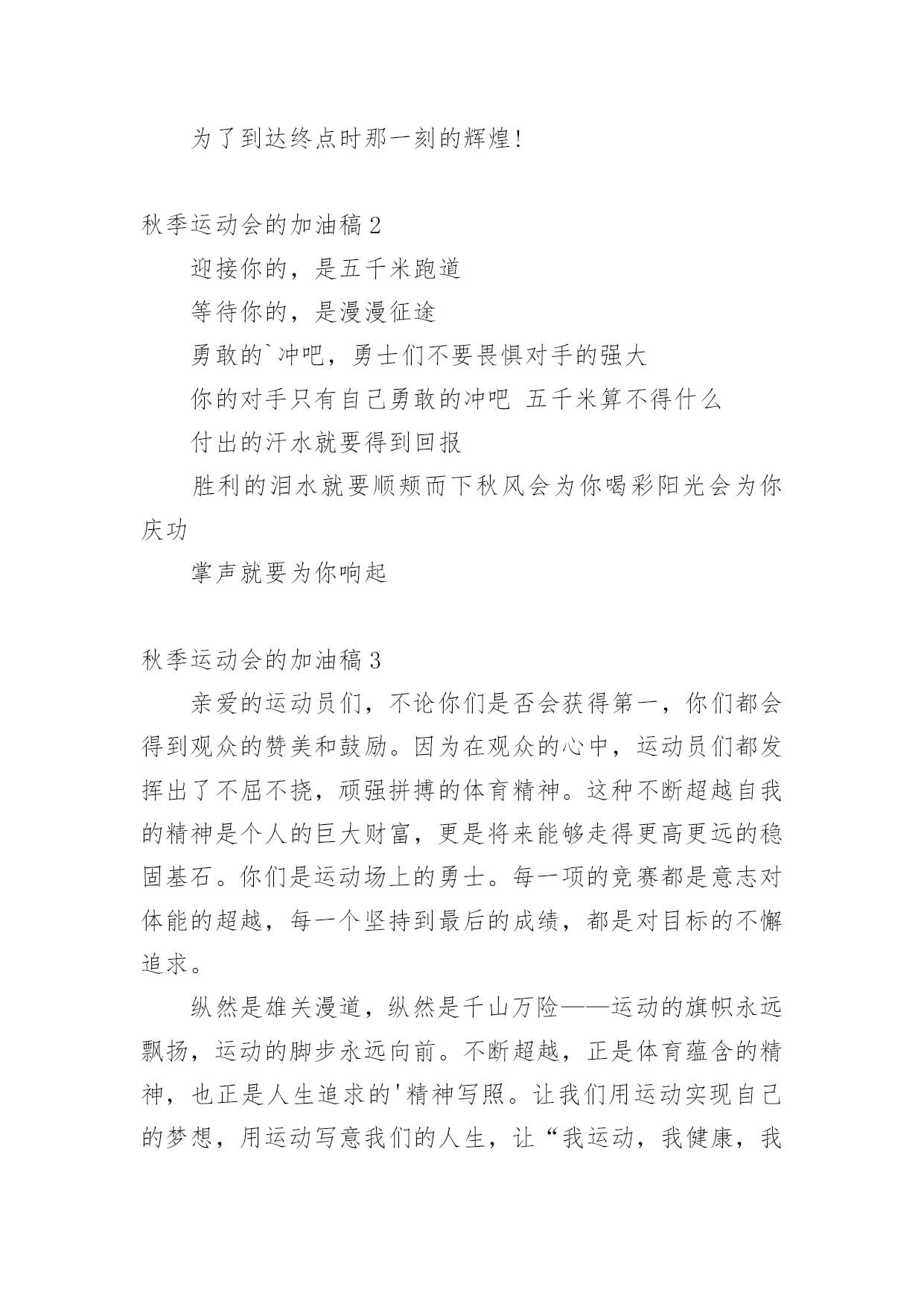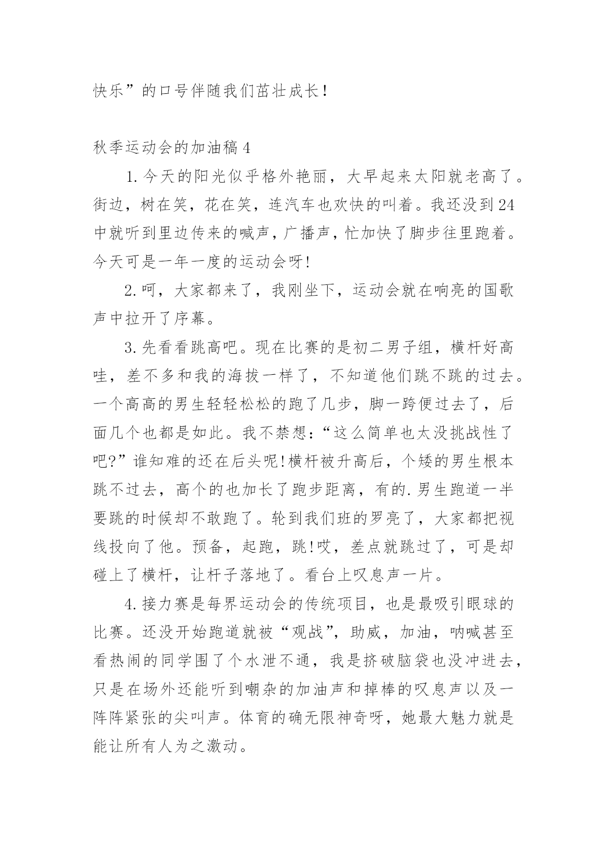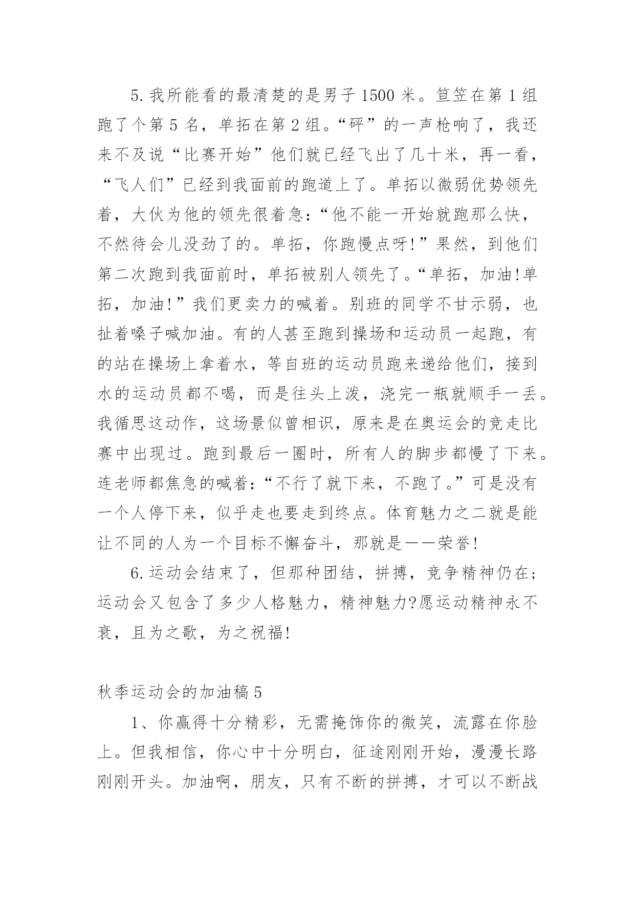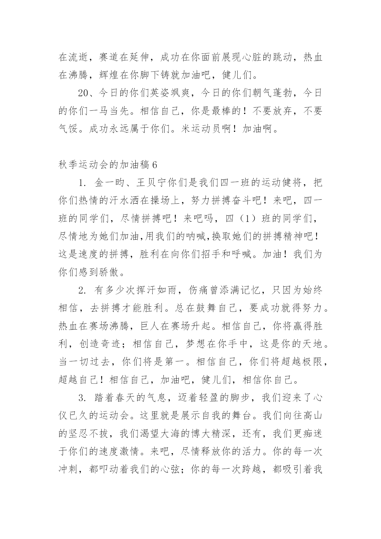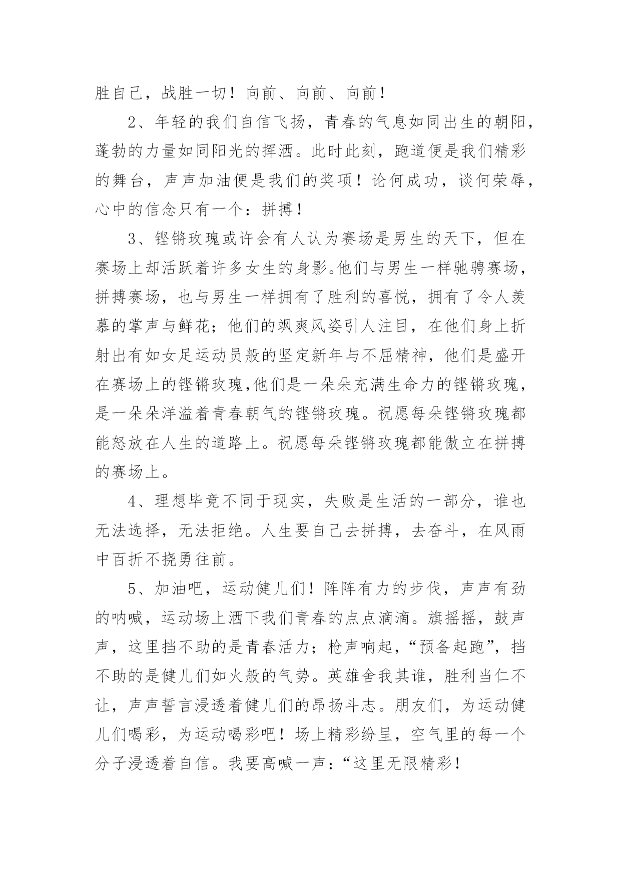 秋季运动会的加油稿在日常生活和工作中,能够利用到加油稿的场合越来越多,加油稿可以增添对方必胜的勇气和信心。写加油稿的注意事项有许多,你确定会写吗?以下是小编收集整理的秋季运动会的加油稿,仅供参考,大家一起来看看吧。秋季运动会的加油稿1一声枪响班着飒爽的秋风,你们亮出自己的风采,在这短短的100米中,你们与时间争分夺秒,只为了那最后的冲刺。不管结果如何,你们都是胜利者。因为,你们曾与时间竞赛。致长跑运动员磨炼的`是你那非凡的毅力,较量的是你那超常的体力,拼搏的是你那出类拔萃的耐久力.把长长的跑道跑出一段漫漫的征途,听!呼啸的风儿为你喝彩,看!飘扬的彩旗为你加油,加油吧!为了到达终点时那一刻的辉煌!秋季运动会的加油稿2迎接你的,是五千米跑道等待你的,是漫漫征途勇敢的`冲吧,勇士们不要畏惧对手的强大你的对手只有自己勇敢的冲吧五千米算不得什么付出的汗水就要得到回报胜利的泪水就要顺颊而下秋风会为你喝彩阳光会为你庆功掌声就要为你响起秋季运动会的加油稿3亲爱的运动员们,不论你们是否会获得第一,你们都会得到观众的赞美和鼓励。因为在观众的心中,运动员们都发挥出了不屈不挠,顽强拼搏的体育精神。这种不断超越自我的精神是个人的巨大财富,更是将来能够走得更高更远的稳固基石。你们是运动场上的勇士。每一项的竞赛都是意志对体能的超越,每一个坚持到最后的成绩,都是对目标的不懈追求。纵然是雄关漫道,纵然是千山万险——运动的旗帜永远飘扬,运动的脚步永远向前。不断超越,正是体育蕴含的精神,也正是人生追求的'精神写照。让我们用运动实现自己的梦想,用运动写意我们的人生,让“我运动,我健康,我快乐”的口号伴随我们茁壮成长!秋季运动会的加油稿41.今天的阳光似乎格外艳丽,大早起来太阳就老高了。街边,树在笑,花在笑,连汽车也欢快的叫着。我还没到24中就听到里边传来的喊声,广播声,忙加快了脚步往里跑着。今天可是一年一度的运动会呀!2.呵,大家都来了,我刚坐下,运动会就在响亮的国歌声中拉开了序幕。3.先看看跳高吧。现在比赛的是初二男子组,横杆好高哇,差不多和我的海拔一样了,不知道他们跳不跳的过去。一个高高的男生轻轻松松的跑了几步,脚一跨便过去了,后面几个也都是如此。我不禁想:“这么简单也太没挑战性了吧?”谁知难的还在后头呢!横杆被升高后,个矮的男生根本跳不过去,高个的也加长了跑步距离,有的.男生跑道一半要跳的时候却不敢跑了。轮到我们班的罗亮了,大家都把视线投向了他。预备,起跑,跳!哎,差点就跳过了,可是却碰上了横杆,让杆子落地了。看台上叹息声一片。4.接力赛是每界运动会的传统项目,也是最吸引眼球的比赛。还没开始跑道就被“观战”,助威,加油,呐喊甚至看热闹的同学围了个水泄不通,我是挤破脑袋也没冲进去,只是在场外还能听到嘲杂的加油声和掉棒的叹息声以及一阵阵紧张的尖叫声。体育的确无限神奇呀,她最大魅力就是能让所有人为之激动。5.我所能看的最清楚的是男子1500米。笪笠在第1组跑了个第5名,单拓在第2组。“砰”的一声枪响了,我还来不及说“比赛开始”他们就已经飞出了几十米,再一看,“飞人们”已经到我面前的跑道上了。单拓以微弱优势领先着,大伙为他的领先很着急:“他不能一开始就跑那么快,不然待会儿没劲了的。单拓,你跑慢点呀!”果然,到他们第二次跑到我面前时,单拓被别人领先了。“单拓,加油!单拓,加油!”我们更卖力的喊着。别班的同学不甘示弱,也扯着嗓子喊加油。有的人甚至跑到操场和运动员一起跑,有的站在操场上拿着水,等自班的运动员跑来递给他们,接到水的运动员都不喝,而是往头上泼,浇完一瓶就顺手一丢。我循思这动作,这场景似曾相识,原来是在奥运会的竞走比赛中出现过。跑到最后一圈时,所有人的脚步都慢了下来。连老师都焦急的喊着:“不行了就下来,不跑了。”可是没有一个人停下来,似乎走也要走到终点。体育魅力之二就是能让不同的人为一个目标不懈奋斗,那就是――荣誉!6.运动会结束了,但那种团结,拼搏,竞争精神仍在;运动会又包含了多少人格魅力,精神魅力?愿运动精神永不衰,且为之歌,为之祝福!秋季运动会的加油稿51、你赢得十分精彩,无需掩饰你的微笑,流露在你脸上。但我相信,你心中十分明白,征途刚刚开始,漫漫长路刚刚开头。加油啊,朋友,只有不断的拼搏,才可以不断战胜自己,战胜一切!向前、向前、向前!2、年轻的我们自信飞扬,青春的气息如同出生的朝阳,蓬勃的力量如同阳光的挥洒。此时此刻,跑道便是我们精彩的舞台,声声加油便是我们的奖项!论何成功,谈何荣辱,心中的信念只有一个:拼搏!3、铿锵玫瑰或许会有人认为赛场是男生的天下,但在赛场上却活跃着许多女生的身影。他们与男生一样驰骋赛场,拼搏赛场,也与男生一样拥有了胜利的喜悦,拥有了令人羡慕的掌声与鲜花;他们的飒爽风姿引人注目,在他们身上折射出有如女足运动员般的坚定新年与不屈精