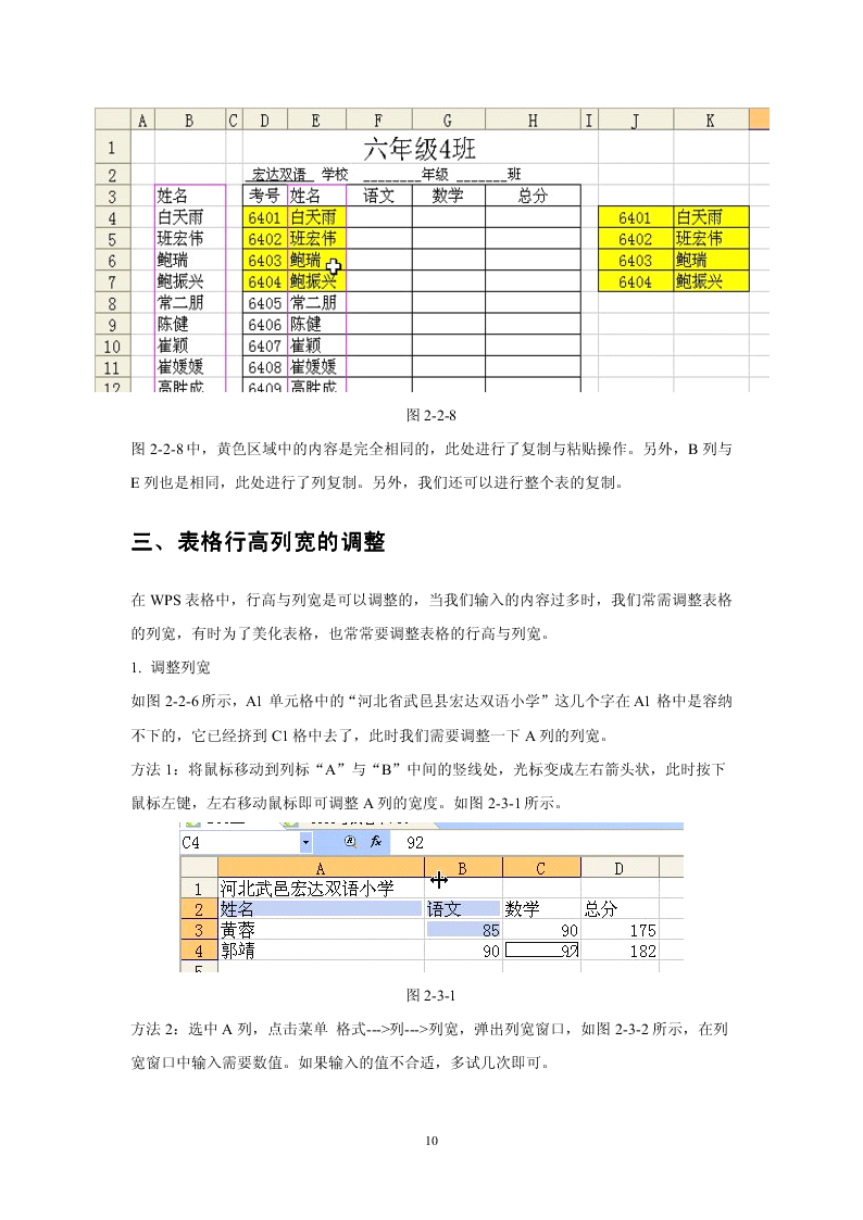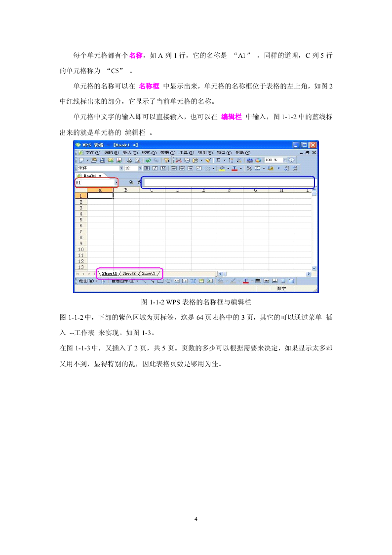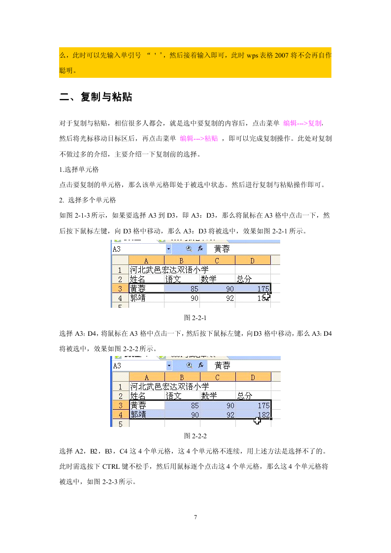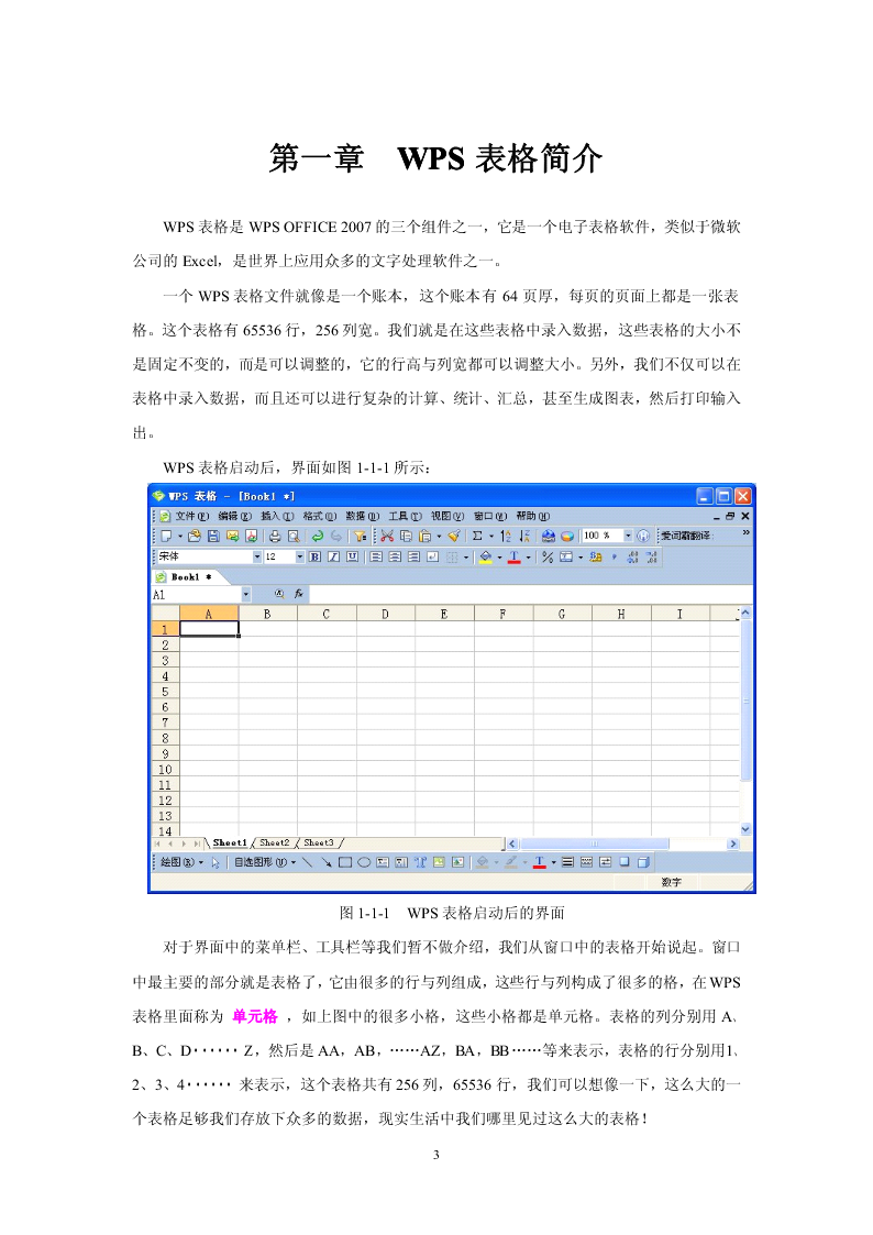 WPS表格初级教程目录第一章WPS表格简介简单的介绍wps表格,让大家对wps表格有个初步认识第二章WPS表格简单的编辑1简单的介绍一下文字的录入,复制,粘贴,表格大小的调整,第三章表格的美化合并拆分,对齐,字体字号颜色,边框与底纹第四章WPS表格的编辑2插入删除移动工作表,查找、替换、填充,自定义序列,清除格式,单元格。第五章用公式和函数进行计算用几个例子介绍一下wps表格的计算第六章数据处理排序、筛选、分类汇总等第七章插入图表介绍如何制作图表。第八章WPS表格其它常用操作1.工具栏设置2.页面设置3.工具选项第九章delphi操作wps表格(以上内容为暂定)2WPS表格初级教程第一章WPSWPS表格简介WPS表格是WPSOFFICE2007的三个组件之一,它是一个电子表格软件,类似于微软公司的Excel,是世界上应用众多的文字处理软件之一。一个WPS表格文件就像是一个账本,这个账本有64页厚,每页的页面上都是一张表格。这个表格有65536行,256列宽。我们就是在这些表格中录入数据,这些表格的大小不是固定不变的,而是可以调整的,它的行高与列宽都可以调整大小。另外,我们不仅可以在表格中录入数据,而且还可以进行复杂的计算、统计、汇总,甚至生成图表,然后打印输入出。WPS表格启动后,界面如图1-1-1所示:图1-1-1WPS表格启动后的界面对于界面中的菜单栏、工具栏等我们暂不做介绍,我们从窗口中的表格开始说起。窗口中最主要的部分就是表格了,它由很多的行与列组成,这些行与列构成了很多的格,在WPS表格里面称为单元格,如上图中的很多小格,这些小格都是单元格。表格的列分别用A、B、C、D······Z,然后是AA,AB,……AZ,BA,BB……等来表示,表格的行分别用1、2、3、4······来表示,这个表格共有256列,65536行,我们可以想像一下,这么大的一个表格足够我们存放下众多的数据,现实生活中我们哪里见过这么大的表格!3WPS表格初级教程每个单元格都有个名称,如A列1行,它的名称是“A1”,同样的道理,C列5行的单元格称为“C5”。单元格的名称可以在名称框中显示出来,单元格的名称框位于表格的左上角,如图2中红线标出来的部分,它显示了当前单元格的名称。单元格中文字的输入即可以直接输入,也可以在编辑栏中输入,图1-1-2中的蓝线标出来的就是单元格的编辑栏。图1-1-2WPS表格的名称框与编辑栏图1-1-2中,下部的紫色区域为页标签,这是64页表格中的3页,其它的可以通过菜单插入--工作表来实现。如图1-3。在图1-1-3中,又插入了2页,。页数的多少可以根据需要来决定,如果显示太多却又用不到,显得特别的乱,因此表格页数是够用为佳。4WPS表格初级教程图1-1-351/40011/4001WPS表格初级教程第二章WPSWPS表格文字编辑(一)一、文字文字录入录入在WPS表格中的文字录入操作很简单,在WPS表格中有两种方法录入文字。第1种方法:首先点击要录入文字的单元格,然后直接用输入文字即可,如图2-1-1。图2-1-1第2种方法:选中要录入文字的单元格,然后将光标移至编辑栏中,在编辑栏中输入要录入的文字,如图2-1-2。图2-1-2这两种方法都可以实现文字的录入,但第1种方法还直观,第2种方法适合录入较多的内容。另外,录入公式时也常在编辑栏中录入。通过以上,我们可以在表格中录入任意的内容,如图2-1-3。图2-1-3一点注意事项:我们输入下列内容,如身份证号码、1/41/4、001等,对于这样的内容,wps表格会智能优化,身份证号码由于数据过大,它会以科学计数法的形式显示,1/41/4会显示为1月4日,001会显示为1。对于这种情况有时很方便,但有时我们想输入什么就显示什6WPS表格初级教程么,此时可以先输入单引号“'”,然后接着输入即可,此时wps表格2007将不会再自作聪明。二、复制与粘贴二、复制与粘贴对于复制与粘贴,相信很多人都会,就是选中要复制的内容后,点击菜单编辑--->复制,然后将光标移动目标区后,再点击菜单编辑--->粘贴,即可以完成复制操作。此处对复制不做过多的介绍,主要介绍一下复制前的选择。1.选择单元格点击要复制的单元格,那么该单元格即处于被选中状态。然后进行复制与粘贴操作即可。2.选择多个单元格如图2-1-3所示,如果要选择A3到D3,即A3:D3