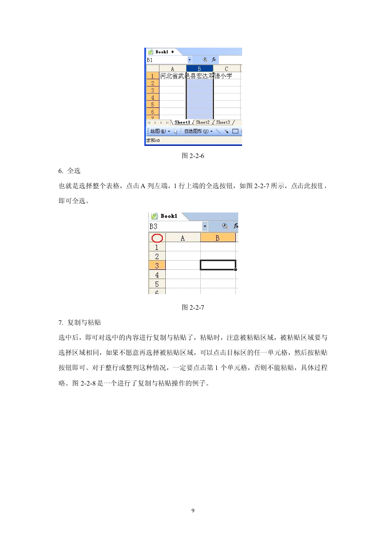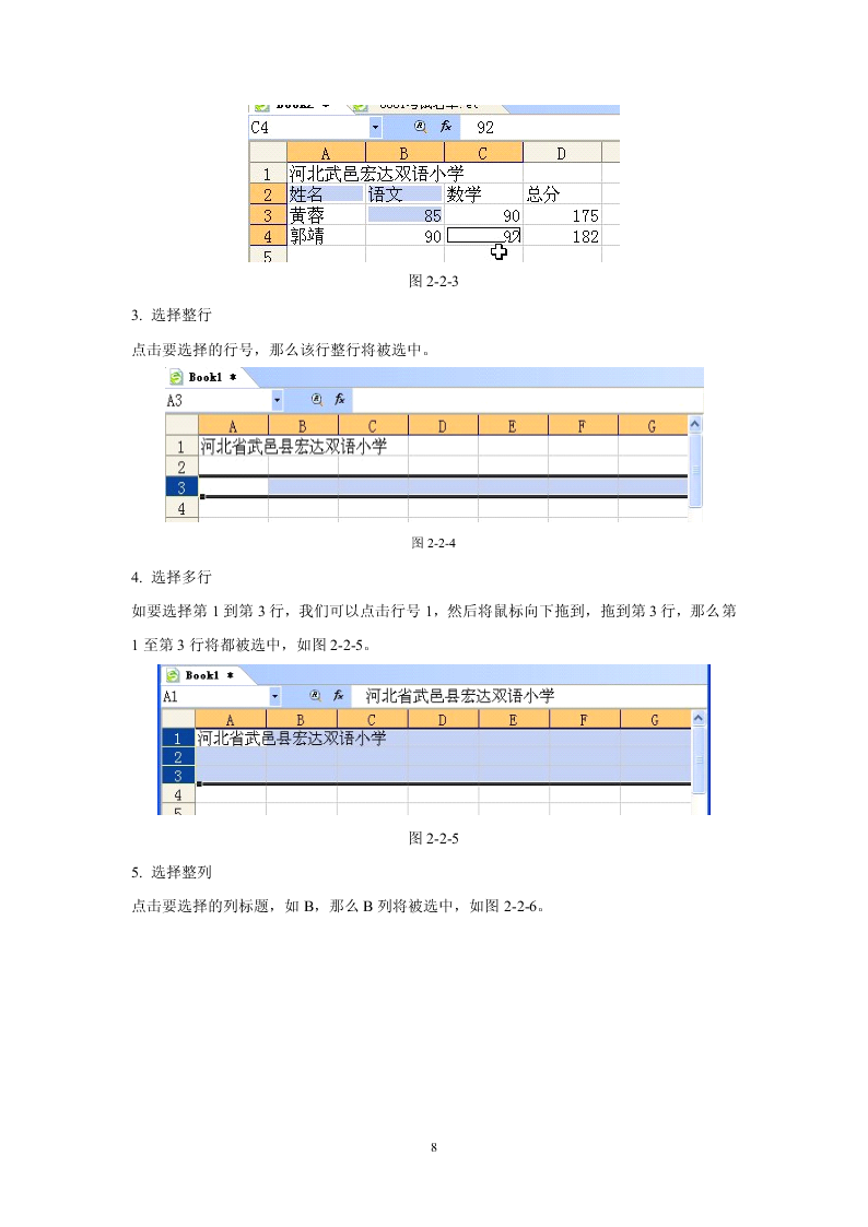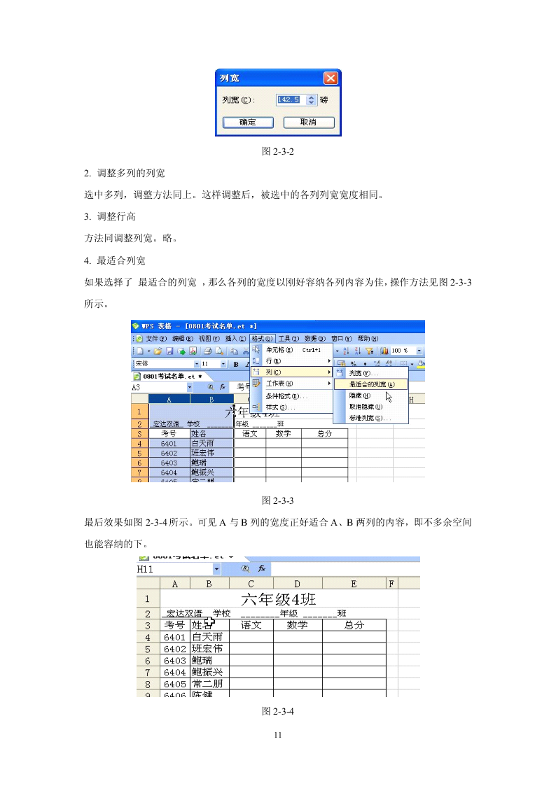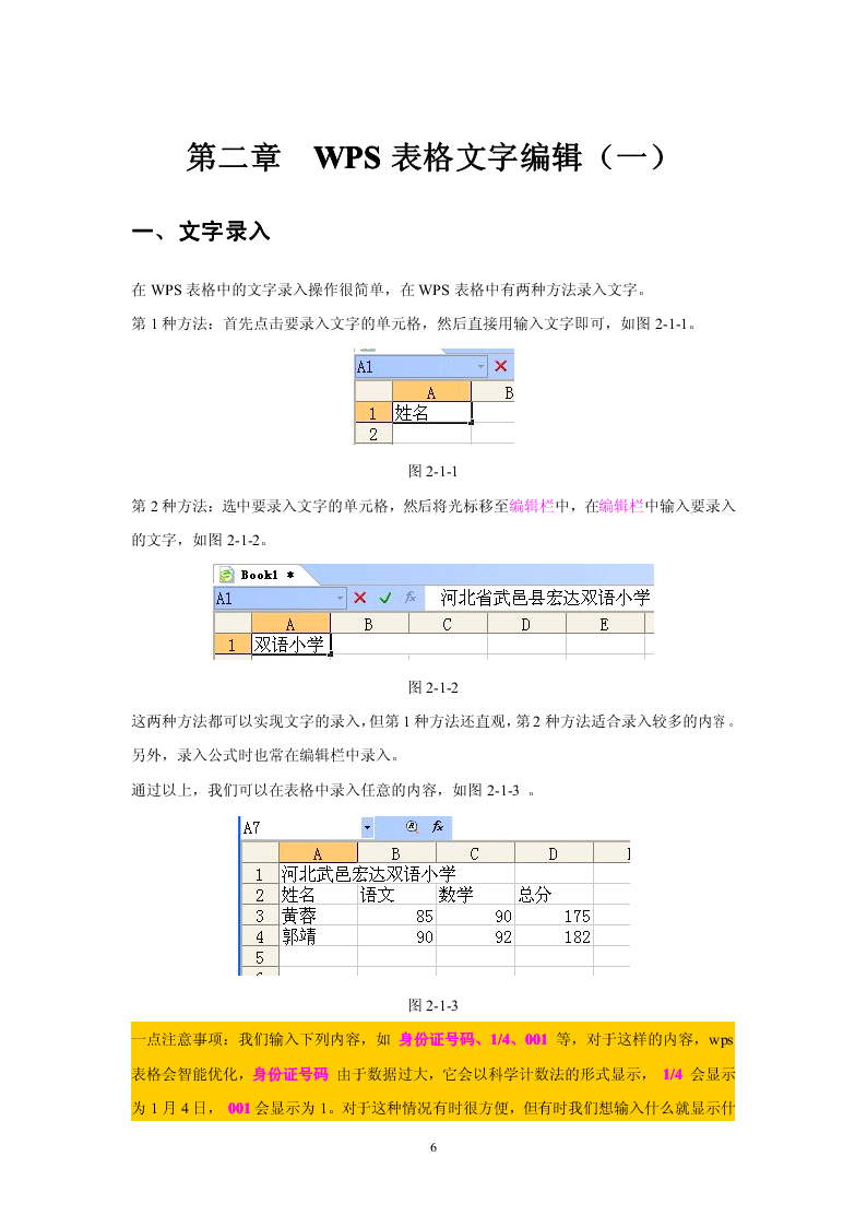 WPS表格初级教程目录第一章WPS表格简介简单的介绍wps表格,让大家对wps表格有个初步认识第二章WPS表格简单的编辑1简单的介绍一下文字的录入,复制,粘贴,表格大小的调整,第三章表格的美化合并拆分,对齐,字体字号颜色,边框与底纹第四章WPS表格的编辑2插入删除移动工作表,查找、替换、填充,自定义序列,清除格式,单元格。第五章用公式和函数进行计算用几个例子介绍一下wps表格的计算第六章数据处理排序、筛选、分类汇总等第七章插入图表介绍如何制作图表。第八章WPS表格其它常用操作1.工具栏设置2.页面设置3.工具选项第九章delphi操作wps表格(以上内容为暂定)2WPS表格初级教程第一章WPSWPS表格简介WPS表格是WPSOFFICE2007的三个组件之一,它是一个电子表格软件,类似于微软公司的Excel,是世界上应用众多的文字处理软件之一。一个WPS表格文件就像是一个账本,这个账本有64页厚,每页的页面上都是一张表格。这个表格有65536行,256列宽。我们就是在这些表格中录入数据,这些表格的大小不是固定不变的,而是可以调整的,它的行高与列宽都可以调整大小。另外,我们不仅可以在表格中录入数据,而且还可以进行复杂的计算、统计、汇总,甚至生成图表,然后打印输入出。WPS表格启动后,界面如图1-1-1所示:图1-1-1WPS表格启动后的界面对于界面中的菜单栏、工具栏等我们暂不做介绍,我们从窗口中的表格开始说起。窗口中最主要的部分就是表格了,它由很多的行与列组成,这些行与列构成了很多的格,在WPS表格里面称为单元格,如上图中的很多小格,这些小格都是单元格。表格的列分别用A、B、C、D······Z,然后是AA,AB,……AZ,BA,BB……等来表示,表格的行分别用1、2、3、4······来表示,这个表格共有256列,65536行,我们可以想像一下,这么大的一个表格足够我们存放下众多的数据,现实生活中我们哪里见过这么大的表格!3WPS表格初级教程每个单元格都有个名称,如A列1行,它的名称是“A1”,同样的道理,C列5行的单元格称为“C5”。单元格的名称可以在名称框中显示出来,单元格的名称框位于表格的左上角,如图2中红线标出来的部分,它显示了当前单元格的名称。单元格中文字的输入即可以直接输入,也可以在编辑栏中输入,图1-1-2中的蓝线标出来的就是单元格的编辑栏。图1-1-2WPS表格的名称框与编辑栏图1-1-2中,下部的紫色区域为页标签,这是64页表格中的3页,其它的可以通过菜单插入--工作表来实现。如图1-3。在图1-1-3中,又插入了2页,。页数的多少可以根据需要来决定,如果显示太多却又用不到,显得特别的乱,因此表格页数是够用为佳。4WPS表格初级教程图1-1-351/40011/4001WPS表格初级教程第二章WPSWPS表格文字编辑(一)一、文字文字录入录入在WPS表格中的文字录入操作很简单,在WPS表格中有两种方法录入文字。第1种方法:首先点击要录入文字的单元格,然后直接用输入文字即可,如图2-1-1。图2-1-1第2种方法:选中要录入文字的单元格,然后将光标移至编辑栏中,在编辑栏中输入要录入的文字,如图2-1-2。图2-1-2这两种方法都可以实现文字的录入,但第1种方法还直观,第2种方法适合录入较多的内容。另外,录入公式时也常在编辑栏中录入。通过以上,我们可以在表格中录入任意的内容,如图2-1-3。图2-1-3一点注意事项:我们输入下列内容,如身份证号码、1/41/4、001等,对于这样的内容,wps表格会智能优化,身份证号码由于数据过大,它会以科学计数法的形式显示,1/41/4会显示为1月4日,001会显示为1。对于这种情况有时很方便,但有时我们想输入什么就显示什6WPS表格初级教程么,此时可以先输入单引号“'”,然后接着输入即可,此时wps表格2007将不会再自作聪明。二、复制与粘贴二、复制与粘贴对于复制与粘贴,相信很多人都会,就是选中要复制的内容后,点击菜单编辑--->复制,然后将光标移动目标区后,再点击菜单编辑--->粘贴,即可以完成复制操作。此处对复制不做过多的介绍,主要介绍一下复制前的选择。1.选择单元格点击要复制的单元格,那么该单元格即处于被选中状态。然后进行复制与粘贴操作即可。2.选择多个单元格如图2-1-3所示,如果要选择A3到D3,即A3:D3