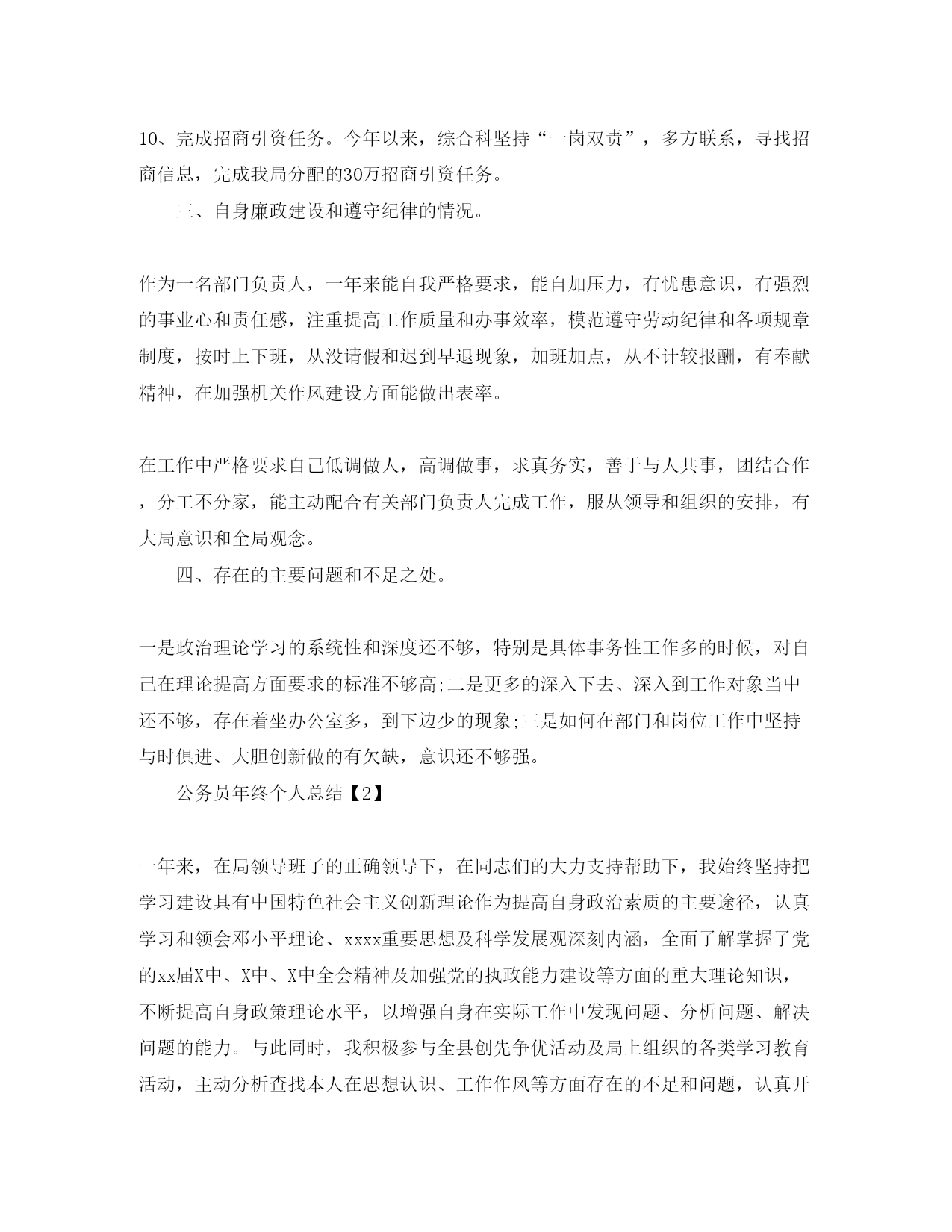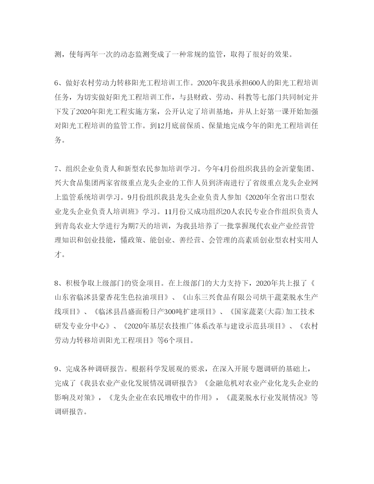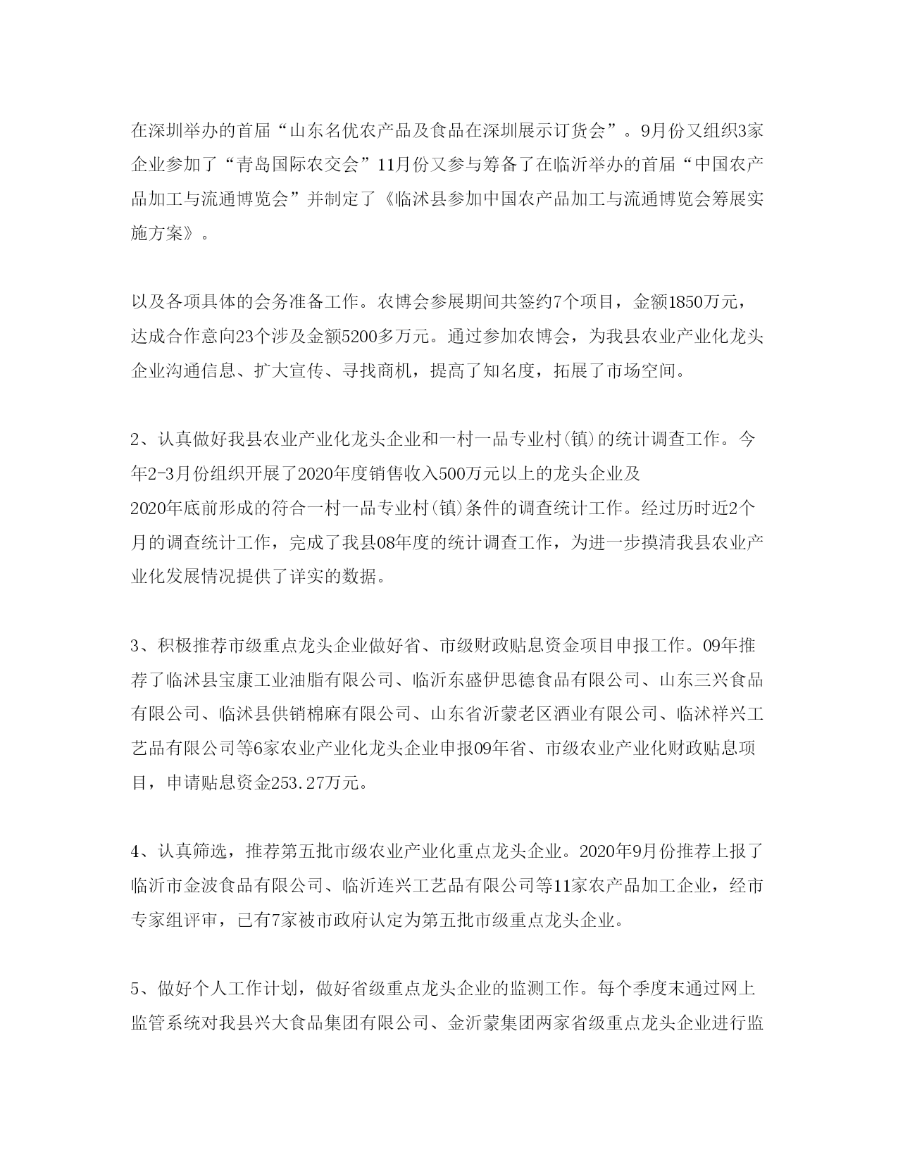 此资料由网络收集而来,如有侵权请告知上传者立即删除。资料共分享,我们负责传递知识。2020公务员个人工作总结公务员年终个人总结【1】2020年即将结束,在局领导及业务主管部门的指导下,在同志们的帮助下,通过自己的努力,在思想上、业务工作水平上都有了很大的提高,圆满的完成了全年的工作、学习任务,并取得了一定的成绩。现将一年来个人工作总结报告一、加强政治思想学习。加强政治理论学习,是坚定理想信念、与党中央保持一致的重要前提,是保持奋发向上和与时俱进精神状态的动力源泉。一年来,本人自觉提高学习积极性,以积极的态度参加“深入学习实践科学发展观”的教育活动;认真学习和领会中央的路线和各项方针政策,及时把思想认识统一到中央的精神上来,并以此指导个人的言行。树立了“讲工作、讲团结、讲奉献”,“只为成功找方法,不为失败找理由”的个人工作信念,成为自己“基础工作做牢、创新工作突破”的动力,不仅自己能认真学习、深刻领会,而且还利用多种渠道和途径,经常向工作对象作宣传引导工作。在学习中,能联系思想工作实际,努力做到围绕主题、把握灵魂、领会精髓。对全面建设小康社会的目标更加充满信心,同时增强了深入学习实践科学发展观活动,推进我县农业产业化纵深发展的主人翁责任感。二、完成本职岗位工作的情况。一年来,我以负责的态度努力完成个人承担的各项工作,积极协助有关部门完成年度部门全部工作任务:1、组织农产品加工企业参加各种农博会。今年5月份成功组织两家企业参加省政府在深圳举办的首届“山东名优农产品及食品在深圳展示订货会”。9月份又组织3家企业参加了“青岛国际农交会”11月份又参与筹备了在临沂举办的首届“中国农产品加工与流通博览会”并制定了《临沭县参加中国农产品加工与流通博览会筹展实施方案》。以及各项具体的会务准备工作。农博会参展期间共签约7个项目,金额1850万元,达成合作意向23个涉及金额5200多万元。通过参加农博会,为我县农业产业化龙头企业沟通信息、扩大宣传、寻找商机,提高了知名度,拓展了市场空间。2、认真做好我县农业产业化龙头企业和一村一品专业村(镇)的统计调查工作。今年2-3月份组织开展了2020年度销售收入500万元以上的龙头企业及2020年底前形成的符合一村一品专业村(镇)条件的调查统计工作。经过历时近2个月的调查统计工作,完成了我县08年度的统计调查工作,为进一步摸清我县农业产业化发展情况提供了详实的数据。3、积极推荐市级重点龙头企业做好省、市级财政贴息资金项目申报工作。09年推荐了临沭县宝康工业油脂有限公司、临沂东盛伊思德食品有限公司、山东三兴食品有限公司、临沭县供销棉麻有限公司、山东省沂蒙老区酒业有限公司、临沭祥兴工艺品有限公司等6家农业产业化龙头企业申报09年省、市级农业产业化财政贴息项目,申请贴息资金253.27万元。4、认真筛选,推荐第五批市级农业产业化重点龙头企业。2020年9月份推荐上报了临沂市金波食品有限公司、临沂连兴工艺品有限公司等11家农产品加工企业,经市专家组评审,已有7家被市政府认定为第五批市级重点龙头企业。5、做好个人工作计划,做好省级重点龙头企业的监测工作。每个季度末通过网上监管系统对我县兴大食品集团有限公司、金沂蒙集团两家省级重点龙头企业进行监测,使每两年一次的动态监测变成了一种常规的监管,取得了很好的效果。6、做好农村劳动力转移阳光工程培训工作。2020年我县承担600人的阳光工程培训任务,为切实做好阳光工程培训工作,与县财政、劳动、科教等七部门共同制定并下发了2020年阳光工程实施方案,公开认定了培训基地,并从上好第一课开始加强对阳光工程培训的监管工作。到12月底前保质、保量地完成今年的阳光工程培训任务。7、组织企业负责人和新型农民参加培训学习。今年4月份组织我县的金沂蒙集团、兴大食品集团两家省级重点龙头企业的工作人员到济南进行了省级重点龙头企业网上监管系统培训学习。9月份组织我县龙头企业负责人参加《2020年全省出口型农业龙头企业负责人培训班》学习。11月份又成功组织20人农民专业合作组织负责人到青岛农业大学进行为期7天的培训,为我县培养了一批掌握现代农业产业经营管理知识和创业技能,懂政策、能创业、善经营、会管理的高素质创业型农村实用人才。8、积极争取上级部门的资金项目。在上级部门的大力支持下,2020年共上报了《山东省临沭县蒙香花生色拉油项目》、《山东三兴食品有限公司烘干蔬菜脱水生产线项目》、《临沭县昌盛面粉日产300吨扩建项目》、《国家蔬菜(大蒜)加工技术研发专业分中心》、《2020年基层农技推广体系改革与建设示范县项目》、《农村劳动力转移培训阳光工程项目》等6个项目。9、完成各种调研报告。根据科学发展观的要求,在深入开展专题调研的基础上,完成了《我县农业产业化发展情况调研