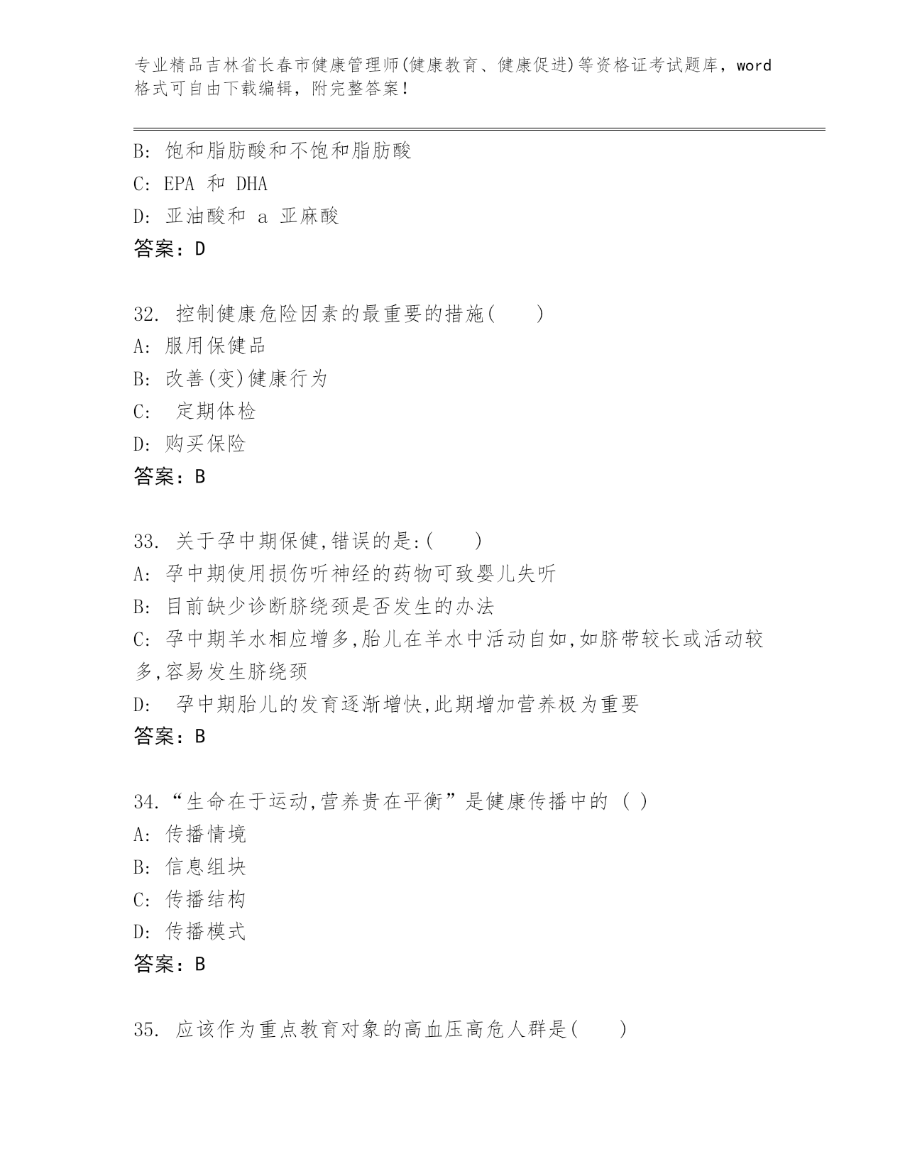 吉林省长春市健康管理师(健康教育、健康促进)等资格证考试王牌题库加答案解析.docx