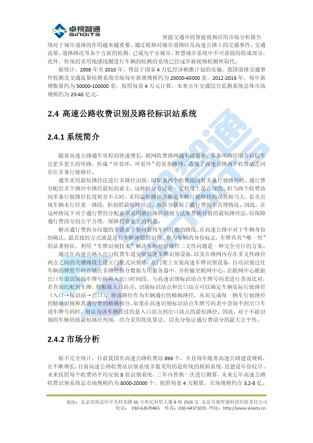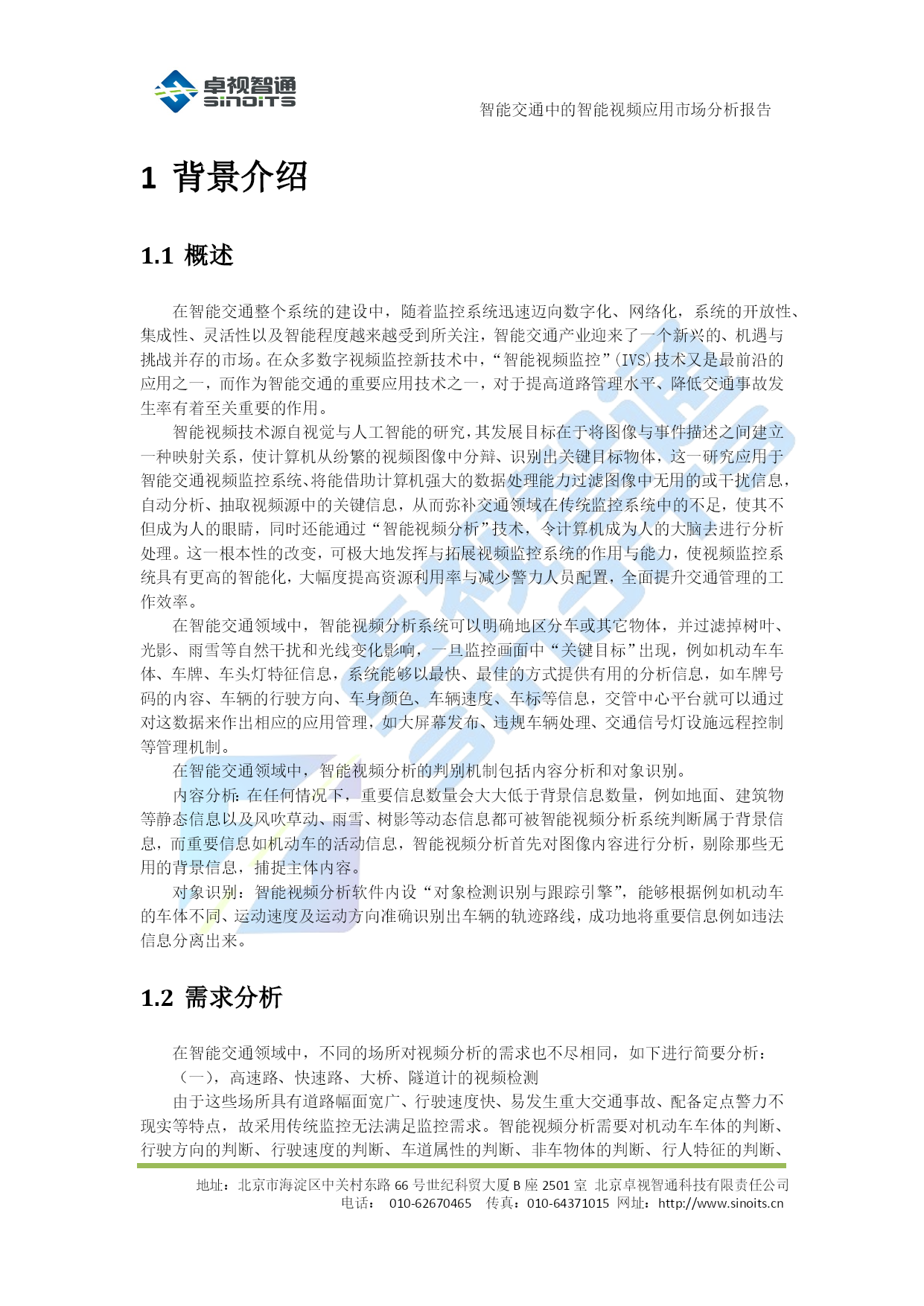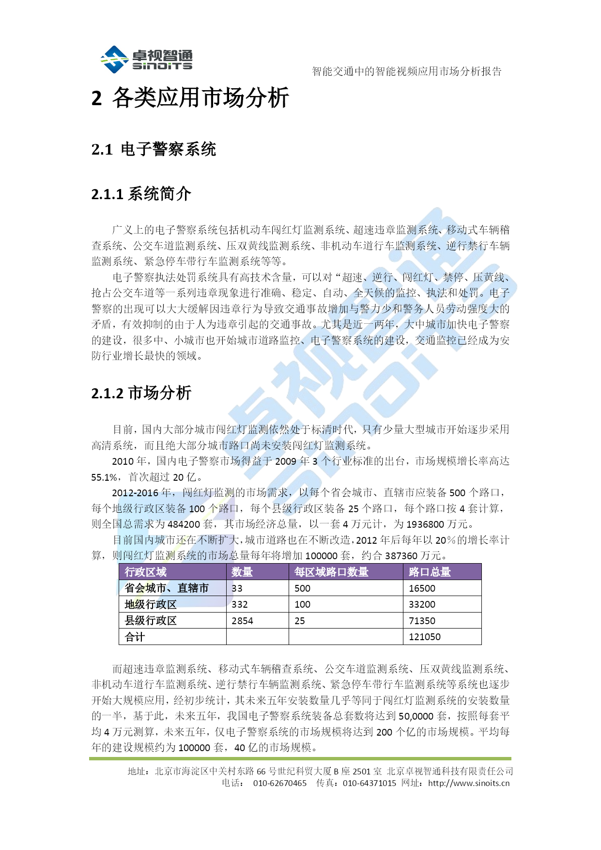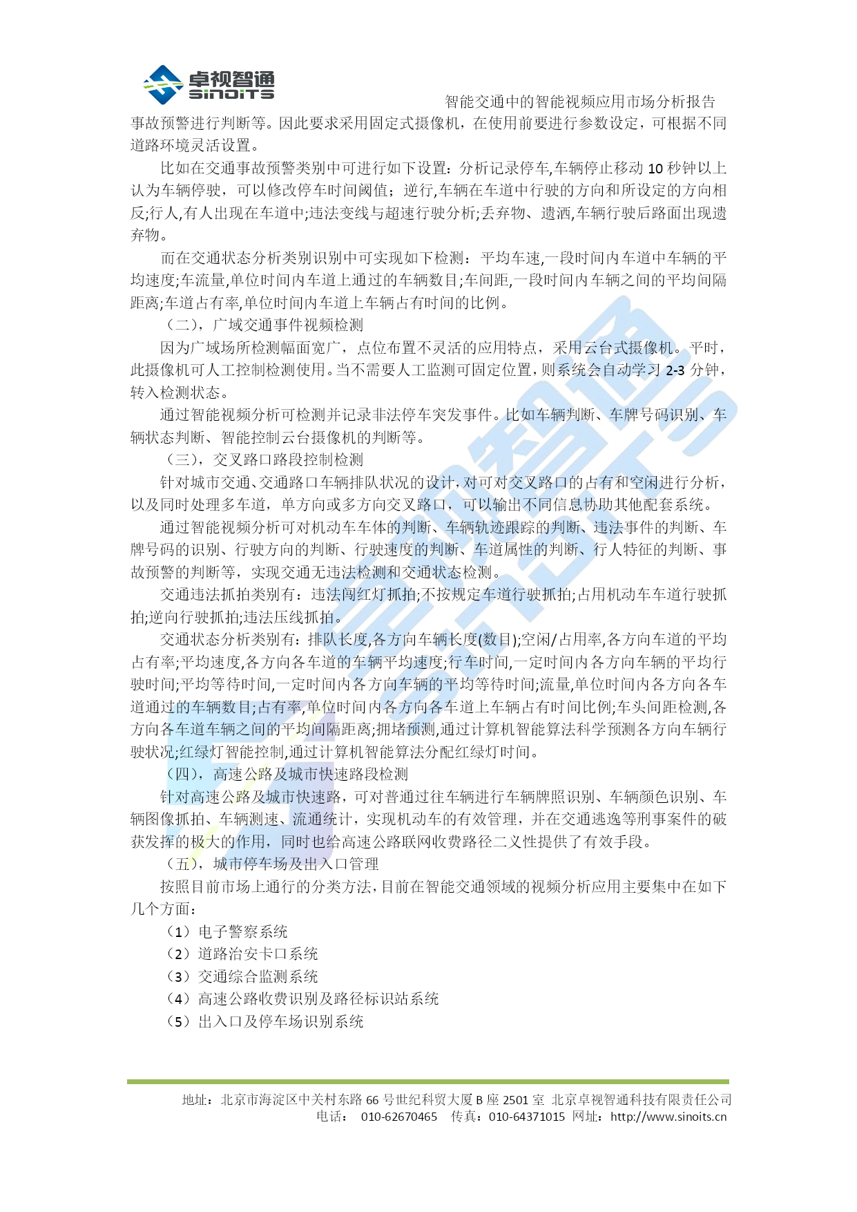 智能交通中的智能视频应用市场分析报告V0.1北京卓视智通科技有限责任公司2012年4月目录TOC\o"1-5"\h\z\uHYPERLINK\l"_Toc322648388"1背景介绍PAGEREF_Toc322648388\h3HYPERLINK\l"_Toc322648389"1.1概述PAGEREF_Toc322648389\h3HYPERLINK\l"_Toc322648390"1.2需求分析PAGEREF_Toc322648390\h3HYPERLINK\l"_Toc322648391"2各类应用市场分析PAGEREF_Toc322648391\h5HYPERLINK\l"_Toc322648392"2.1电子警察系统PAGEREF_Toc322648392\h5HYPERLINK\l"_Toc322648393"2.1.1系统简介PAGEREF_Toc322648393\h5HYPERLINK\l"_Toc322648394"2.1.2市场分析PAGEREF_Toc322648394\h5HYPERLINK\l"_Toc322648395"2.2治安卡口系统PAGEREF_Toc322648395\h6HYPERLINK\l"_Toc322648396"2.2.1系统简介PAGEREF_Toc322648396\h6HYPERLINK\l"_Toc322648397"2.2.2市场分析PAGEREF_Toc322648397\h6HYPERLINK\l"_Toc322648398"2.3交通综合监测系统PAGEREF_Toc322648398\h6HYPERLINK\l"_Toc322648399"2.3.1系统简介PAGEREF_Toc322648399\h6HYPERLINK\l"_Toc322648400"2.3.2市场分析PAGEREF_Toc322648400\h6HYPERLINK\l"_Toc322648401"2.4高速公路收费识别及路径标识站系统PAGEREF_Toc322648401\h7HYPERLINK\l"_Toc322648402"2.4.1系统简介PAGEREF_Toc322648402\h7HYPERLINK\l"_Toc322648403"2.4.2市场分析PAGEREF_Toc322648403\h7HYPERLINK\l"_Toc322648404"2.5出入口及停车场识别系统PAGEREF_Toc322648404\h8HYPERLINK\l"_Toc322648405"2.5.1市场分析PAGEREF_Toc322648405\h8HYPERLINK\l"_Toc322648406"2.6小节PAGEREF_Toc322648406\h8HYPERLINK\l"_Toc322648407"3结论PAGEREF_Toc322648407\h10智能交通中的智能视频应用市场分析报告地址:北京市海淀区中关村东路66号世纪科贸大厦B座2501室北京卓视智通科技有限责任公司电话:010-62670465传真:010-64371015网址:http://www.sinoits.cn背景介绍概述在智能交通整个系统的建设中,随着监控系统迅速迈向数字化、网络化,系统的开放性、集成性、灵活性以及智能程度越来越受到所关注,智能交通产业迎来了一个新兴的、机遇与挑战并存的市场。在众多数字视频监控新技术中,“智能视频监控”(IVS)技术又是最前沿的应用之一,而作为智能交通的重要应用技术之一,对于提高道路管理水平、降低交通事故发生率有着至关重要的作用。智能视频技术源自视觉与人工智能的研究,其发展目标在于将图像与事件描述之间建立一种映射关系,使计算机从纷繁的视频图像中分辩、识别出关键目标物体,这一研究应用于智能交通视频监控系统、将能借助计算机强大的数据处理能力过滤图像中无用的或干扰信息,自动分析、抽取视频源中的关键信息,从而弥补交通领域在传统监控系统中的不足,使其不但成为人的眼睛,同时还能通过“智能视频分析”技术,令计算机成为人的大脑去进行分析处理。这一根本性的改变,可极大地发挥与拓展视频监控系统的作用与能力,使视频监控系统具有更高的智能化,大幅度提高资源利用率与减少警力人