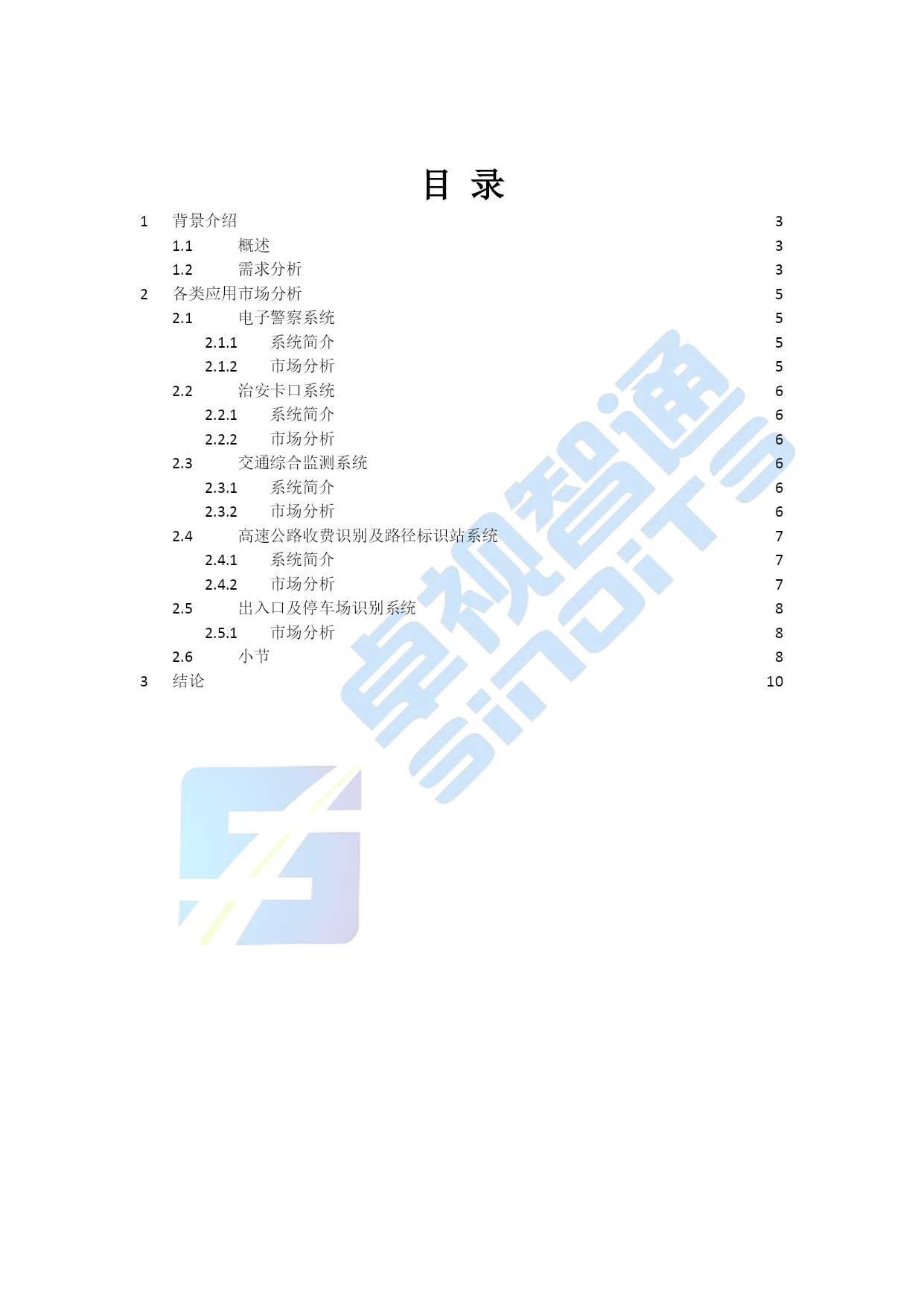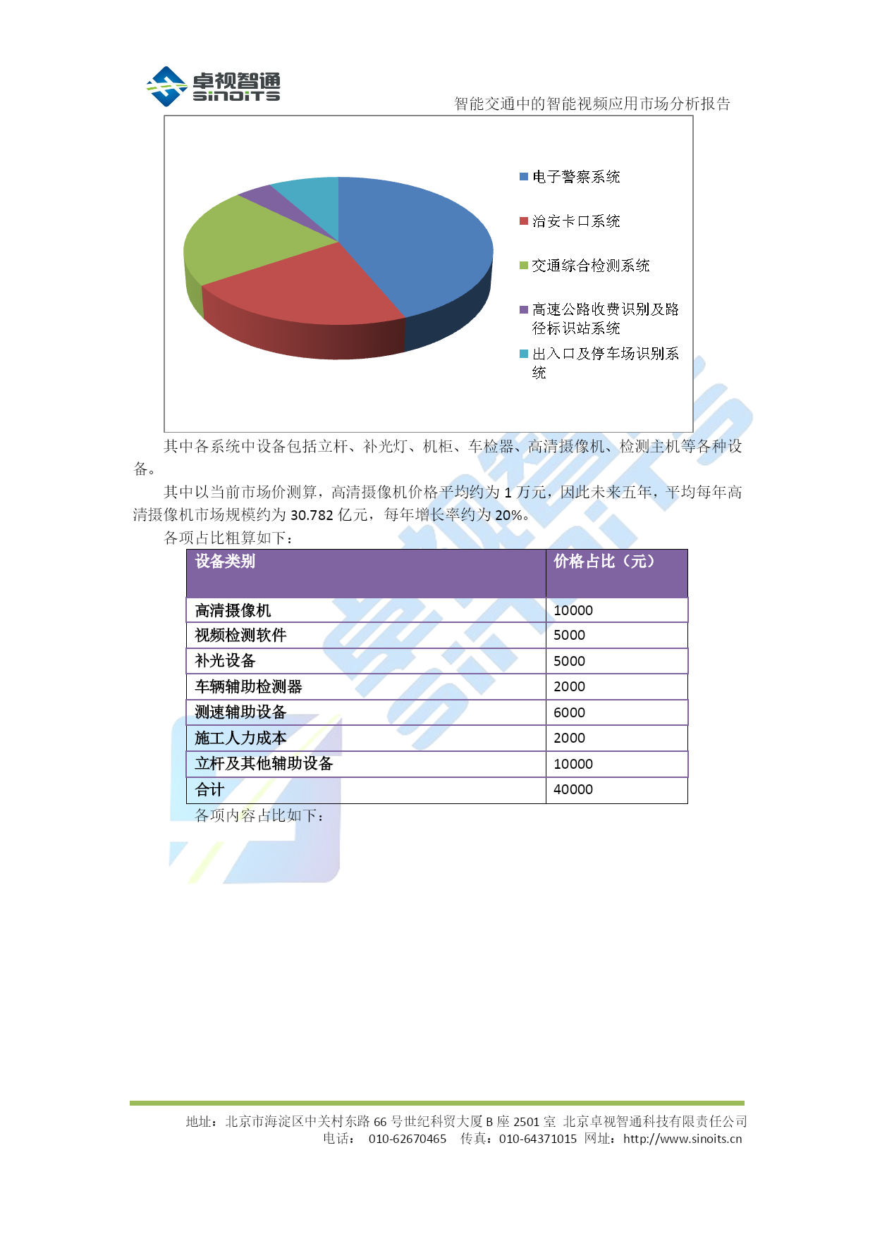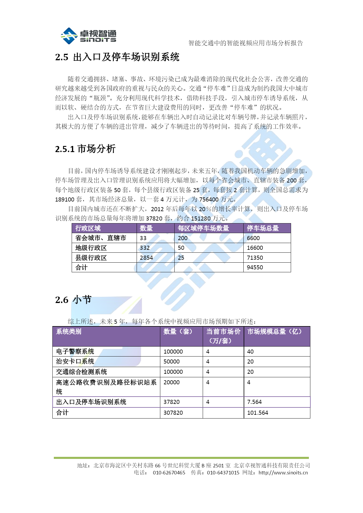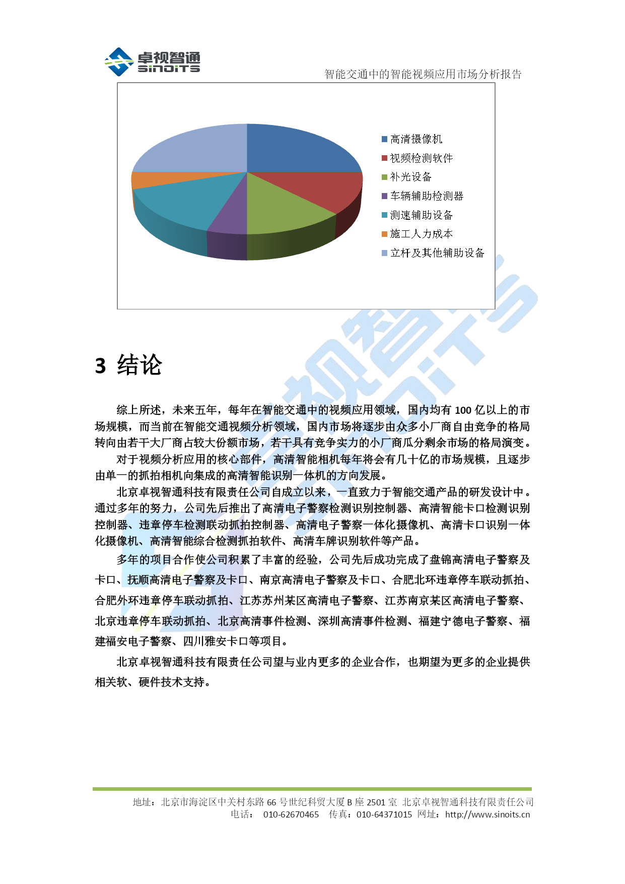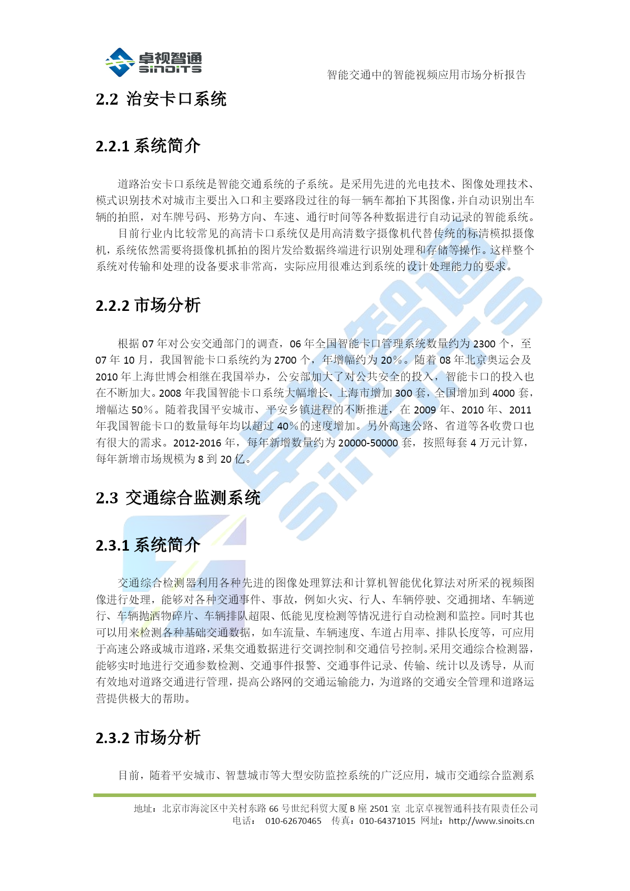 智能交通中的智能视频应用市场分析报告V0.1北京卓视智通科技有限责任公司2012年4月目录TOC\o"1-5"\h\z\uHYPERLINK\l"_Toc322648388"1背景介绍PAGEREF_Toc322648388\h3HYPERLINK\l"_Toc322648389"1.1概述PAGEREF_Toc322648389\h3HYPERLINK\l"_Toc322648390"1.2需求分析PAGEREF_Toc322648390\h3HYPERLINK\l"_Toc322648391"2各类应用市场分析PAGEREF_Toc322648391\h5HYPERLINK\l"_Toc322648392"2.1电子警察系统PAGEREF_Toc322648392\h5HYPERLINK\l"_Toc322648393"2.1.1系统简介PAGEREF_Toc322648393\h5HYPERLINK\l"_Toc322648394"2.1.2市场分析PAGEREF_Toc322648394\h5HYPERLINK\l"_Toc322648395"2.2治安卡口系统PAGEREF_Toc322648395\h6HYPERLINK\l"_Toc322648396"2.2.1系统简介PAGEREF_Toc322648396\h6HYPERLINK\l"_Toc322648397"2.2.2市场分析PAGEREF_Toc322648397\h6HYPERLINK\l"_Toc322648398"2.3交通综合监测系统PAGEREF_Toc322648398\h6HYPERLINK\l"_Toc322648399"2.3.1系统简介PAGEREF_Toc322648399\h6HYPERLINK\l"_Toc322648400"2.3.2市场分析PAGEREF_Toc322648400\h6HYPERLINK\l"_Toc322648401"2.4高速公路收费识别及路径标识站系统PAGEREF_Toc322648401\h7HYPERLINK\l"_Toc322648402"2.4.1系统简介PAGEREF_Toc322648402\h7HYPERLINK\l"_Toc322648403"2.4.2市场分析PAGEREF_Toc322648403\h7HYPERLINK\l"_Toc322648404"2.5出入口及停车场识别系统PAGEREF_Toc322648404\h8HYPERLINK\l"_Toc322648405"2.5.1市场分析PAGEREF_Toc322648405\h8HYPERLINK\l"_Toc322648406"2.6小节PAGEREF_Toc322648406\h8HYPERLINK\l"_Toc322648407"3结论PAGEREF_Toc322648407\h10智能交通中的智能视频应用市场分析报告地址:北京市海淀区中关村东路66号世纪科贸大厦B座2501室北京卓视智通科技有限责任公司电话:010-62670465传真:010-64371015网址:http://www.sinoits.cn背景介绍概述在智能交通整个系统的建设中,随着监控系统迅速迈向数字化、网络化,系统的开放性、集成性、灵活性以及智能程度越来越受到所关注,智能交通产业迎来了一个新兴的、机遇与挑战并存的市场。在众多数字视频监控新技术中,“智能视频监控”(IVS)技术又是最前沿的应用之一,而作为智能交通的重要应用技术之一,对于提高道路管理水平、降低交通事故发生率有着至关重要的作用。智能视频技术源自视觉与人工智能的研究,其发展目标在于将图像与事件描述之间建立一种映射关系,使计算机从纷繁的视频图像中分辩、识别出关键目标物体,这一研究应用于智能交通视频监控系统、将能借助计算机强大的数据处理能力过滤图像中无用的或干扰信息,自动分析、抽取视频源中的关键信息,从而弥补交通领域在传统监控系统中的不足,使其不但成为人的眼睛,同时还能通过“智能视频分析”技术,令计算机成为人的大脑去进行分析处理。这一根本性的改变,可极大地发挥与拓展视频监控系统的作用与能力,使视频监控系统具有更高的智能化,大幅度提高资源利用率与减少警力人