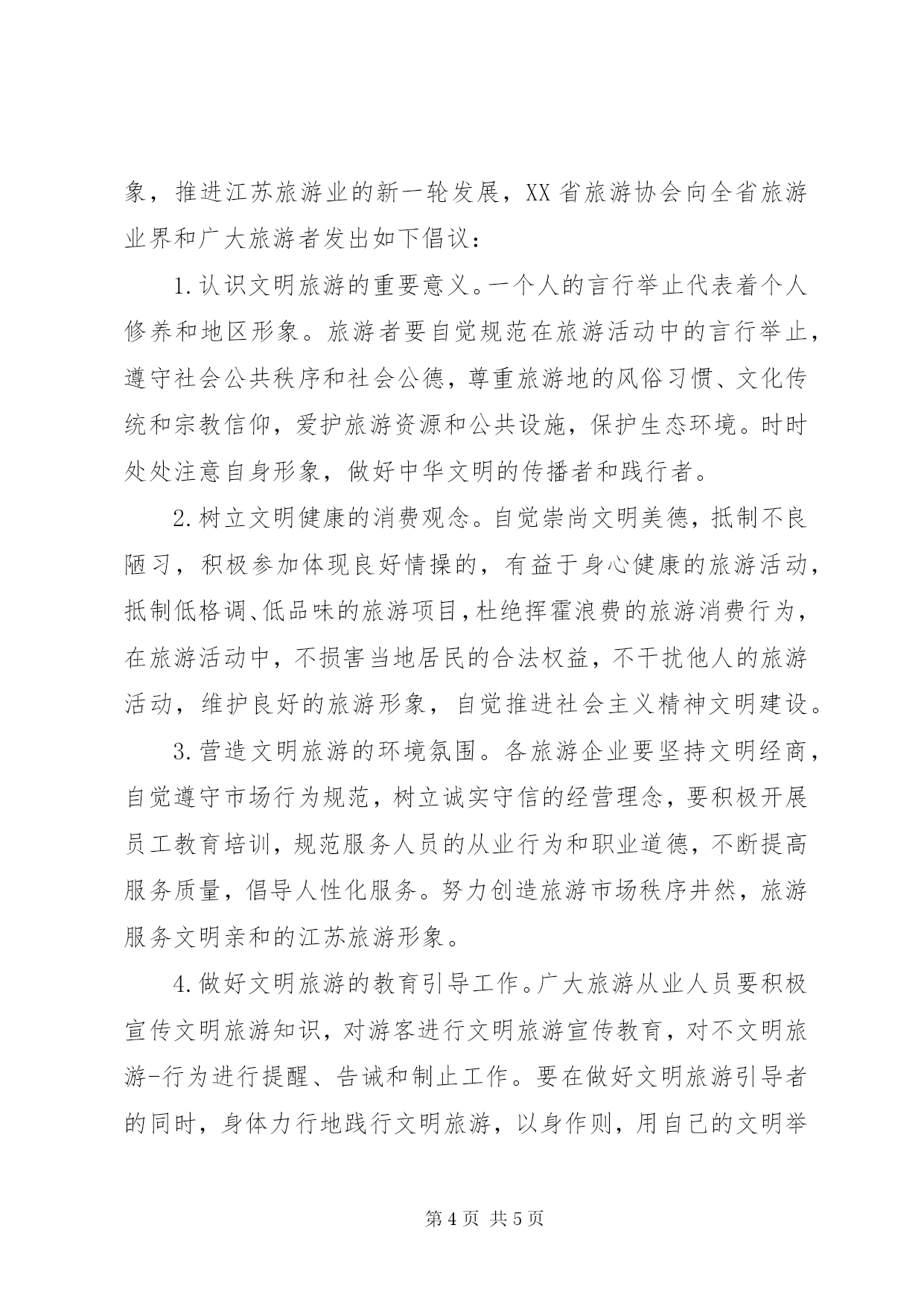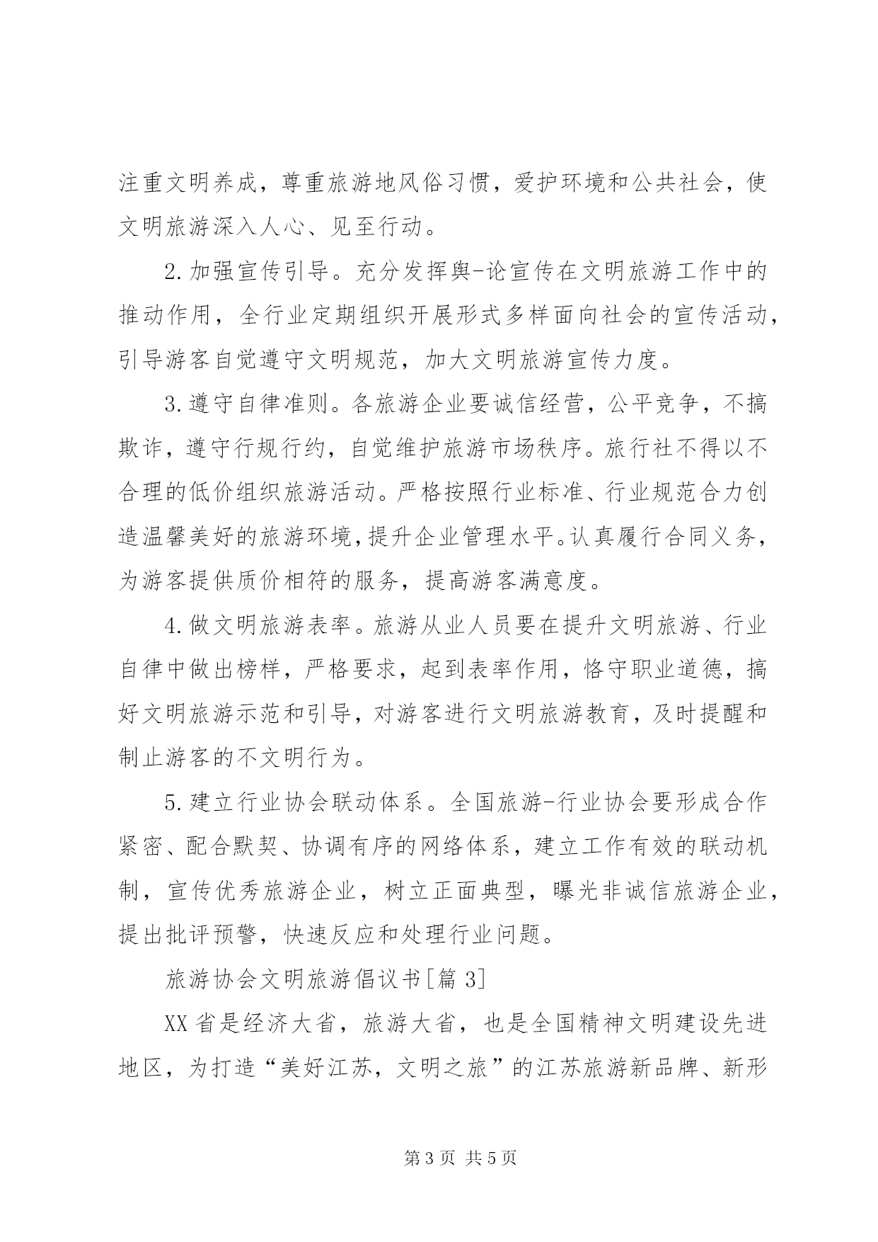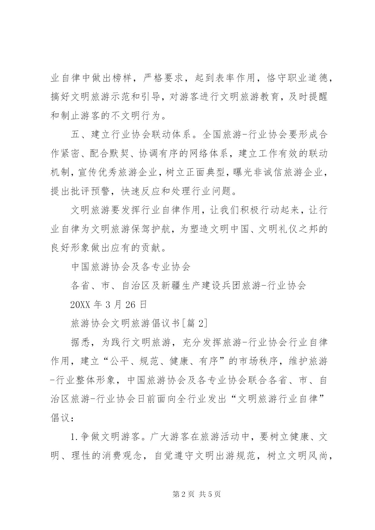 第PAGE\*Arabic\*MERGEFORMAT5页共NUMPAGES\*MERGEFORMAT5页201X旅游协会文明旅游倡议书旅游协会文明旅游倡议书旅游业是展示国家形象的重要窗口,是社会主义精神文明建设的主要推动力量。为践行文明旅游,充分发挥旅游-行业协会行业自律作用,建立“公平、规范、健康、有序”的市场秩序,维护旅游-行业整体形象,中国旅游协会及各专业协会联合各省、市、自治区及新疆生产建设兵团旅游-行业协会面向全行业发出倡议:一、争做文明游客。广大游客在旅游活动中,要树立健康、文明、理性的消费观念,自觉遵守文明出游规范,树立文明风尚,注重文明养成,尊重旅游地风俗习惯,爱护环境和公共社会,使文明旅游深入人心、见至行动。二、加强宣传引导。充分发挥舆-论宣传在文明旅游工作中的推动作用,全行业定期组织开展形式多样面向社会的宣传活动,引导游客自觉遵守文明规范,加大文明旅游宣传力度。三、遵守自律准则。各旅游企业要诚信经营,公平竞争,不搞欺诈,遵守行规行约,自觉维护旅游市场秩序。旅行社不得以不合理的低价组织旅游活动。严格按照行业标准、行业规范合力创造温馨美好的旅游环境,提升企业管理水平。认真履行合同义务,为游客提供质价相符的服务,提高游客满意度。四、做文明旅游表率。旅游从业人员要在提升文明旅游、行业自律中做出榜样,严格要求,起到表率作用,恪守职业道德,搞好文明旅游示范和引导,对游客进行文明旅游教育,及时提醒和制止游客的不文明行为。五、建立行业协会联动体系。全国旅游-行业协会要形成合作紧密、配合默契、协调有序的网络体系,建立工作有效的联动机制,宣传优秀旅游企业,树立正面典型,曝光非诚信旅游企业,提出批评预警,快速反应和处理行业问题。文明旅游要发挥行业自律作用,让我们积极行动起来,让行业自律为文明旅游保驾护航,为塑造文明中国、文明礼仪之邦的良好形象做出应有的贡献。中国旅游协会及各专业协会各省、市、自治区及新疆生产建设兵团旅游-行业协会20XX年3月26日旅游协会文明旅游倡议书[篇2]据悉,为践行文明旅游,充分发挥旅游-行业协会行业自律作用,建立“公平、规范、健康、有序”的市场秩序,维护旅游-行业整体形象,中国旅游协会及各专业协会联合各省、市、自治区旅游-行业协会日前面向全行业发出“文明旅游行业自律”倡议:1.争做文明游客。广大游客在旅游活动中,要树立健康、文明、理性的消费观念,自觉遵守文明出游规范,树立文明风尚,注重文明养成,尊重旅游地风俗习惯,爱护环境和公共社会,使文明旅游深入人心、见至行动。2.加强宣传引导。充分发挥舆-论宣传在文明旅游工作中的推动作用,全行业定期组织开展形式多样面向社会的宣传活动,引导游客自觉遵守文明规范,加大文明旅游宣传力度。3.遵守自律准则。各旅游企业要诚信经营,公平竞争,不搞欺诈,遵守行规行约,自觉维护旅游市场秩序。旅行社不得以不合理的低价组织旅游活动。严格按照行业标准、行业规范合力创造温馨美好的旅游环境,提升企业管理水平。认真履行合同义务,为游客提供质价相符的服务,提高游客满意度。4.做文明旅游表率。旅游从业人员要在提升文明旅游、行业自律中做出榜样,严格要求,起到表率作用,恪守职业道德,搞好文明旅游示范和引导,对游客进行文明旅游教育,及时提醒和制止游客的不文明行为。5.建立行业协会联动体系。全国旅游-行业协会要形成合作紧密、配合默契、协调有序的网络体系,建立工作有效的联动机制,宣传优秀旅游企业,树立正面典型,曝光非诚信旅游企业,提出批评预警,快速反应和处理行业问题。旅游协会文明旅游倡议书[篇3]XX省是经济大省,旅游大省,也是全国精神文明建设先进地区,为打造“美好江苏,文明之旅”的江苏旅游新品牌、新形象,推进江苏旅游业的新一轮发展,XX省旅游协会向全省旅游业界和广大旅游者发出如下倡议:1.认识文明旅游的重要意义。一个人的言行举止代表着个人修养和地区形象。旅游者要自觉规范在旅游活动中的言行举止,遵守社会公共秩序和社会公德,尊重旅游地的风俗习惯、文化传统和宗教信仰,爱护旅游资源和公共设施,保护生态环境。时时处处注意自身形象,做好中华文明的传播者和践行者。2.树立文明健康的消费观念。自觉崇尚文明美德,抵制不良陋习,积极参加体现良好情操的,有益于身心健康的旅游活动,抵制低格调、低品味的旅游项目,杜绝挥霍浪费的旅游消费行为,在旅游活动中,不损害当地居民的合法权益,不干扰他人的旅游活动,维护良好的旅游形象,自觉推进社会主义精神文明建设。3.营造文明旅游的环境氛围。各旅游企业要坚持文明经商,自觉遵守市场行为规范,树立诚实守信的经营理念,要积极开展员工教育培训,规范服务人员的从业行为和职业道德,不断提高服务质量,倡导人性化服务。努力创造旅游市场秩序井然,旅游服务文明亲和的江苏旅游形象。4.做好文