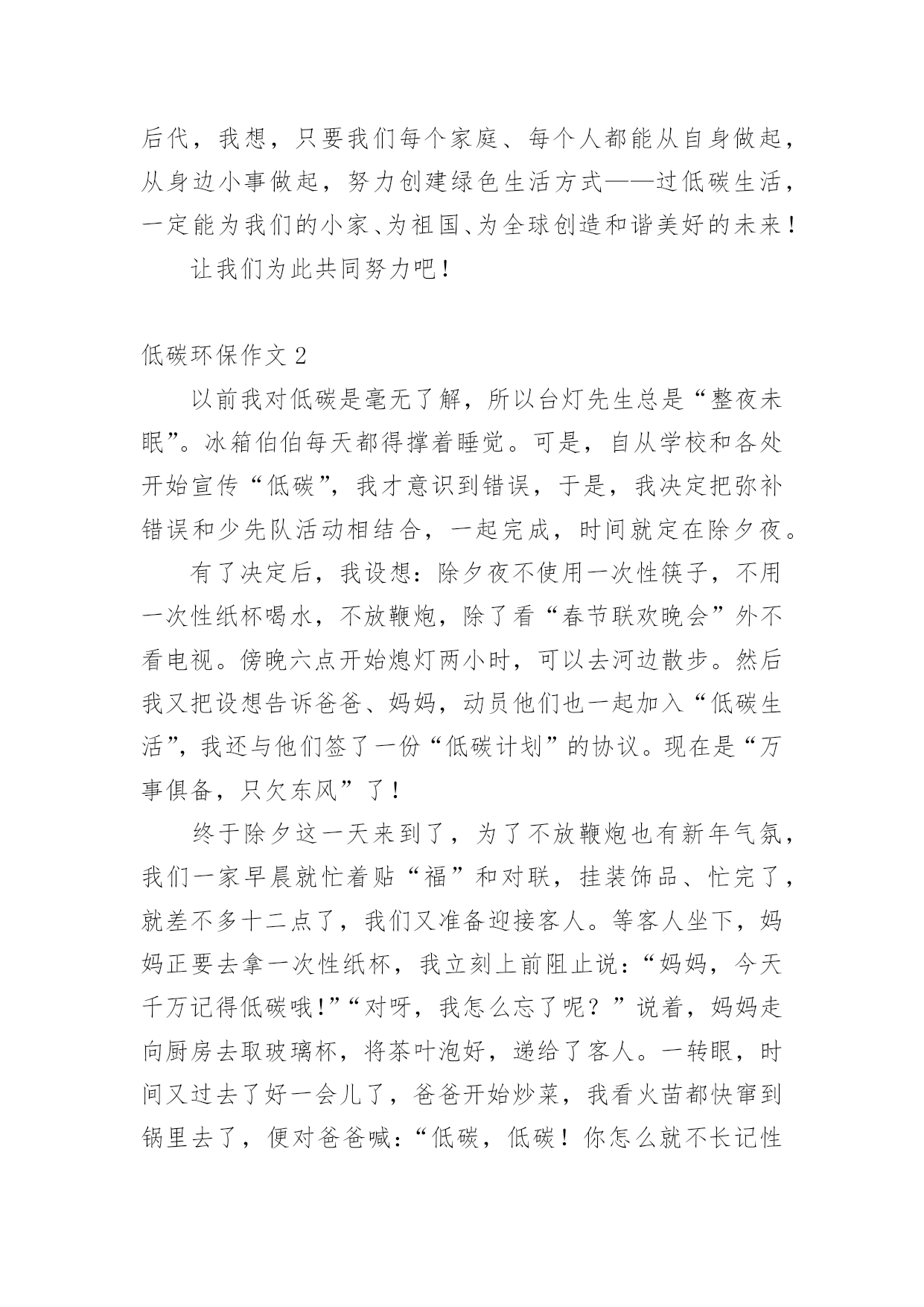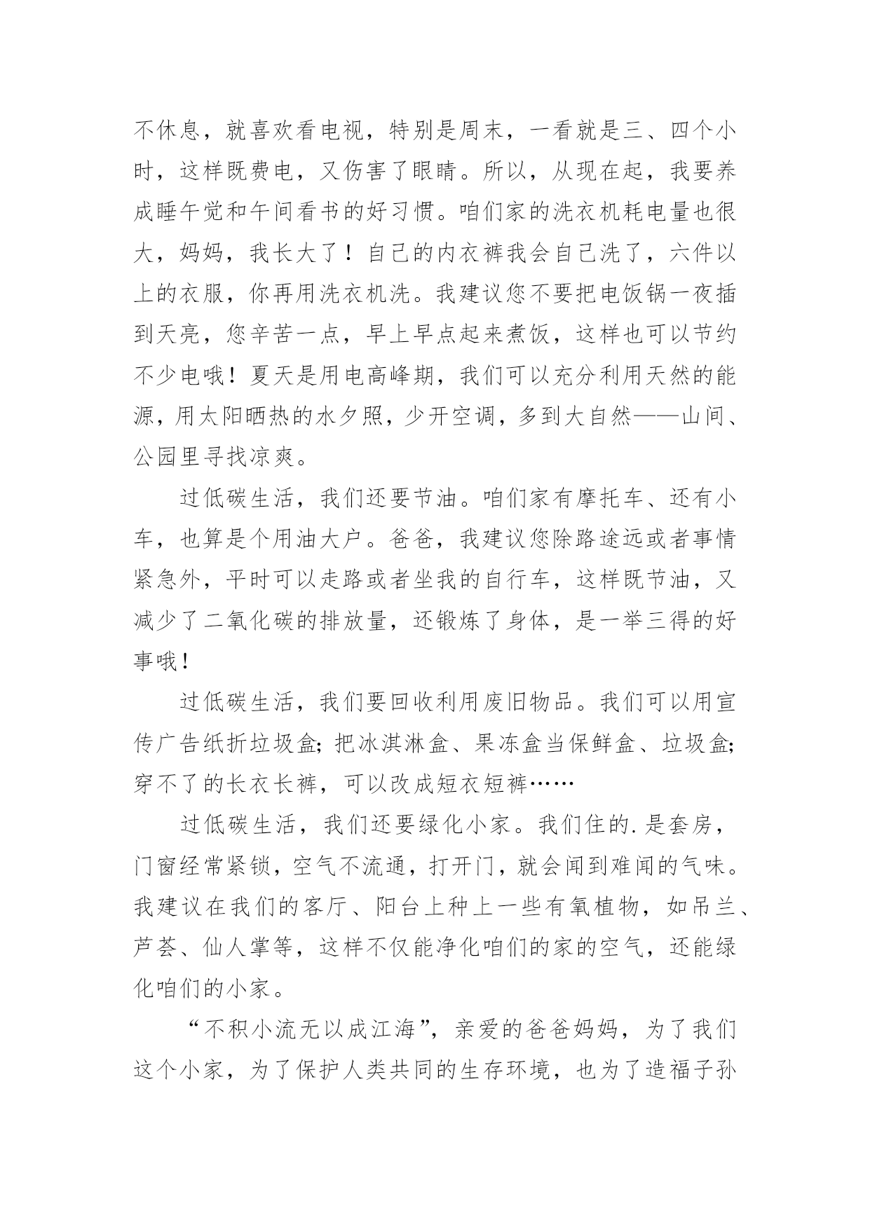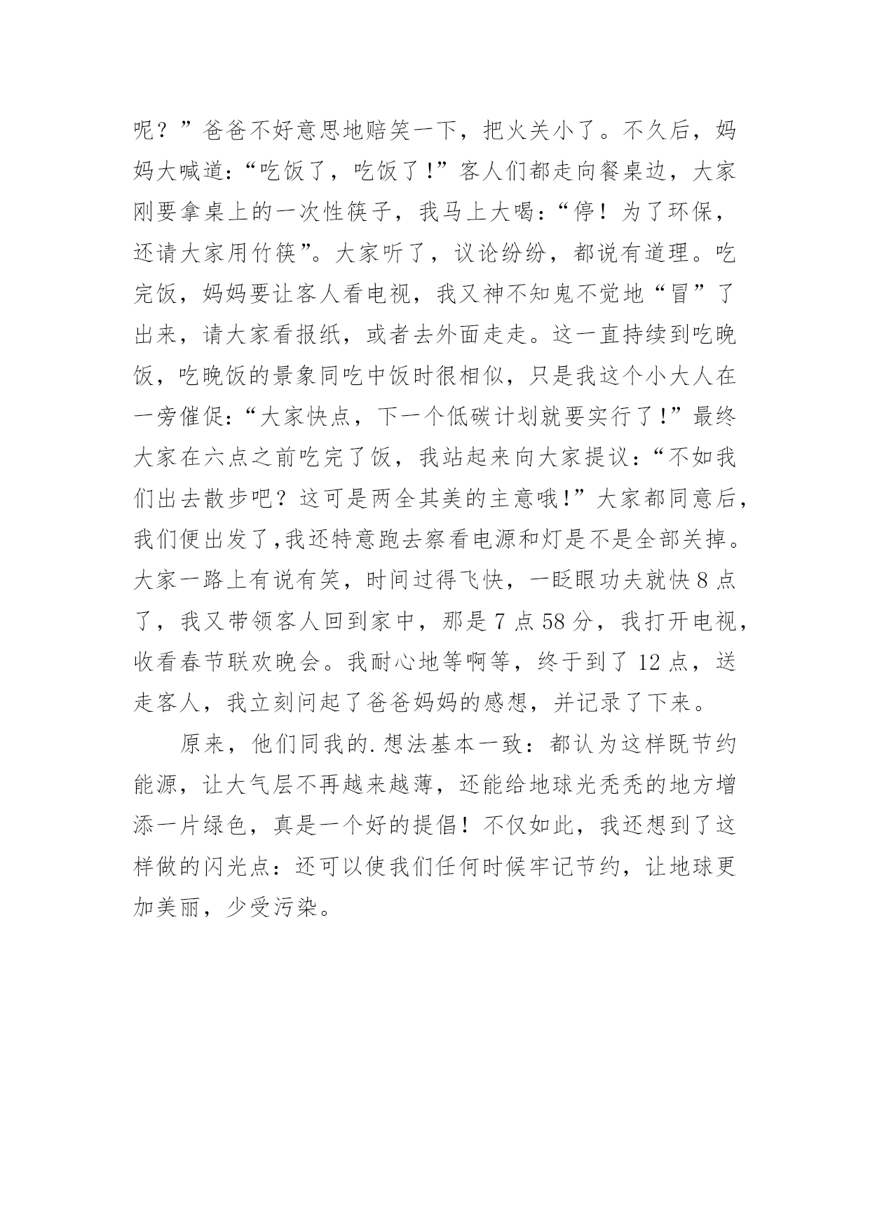低碳环保作文在日常生活或是工作学习中,许多人都写过作文吧,作文是一种言语活动,具有高度的综合性和创造性。作文的注意事项有许多,你确定会写吗?以下是小编帮大家整理的低碳环保作文,供大家参考借鉴,希望可以帮助到有需要的朋友。低碳环保作文1亲爱的爸爸妈妈:你们好!如今气候变暖已经成了全球关注的一个热点问题。如果我们再不重视,它将引发土地干旱、造成缺粮、导致植物灭绝,严重威胁人类的生存条件。因此,节能减排工作成了人们迫在眉睫的一件大事。作为家庭中的一名成员,我认为,虽然我们没有能力阻止那些工厂的排污,但我们可以以身作则,从小事做起,建立绿色的生活方式——低碳生活。过低碳生活,我们要节水。妈妈,请您不要再把隔夜的凉开水白白地倒掉,那些水多干净呀!可以用来洗碗、洗脸、洗衣服,倒了太可惜了!我们还可以循环用水,凉开水洗脸后,可以洗衣服,洗衣水可以冲厕所。而我呢?从现在起,我要加快洗澡的速度,涂沐浴露时尽量不开水,头和澡一起洗,这样洗头洗澡同时进行,不就能节约些水了吗?过低碳生活,我们要节电。以前,中午做完作业后我从不休息,就喜欢看电视,特别是周末,一看就是三、四个小时,这样既费电,又伤害了眼睛。所以,从现在起,我要养成睡午觉和午间看书的好习惯。咱们家的洗衣机耗电量也很大,妈妈,我长大了!自己的内衣裤我会自己洗了,六件以上的衣服,你再用洗衣机洗。我建议您不要把电饭锅一夜插到天亮,您辛苦一点,早上早点起来煮饭,这样也可以节约不少电哦!夏天是用电高峰期,我们可以充分利用天然的能源,用太阳晒热的水夕照,少开空调,多到大自然——山间、公园里寻找凉爽。过低碳生活,我们还要节油。咱们家有摩托车、还有小车,也算是个用油大户。爸爸,我建议您除路途远或者事情紧急外,平时可以走路或者坐我的自行车,这样既节油,又减少了二氧化碳的排放量,还锻炼了身体,是一举三得的好事哦!过低碳生活,我们要回收利用废旧物品。我们可以用宣传广告纸折垃圾盒;把冰淇淋盒、果冻盒当保鲜盒、垃圾盒;穿不了的长衣长裤,可以改成短衣短裤……过低碳生活,我们还要绿化小家。我们住的.是套房,门窗经常紧锁,空气不流通,打开门,就会闻到难闻的气味。我建议在我们的客厅、阳台上种上一些有氧植物,如吊兰、芦荟、仙人掌等,这样不仅能净化咱们的家的空气,还能绿化咱们的小家。“不积小流无以成江海”,亲爱的爸爸妈妈,为了我们这个小家,为了保护人类共同的生存环境,也为了造福子孙后代,我想,只要我们每个家庭、每个人都能从自身做起,从身边小事做起,努力创建绿色生活方式——过低碳生活,一定能为我们的小家、为祖国、为全球创造和谐美好的未来!让我们为此共同努力吧!低碳环保作文2以前我对低碳是毫无了解,所以台灯先生总是“整夜未眠”。冰箱伯伯每天都得撑着睡觉。可是,自从学校和各处开始宣传“低碳”,我才意识到错误,于是,我决定把弥补错误和少先队活动相结合,一起完成,时间就定在除夕夜。有了决定后,我设想:除夕夜不使用一次性筷子,不用一次性纸杯喝水,不放鞭炮,除了看“春节联欢晚会”外不看电视。傍晚六点开始熄灯两小时,可以去河边散步。然后我又把设想告诉爸爸、妈妈,动员他们也一起加入“低碳生活”,我还与他们签了一份“低碳计划”的协议。现在是“万事俱备,只欠东风”了!终于除夕这一天来到了,为了不放鞭炮也有新年气氛,我们一家早晨就忙着贴“福”和对联,挂装饰品、忙完了,就差不多十二点了,我们又准备迎接客人。等客人坐下,妈妈正要去拿一次性纸杯,我立刻上前阻止说:“妈妈,今天千万记得低碳哦!”“对呀,我怎么忘了呢?”说着,妈妈走向厨房去取玻璃杯,将茶叶泡好,递给了客人。一转眼,时间又过去了好一会儿了,爸爸开始炒菜,我看火苗都快窜到锅里去了,便对爸爸喊:“低碳,低碳!你怎么就不长记性呢?”爸爸不好意思地赔笑一下,把火关小了。不久后,妈妈大喊道:“吃饭了,吃饭了!”客人们都走向餐桌边,大家刚要拿桌上的一次性筷子,我马上大喝:“停!为了环保,还请大家用竹筷”。大家听了,议论纷纷,都说有道理。吃完饭,妈妈要让客人看电视,我又神不知鬼不觉地“冒”了出来,请大家看报纸,或者去外面走走。这一直持续到吃晚饭,吃晚饭的景象同吃中饭时很相似,只是我这个小大人在一旁催促:“大家快点,下一个低碳计划就要实行了!”最终大家在六点之前吃完了饭,我站起来向大家提议:“不如我们出去散步吧?这可是两全其美的主意哦!”大家都同意后,我们便出发了,我还特意跑去察看电源和灯是不是全部关掉。大家一路上有说有笑,时间过得飞快,一眨眼功夫就快8点了,我又带领客人回到家中,那是7点58分,我打开电视,收看春节联欢晚会。我耐心地等啊等,终于到了12点,送走客人,我立刻问起了爸爸妈妈的感想,并记录了下来。原来,他们同我的.想法基本一致:都认为这样既节约能源,让大气层不再越来越薄,还能给地球光秃秃的地方