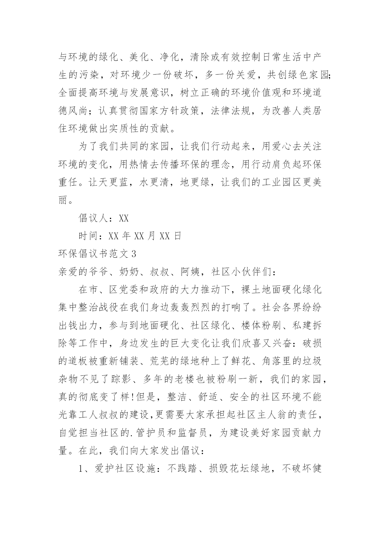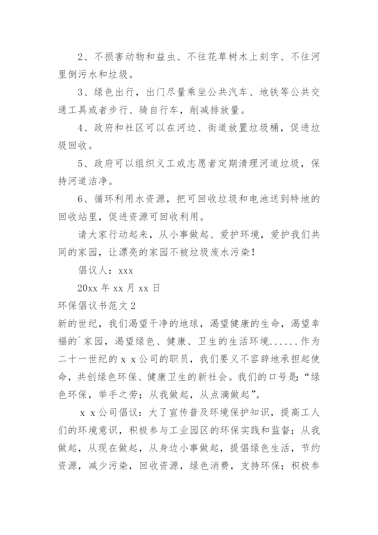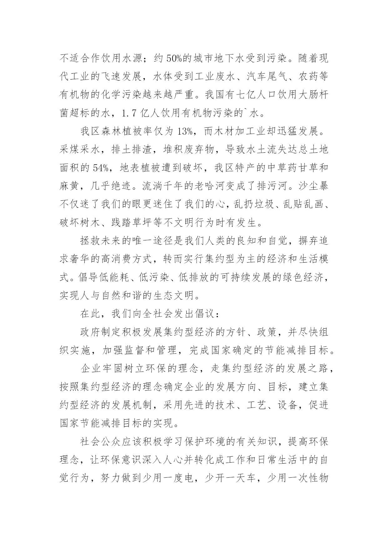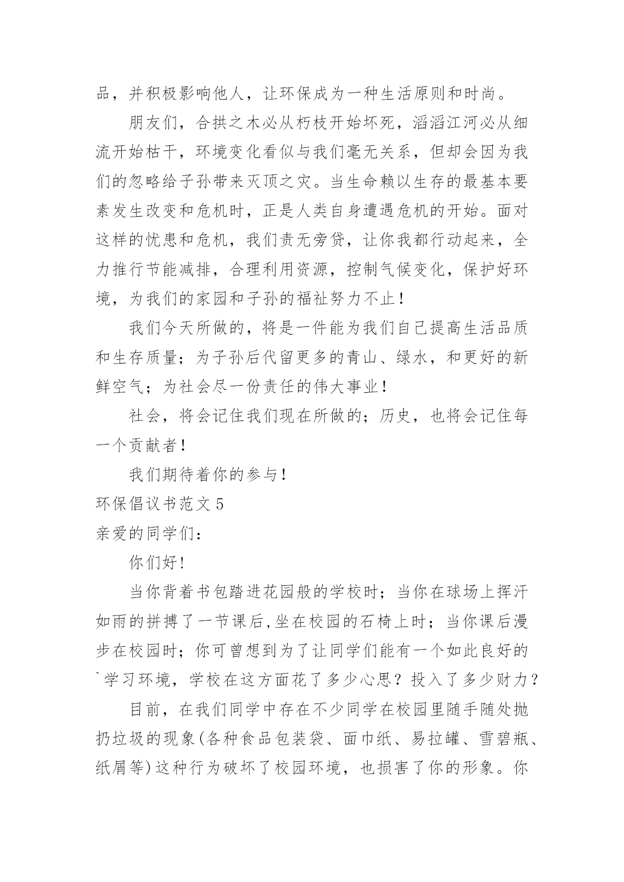 环保倡议书环保倡议书范文(汇编15篇)在充满活力,日益开放的今天,越来越多人会去使用倡议书,在写作上,倡议书有一定的书写规范。相信很多朋友都对写倡议书感到非常苦恼吧,下面是小编帮大家整理的环保倡议书范文,欢迎大家分享。环保倡议书范文1全镇的同胞们:地球,是人类的家园。它无私地把资源和空间送给我们,让我们能住上结实的房屋,能吃上可口的食物,能呼吸到新奇的空气,能感受到自然的芳香……可如今,环境已经被破坏得特别恶劣:被塑料袋填充的河流、卡着易拉罐的树木、飘舞着包装纸和传单的天空……人类假如不去爱护环境,环境自然也不会爱护我们。你顺手丢弃的垃圾,在几百年后才能分解完,还会被大自然中的`动物当做食物吃掉,而人又把动物当成食物。所以,人们丢的垃圾终有一天会害惨他们自己。在环境的报复里,没有一个人会是无辜的。为了生存的环境,为了健康的食物,为了人物的将来,请大家开头重视环境、爱护环境!为此,我向大家发出倡议:1、不乱扔垃圾,尽可能少使用塑料袋、塑料杯和一次性餐具等。2、不损害动物和益虫、不往花草树木上刻字、不往河里倒污水和垃圾。3、绿色出行,出门尽量乘坐公共汽车、地铁等公共交通工具或者步行、骑自行车,削减排放量。4、政府和社区可以在河边、街道放置垃圾桶,促进垃圾回收。5、政府可以组织义工或志愿者定期清理河道垃圾,保持河道洁净。6、循环利用水资源,把可回收垃圾和电池送到特地的回收站里,促进资源可回收利用。请大家行动起来,从小事做起、爱护环境,爱护我们共同的家园,让漂亮的家园不被垃圾废水污染!倡议人:xxx20xx年xx月xx日环保倡议书范文2新的世纪,我们渴望干净的地球,渴望健康的生命,渴望幸福的`家园,渴望绿色、健康、卫生的生活环境......作为二十一世纪的xx公司的职员,我们要义不容辞地承担起使命,共创绿色环保、健康卫生的新社会。我们的口号是:“绿色环保,举手之劳;从我做起,从点滴做起”。xx公司倡议:大了宣传普及环境保护知识,提高工人们的环境意识,积极参与工业园区的环保实践和监督;从我做起,从现在做起,从身边小事做起,提倡绿色生活,节约资源,减少污染,回收资源,绿色消费,支持环保;积极参与环境的绿化、美化、净化,清除或有效控制日常生活中产生的污染,对环境少一份破坏,多一份关爱,共创绿色家园;全面提高环境与发展意识,树立正确的环境价值观和环境道德风尚;认真贯彻国家方针政策,法律法规,为改善人类居住环境做出实质性的贡献。为了我们共同的家园,让我们行动起来,用爱心去关注环境的变化,用热情去传播环保的理念,用行动肩负起环保重任。让天更蓝,水更清,地更绿,让我们的工业园区更美丽。倡议人:XX时间:XX年XX月XX日环保倡议书范文3亲爱的爷爷、奶奶、叔叔、阿姨,社区小伙伴们:在市、区党委和政府的大力推动下,裸土地面硬化绿化集中整治战役在我们身边轰轰烈烈的打响了。社会各界纷纷出钱出力,参与到地面硬化、社区绿化、楼体粉刷、私建拆除等工作中,身边发生的巨大变化让我们欣喜又兴奋:破损的道板被重新铺装、荒芜的绿地种上了鲜花、角落里的垃圾杂物不见了踪影、多年的老楼也被粉刷一新,我们的家园,真的彻底变了样!但是,整洁、舒适、安全的社区环境不能光靠工人叔叔的建设,更需要大家承担起社区主人翁的责任,自觉担当社区的.管护员和监督员,为建设美好家园贡献力量。在此,我们向大家发出倡议:1、爱护社区设施:不践踏、损毁花坛绿地,不破坏健身器材,不把机动车停上人行道。2、保持社区卫生:不乱扔乱倒垃圾,不乱堆装修废物,不乱贴乱画,不在庭院烧烤聚餐,宠物排泄物及时清理。3、维护社区秩序:不私搭乱盖非法建筑,不乱停乱放车辆,不在公共用地拴绳晾晒衣物,不在人群中遛狗,不把电视、音响音量调得过大,不在夜里进行装修施工。4、保卫社区安全:不损毁路灯、电子防盗门等公共安全设施,在发现水、电、煤气的安全隐患时,及时向有关部门报告。遇到盗窃、抢劫等治安案件发生,要敢于和善于与歹徒作斗争,立即向公安机关报告。5、促进社区和谐:积极参加社区组织的文体活动,主动帮助有困难的社区邻里。我们相信,只要社区里的每一位爷爷、奶奶、叔叔、阿姨和小伙伴都能从我做起、从现在做起,从身边的小事做起,主动关心爱护社区环境,积极参与社区管理,生活会因我们变得更加美好,社区会因我们而变得更加美丽!你们的环保志愿者。倡议人:XXXXXXX年XX月XX日环保倡议书范文4尊敬的朋友们:蓝色的地球是我们人类生生不息的载体。几千年的人类文明进程没有牺牲地球的蓝色,但是三百年的现代文明却使我们蓝色的地球日渐披黄蒙黑黯然失色。当林立的高楼取代了荫荫的绿树,当城市的霓虹暗淡了星星的光茫,文明战胜了蛮荒,21世纪的人类站在了世界的巅峰。但是,北极熊却只能在越来越小的冰面上艰难地觅食,印度洋大海啸夺走了万千人的生命,sas肆虐、洪水横